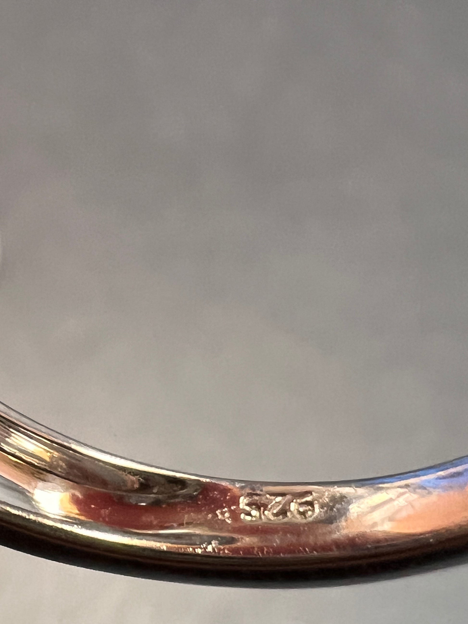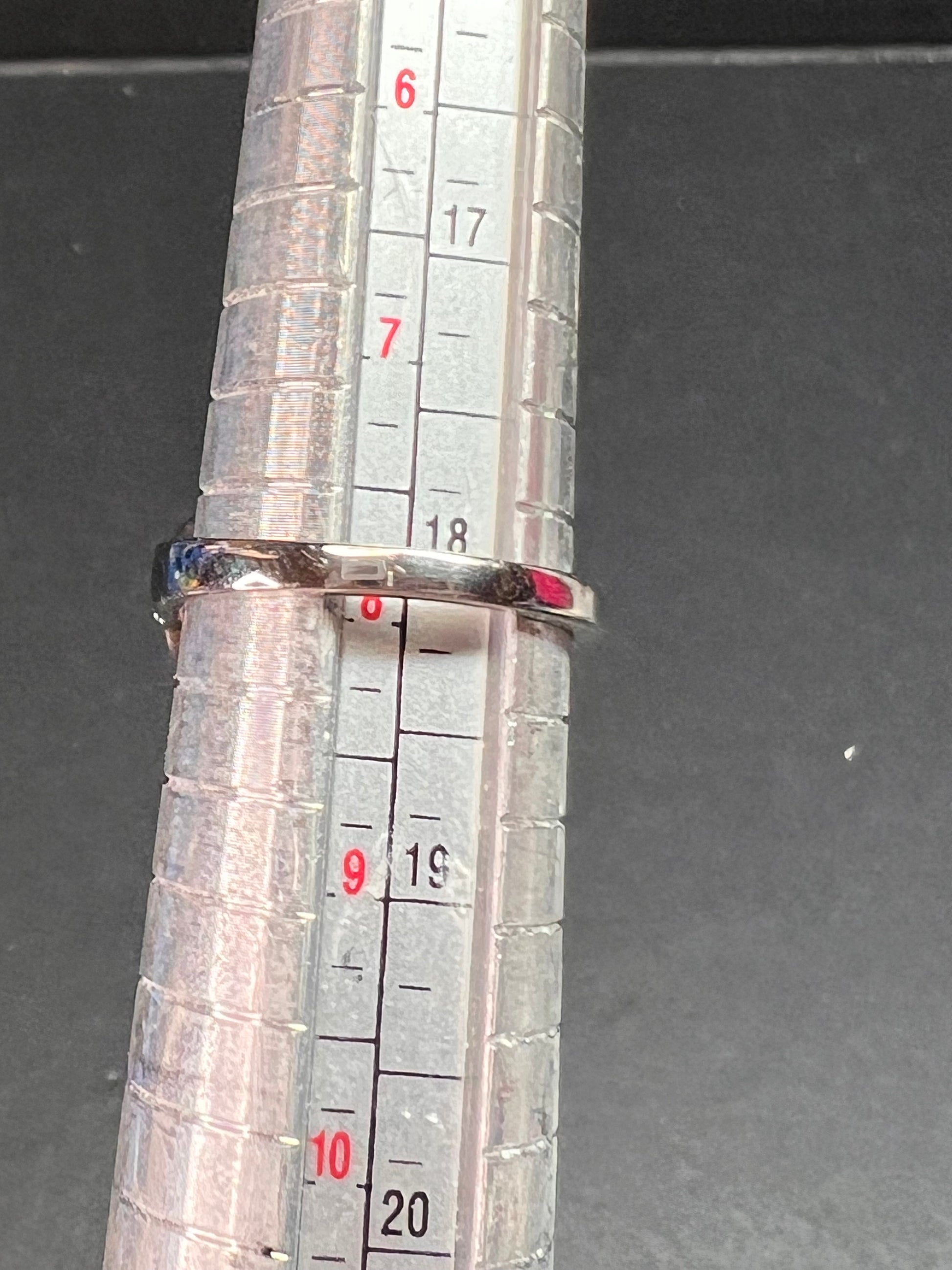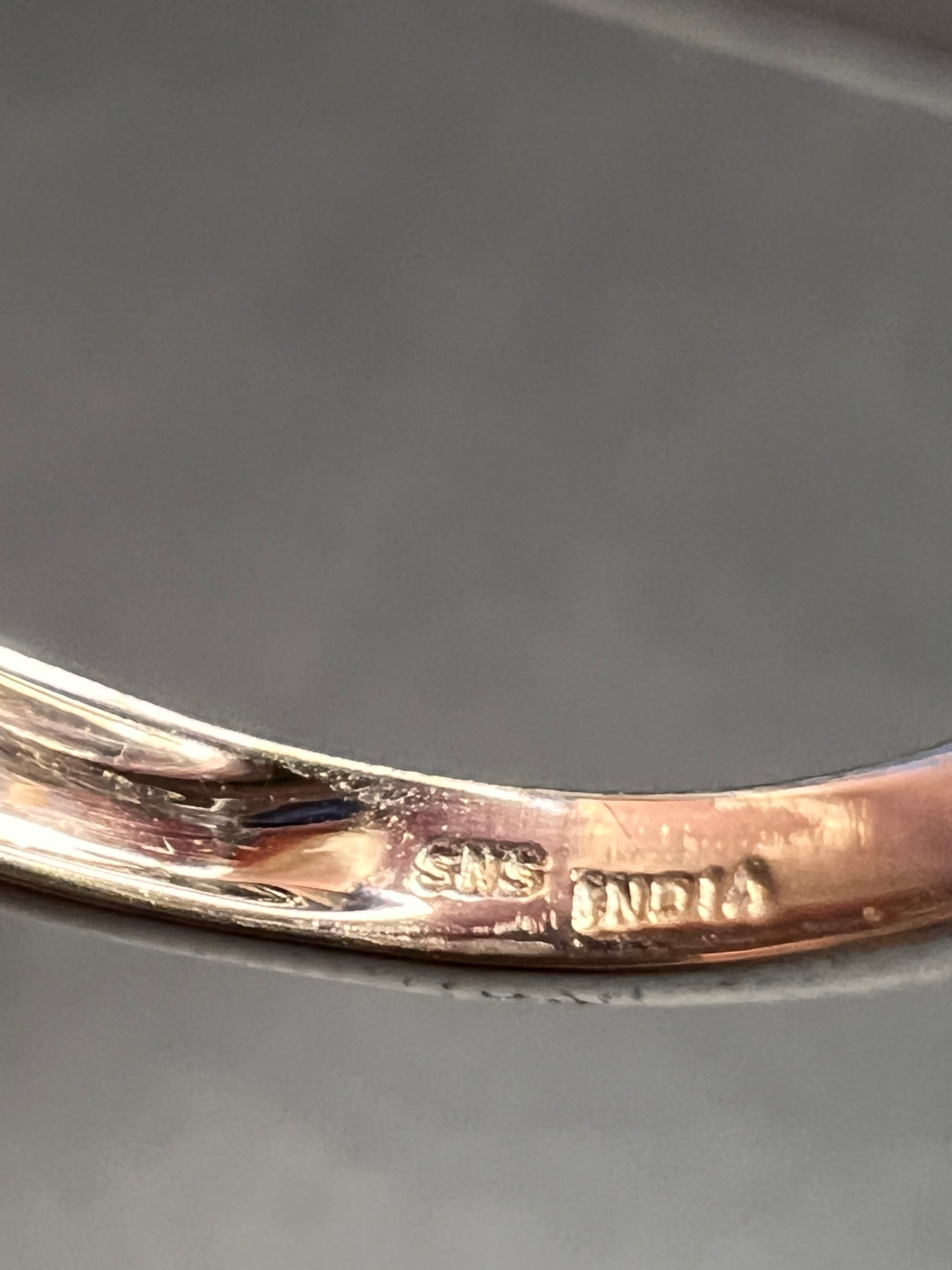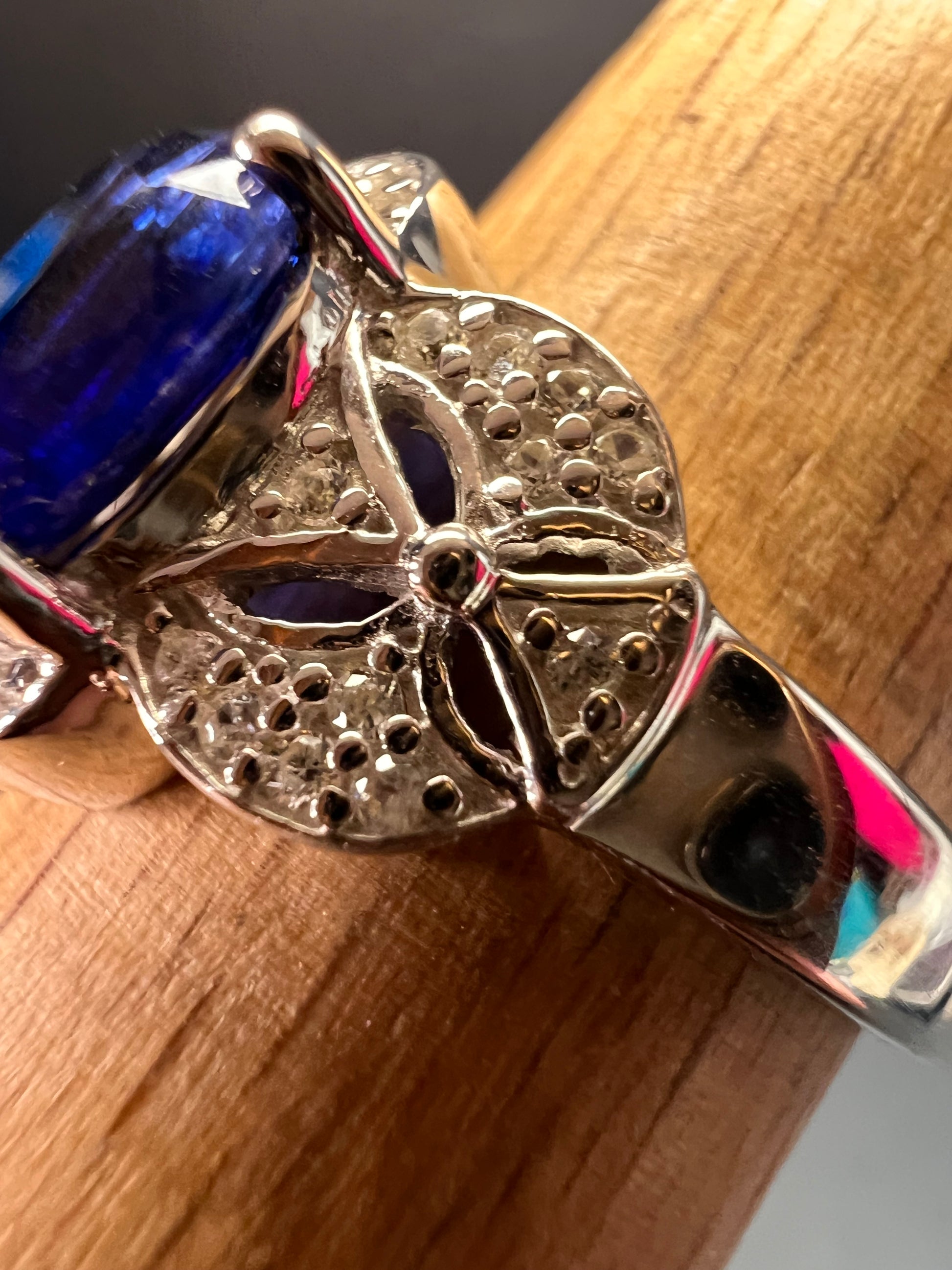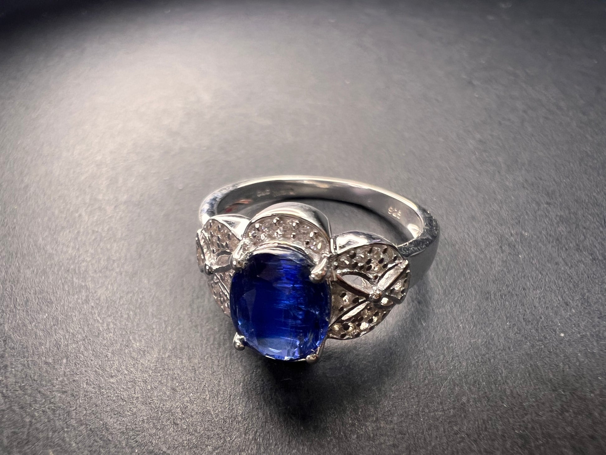 Genuine blue oval cut kyanite gemstone prong set in authentic 925 sterling silver plated with rhodium. White accent stones are zircon. Measures a size 8. Kyanite gemstone is natural with no treatment and about 2 ctw. SNS India. Ring weighs about 3.68 grams.