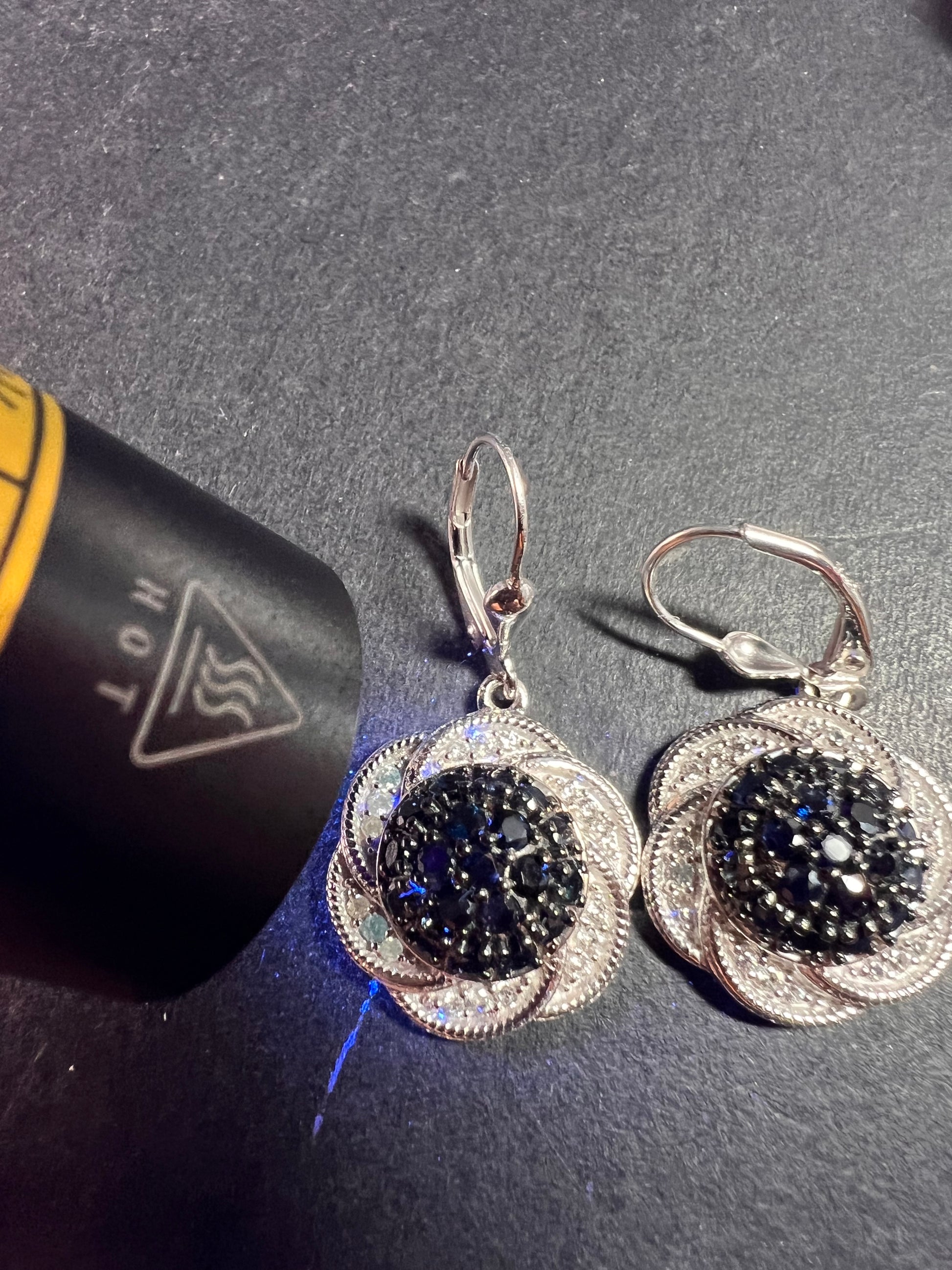 Genuine Madagascar blue sapphire gemstones prong set in authentic 925 sterling silver with a rhodium plating. White accent stones encrusted around the galaxy halo are zircon. Sapphires are mined in Madagascar and heat treated for color enhancement. Total ctw is 2.80. Total weight is 8.90 grams. Lever backs are also 824 sterling silver with rhodium plating. Djoy. Made in India. Estimated retail value is $1,250.