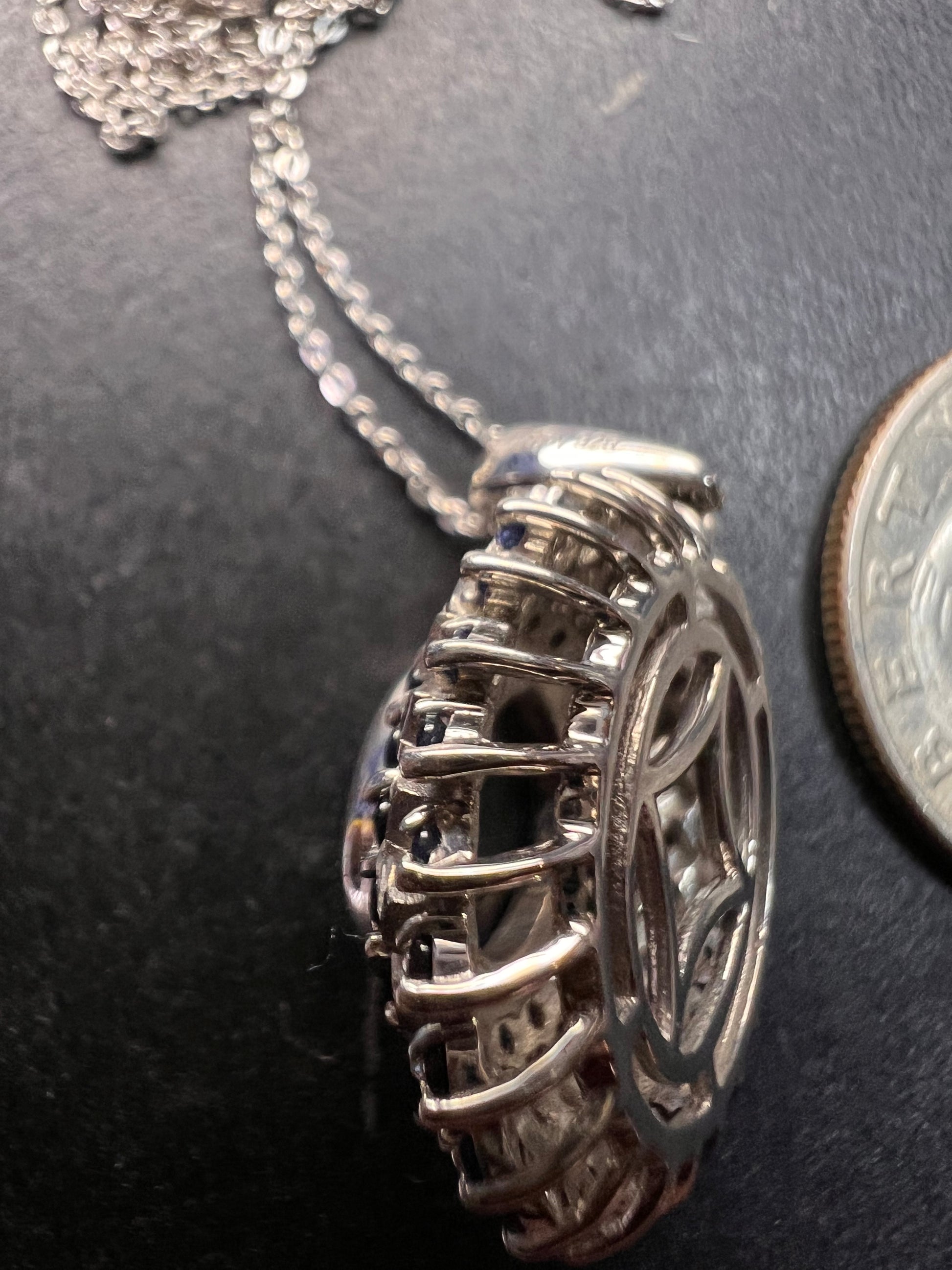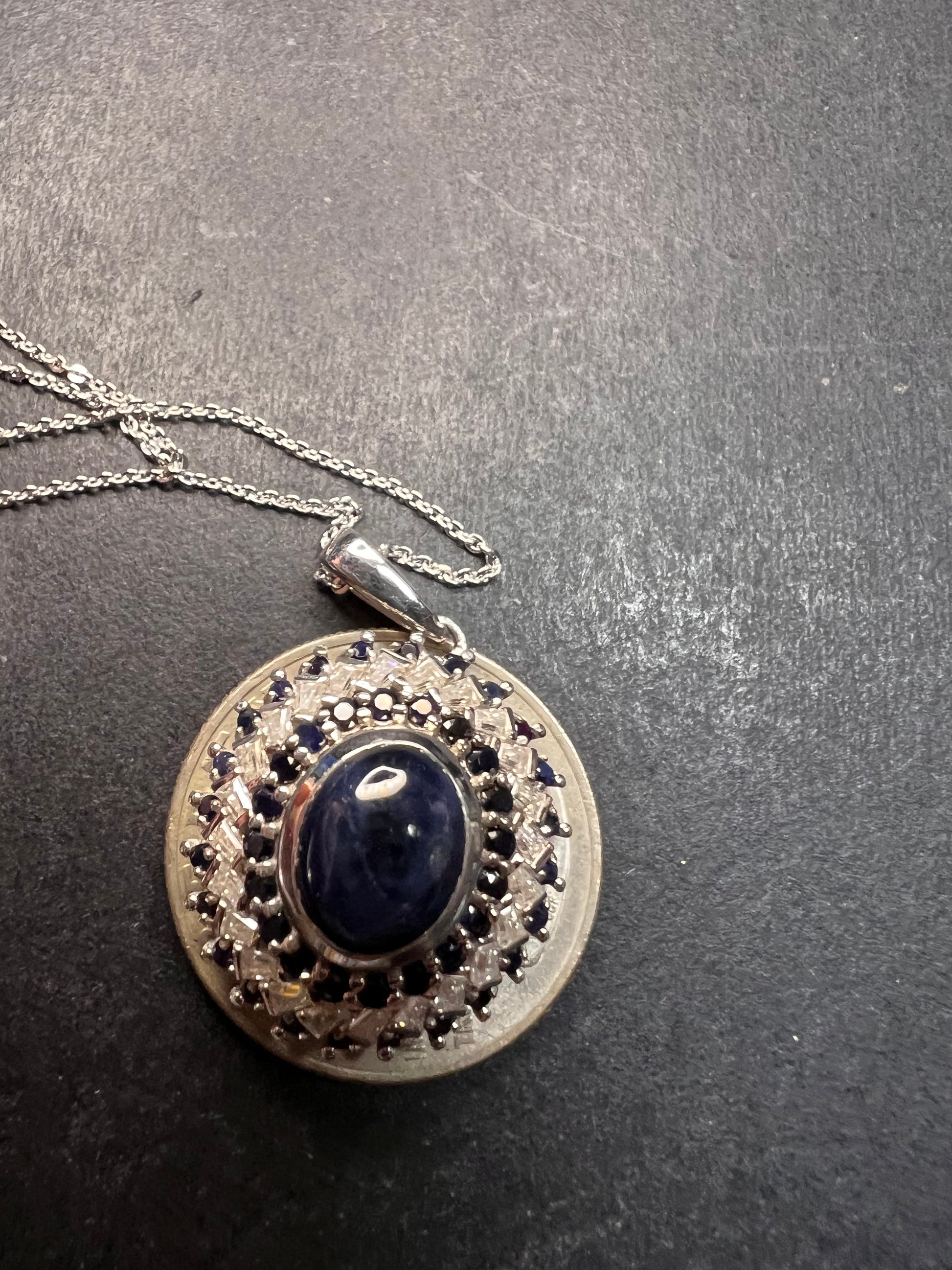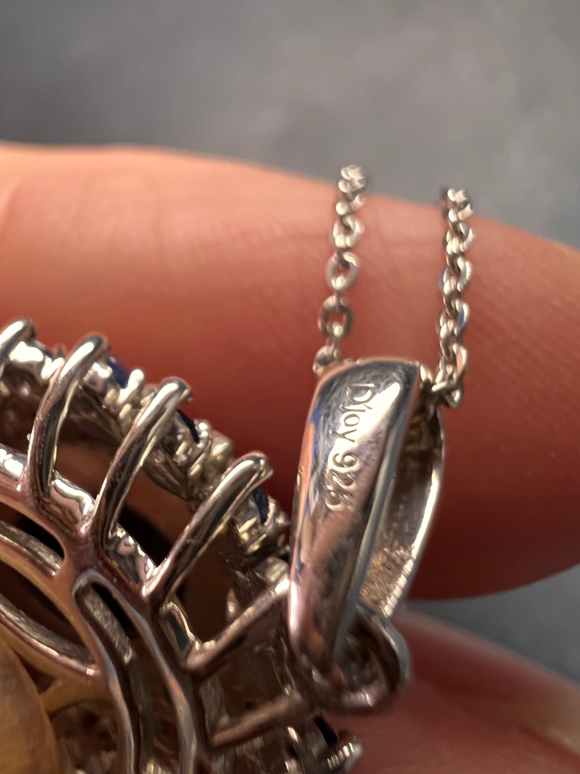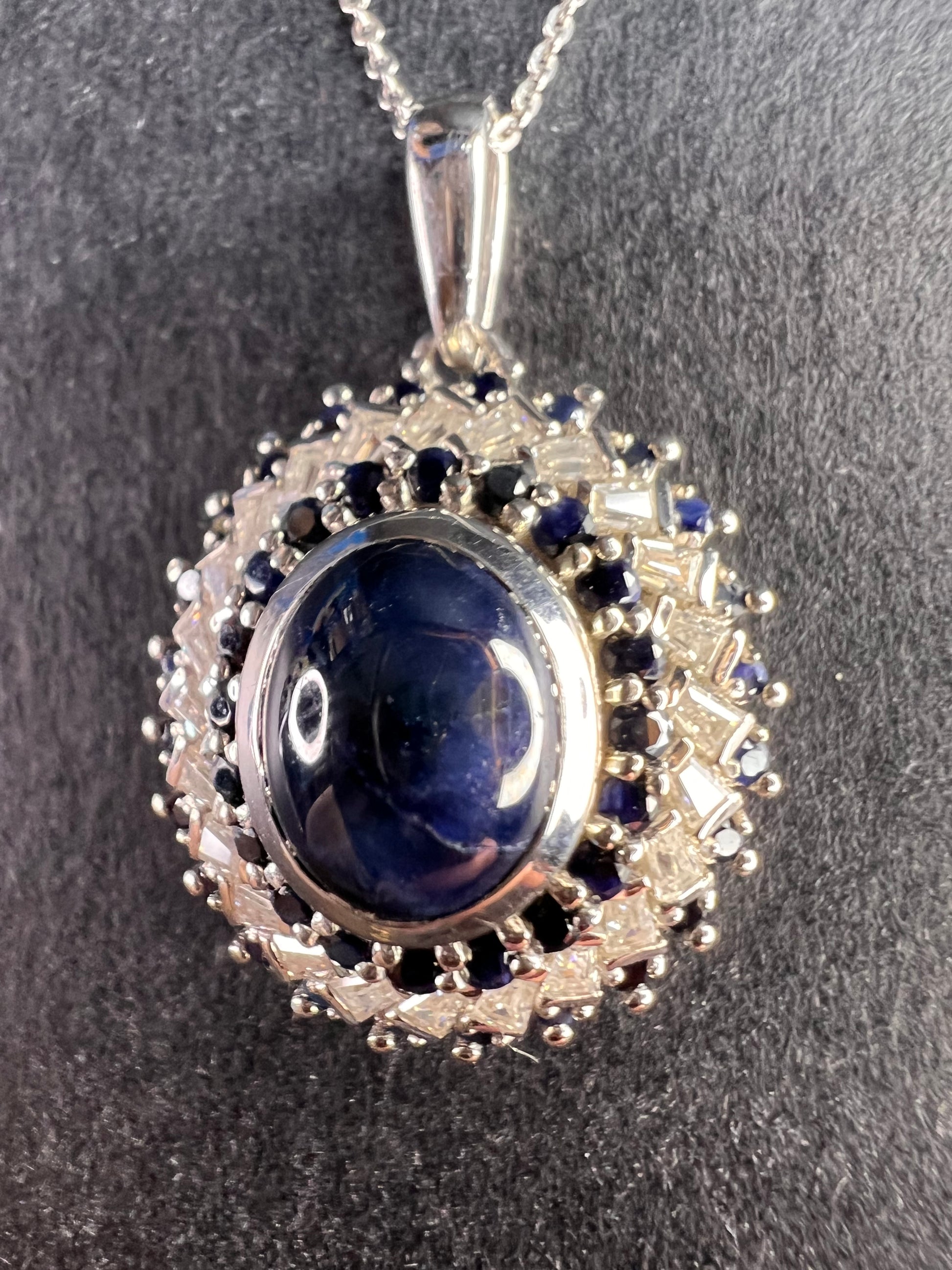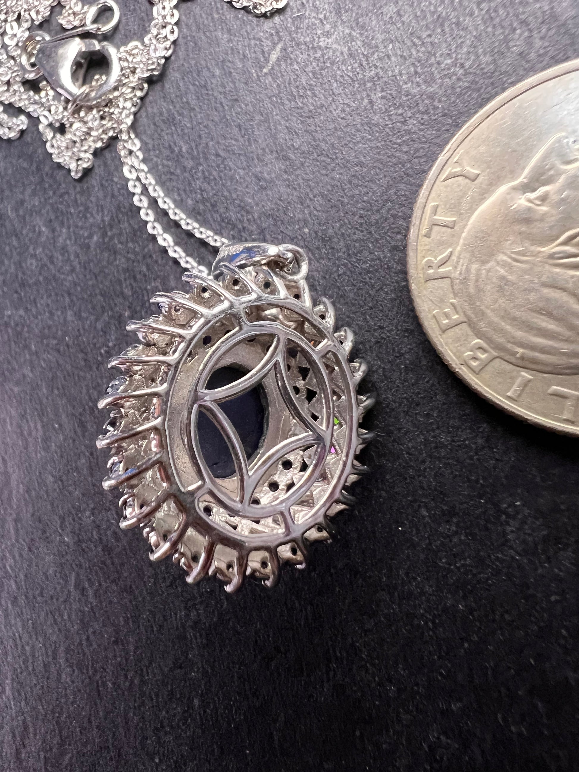 Genuine blue star sapphire set in authentic 925 sterling silver plated with rhodium. Blue accent stones around the halo are blue sapphire and white accent stones are Moissanite. Total ctw is 6.30. Blue star sapphire is diffusion treated and bezel set with a ctw of 4.15 measuring 10x8 mm. Chain is also sterling silver with rhodium plate and measures 20 inches in length with lobster claw clasp. Djoy. Made in India. Estimated retail value is $1,150.