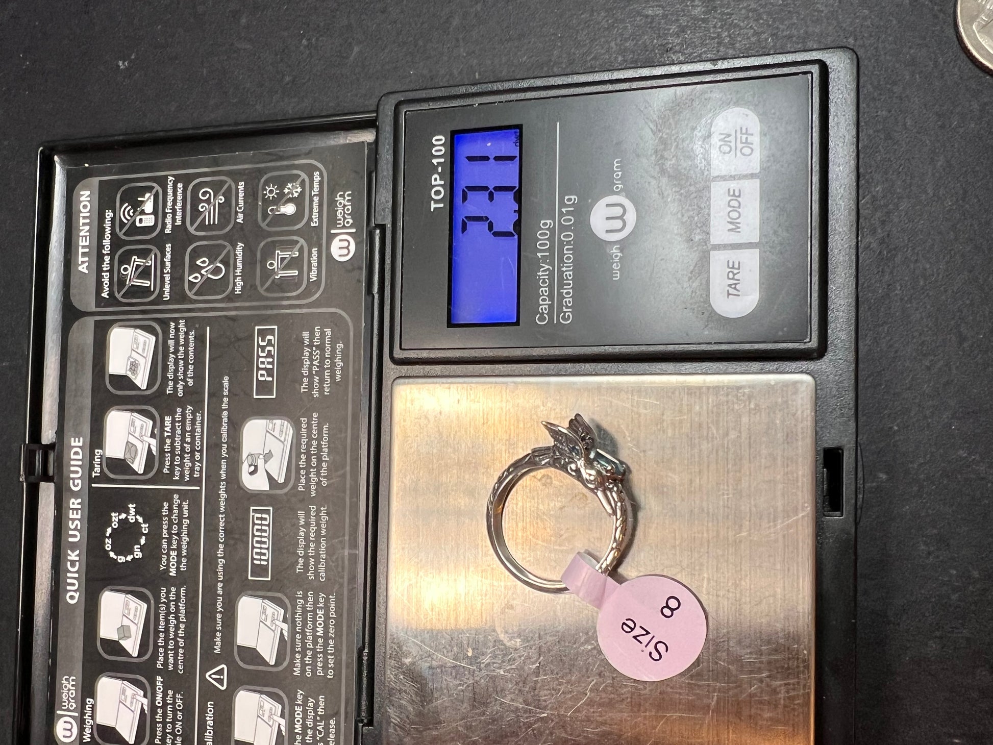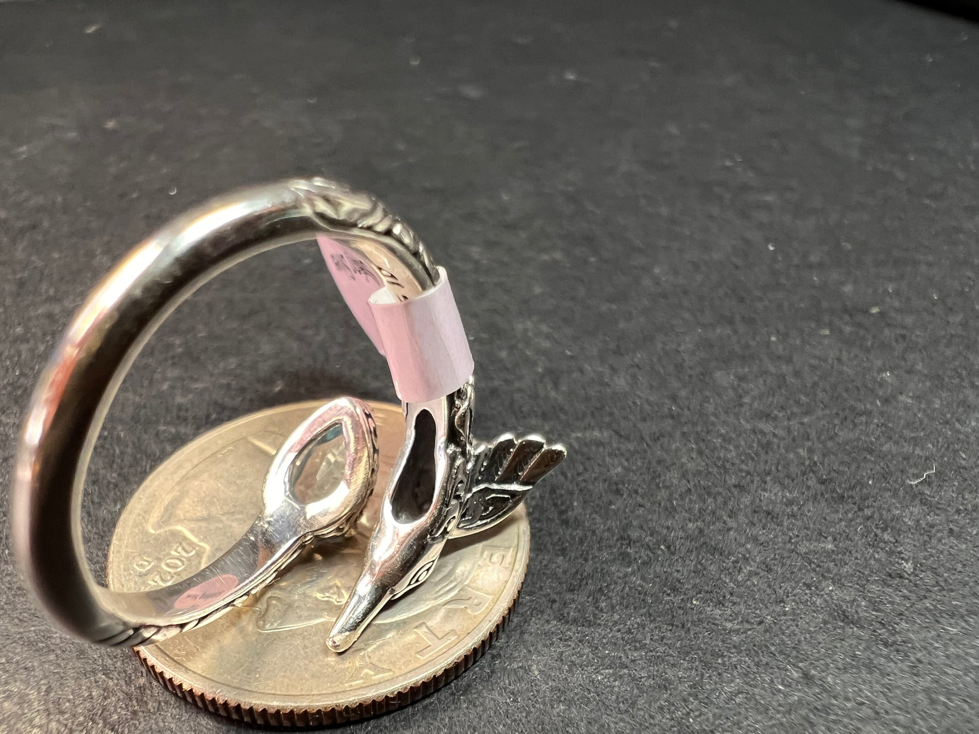 Genuine blue topaz pear cut gemstone prong set in authentic 925 Bali sterling silver silver with a cute hummingbird. Measures a size 7. Total weight is 2.31 grams. Stamps included 925 ATI ID.