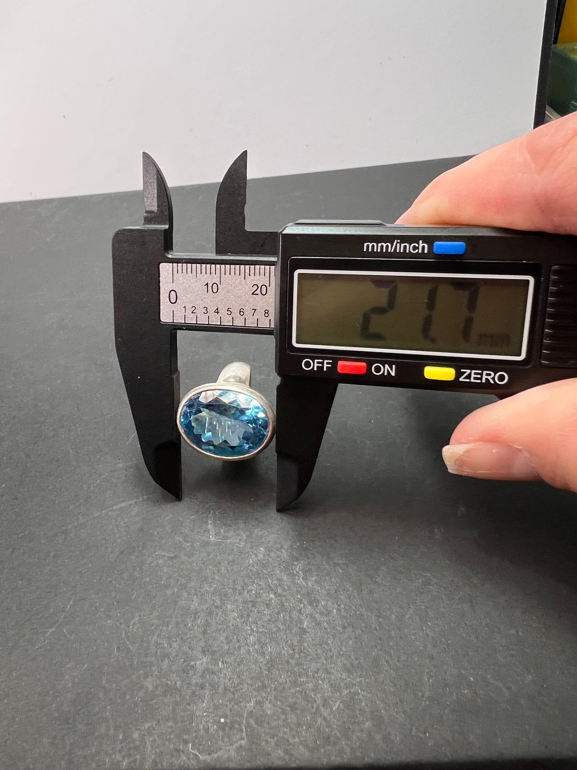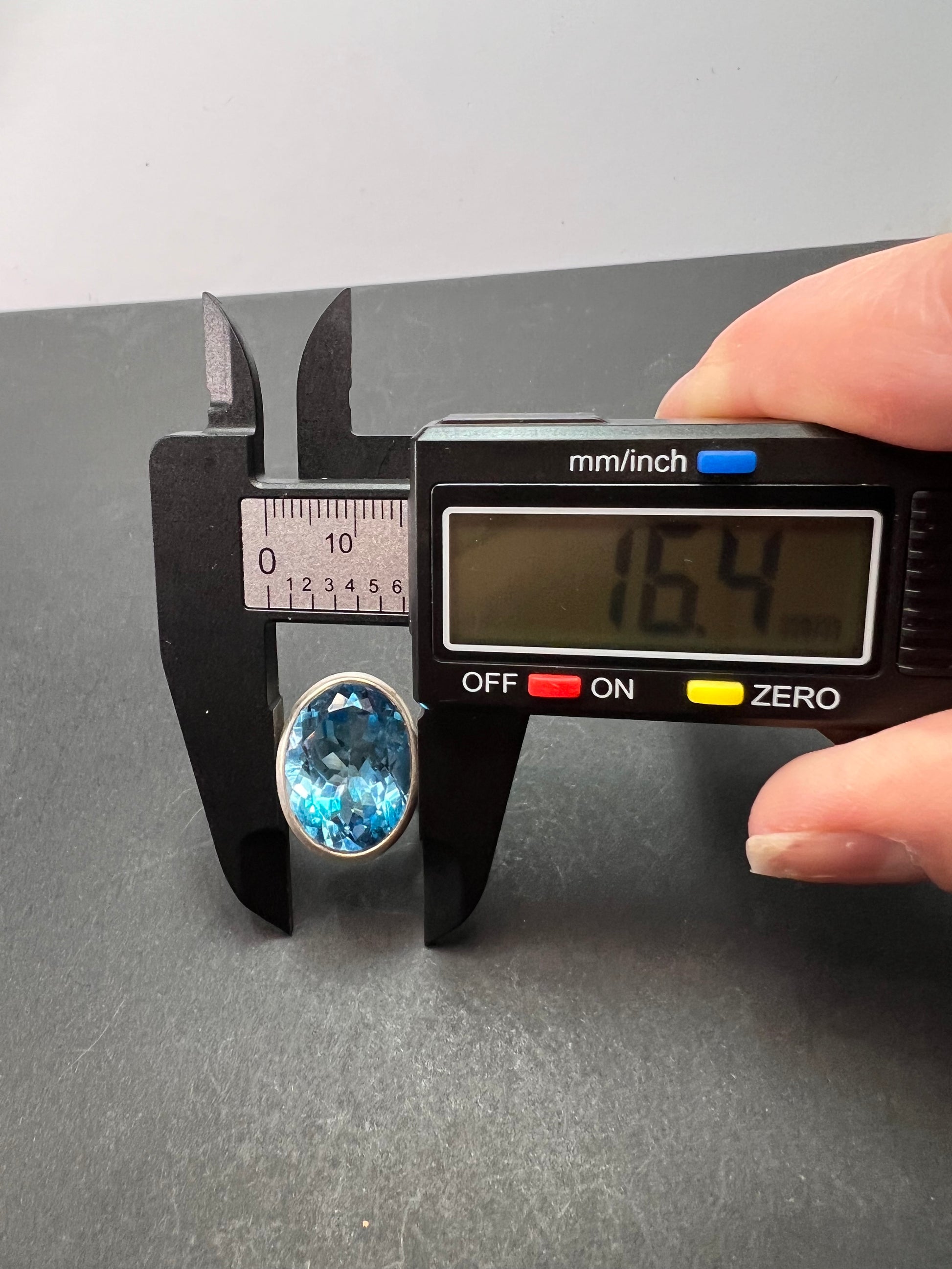 Genuine blue topaz oval cut gemstone bezel set in authentic 925 sterling silver. Measured a size 7.5. Total weight is 12.42 grams. Outside of stone setting measures about 16.4x21.7 mm.