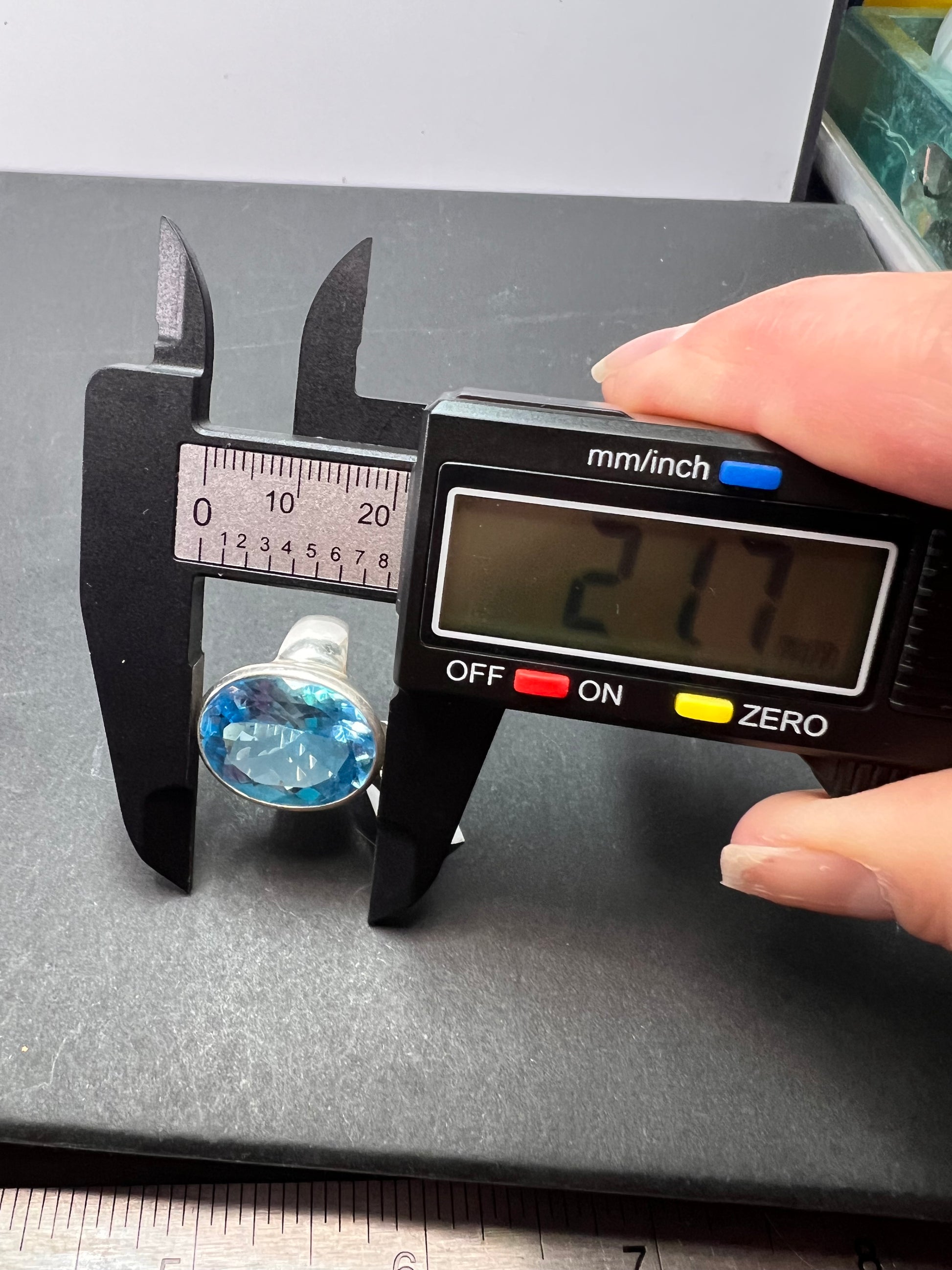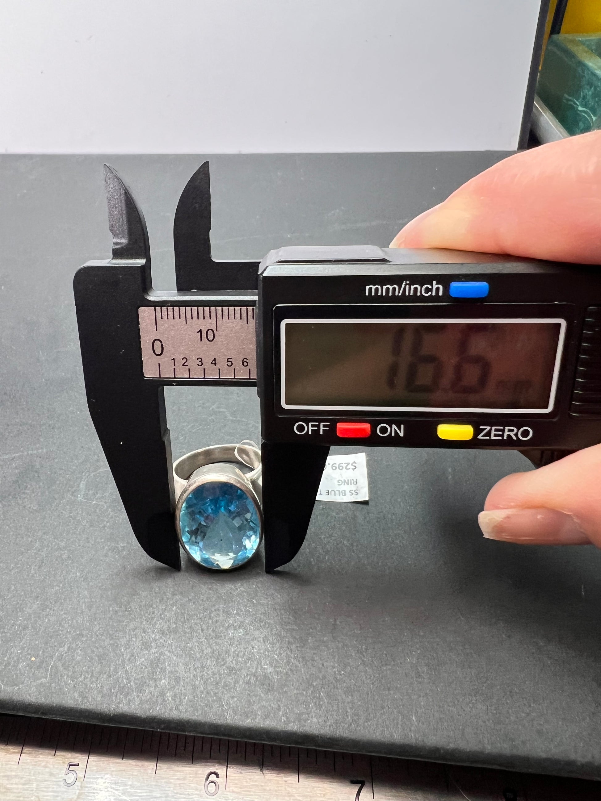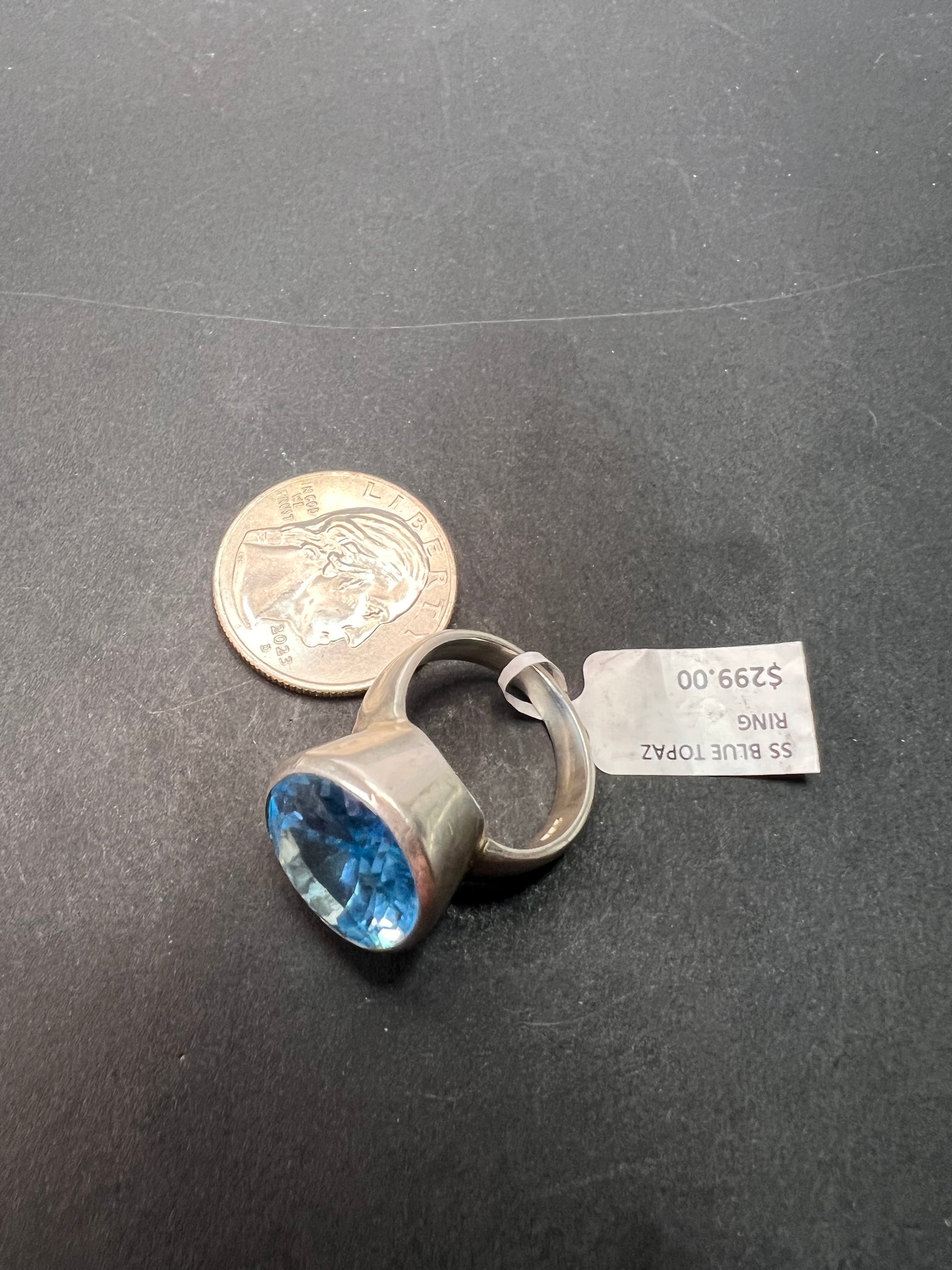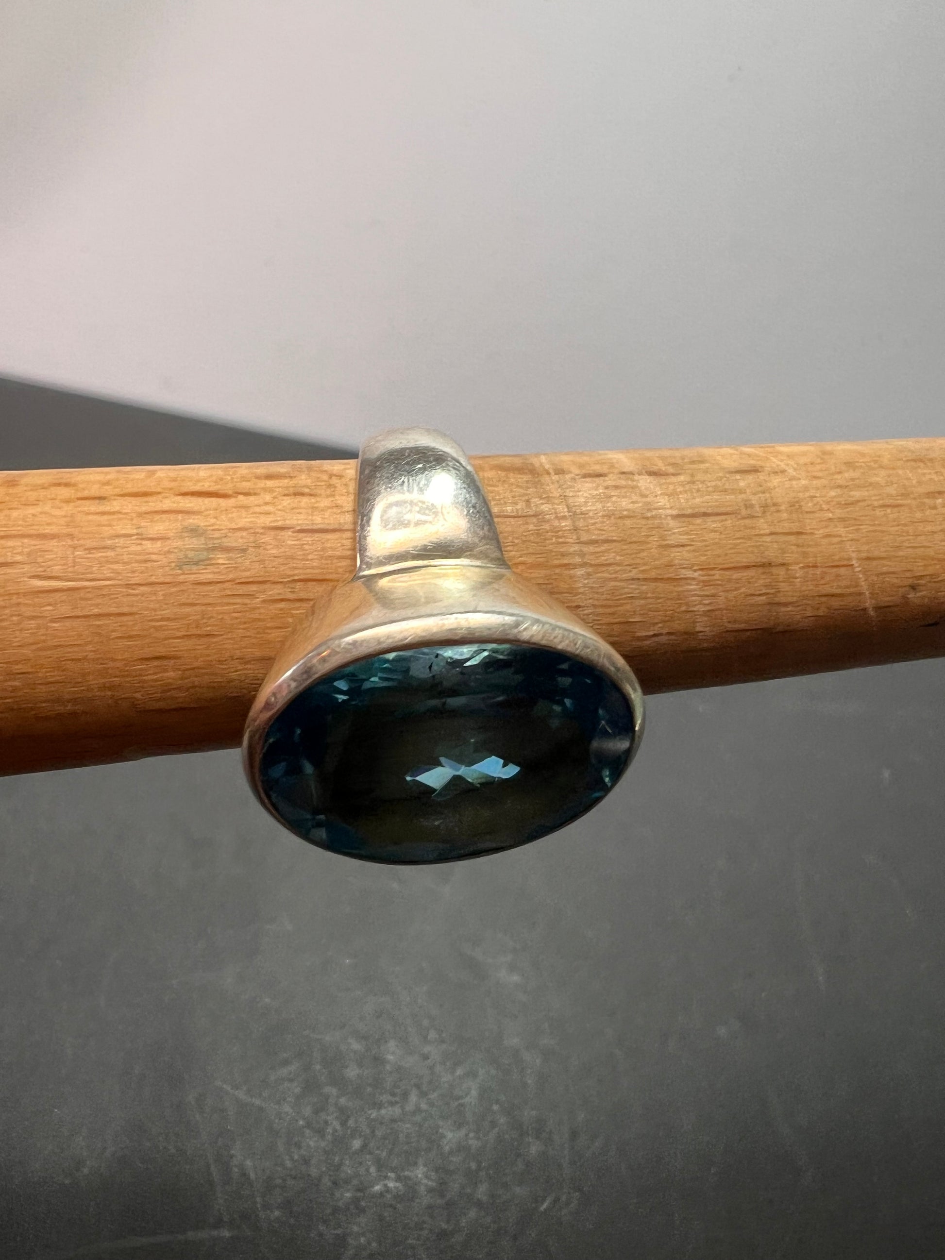 Genuine blue topaz oval cut gemstone bezel set in authentic 925 sterling silver. Measures a size 8. Total weight is 13.47 grams. Measurements on outside of stone setting are about 16.6 x 21.7