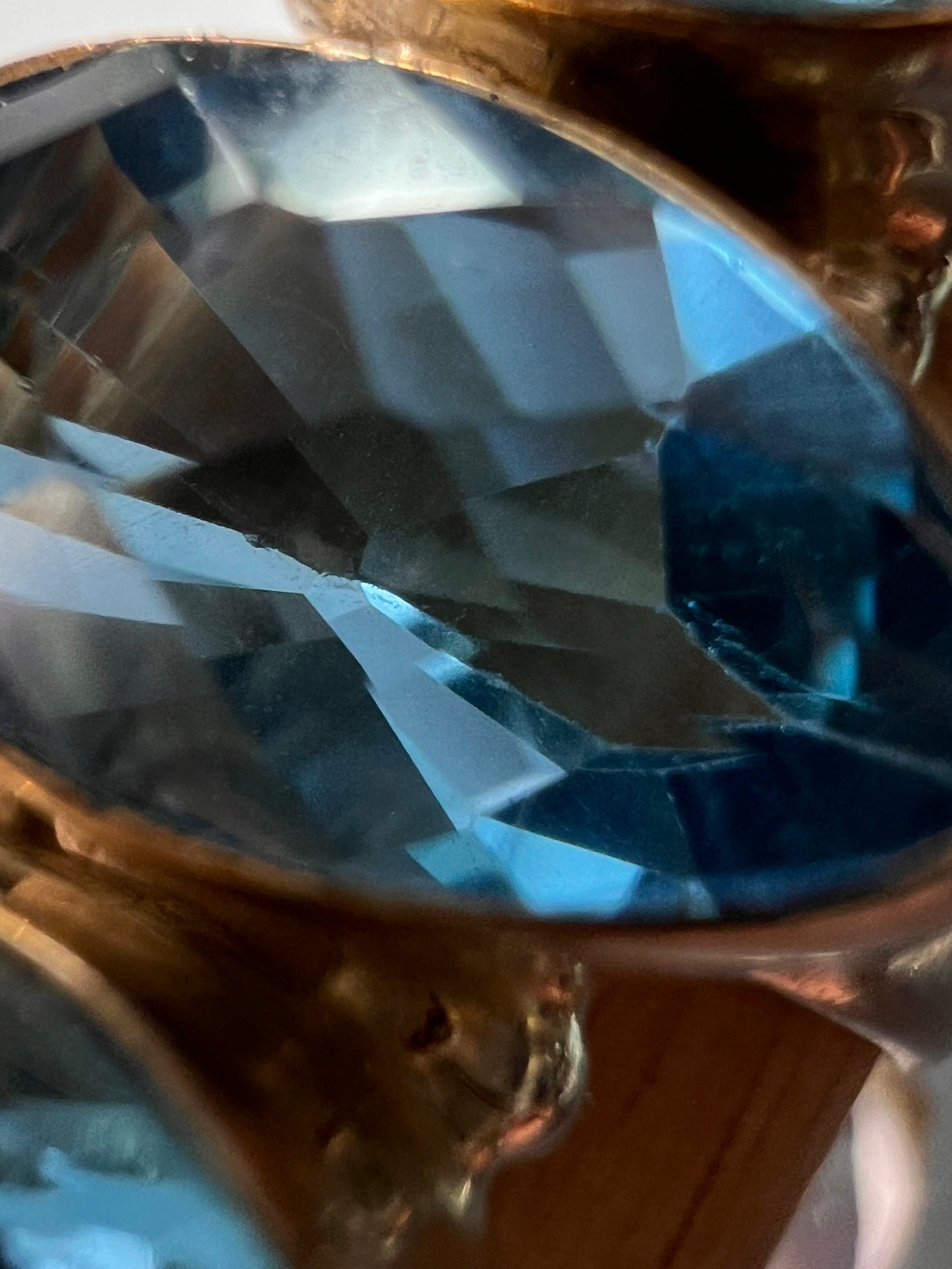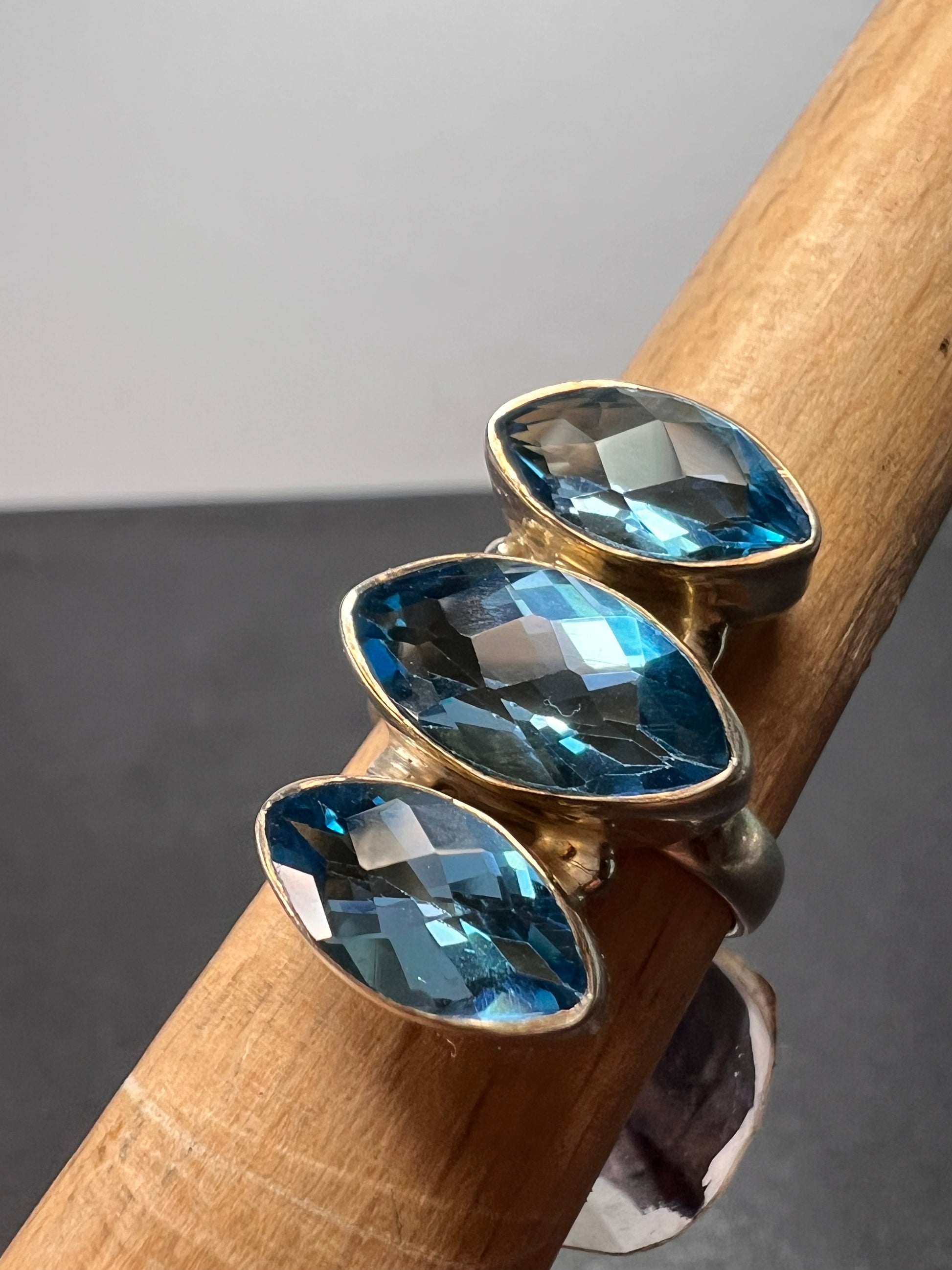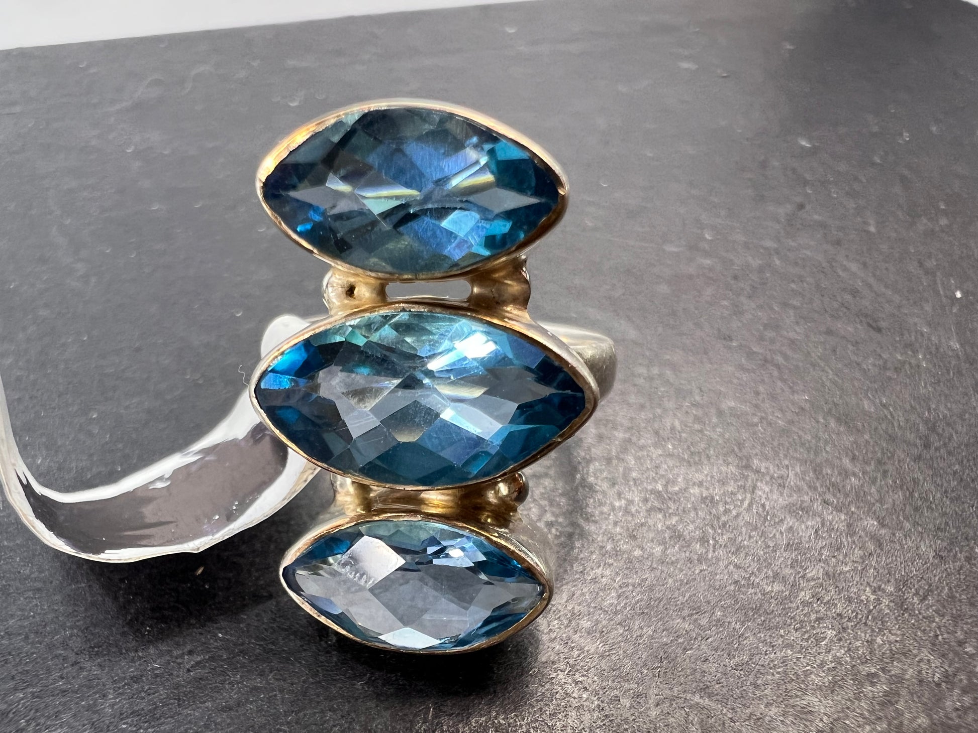 3 genuine Swiss blue topaz marquise faceted gemstones bezel set in sterling silver. Measures a size 6. Unknown hallmark. Total weight is 6.39 grams.