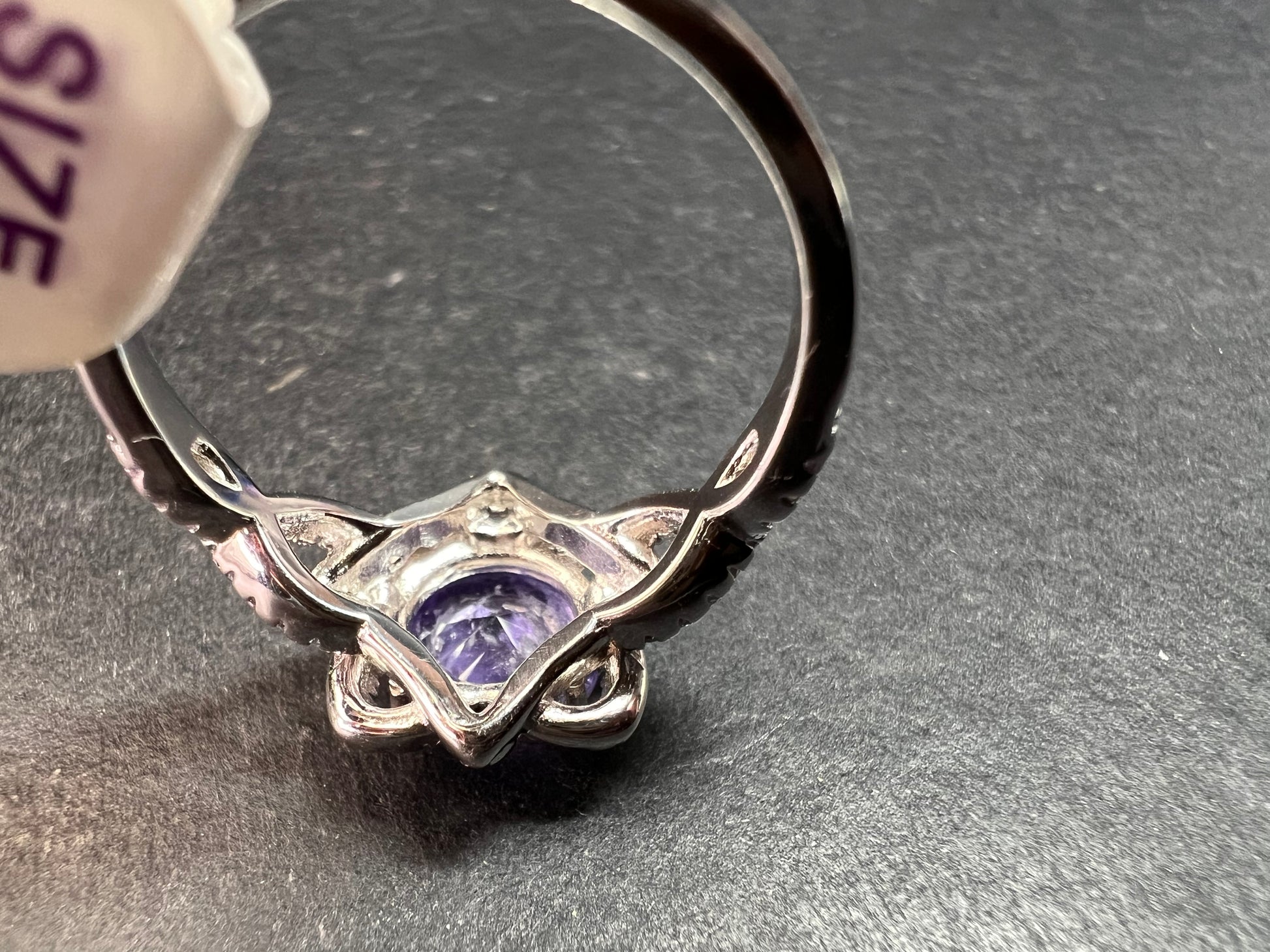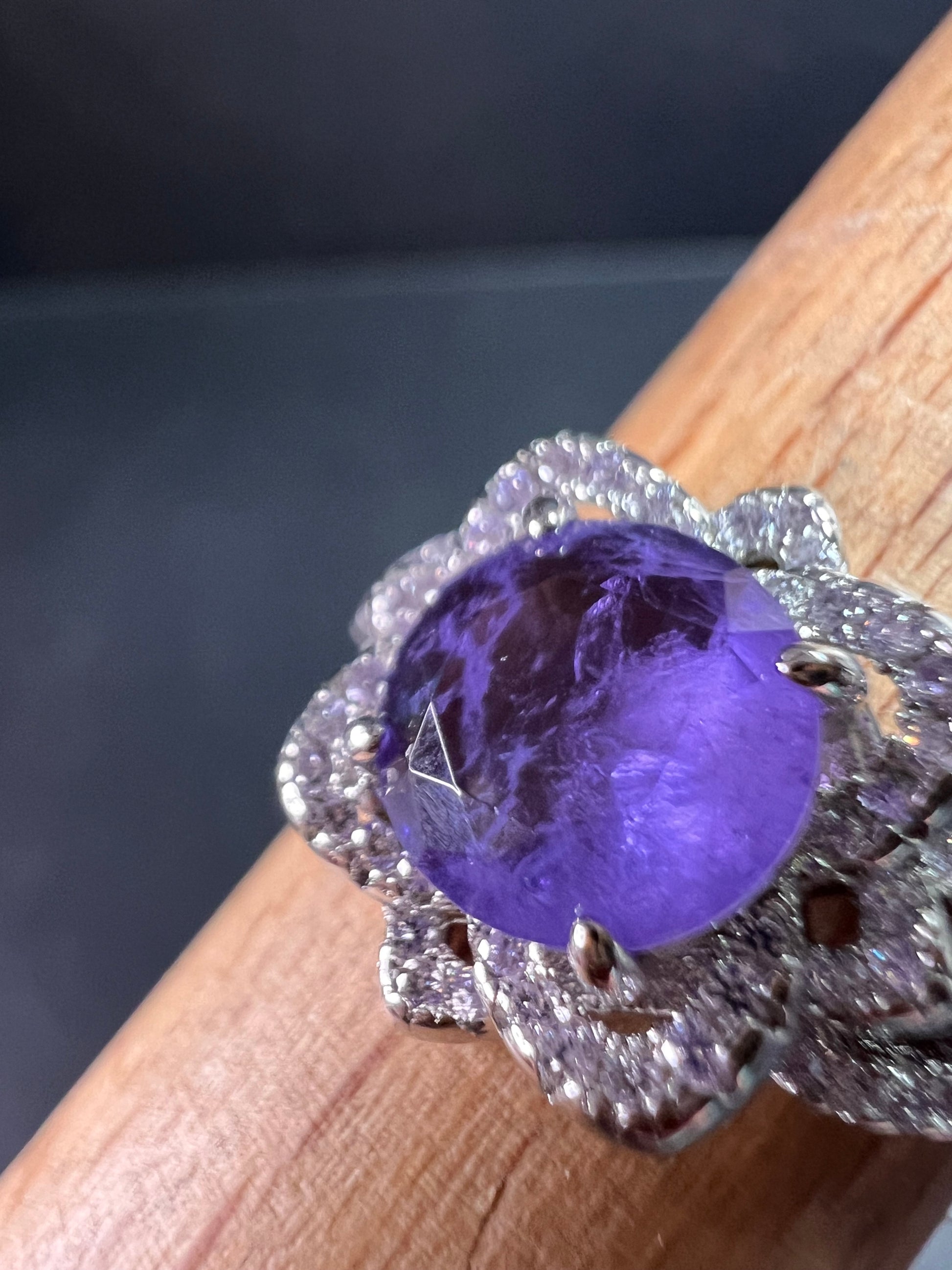 Brand new and still in its original Bomb Party packaging, this bold sterling silver dinner ring features a gorgeous deep-lavender simulated amethyst at the center. The stone is glass, faceted to catch the light and framed by an ornate floral-inspired halo and detailed shoulders. Metal is .925 sterling silver with a bright rhodium finish for added shine and resistance to tarnish. I also acid tested the ring to verify sterling purity. Ring face measures approx. 7.9mm across. Size 9. A beautiful statement piece for anyone who loves rich purple tones without the cost of natural amethyst.