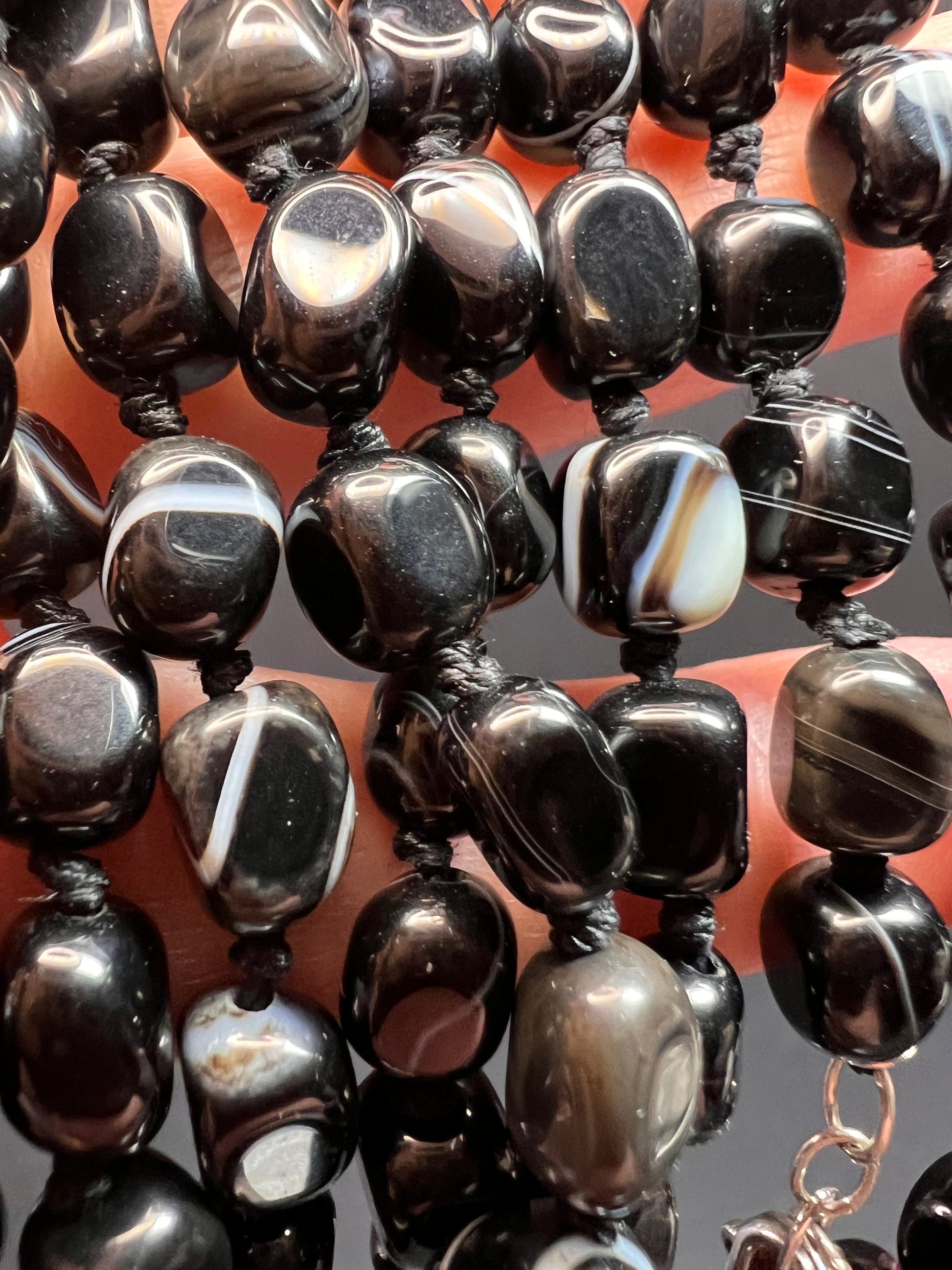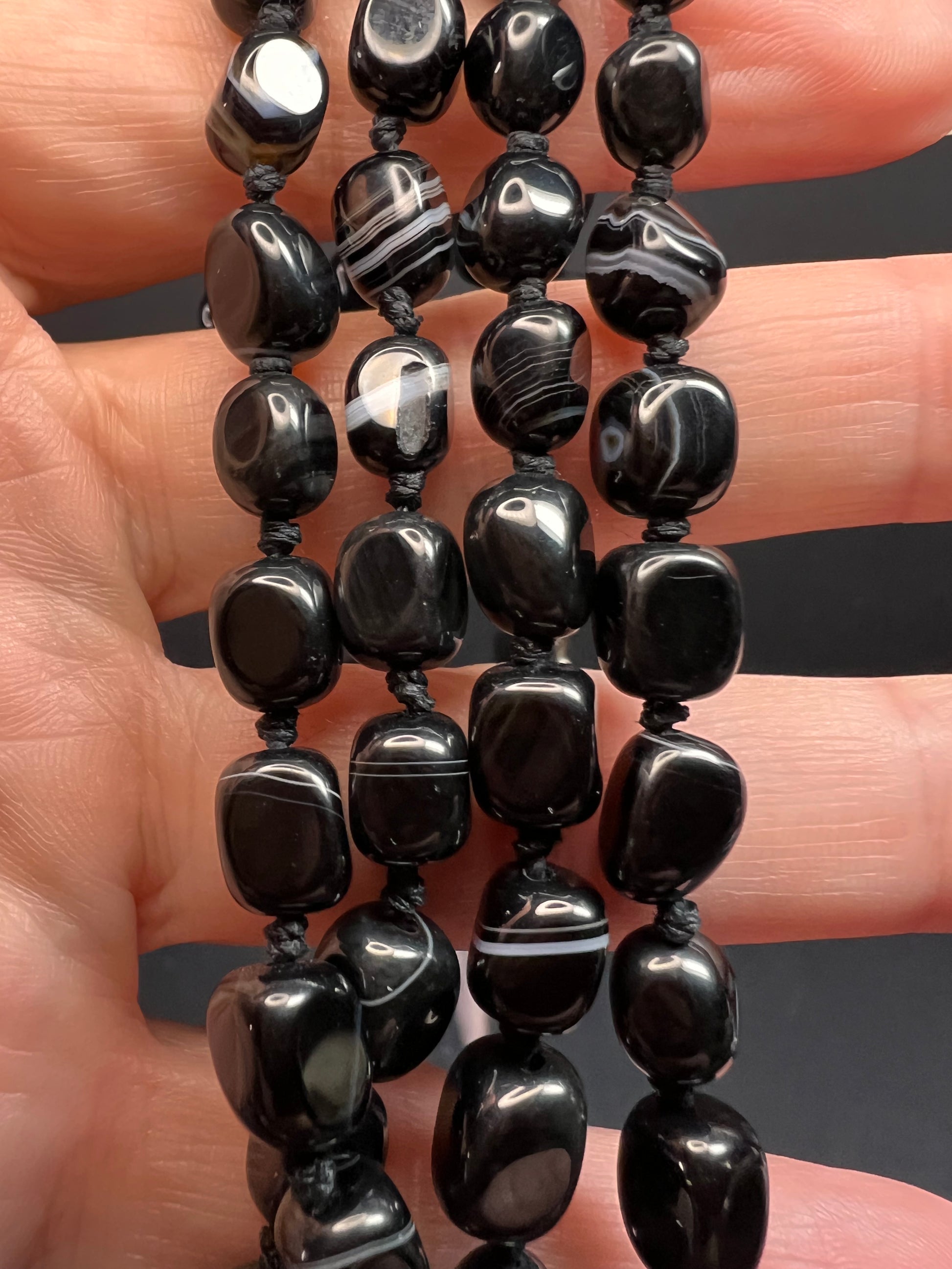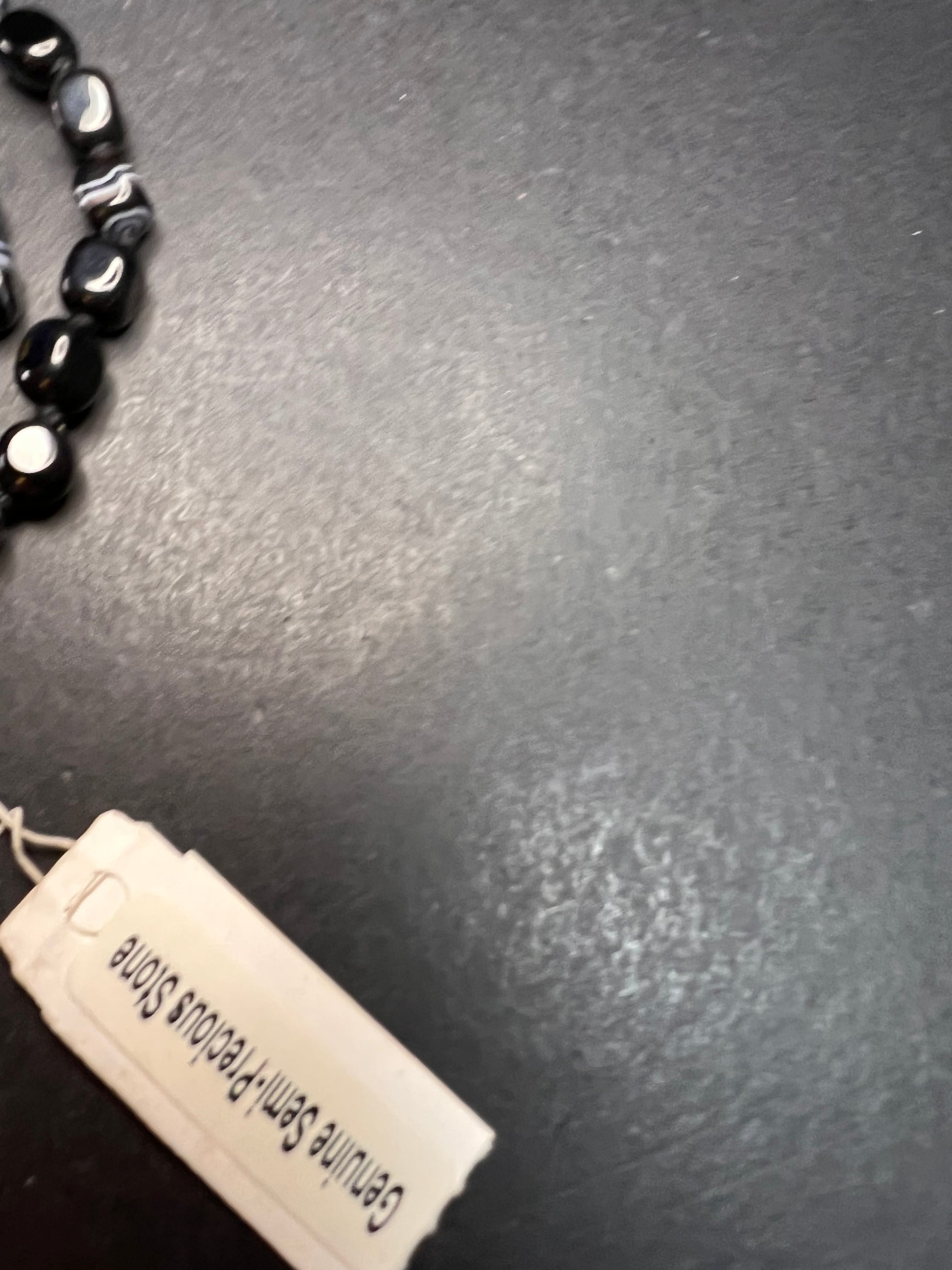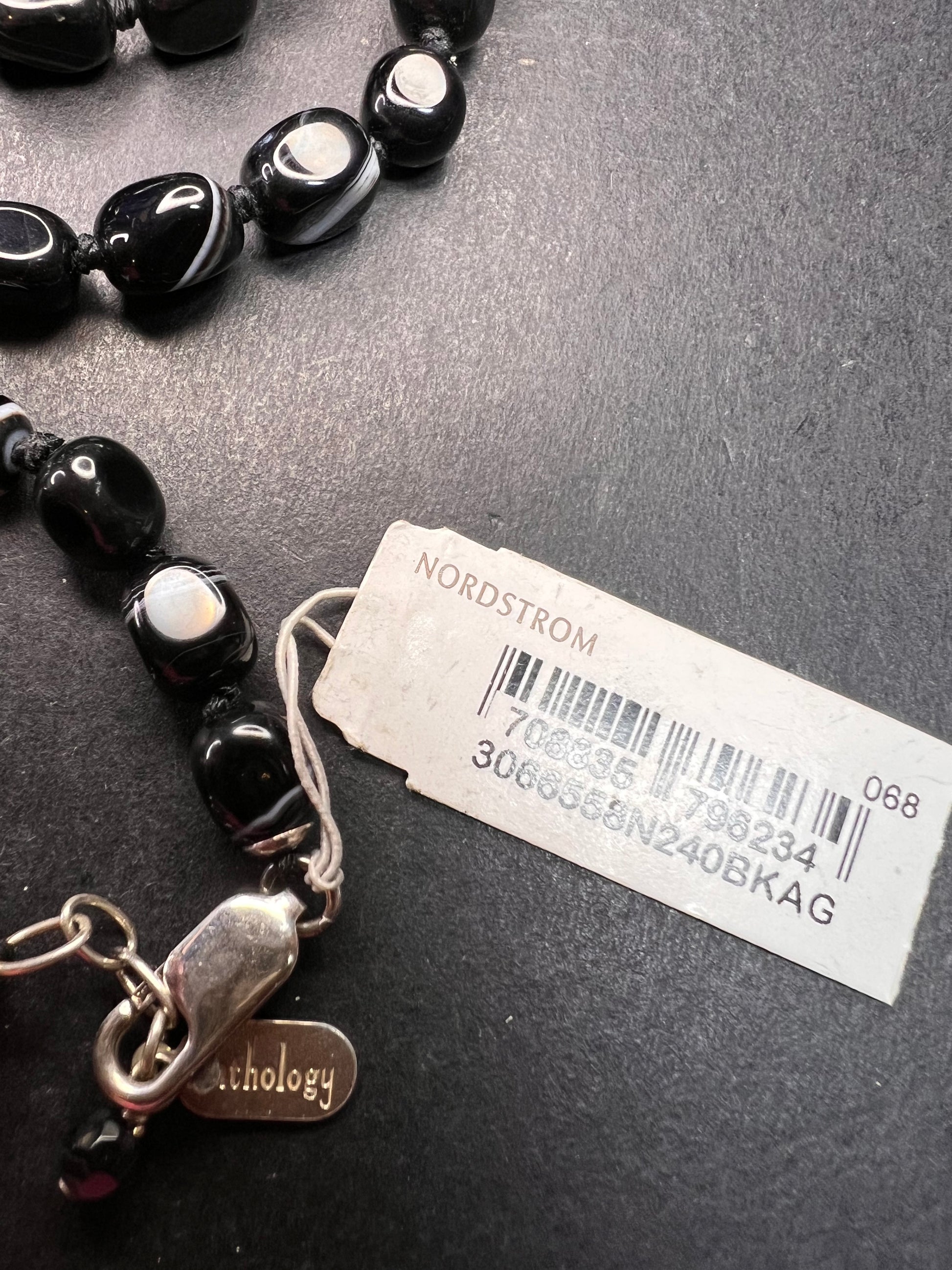 Genuine Botswana agate stone beads knotted on black cord at a 44 inch length with a 925 sterling silver clasp. Anthology brand tag charm for Nordstrom.