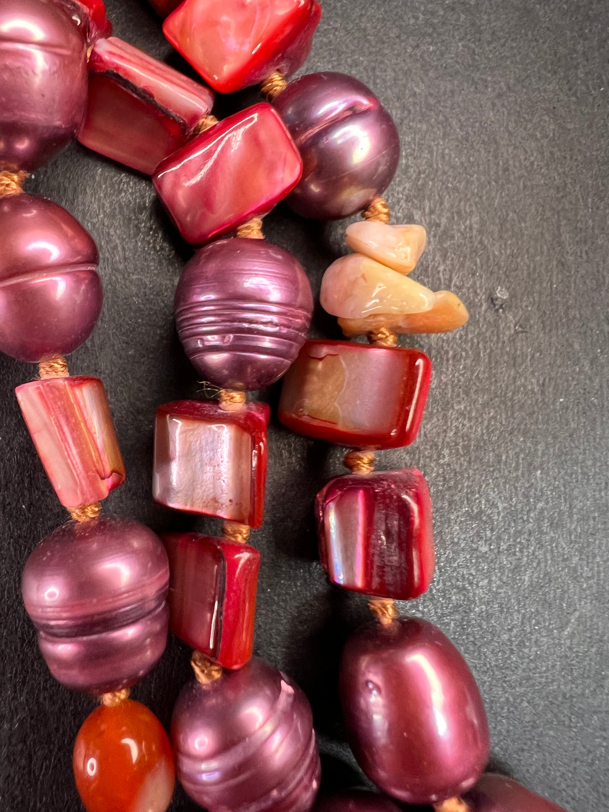 Genuine freshwater pearls dyed magneta/violet with a mix of carnelian beads in varying shapes and sizes , and dyed mother of pearl. Knotted in between each bead on a brownish color cord with a 925 sterling silver lobster clasp. Measures about 30 inches in length.