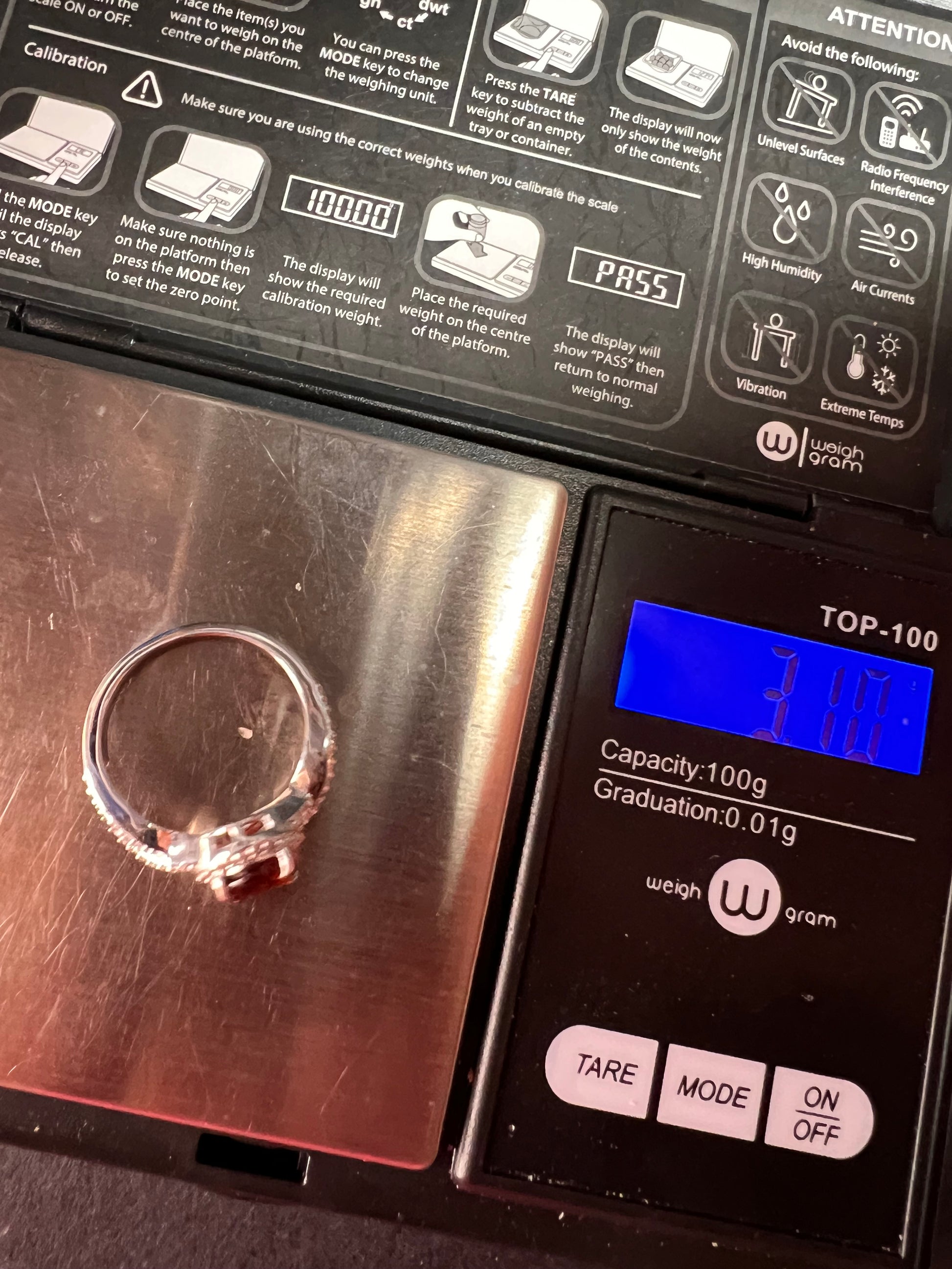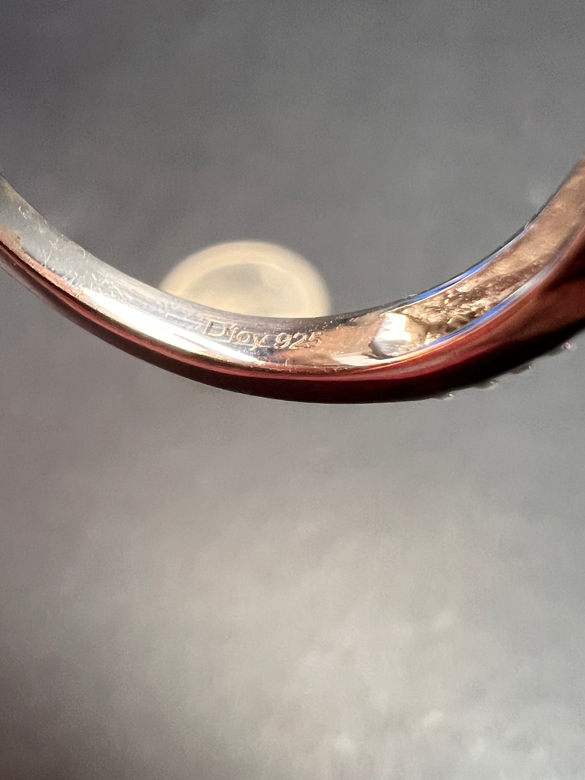 Genuine orange Ceylon Hessonite garnet gemstone prong set in authentic 925 sterling silver with a rhodium plating finish. Tiny white accent stones around halo and down shank are zircon. Measures a size 7 and has a total weight of 3.20 grams. 2.90 total ctw. 925 Djoy. Made in India. Estimated retail value is $729