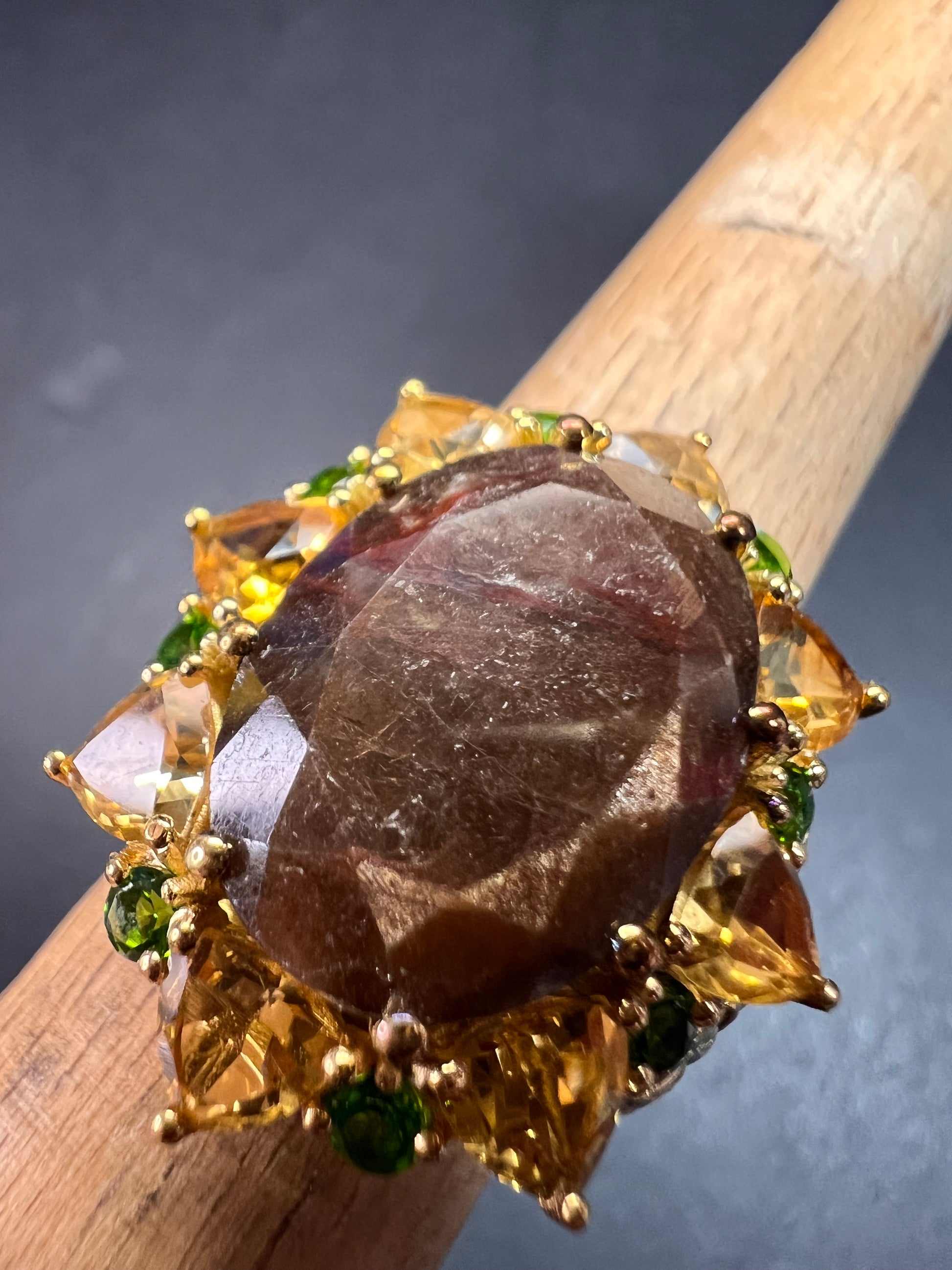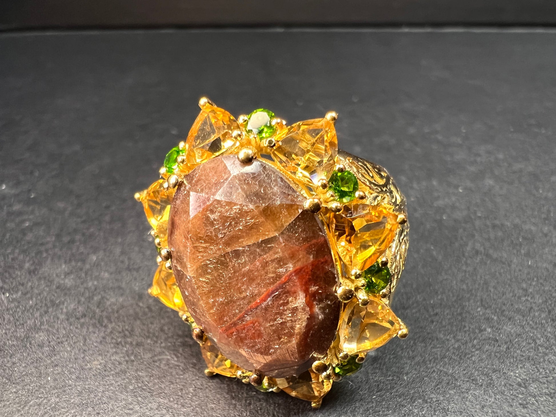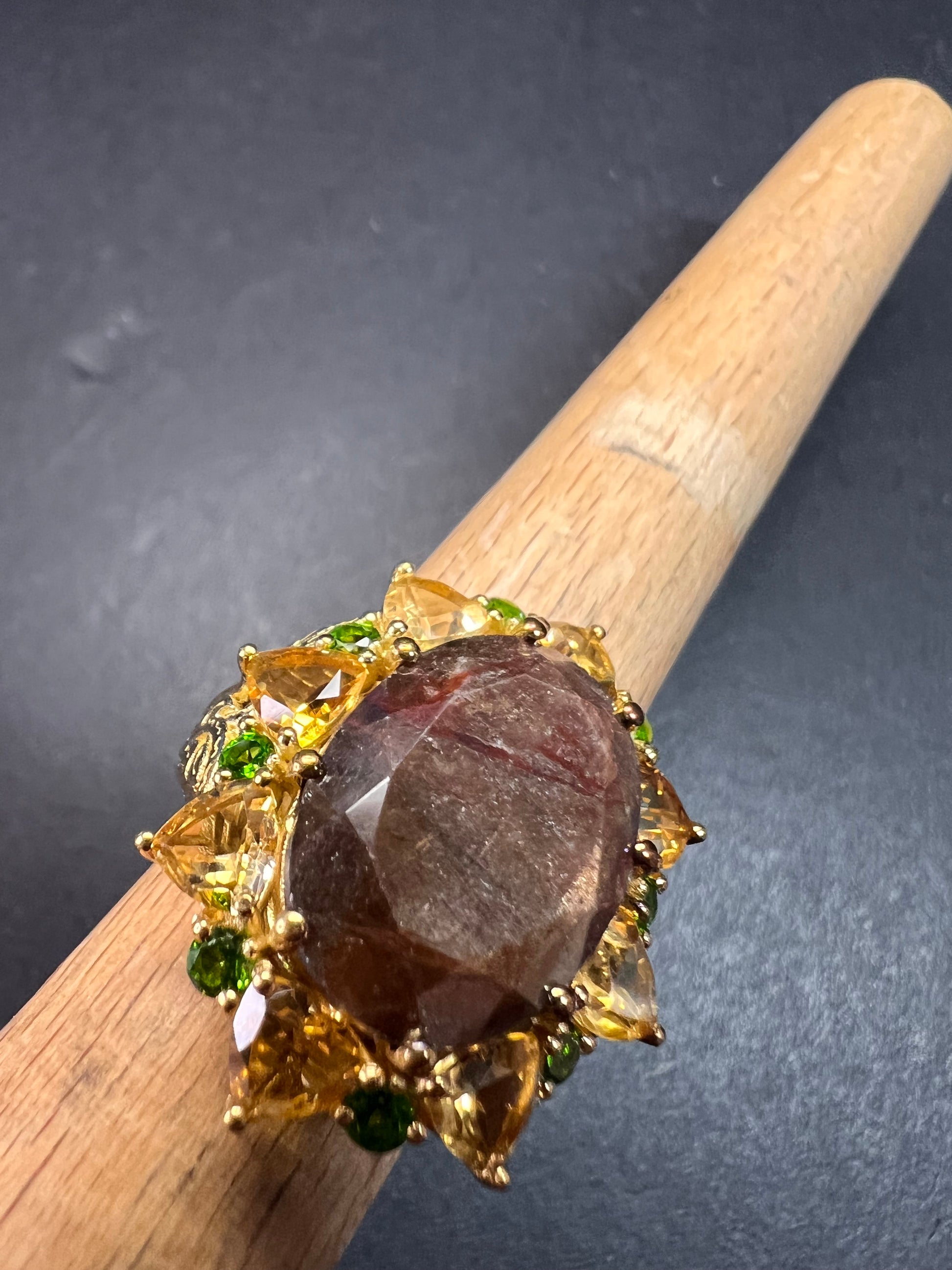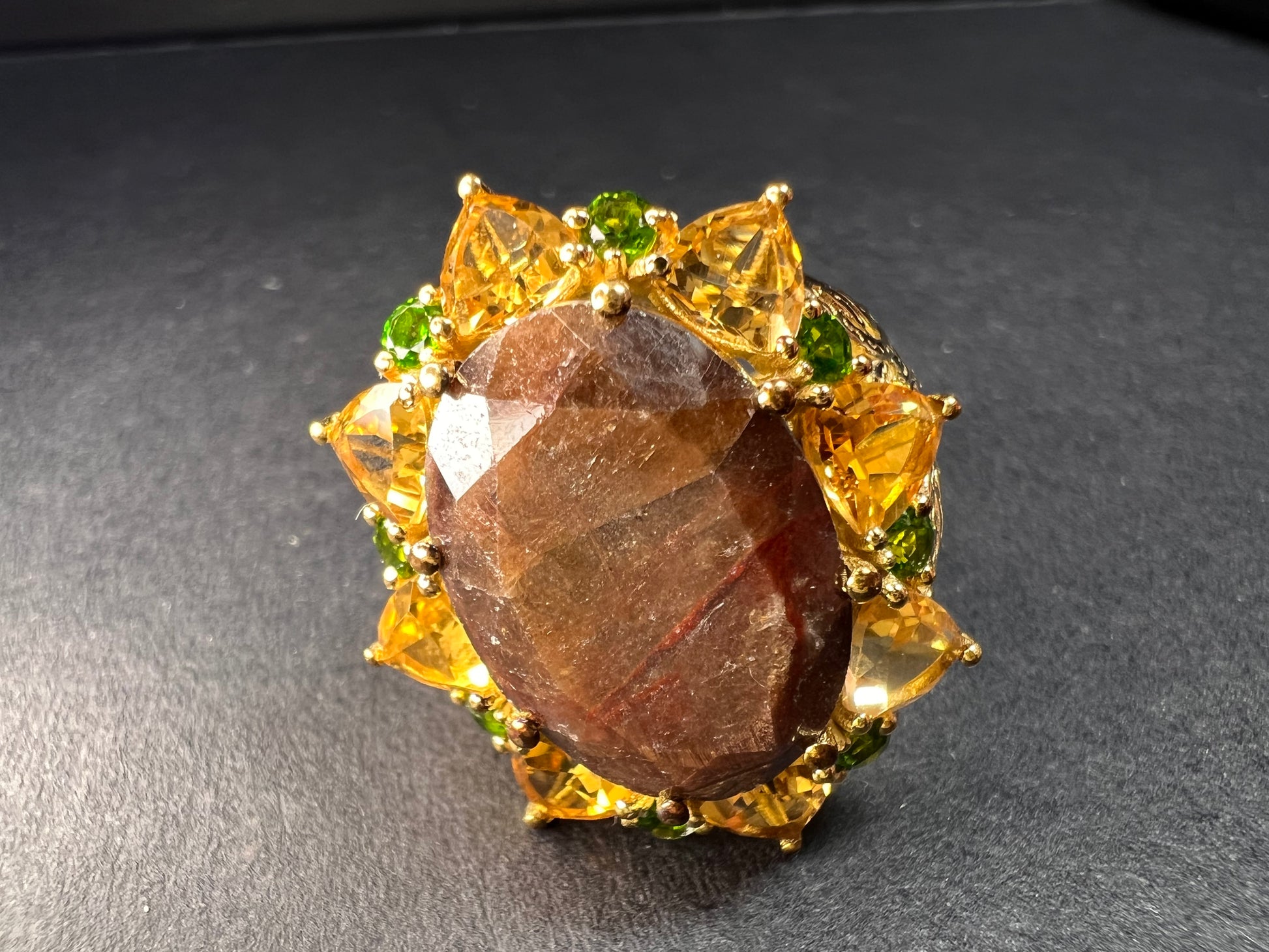 Genuine Zawdi chocolate sapphire corundum gemstone prong set in an authentic 925 sterling silver base with an 18k yellow gold vermeil over. Measures a size 7. Accent stones around the sapphire are citrine and chrome diopside. Chocolate sapphire looks like it has hematite in it or another element producing the unique red vein through it. Total weight is 10.63 grams. Total ctw is 16.70. Djoy. Made in India. Estimated retail value is $730.