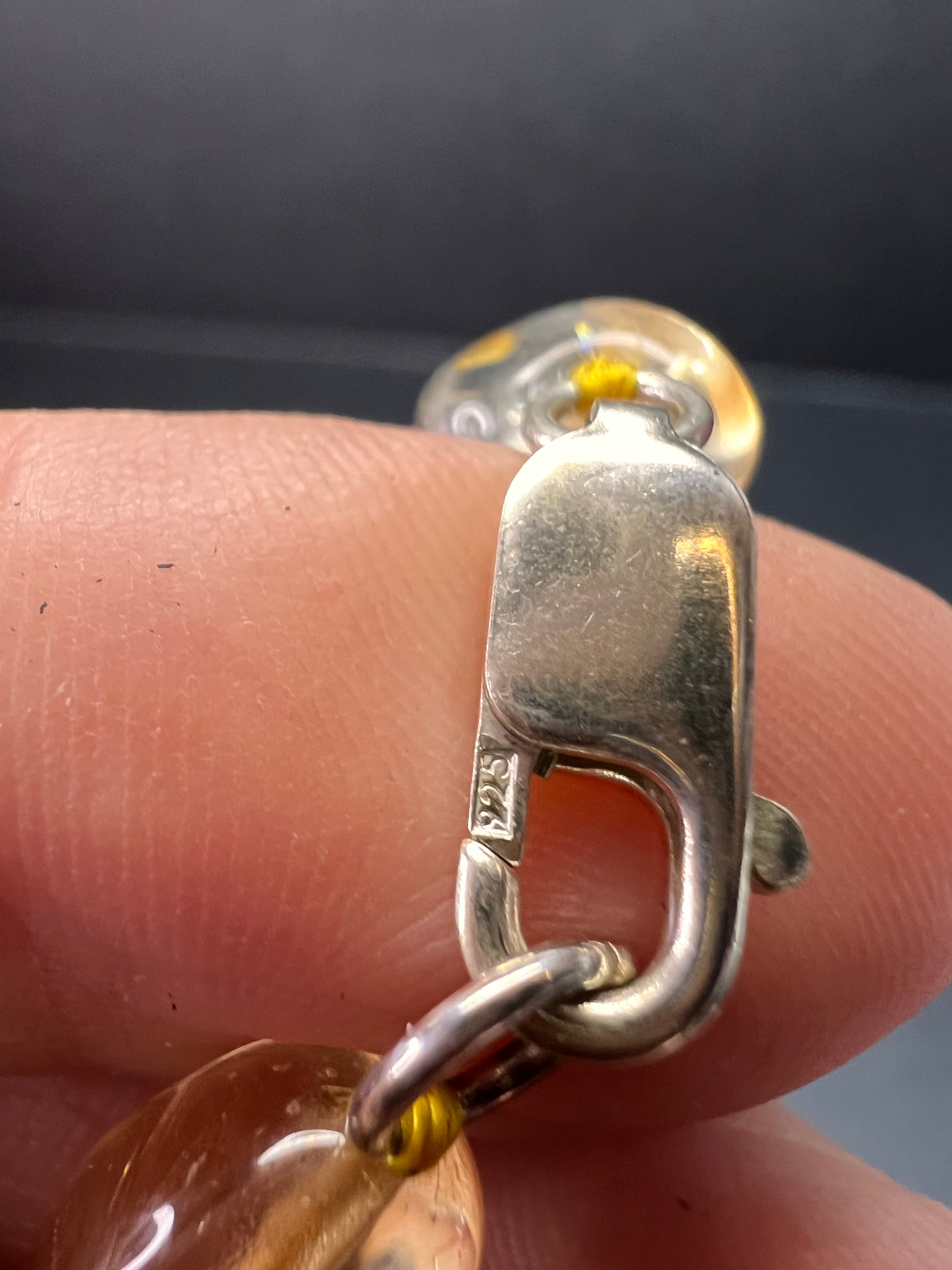 Genuine citrine stone beads strung on yellow cord hand knotted between each bead measuring about 20 inches in length with a 925 sterling silver lobster clasp.