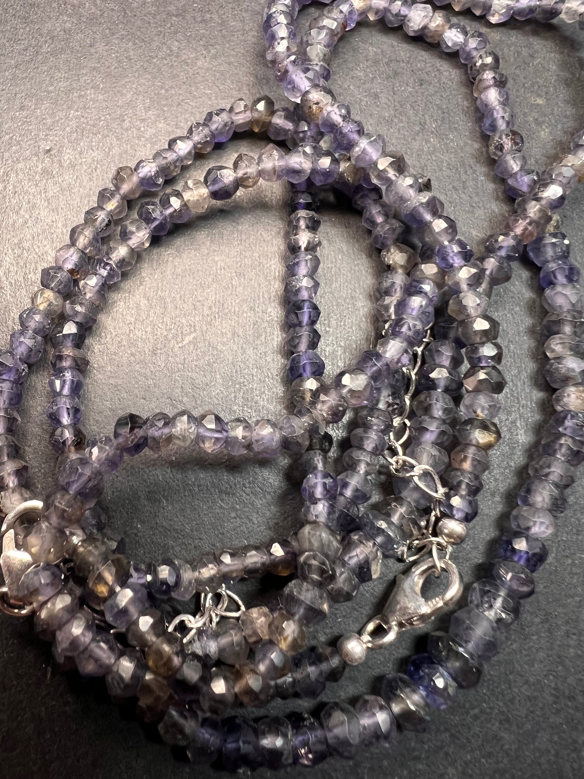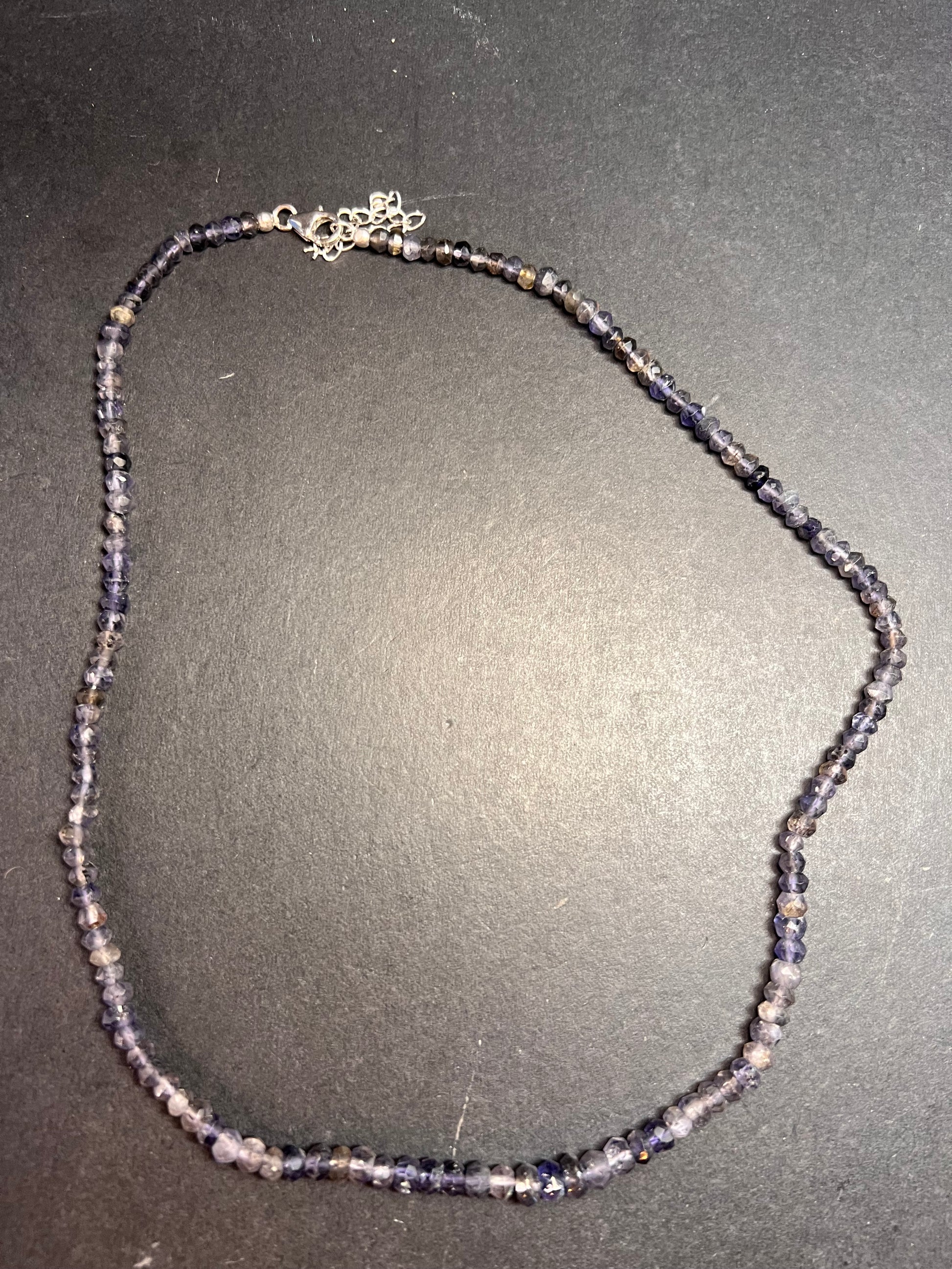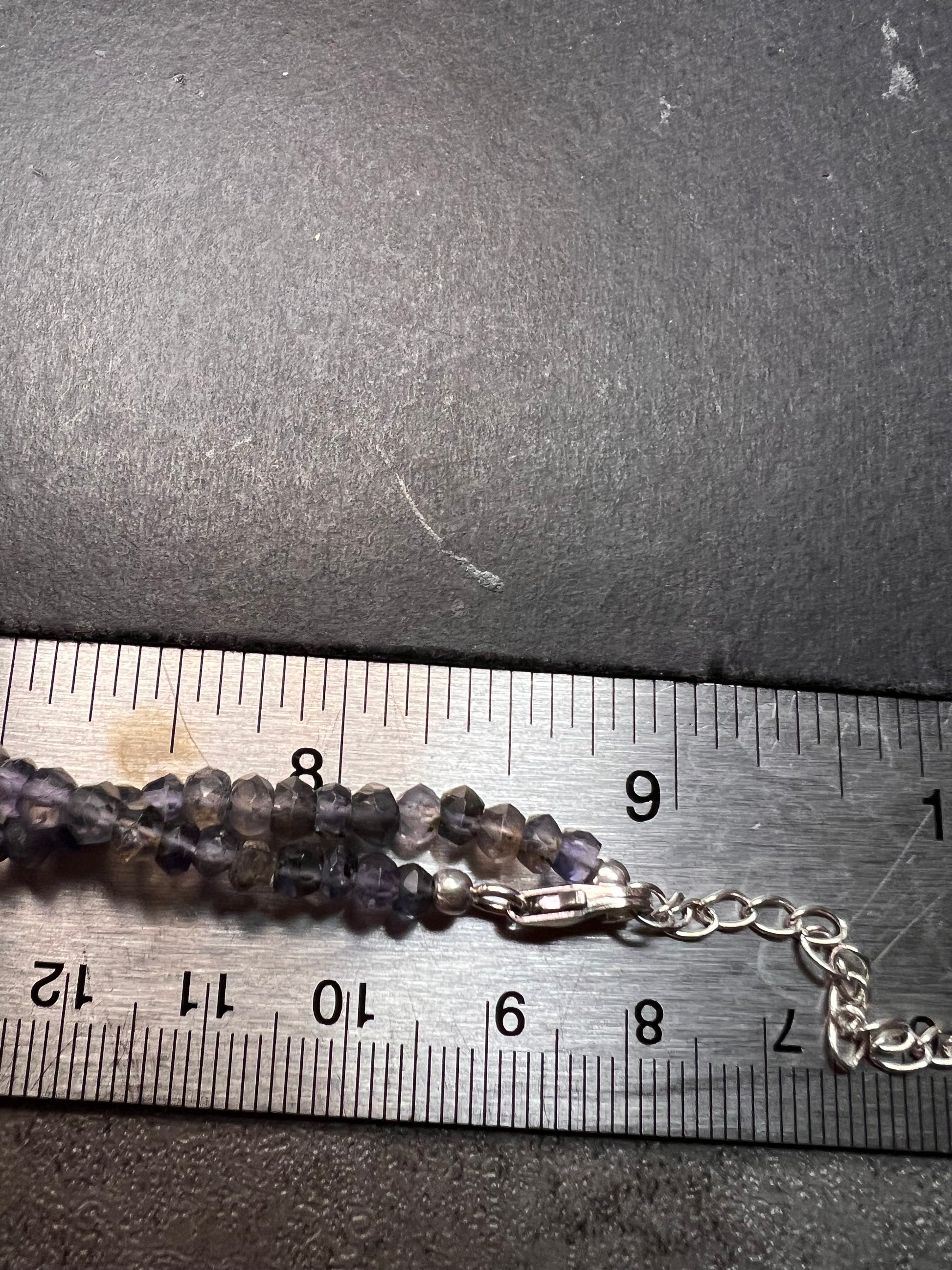 Genuine Catalina iolite faceted beads strung on a 18 inch strand that can be elongated another two inches with extension chain. 925 sterling silver lobster claw clasp and extension chain plated with rhodium. Strung on wire. Made in India. Photos show two necklaces. Listing is for just one. Estimated retail value is $160.