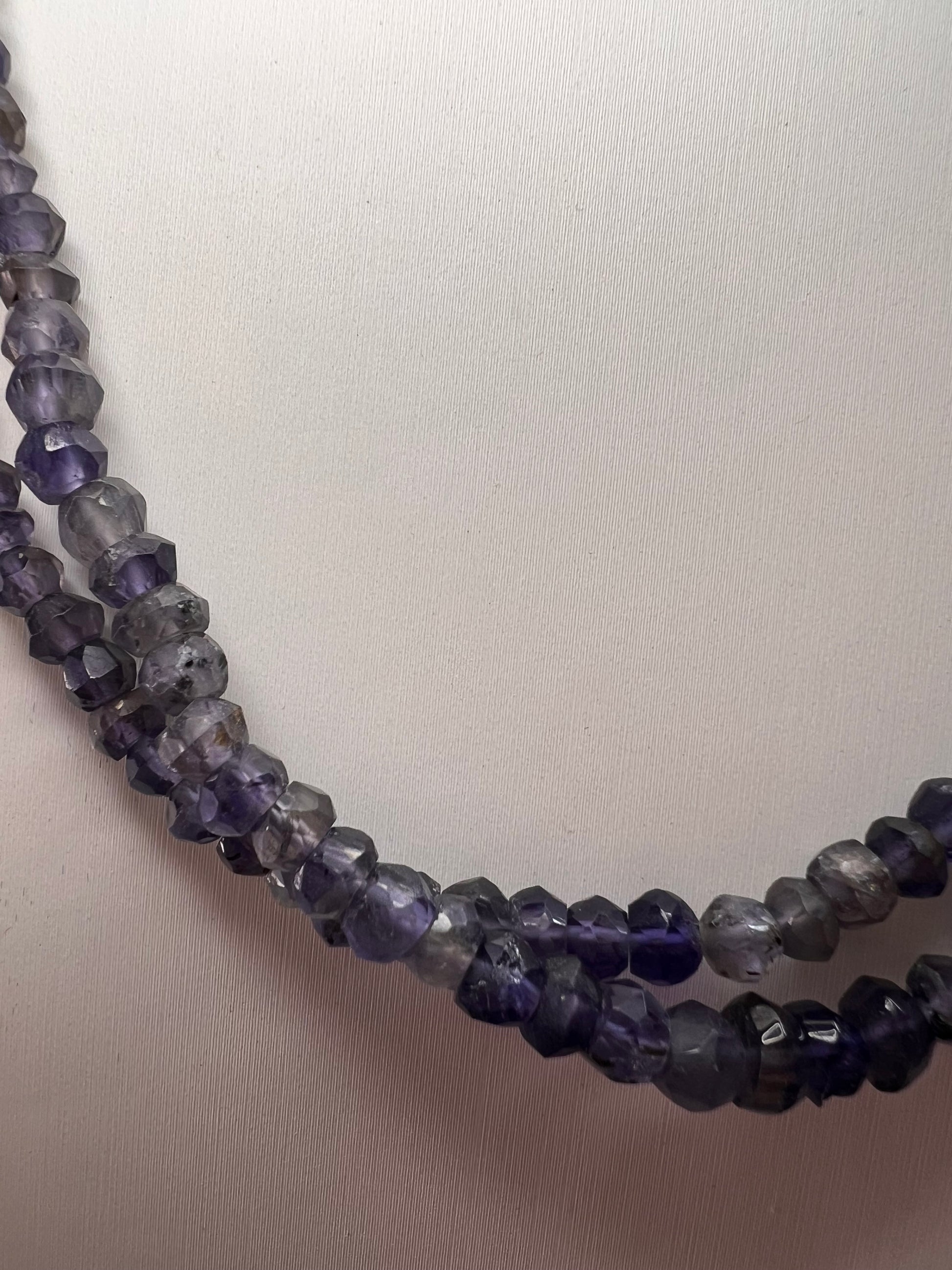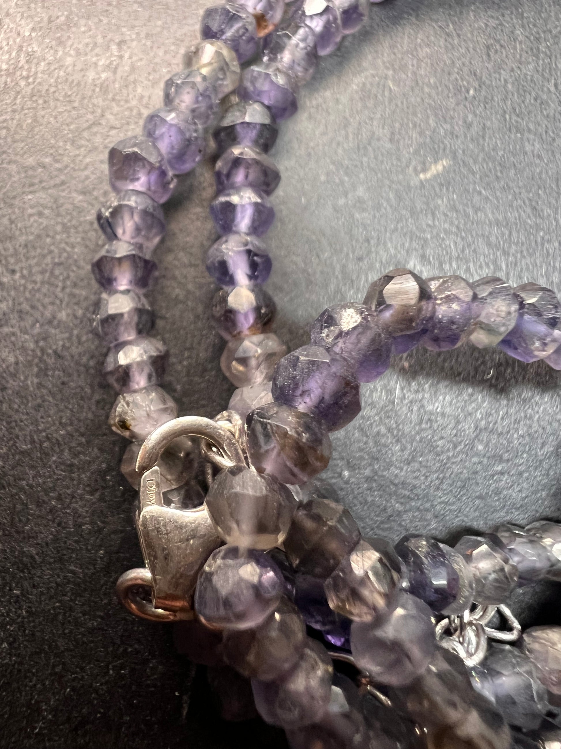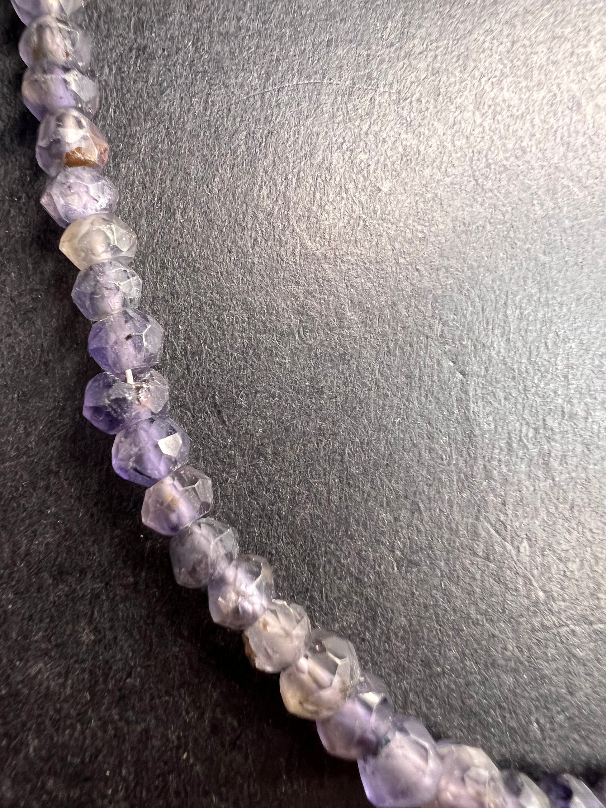 Genuine Catalina iolite faceted beads strung on a 18 inch strand that can be elongated another two inches with extension chain. 925 sterling silver lobster claw clasp and extension chain plated with rhodium. Strung on wire. Made in India. Photos show two necklaces. Listing is for just one. Estimated retail value is $160.