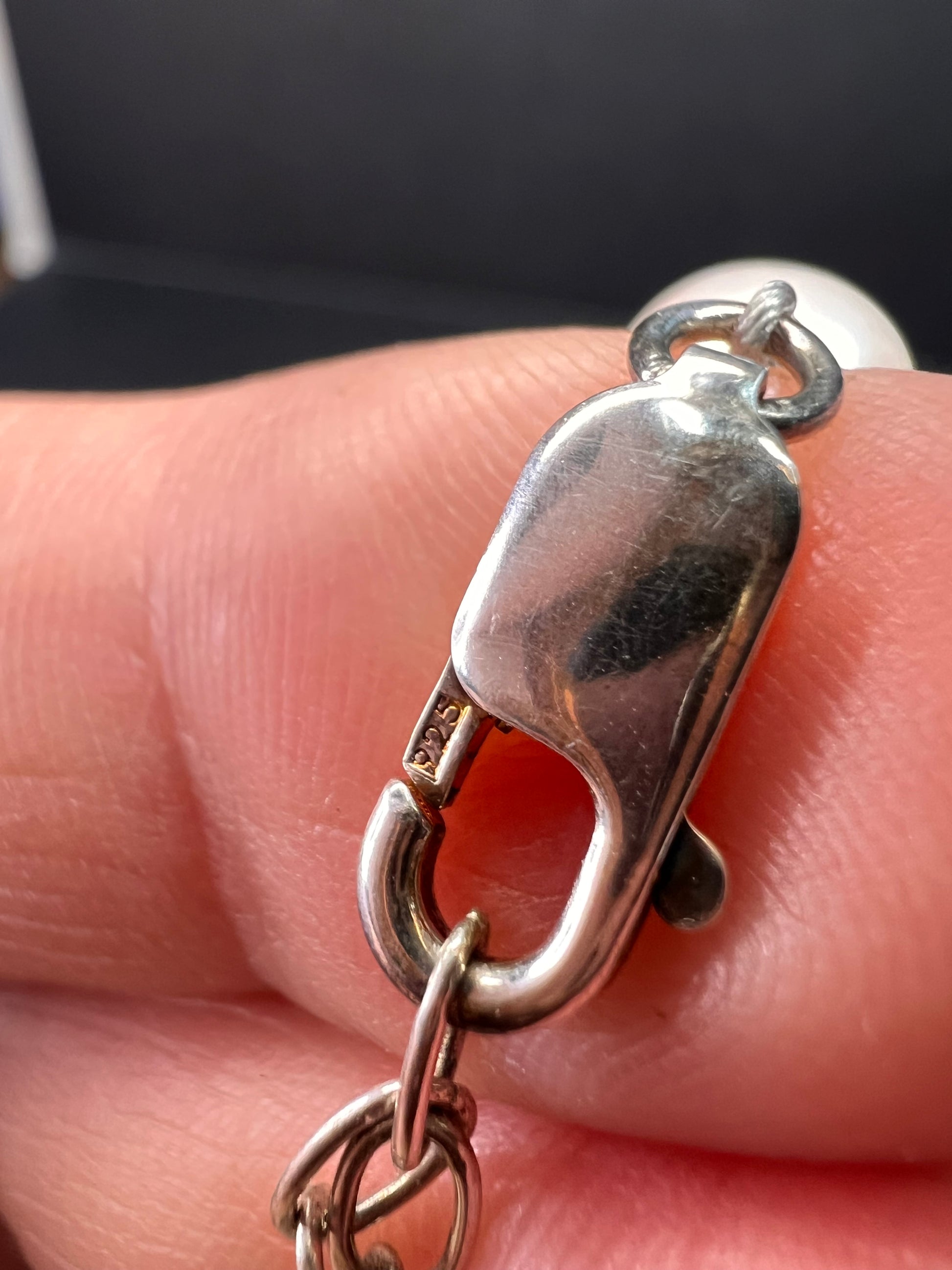 Genuine white freshwater cultured pearl strung on sturdy jewelers wire with three jumbo oval agate beads that appear to have been dyed. Measures 18 inches in length with a 925 sterling silver lobster flask and 2 inch extension chain.
