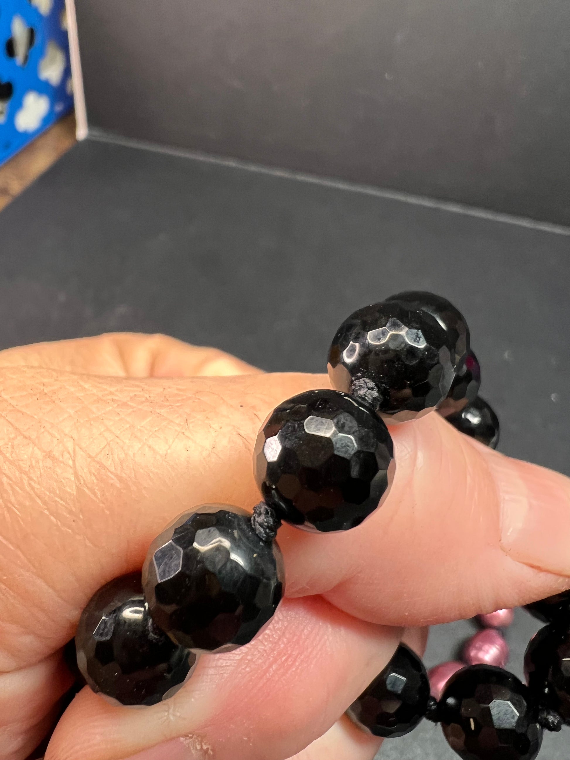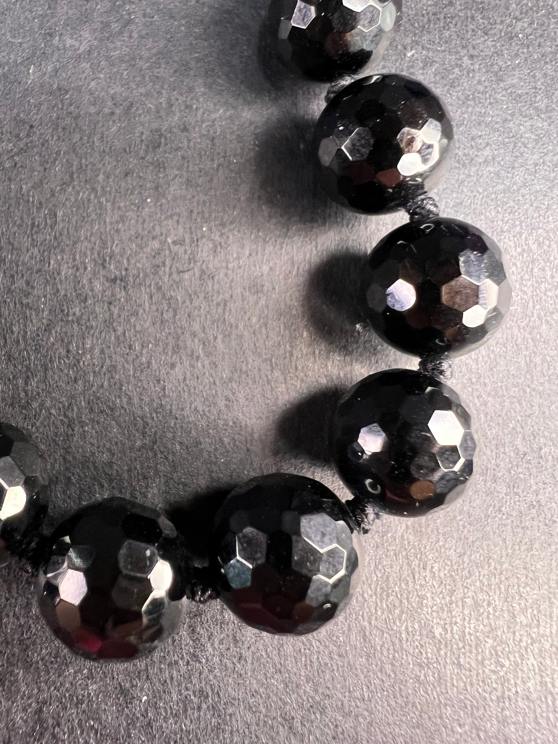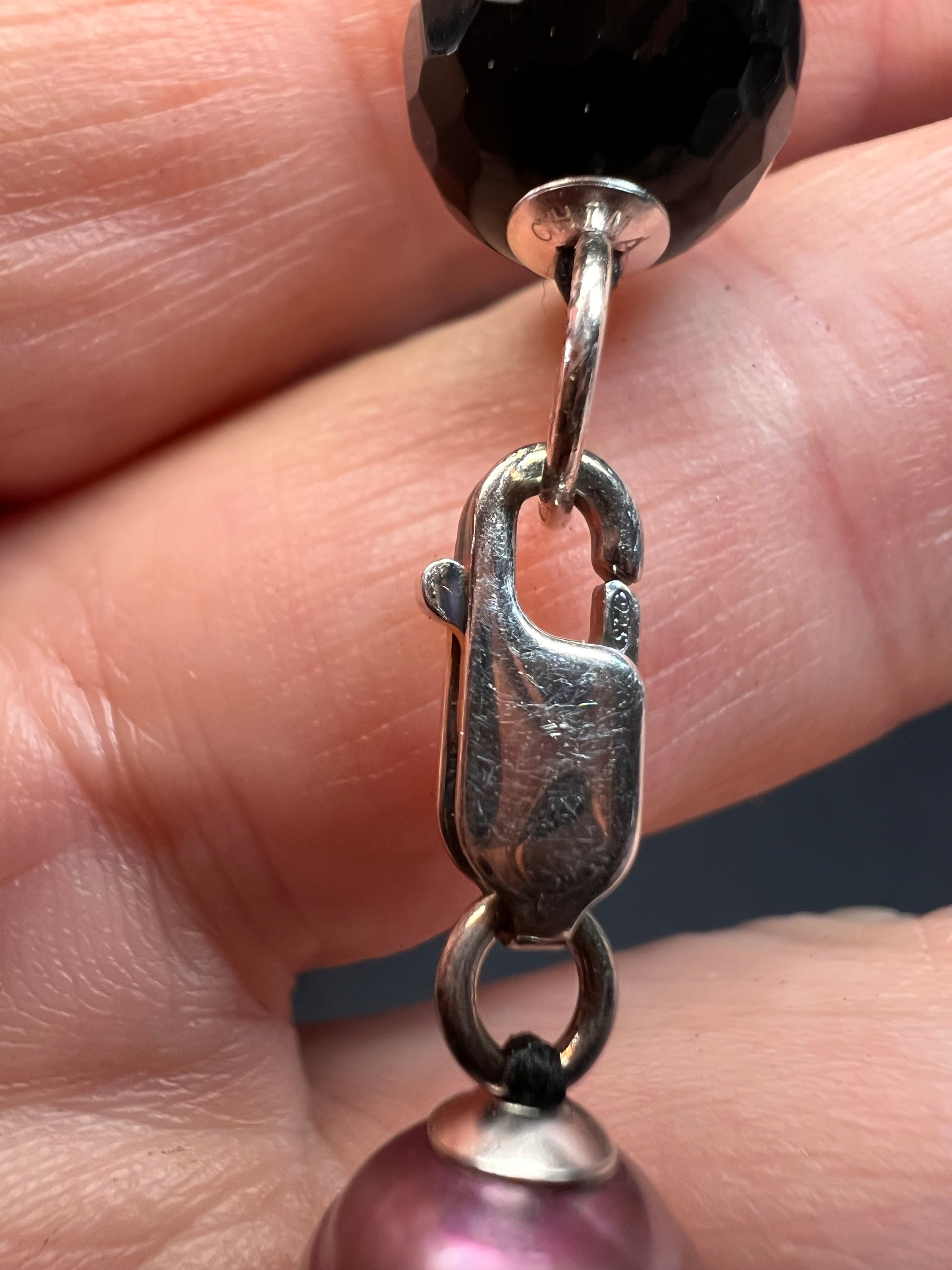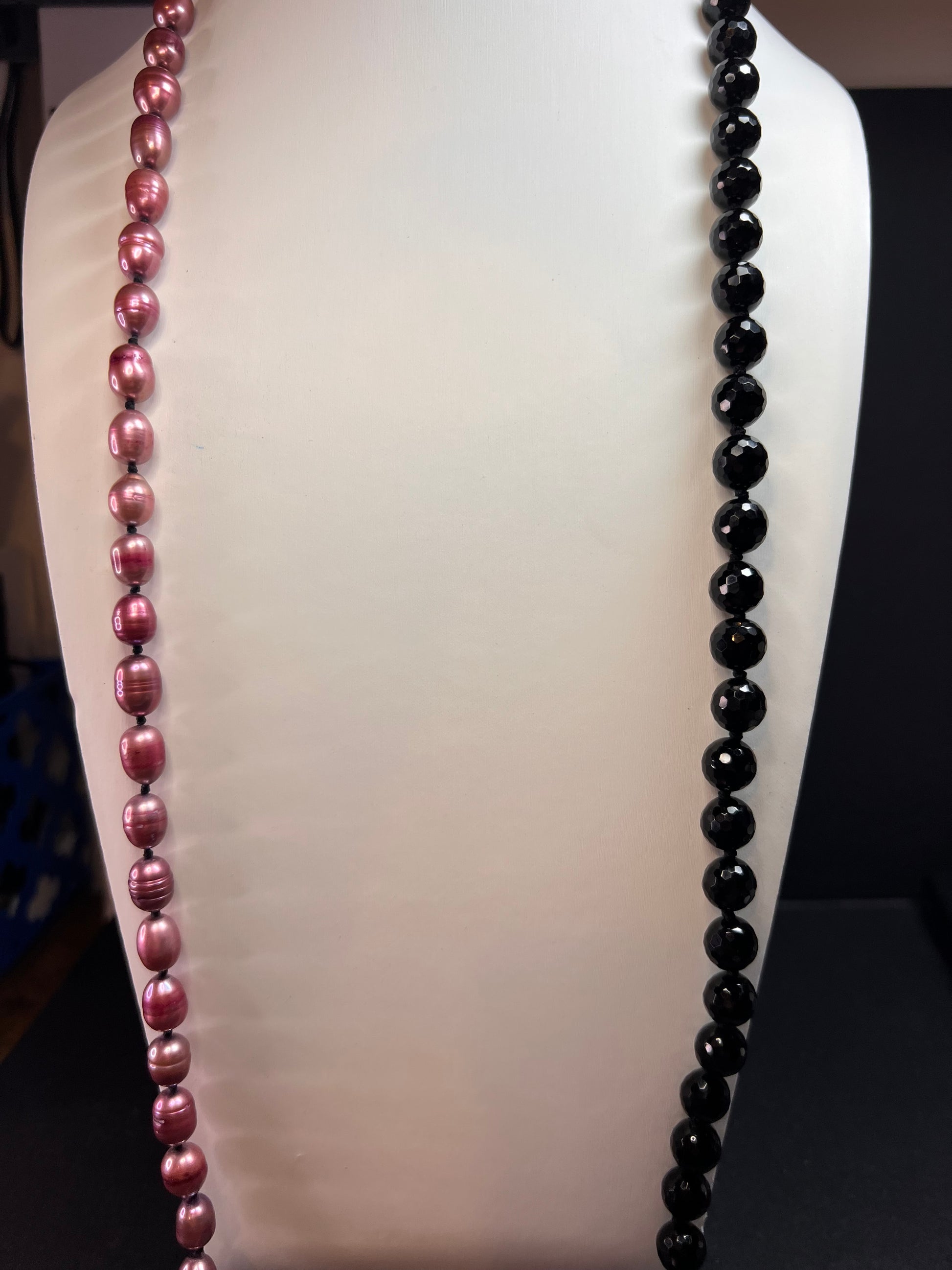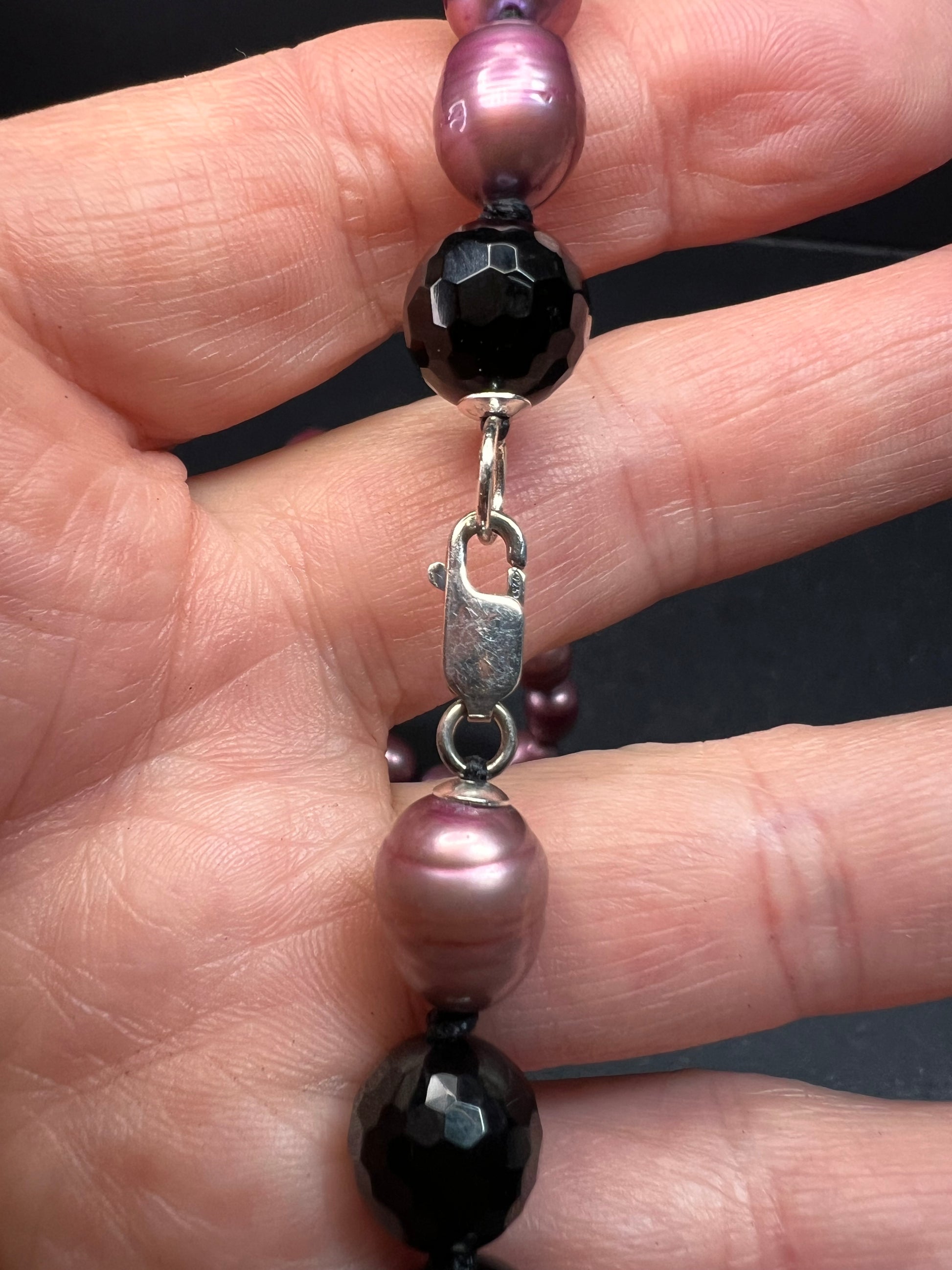 Genuine freshwater pearls that have been dyed violet purple , and black tourmaline faceted beads. Strung on black cord and hand knotted between each bead. Measures about 37 inches in length with a 925 sterling silver lobster clasp.