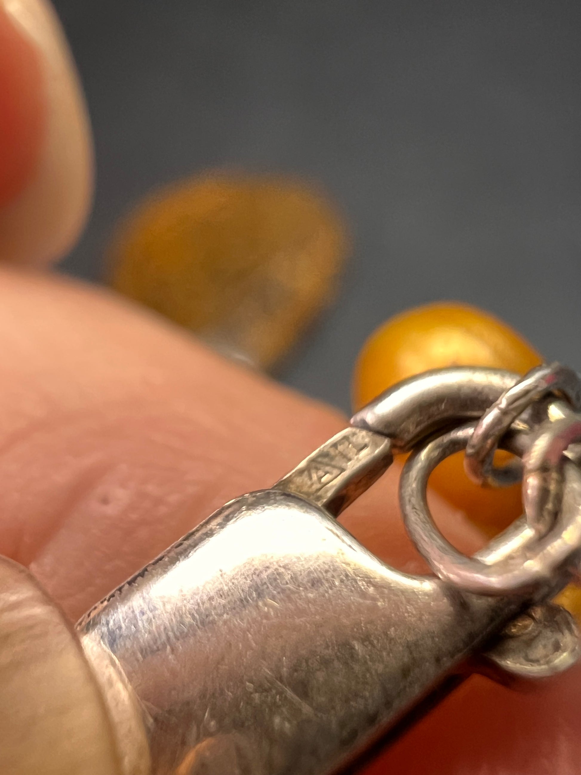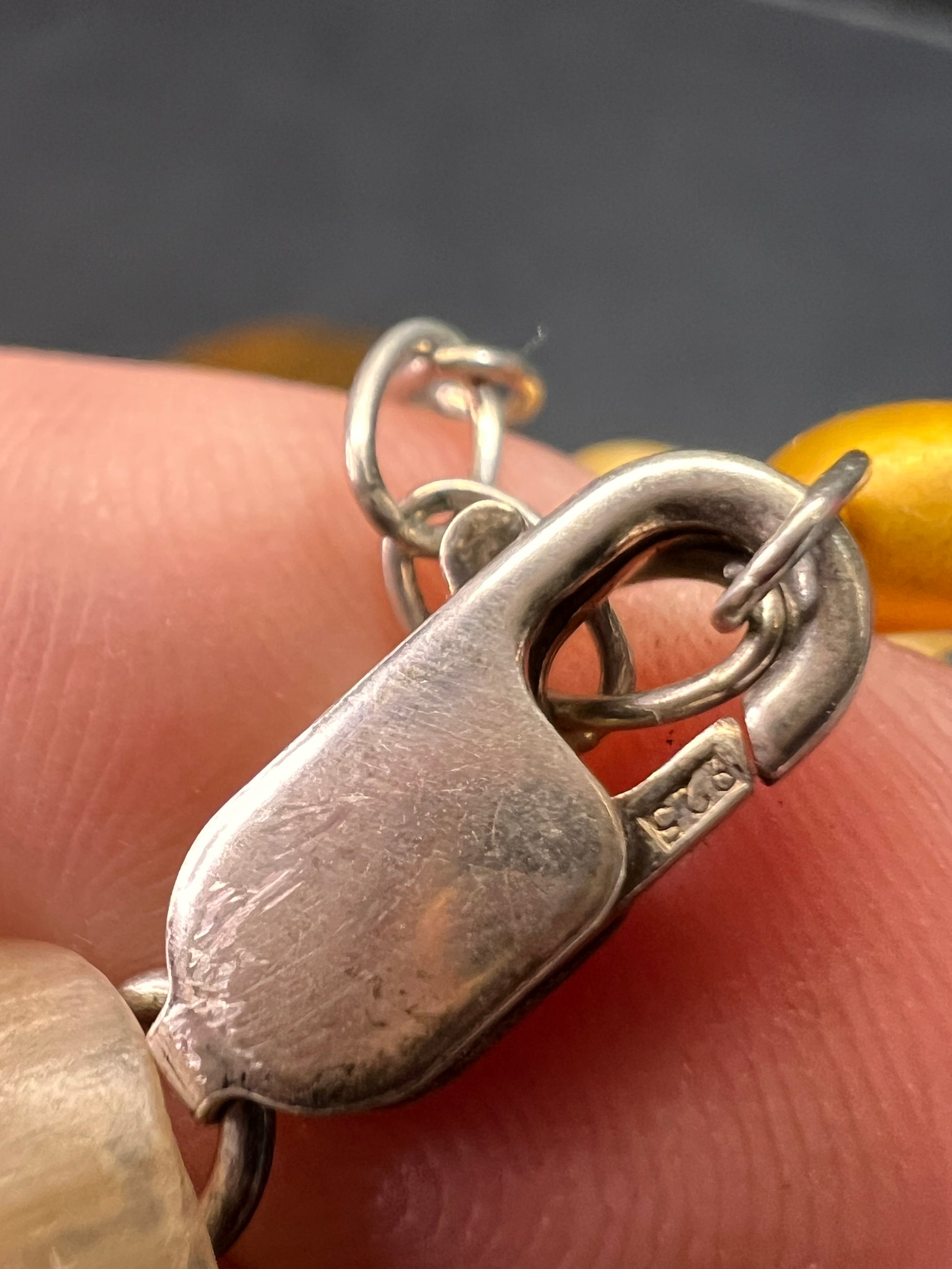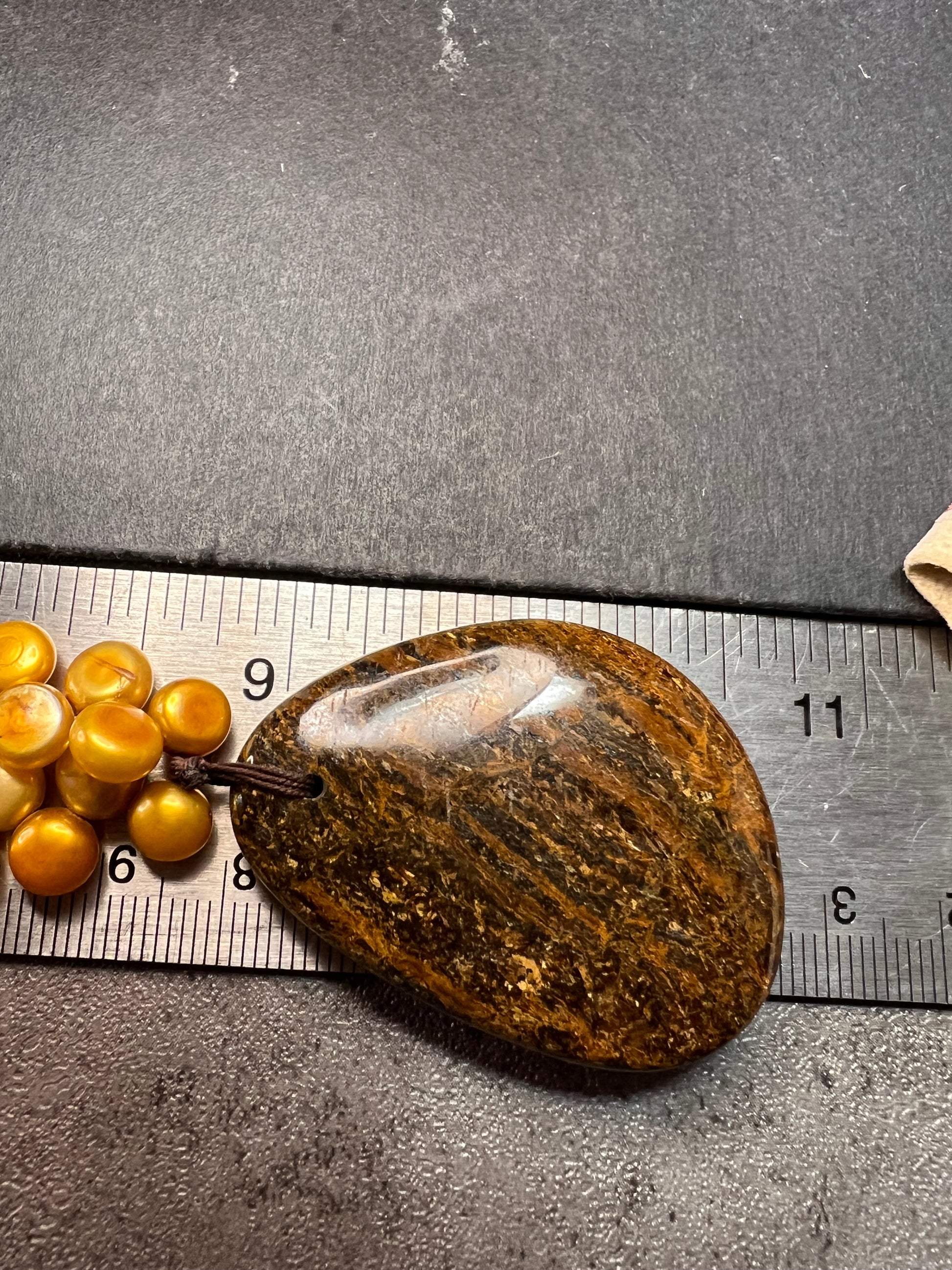 Genuine golden champagne colored freshwater pearls strung about 18 inches in length with a bronzite stone pendant hung from the middle on brown cord. 925 sterling silver lobster clasp with 2 inch sterling silver extension chain. AlumaUSA. Made in China.