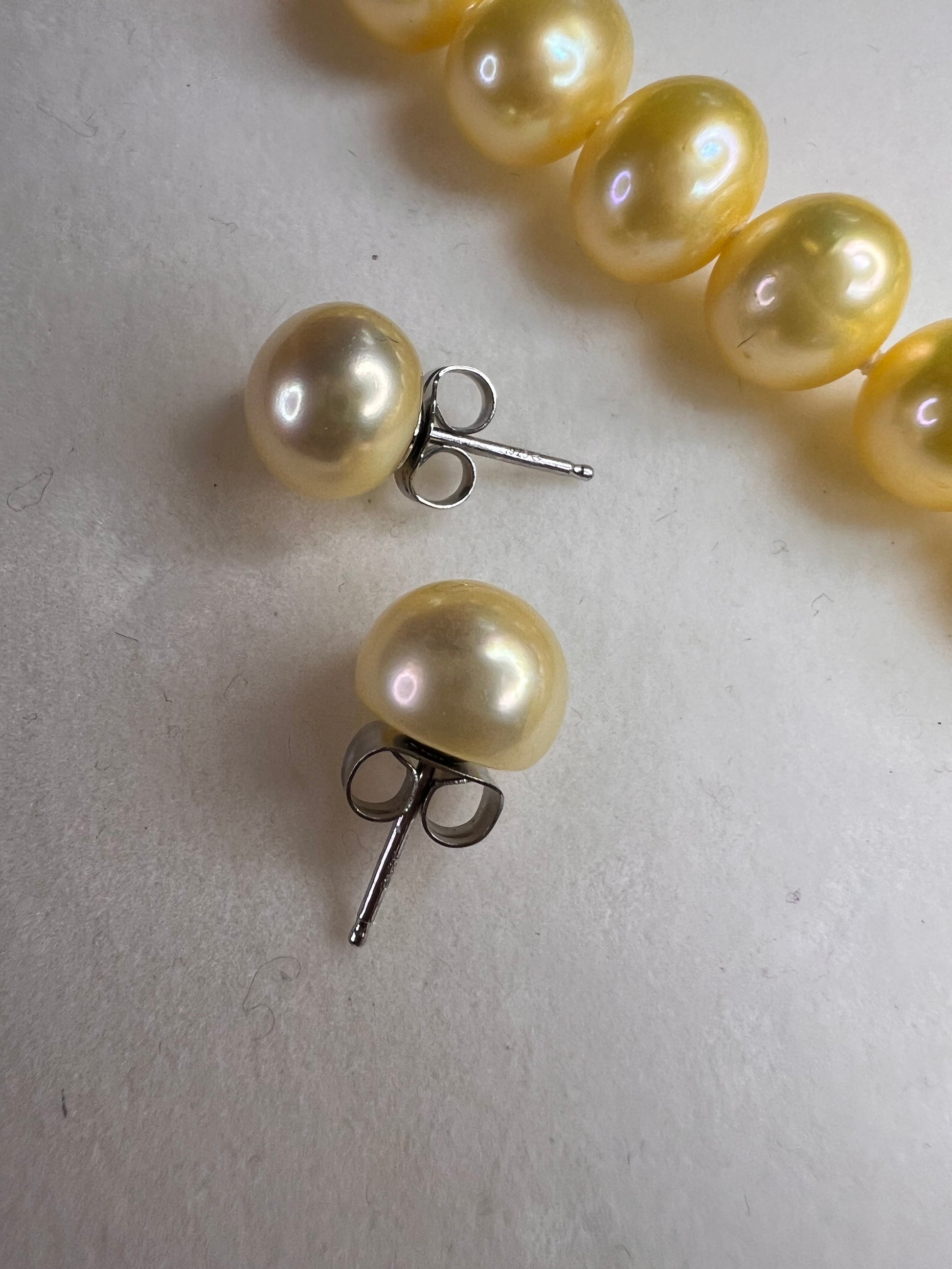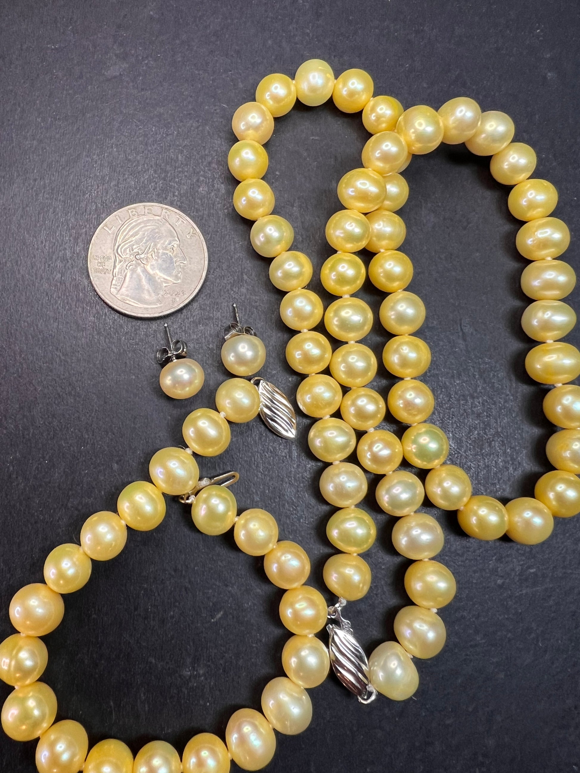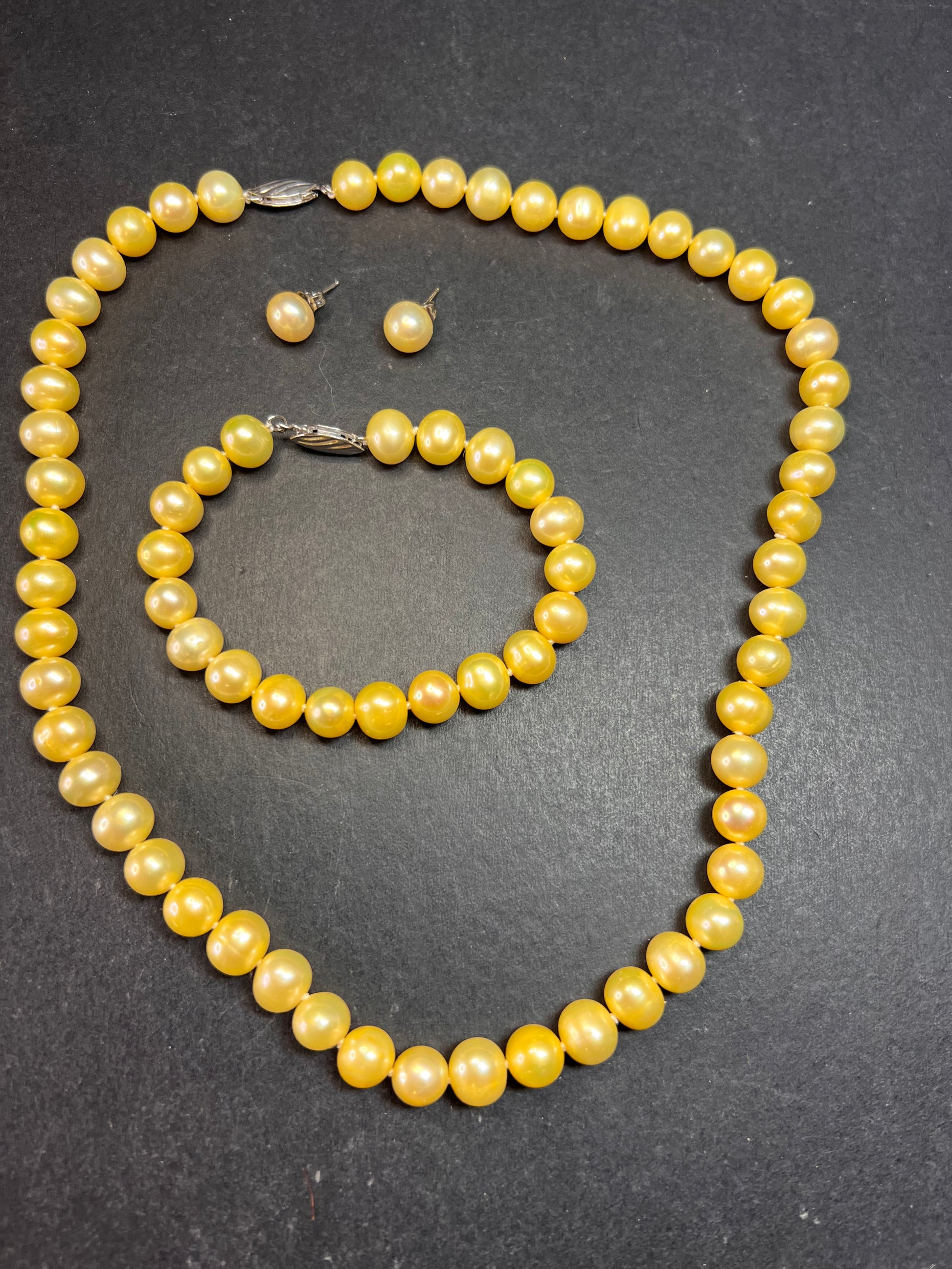 Beautiful new freshwater pearl boxed gift set featuring a matching necklace, bracelet, and stud earrings with genuine sterling silver clasps and earring posts. Necklace measures approximately 18 inches and the bracelet measures 7 inches. Pearls average between 8–9mm and are a rich golden yellow tone that has been color enhanced/dyed, which is common and accepted in the pearl industry. Pearls have nice luster and natural organic shape variation typical of real cultured freshwater pearls. All sterling components are stamped .925. Set appears unworn and was removed from the box only for photos. The box is sturdy and still displays nicely, but there are visible stains on the bottom and some general surface wear from storage, as shown in photos. A lovely ready-to-gift pearl set.