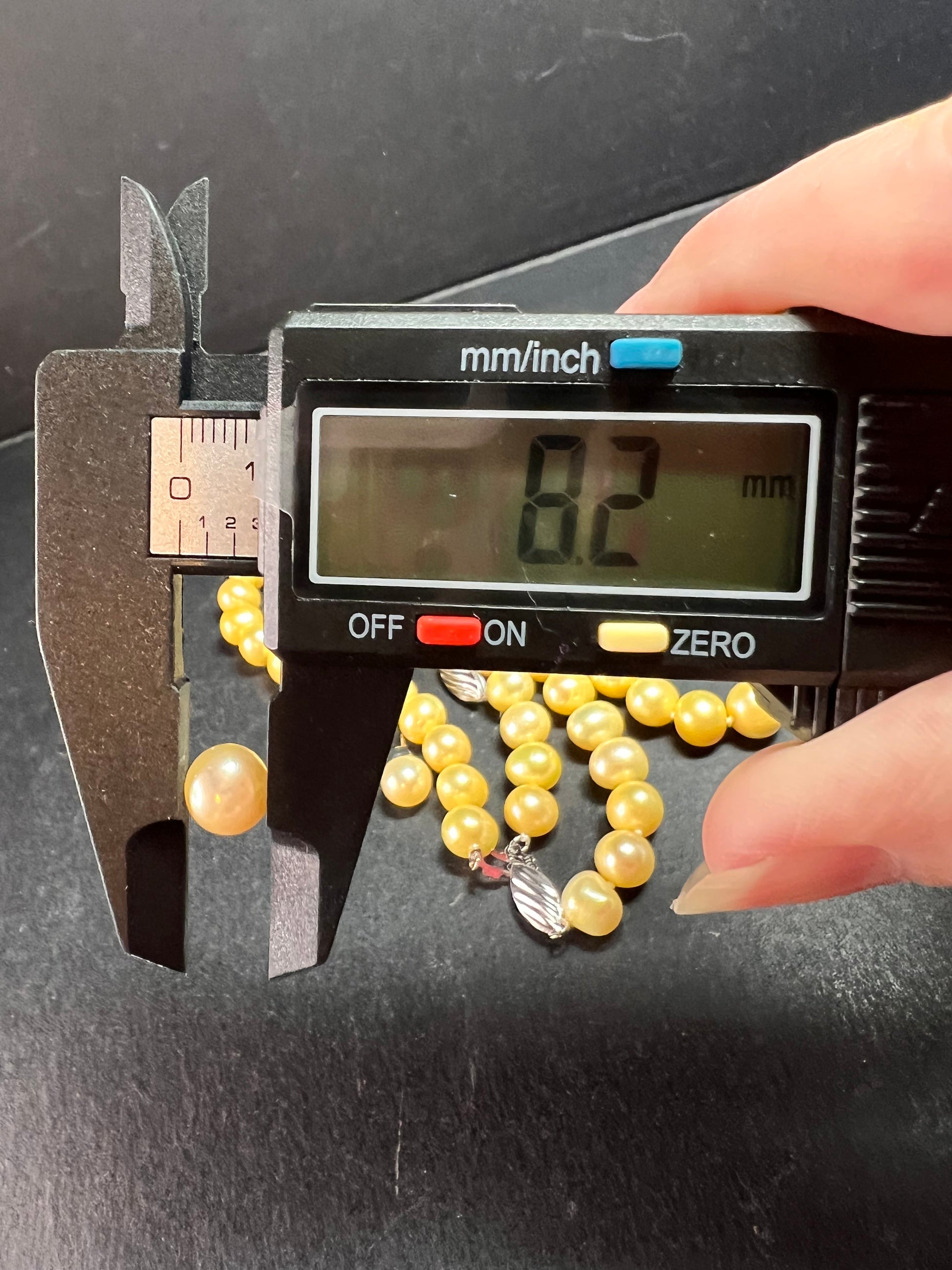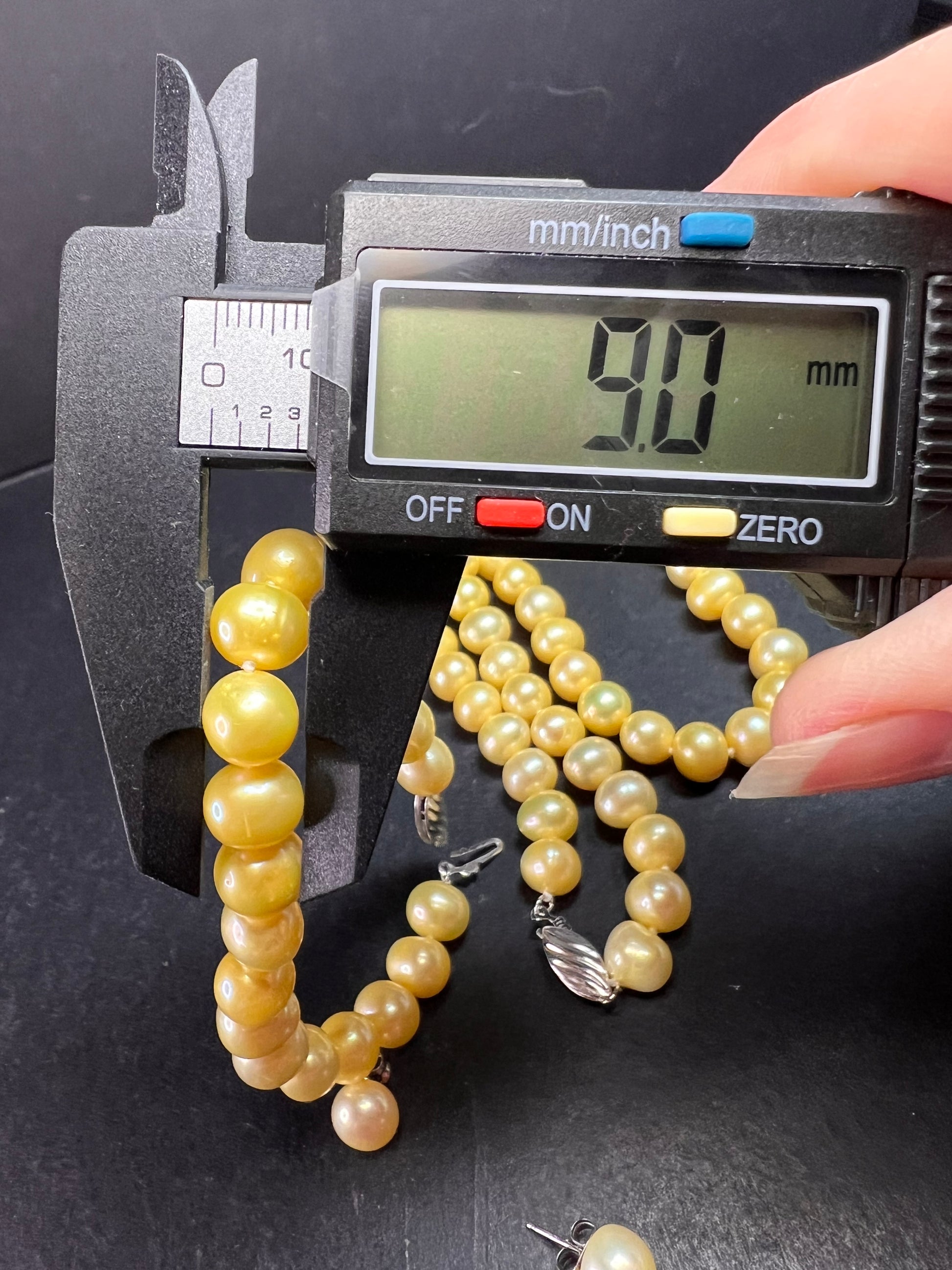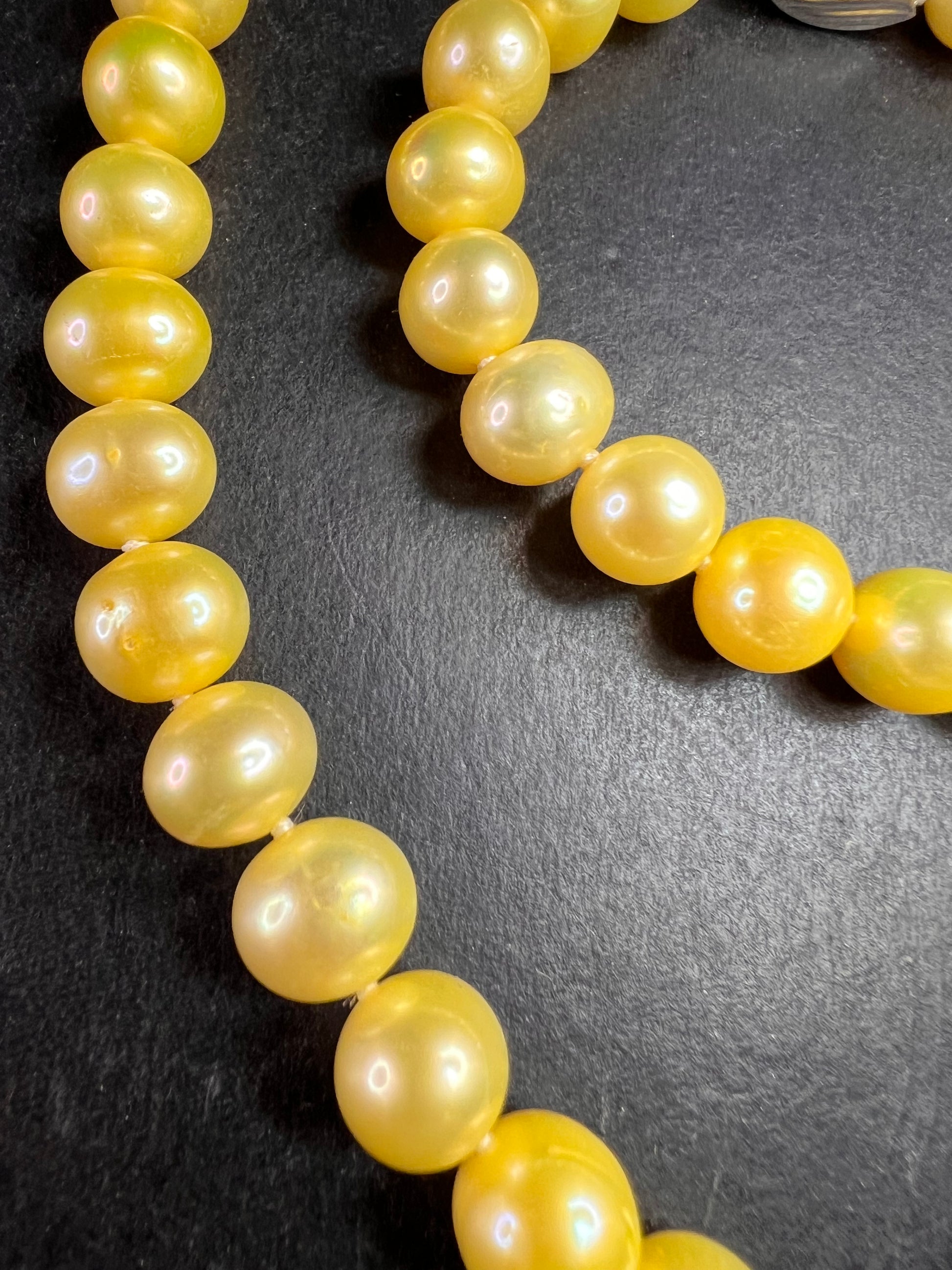 Beautiful new freshwater pearl boxed gift set featuring a matching necklace, bracelet, and stud earrings with genuine sterling silver clasps and earring posts. Necklace measures approximately 18 inches and the bracelet measures 7 inches. Pearls average between 8–9mm and are a rich golden yellow tone that has been color enhanced/dyed, which is common and accepted in the pearl industry. Pearls have nice luster and natural organic shape variation typical of real cultured freshwater pearls. All sterling components are stamped .925. Set appears unworn and was removed from the box only for photos. The box is sturdy and still displays nicely, but there are visible stains on the bottom and some general surface wear from storage, as shown in photos. A lovely ready-to-gift pearl set.