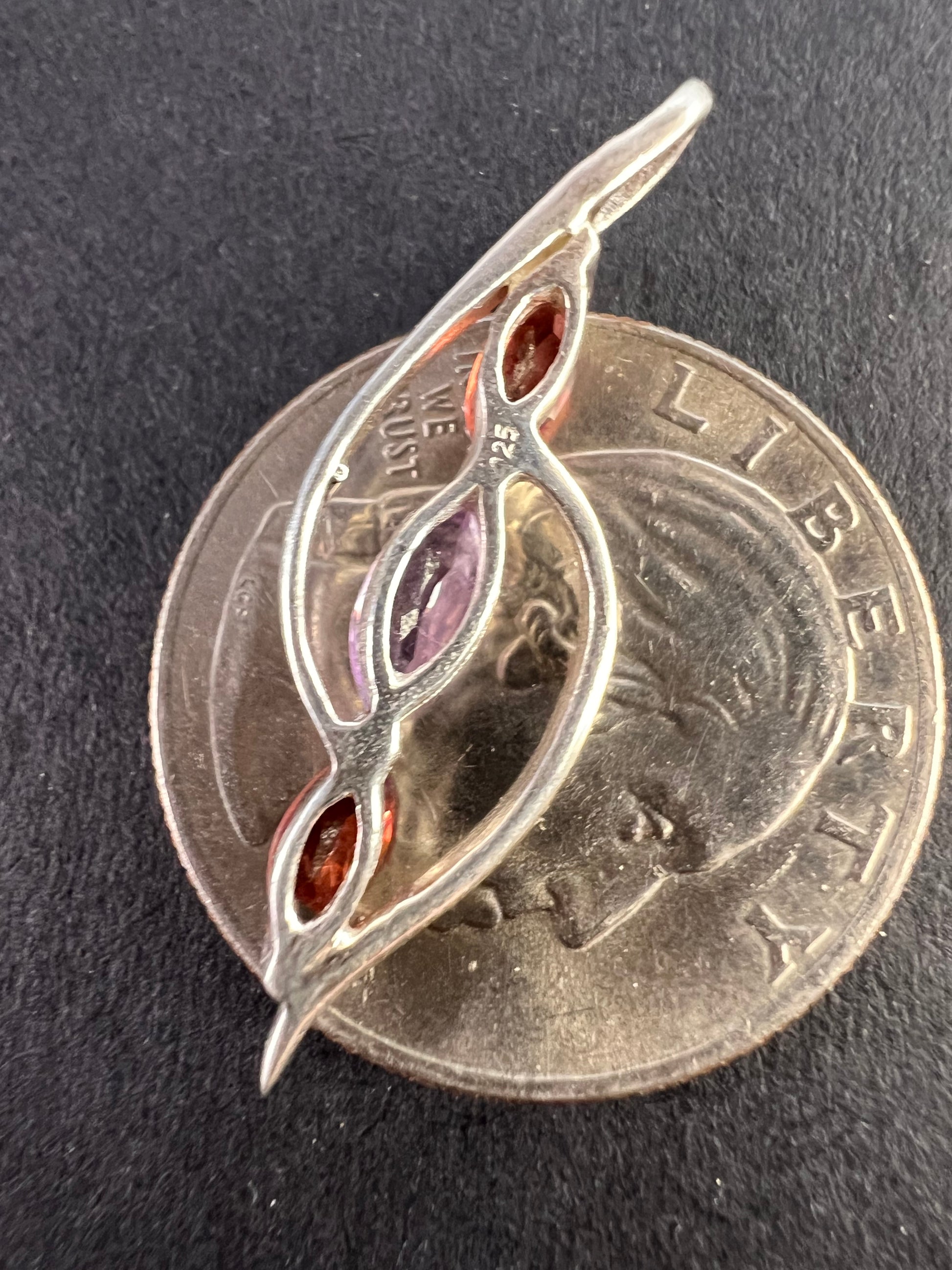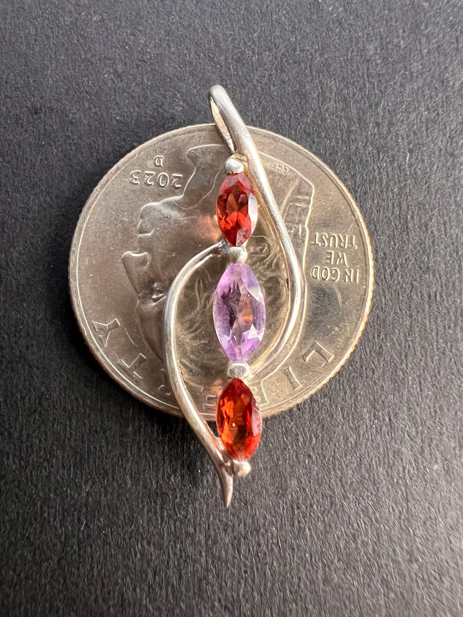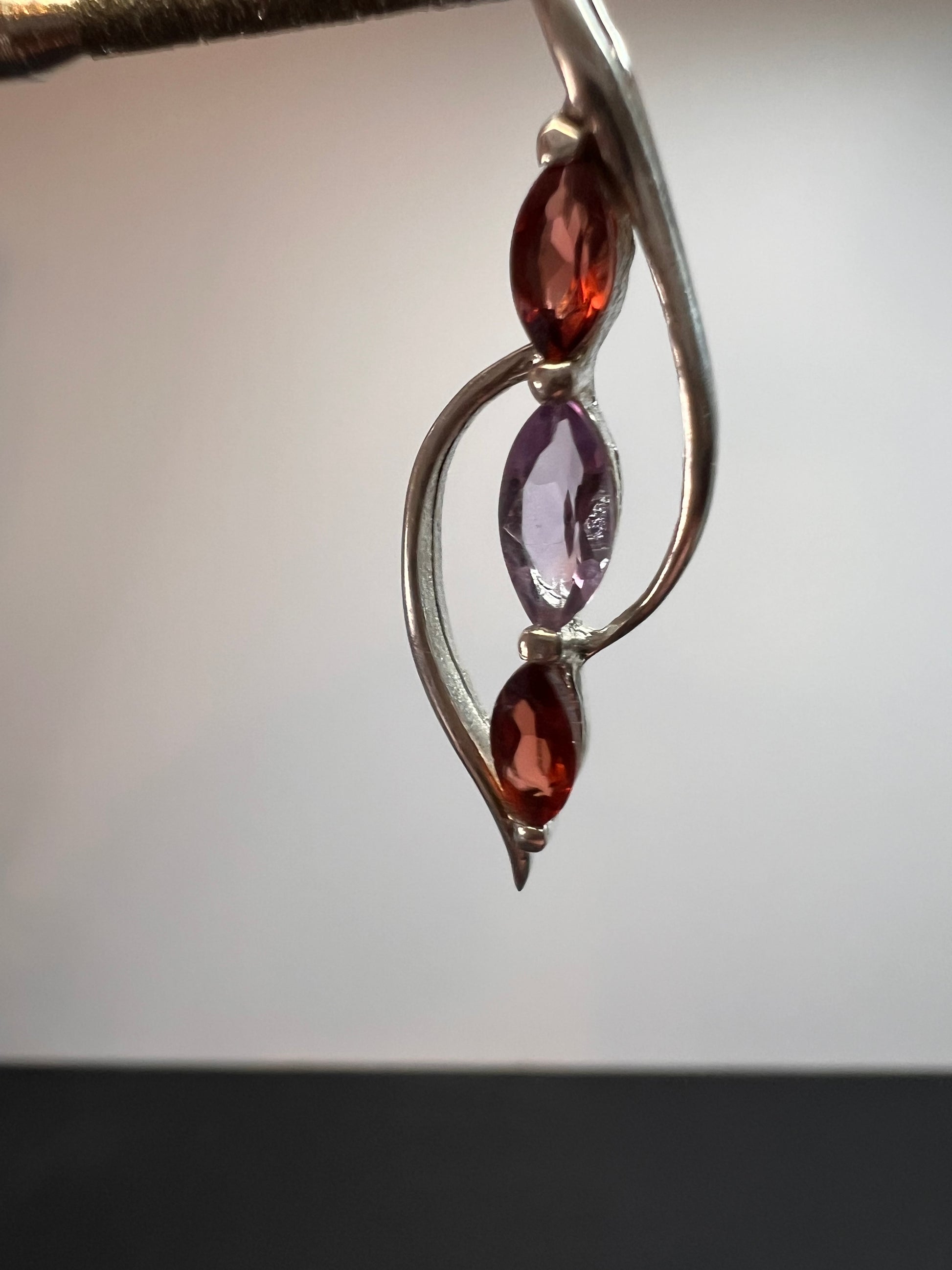 Genuine amethyst and garnet marquis gemstones set in authentic 925 sterling silver. Pendant measures about 1.25 inches in length and has a total weight of just over 1.40 grams.