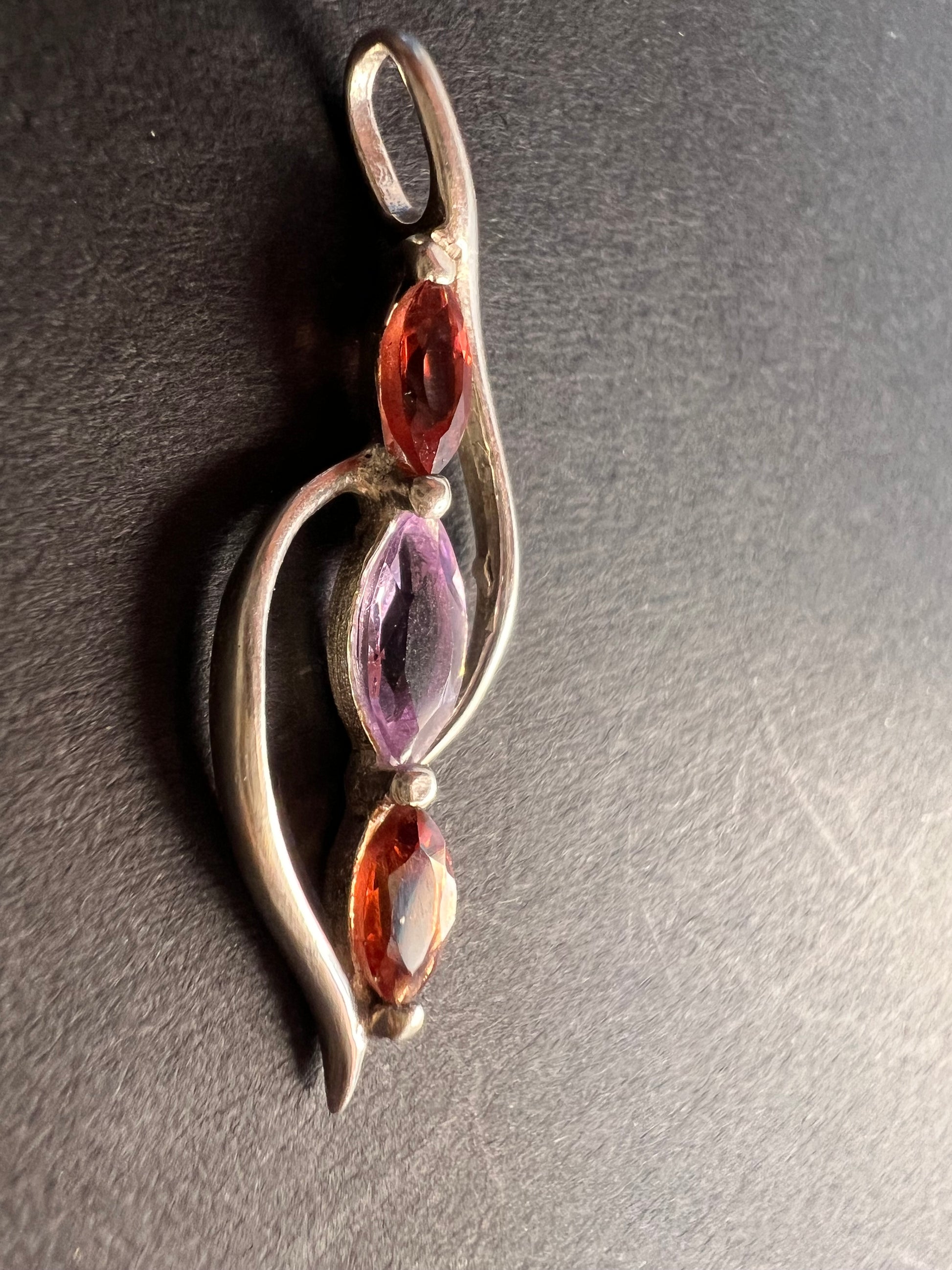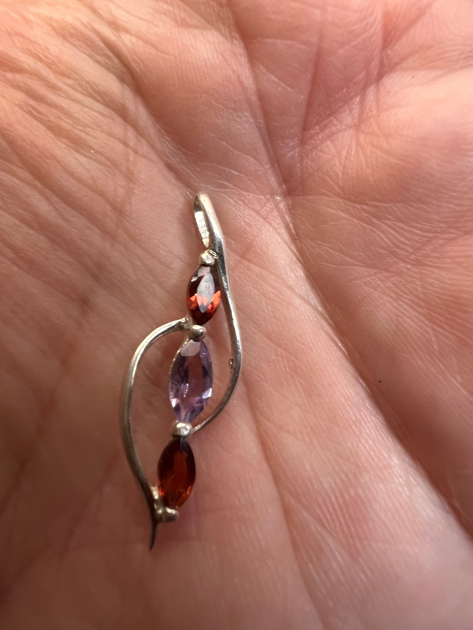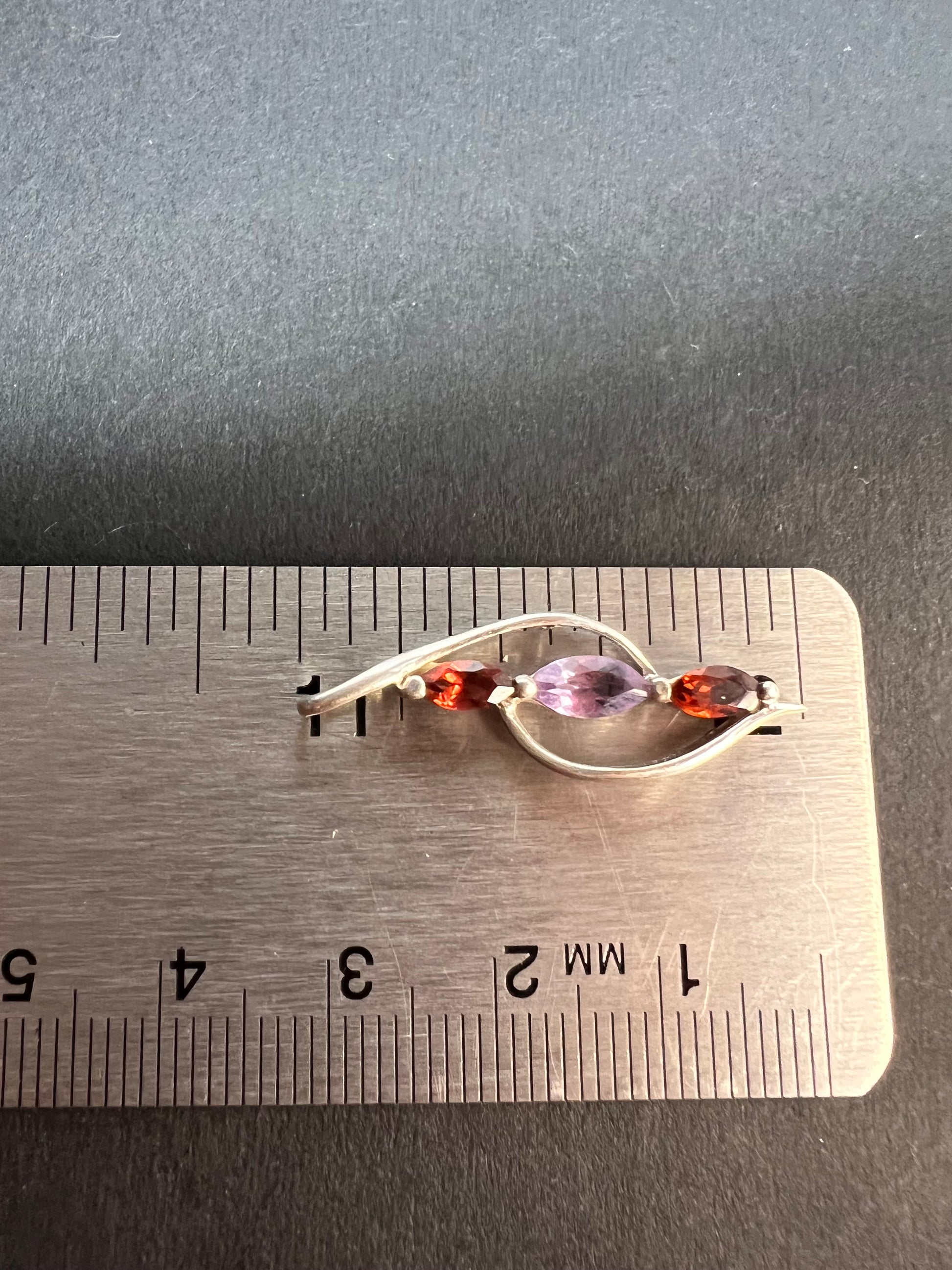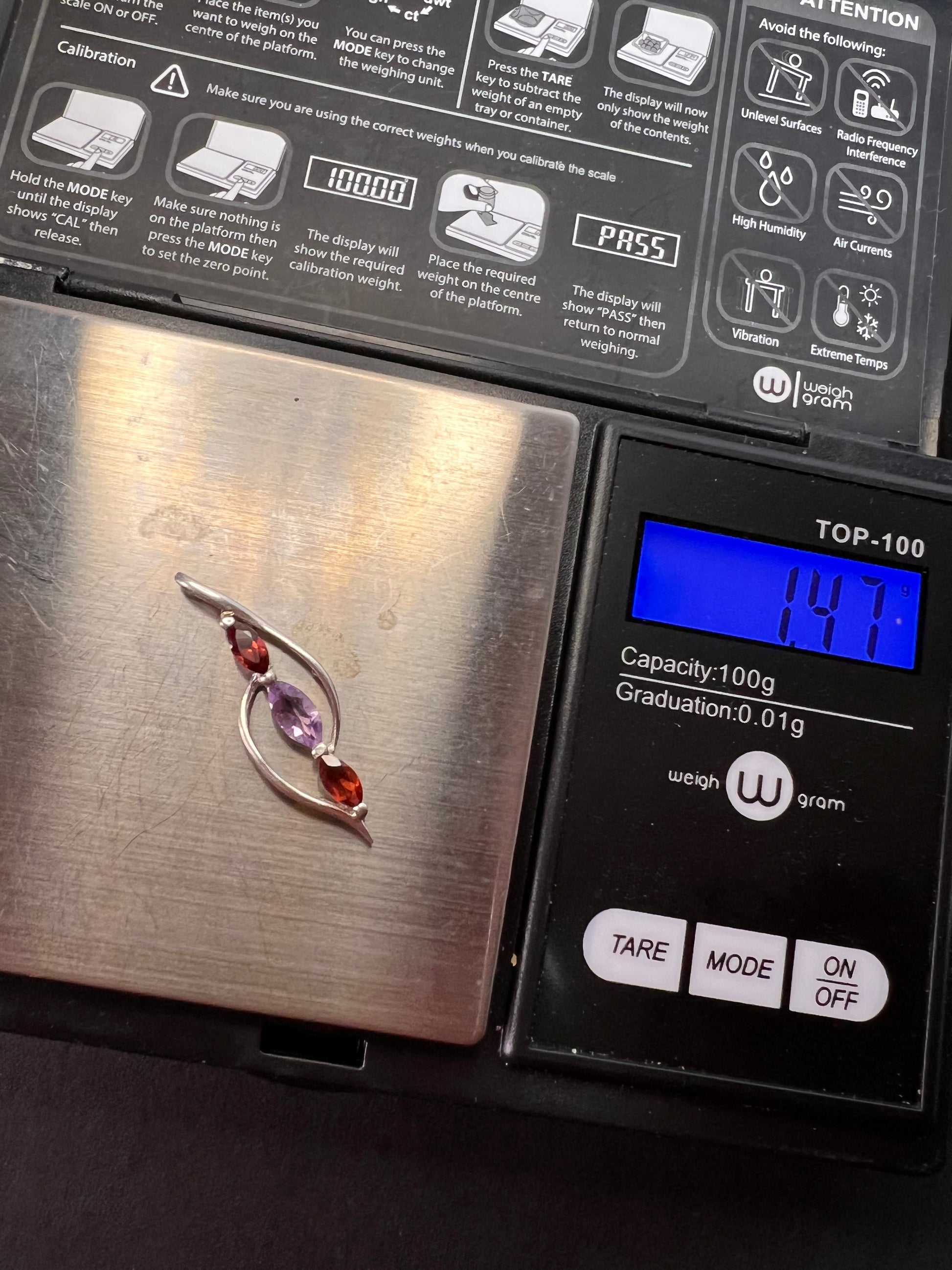 Genuine amethyst and garnet marquis gemstones set in authentic 925 sterling silver. Pendant measures about 1.25 inches in length and has a total weight of just over 1.40 grams.