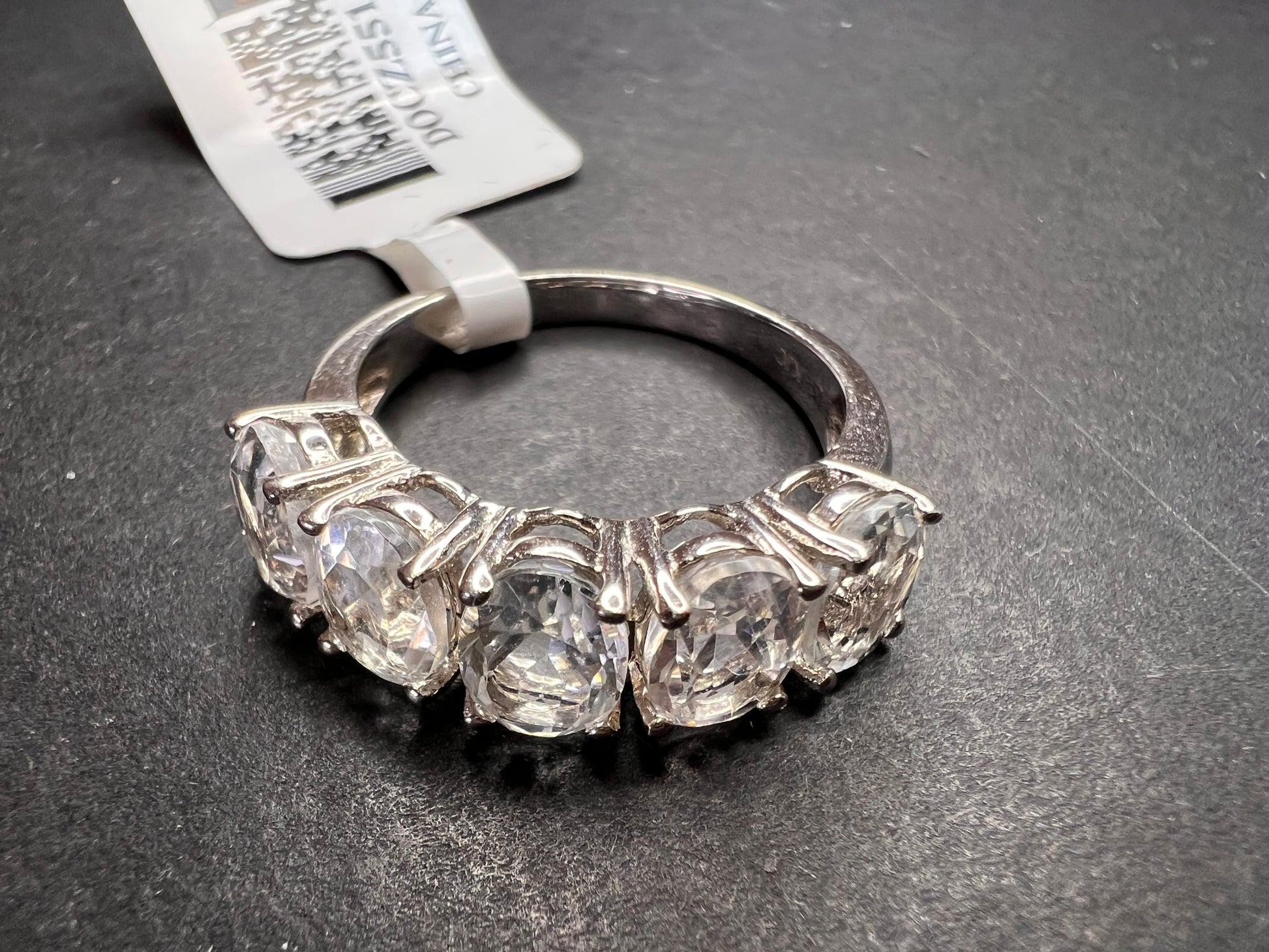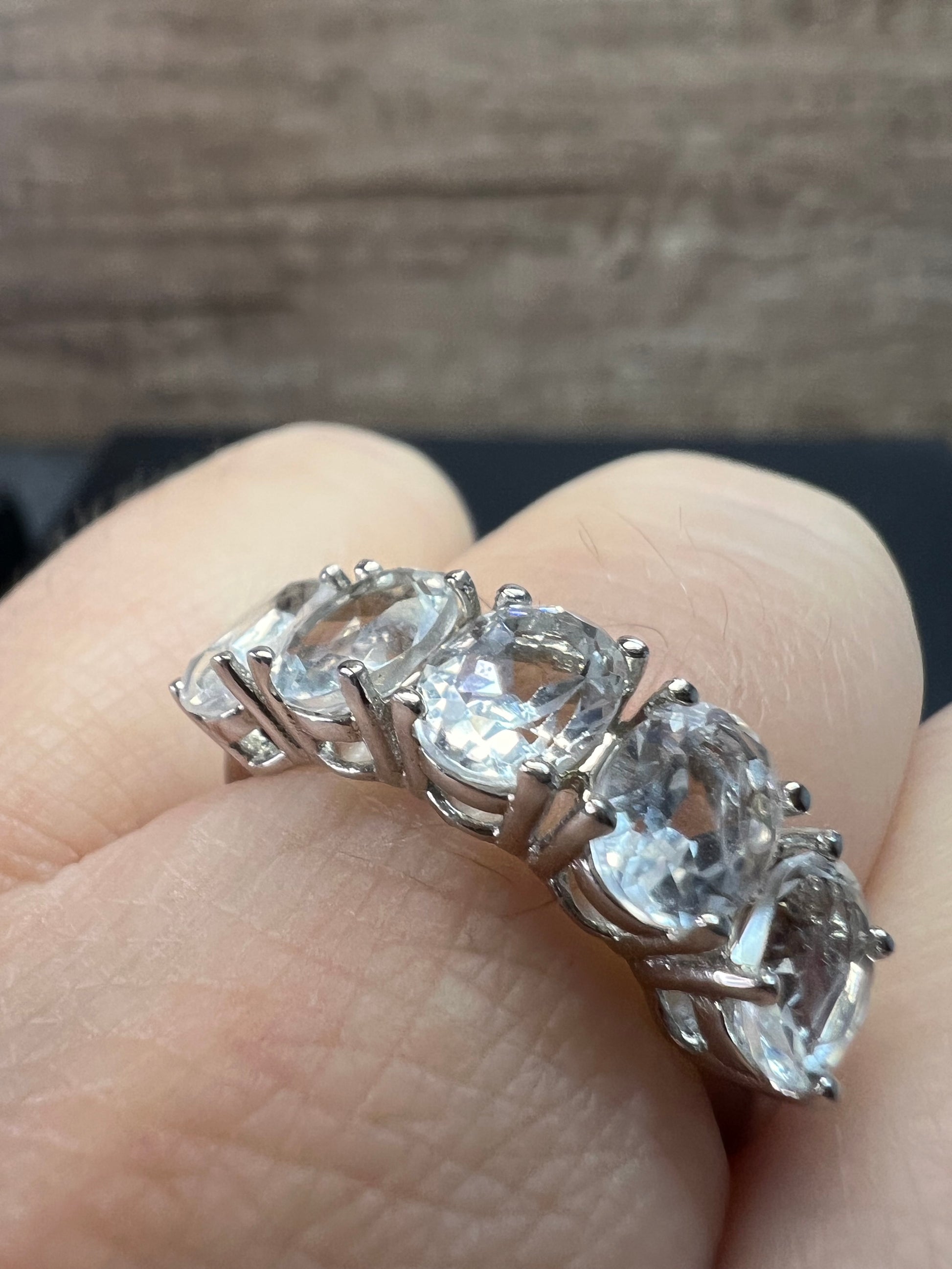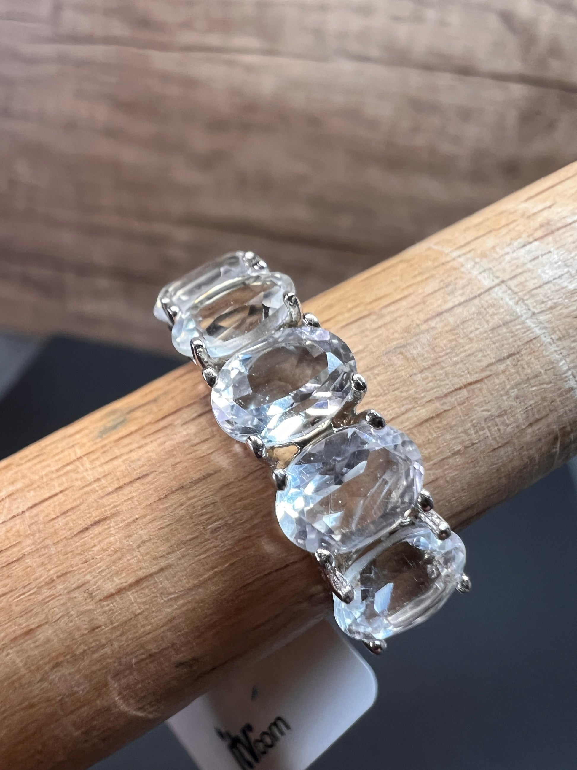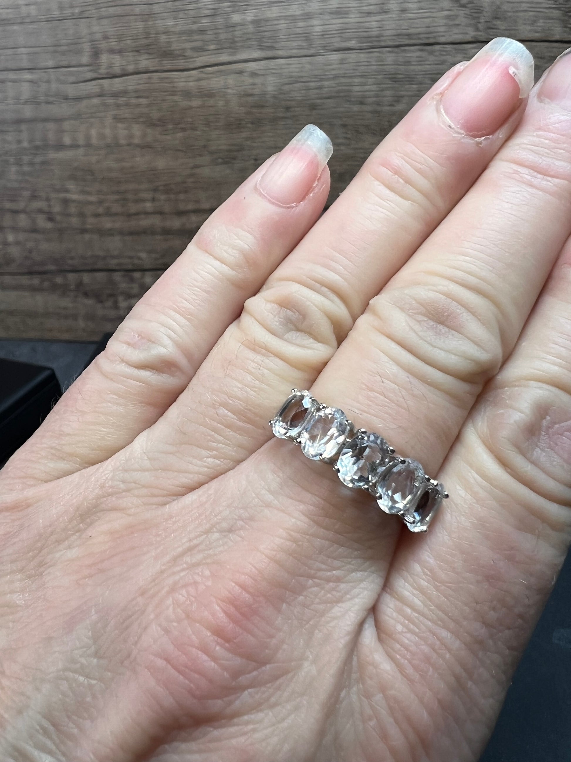 Five genuine oval cut goshenite gemstones prong set in authentic 925 sterling silver that’s likely plated with rhodium. Goshenite is a white to colorless beryl. Kinda like a white aquamarine. 3.35 CTW. Size 8. KTC 925 China