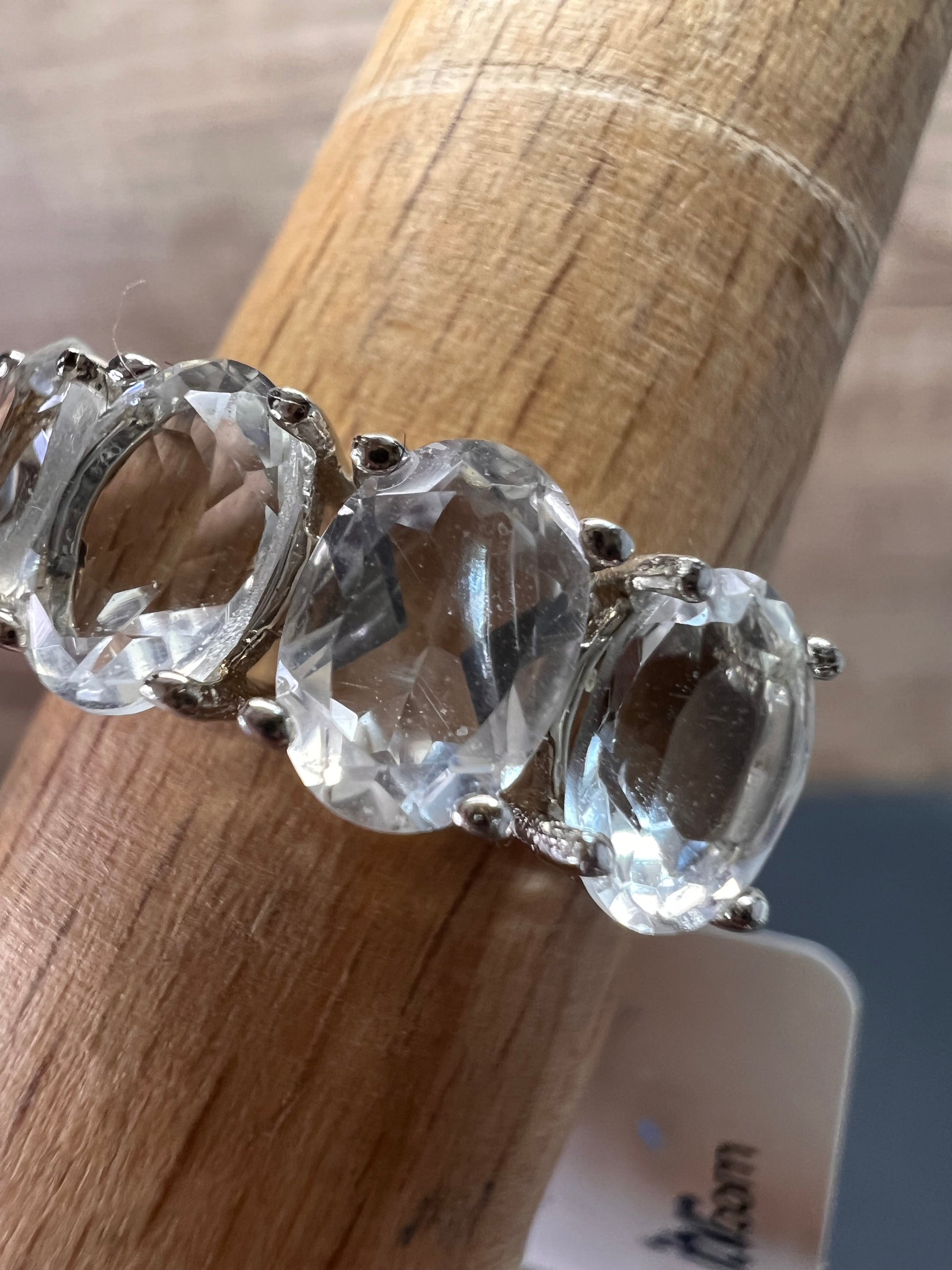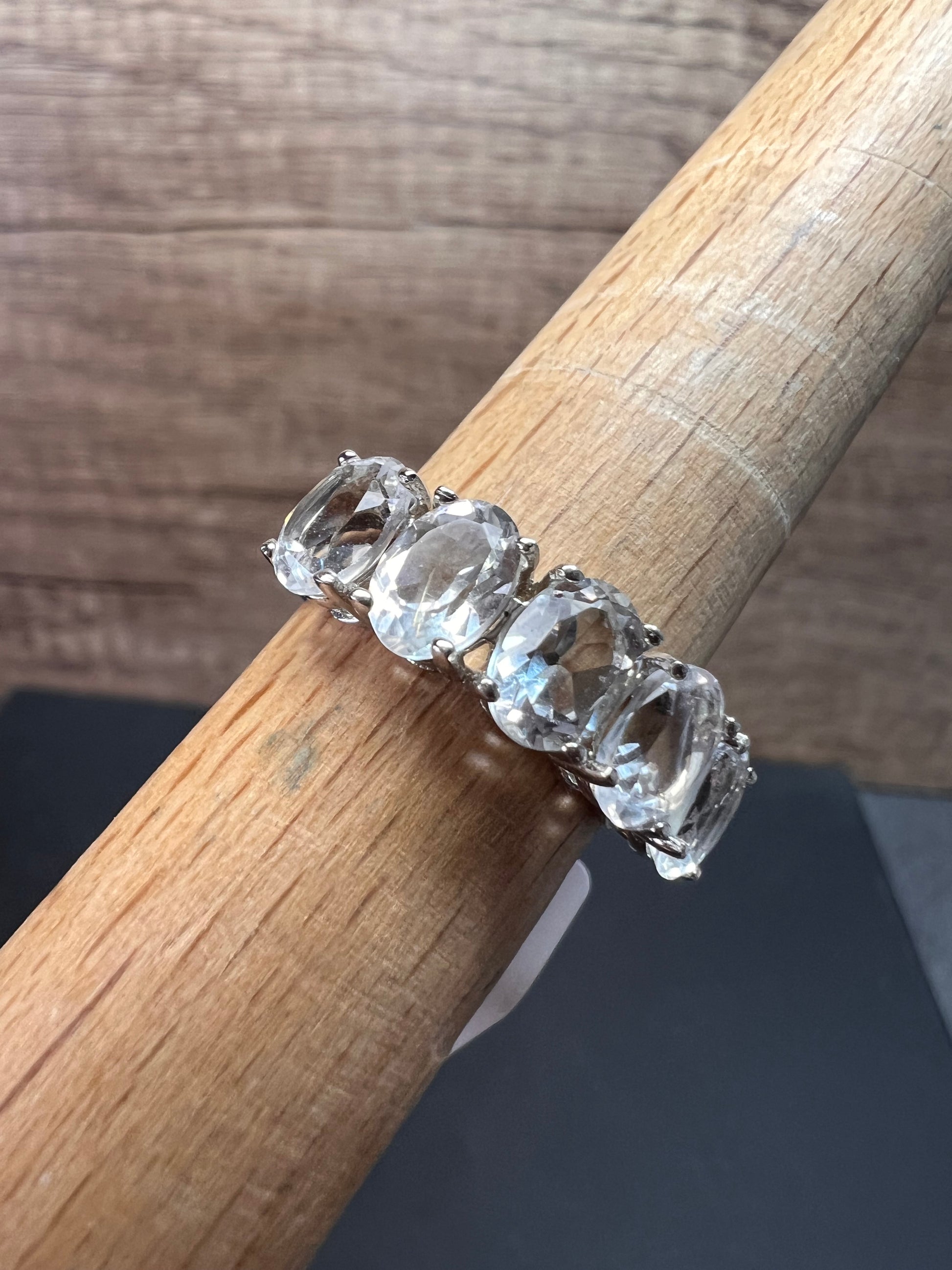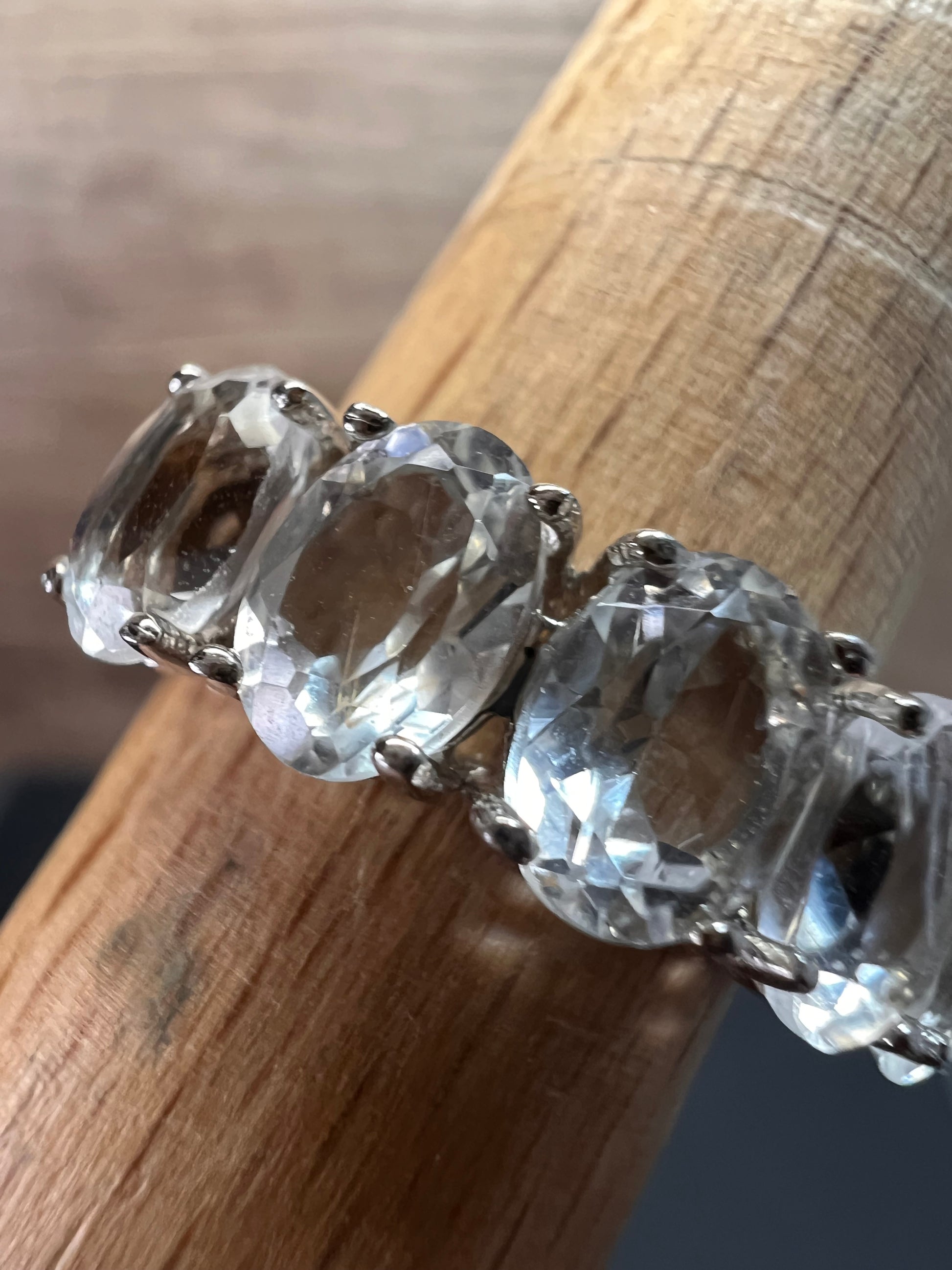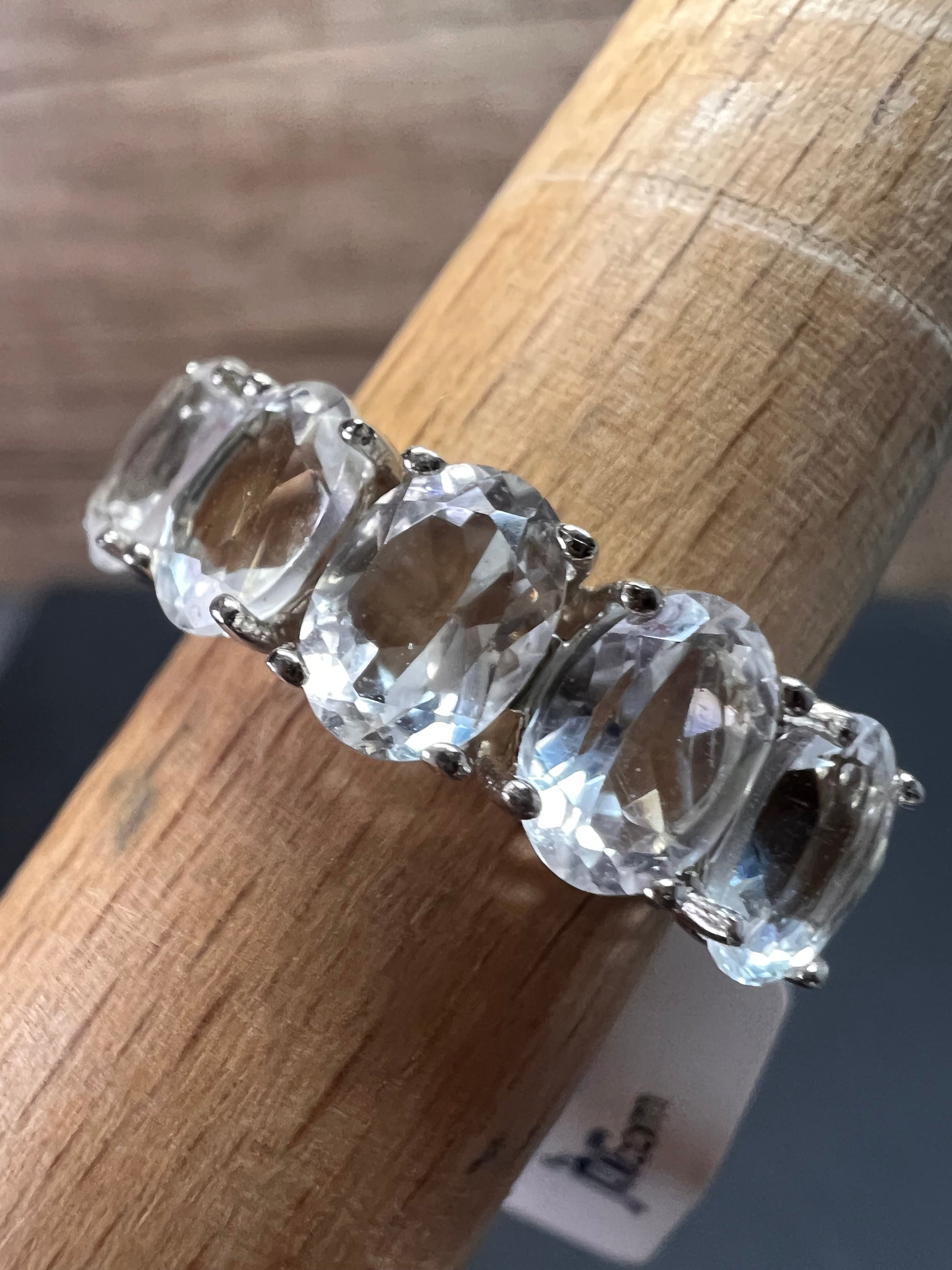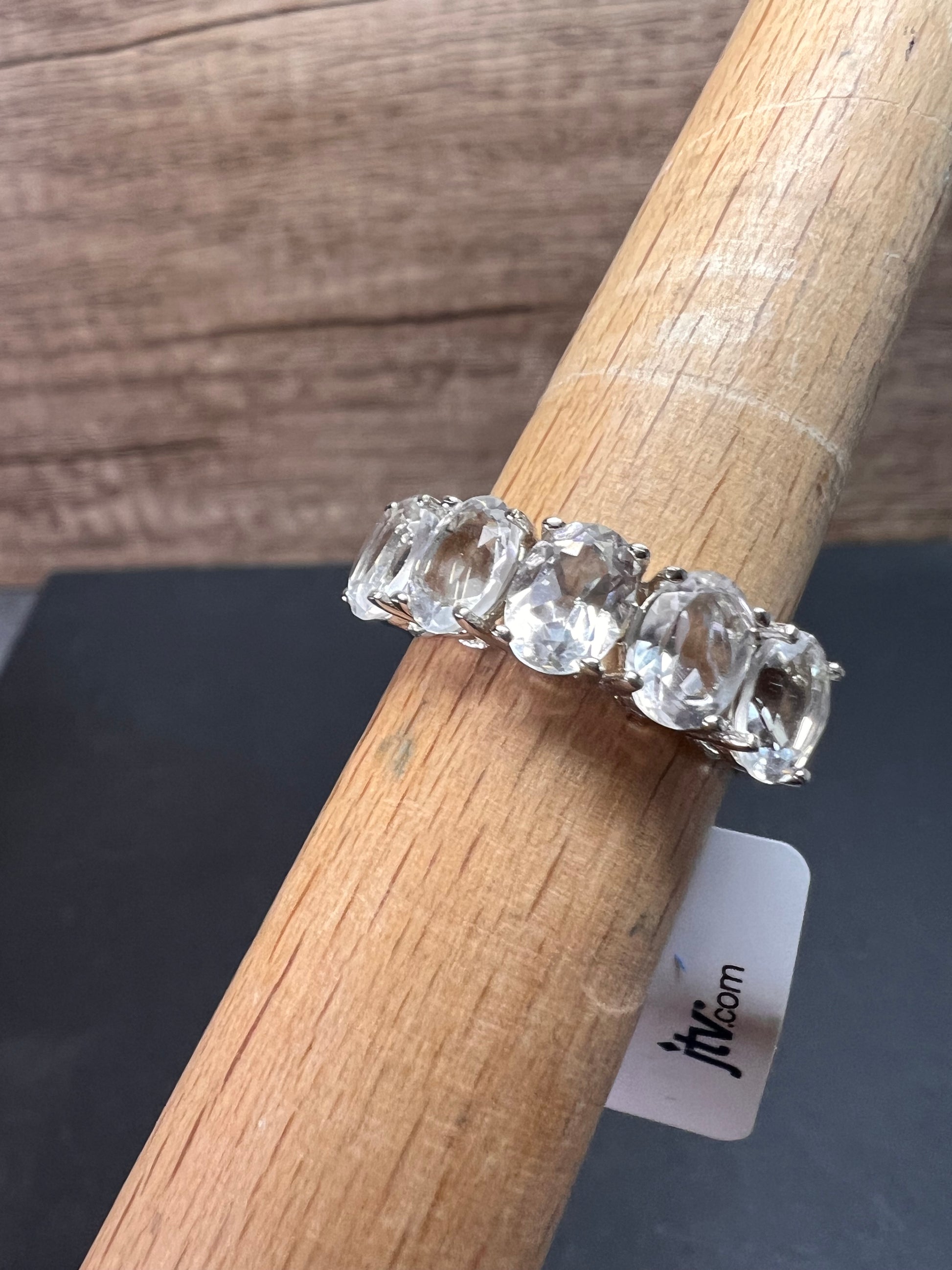 Five genuine oval cut goshenite gemstones prong set in authentic 925 sterling silver that’s likely plated with rhodium. Goshenite is a white to colorless beryl. Kinda like a white aquamarine. 3.35 CTW. Size 8. KTC 925 China