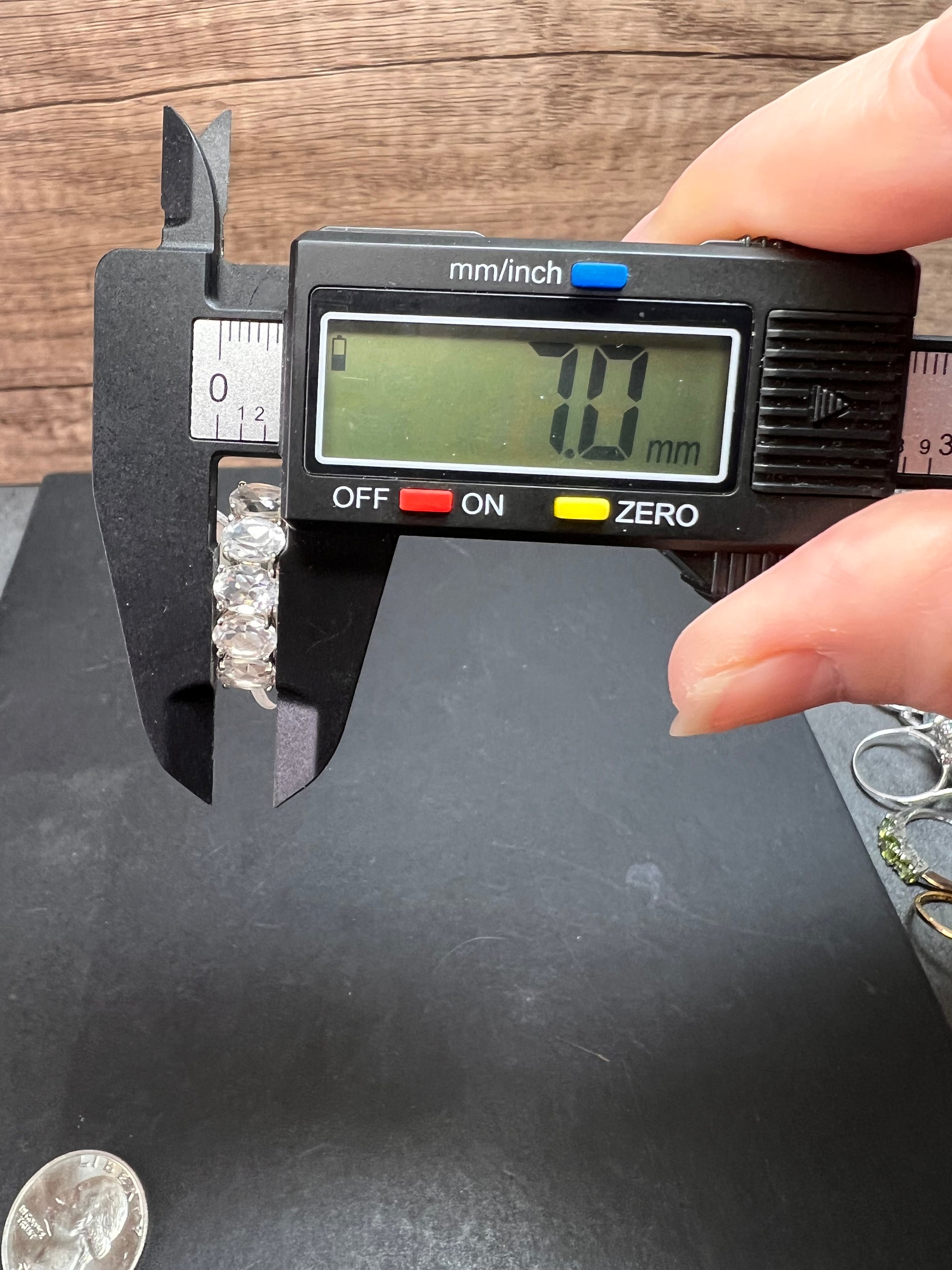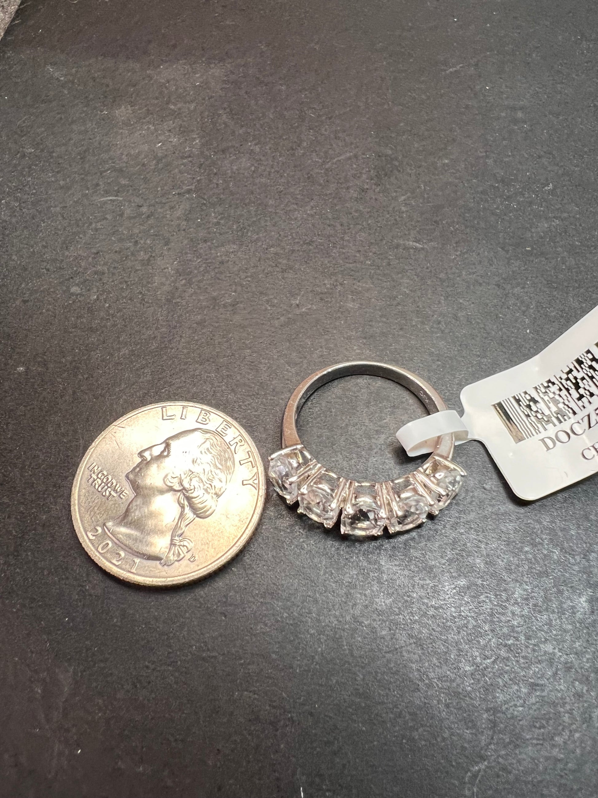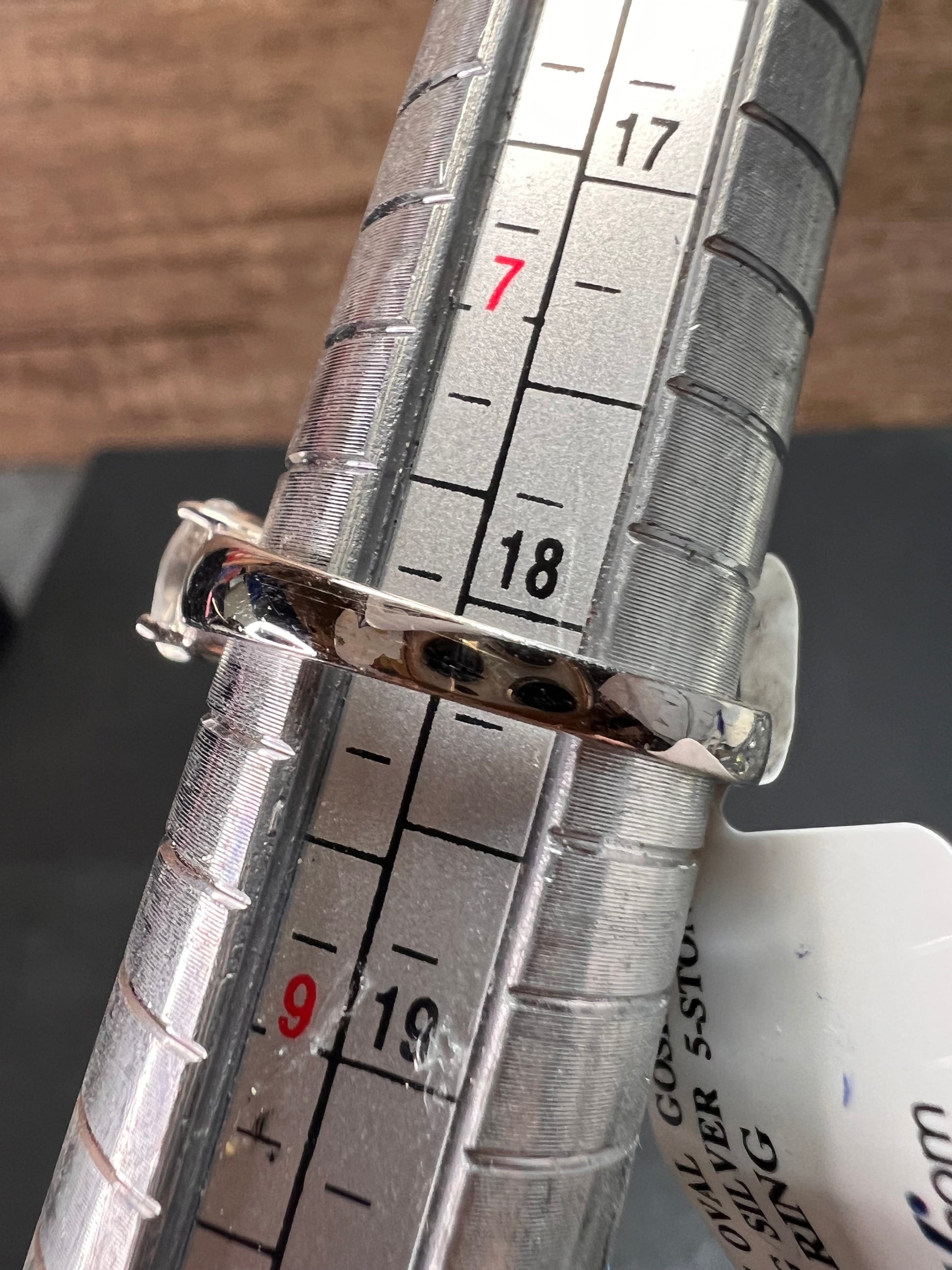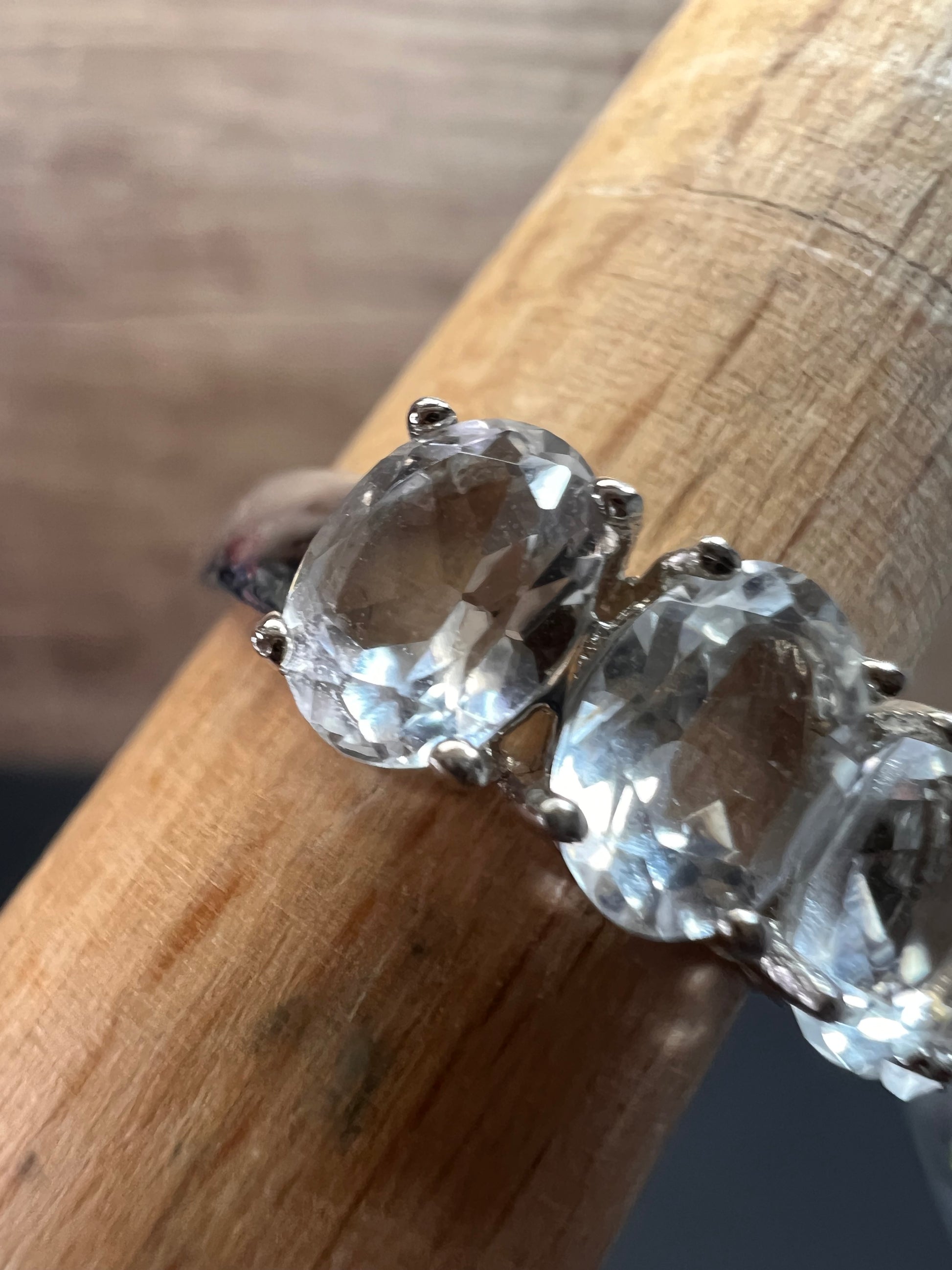 Five genuine oval cut goshenite gemstones prong set in authentic 925 sterling silver that’s likely plated with rhodium. Goshenite is a white to colorless beryl. Kinda like a white aquamarine. 3.35 CTW. Size 8. KTC 925 China
