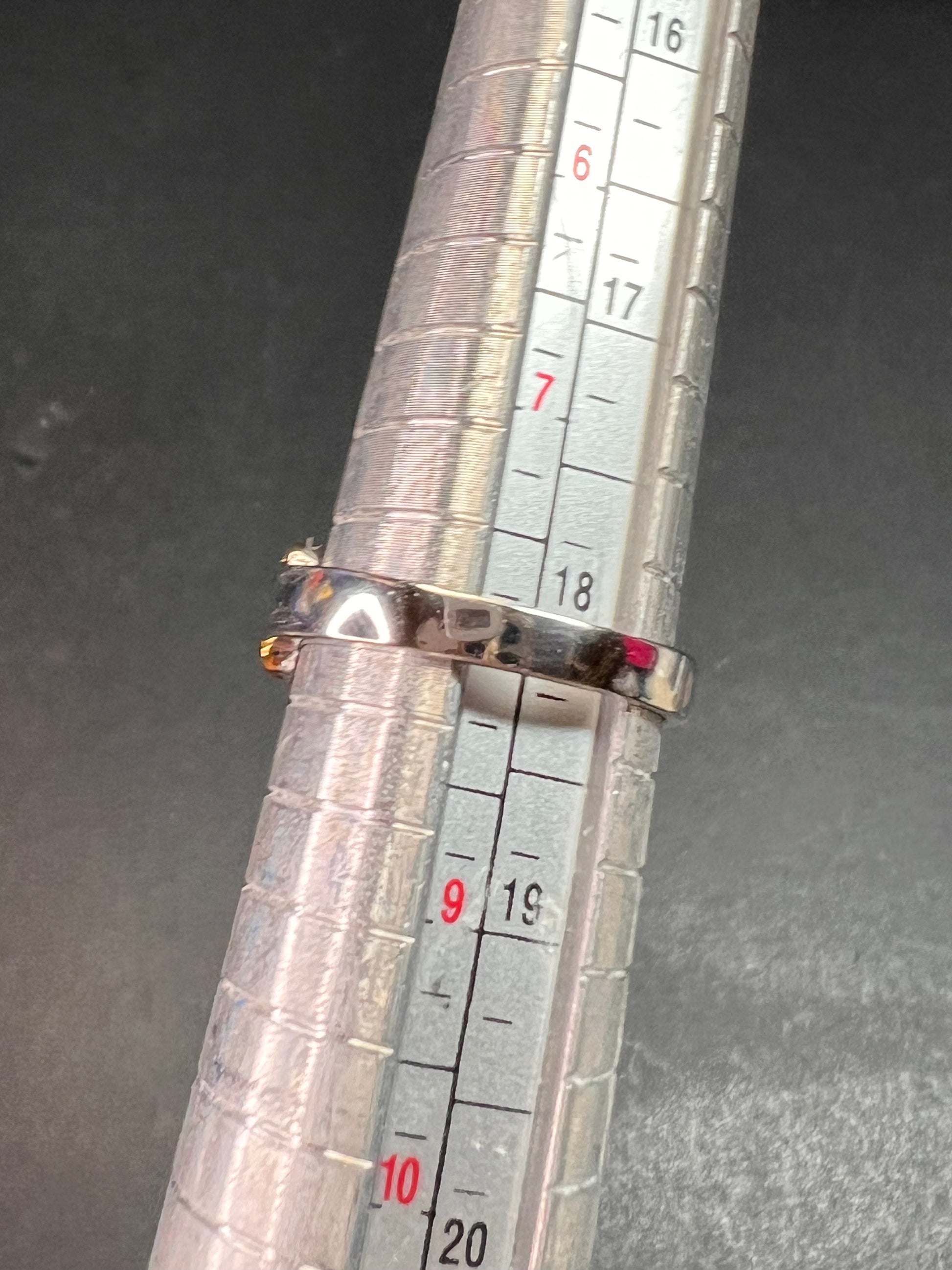 Green mystic topaz gemstone prong set in an authentic 925 sterling silver prong setting. Plated with rhodium and 18k yellow gold vermeil l. Two small blue Moissanite accent stones on the tops of the shank. Total ctw is 3.15. Measures a size 8. Total weight is 4.85 grams. Djoy. Made in Thailand. Estimated retail value is $350