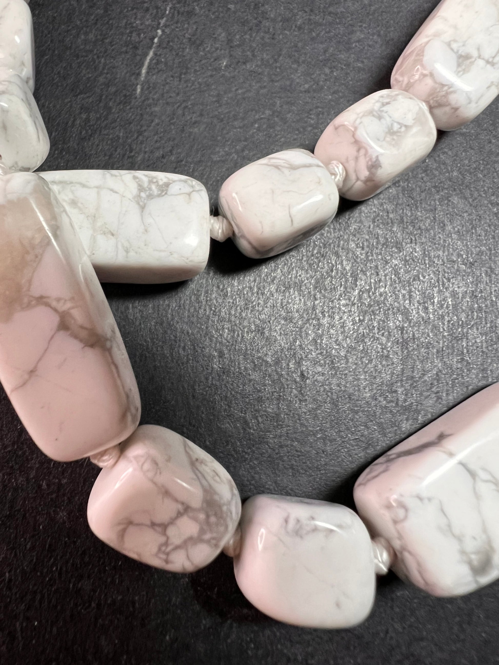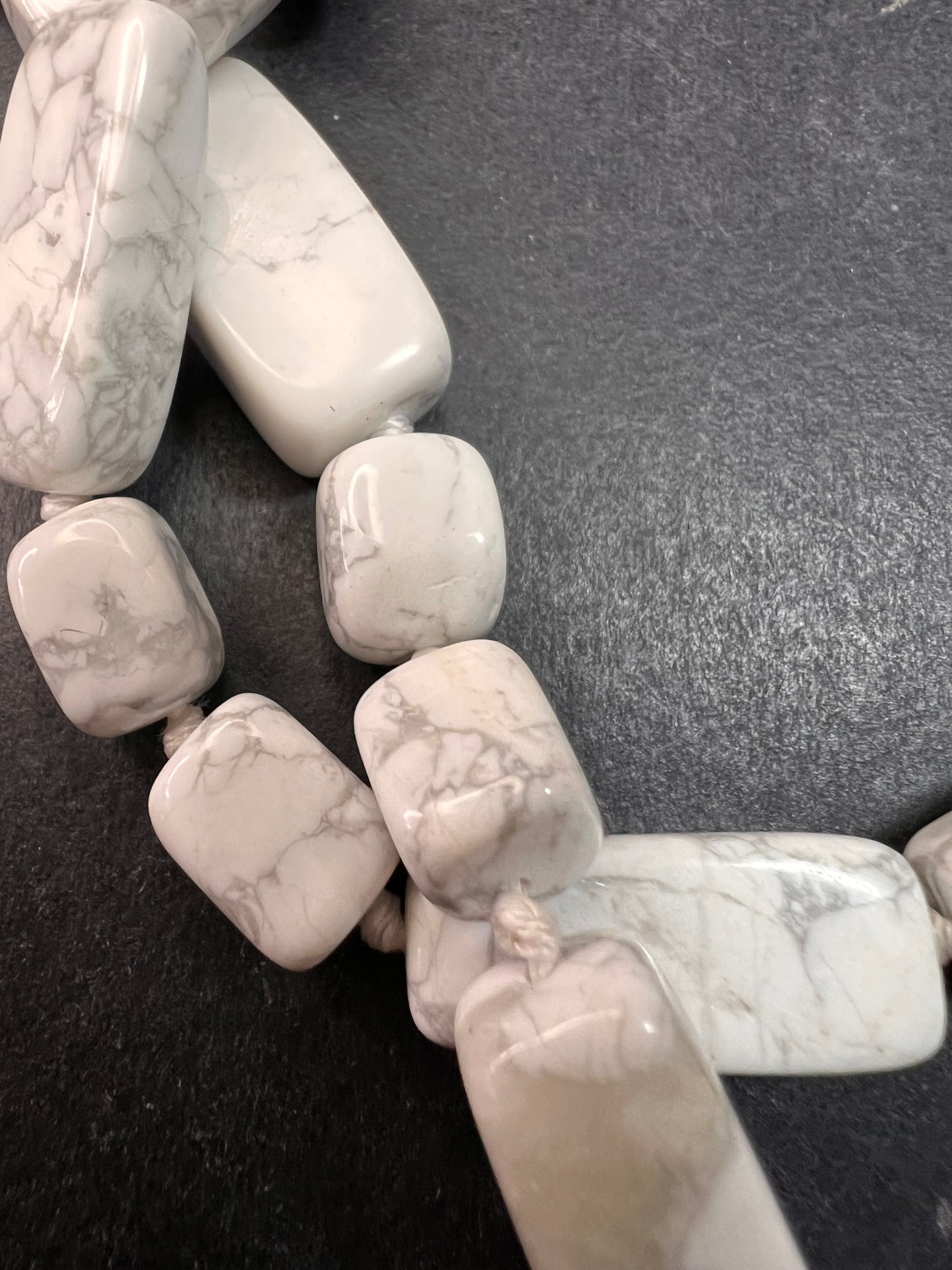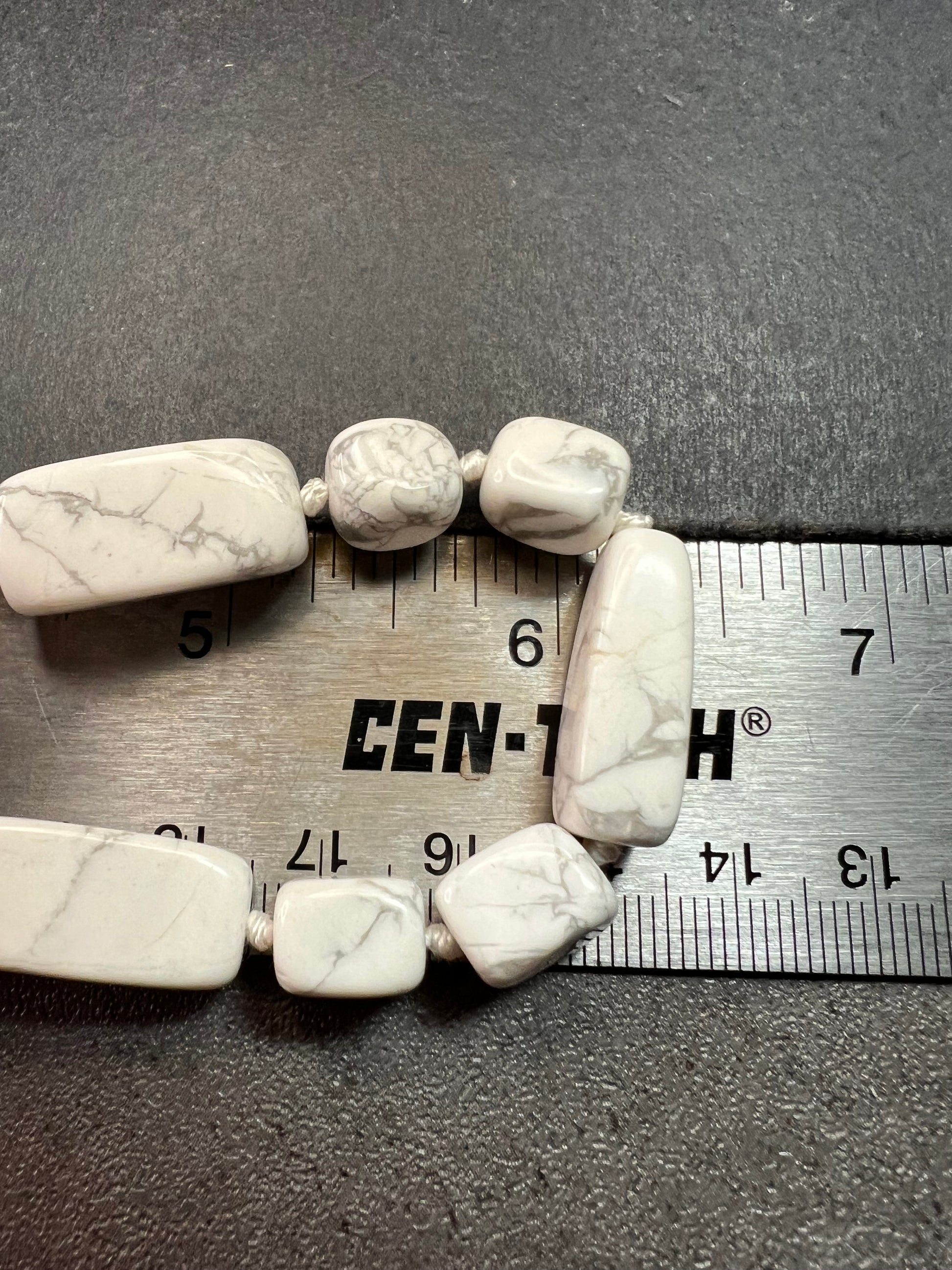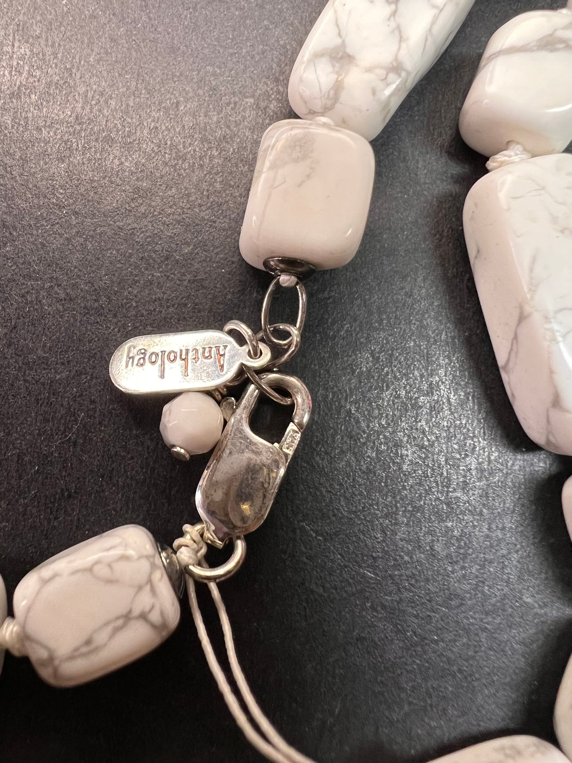 Genuine howlite rectangular beads strung on a 36 inch strand with white cord knotted in between. 925 sterling silver lobster clasp with an Anthology charm.
