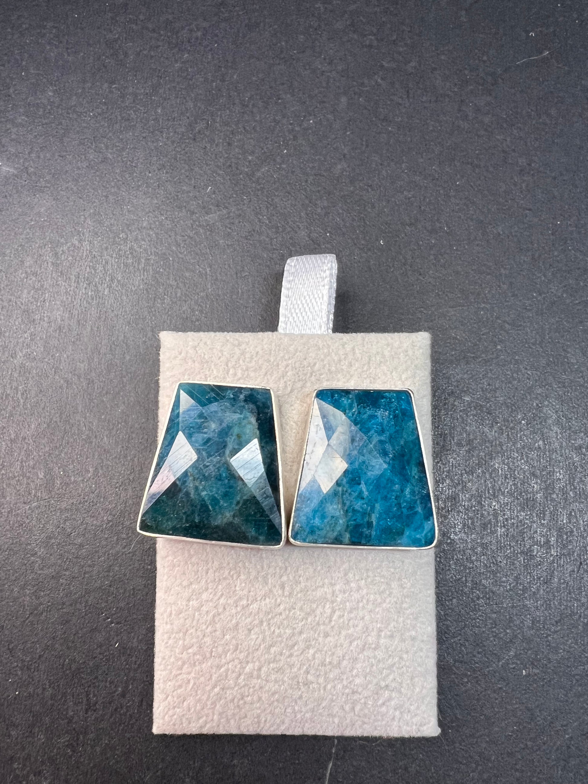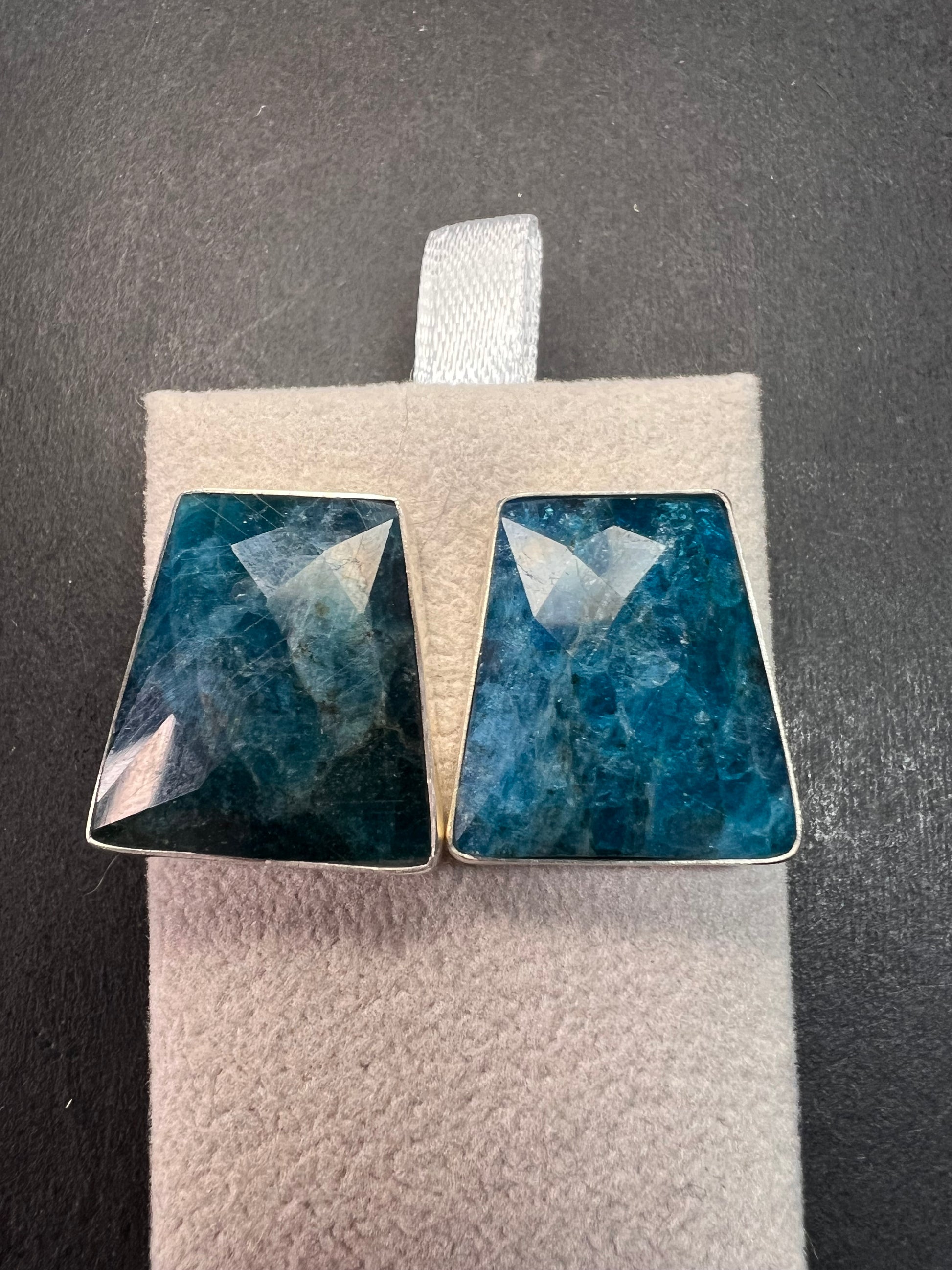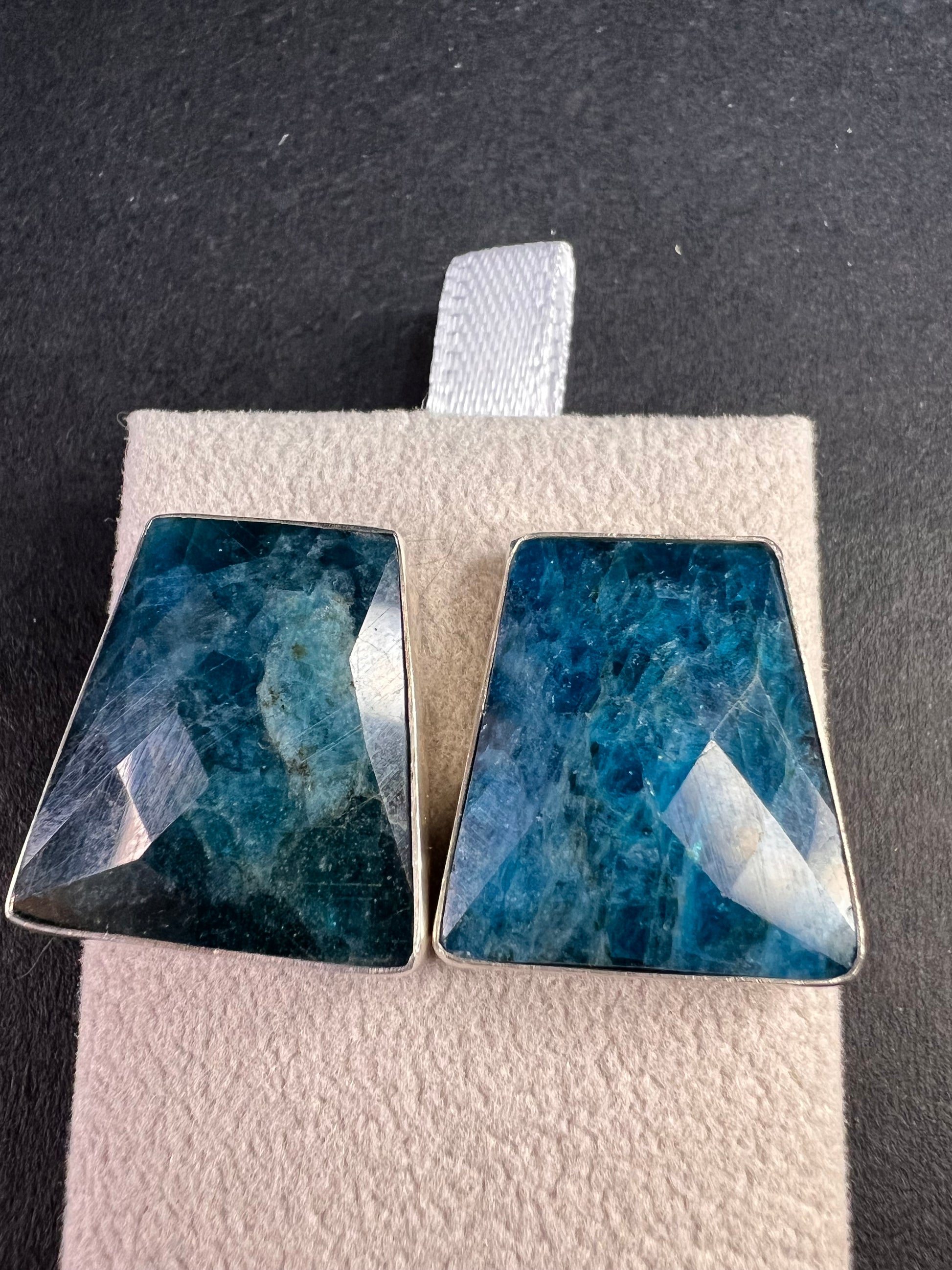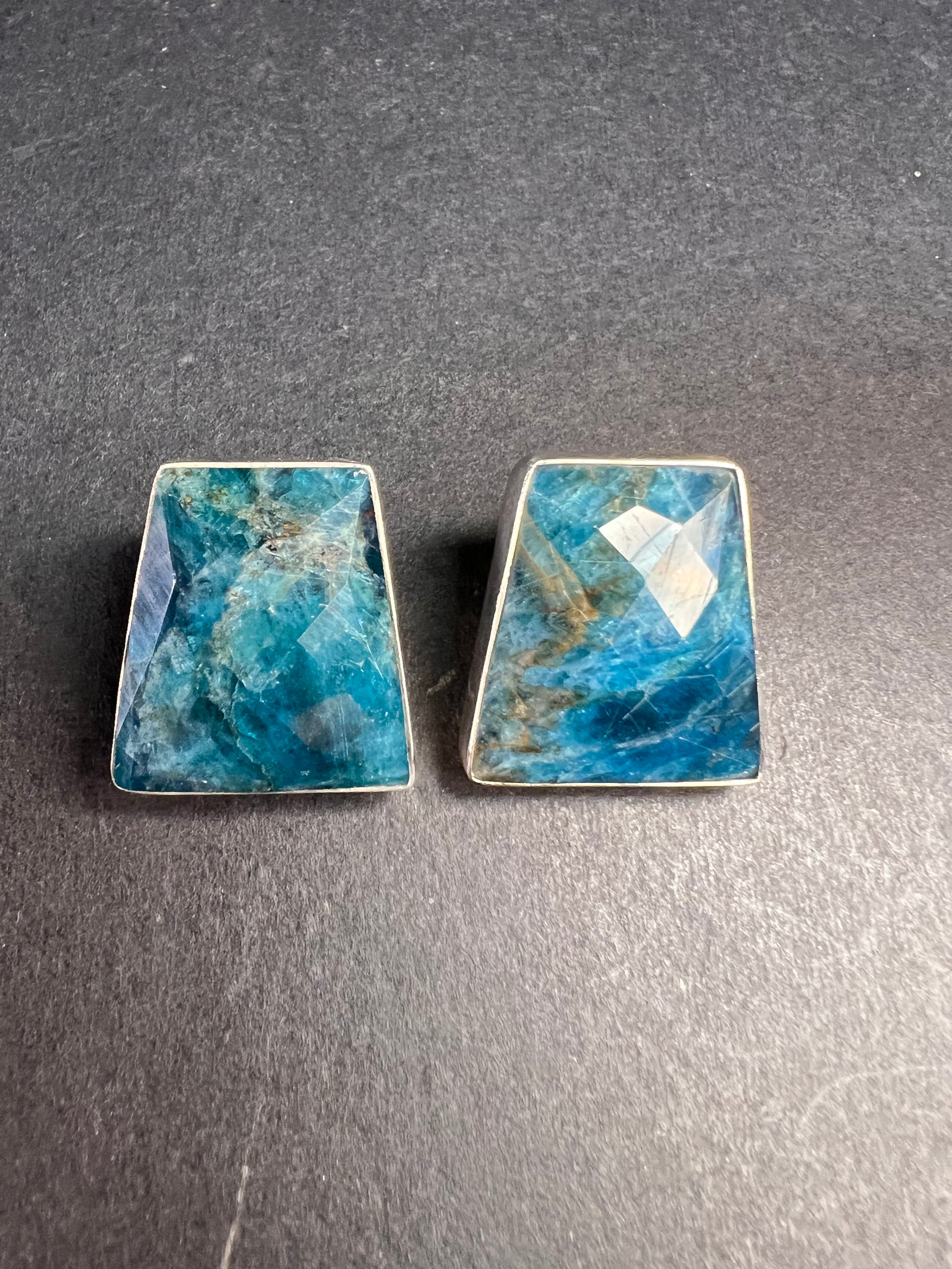 Genuine blue apatite geometric faceted stones set in authentic 925 sterling silver by Jay King. Not signed. Purity stamps on posts and pushbacks. Total weight is 14.43 grams. Measurements are about 21.6x19.6mm.