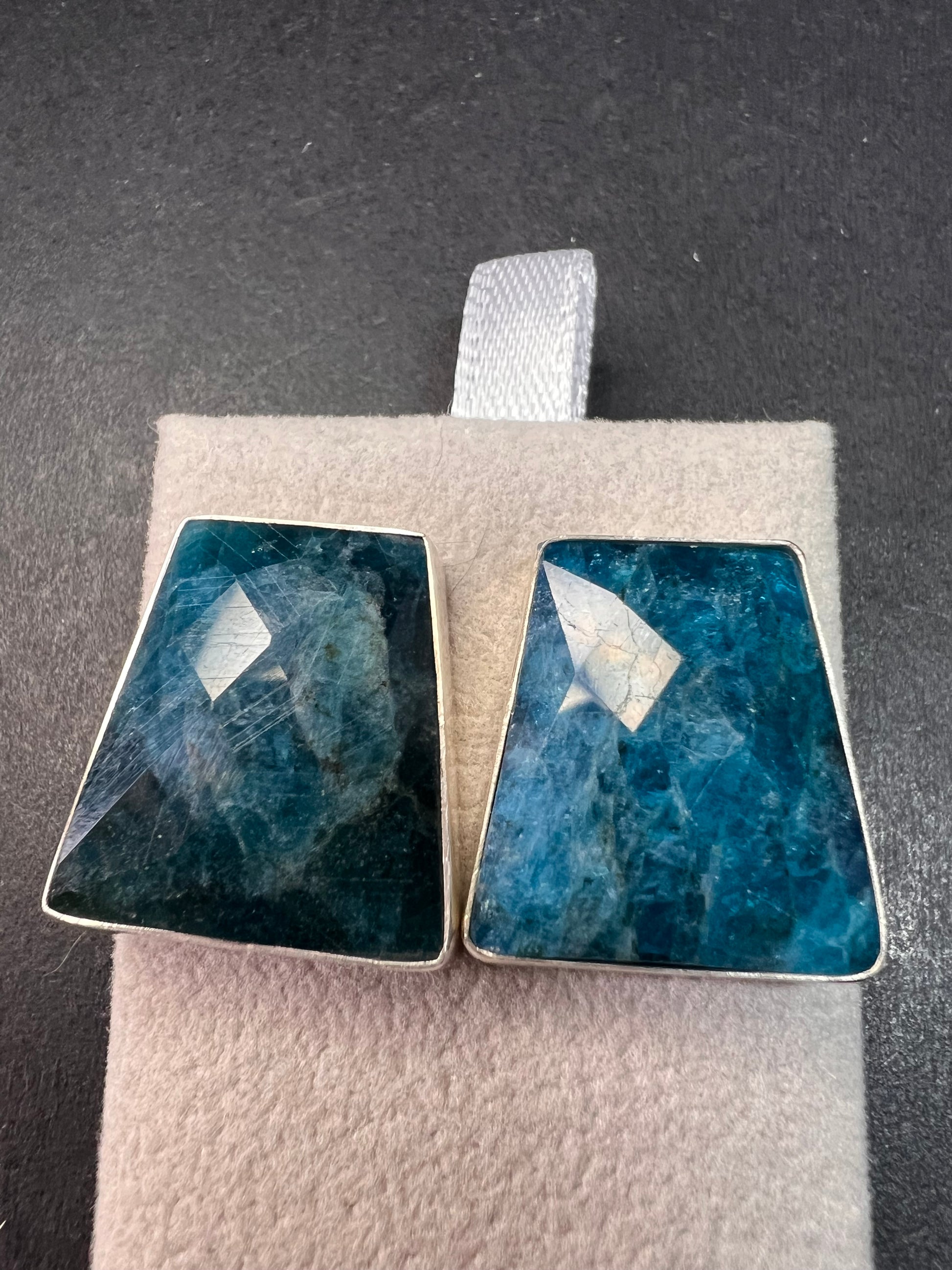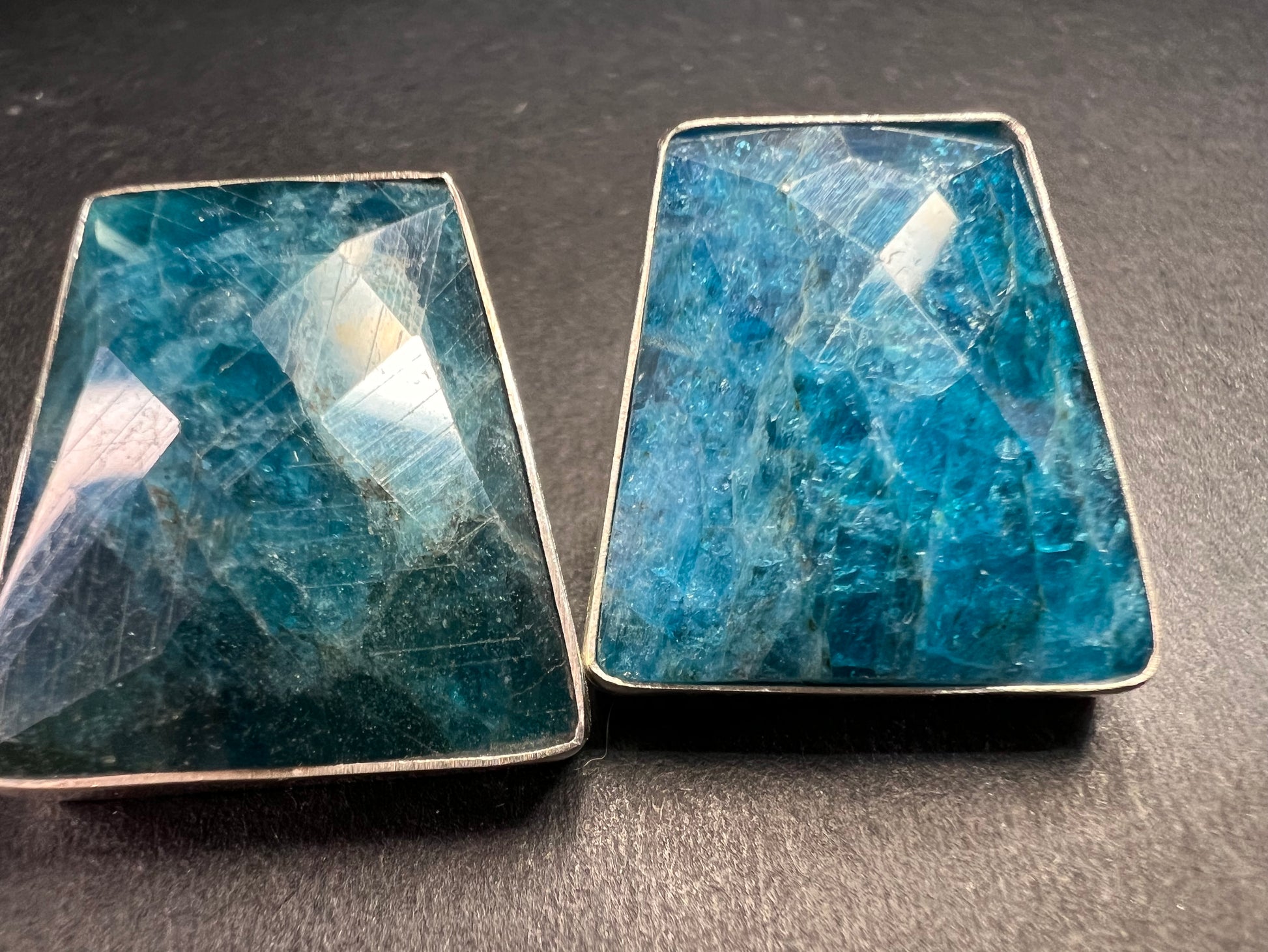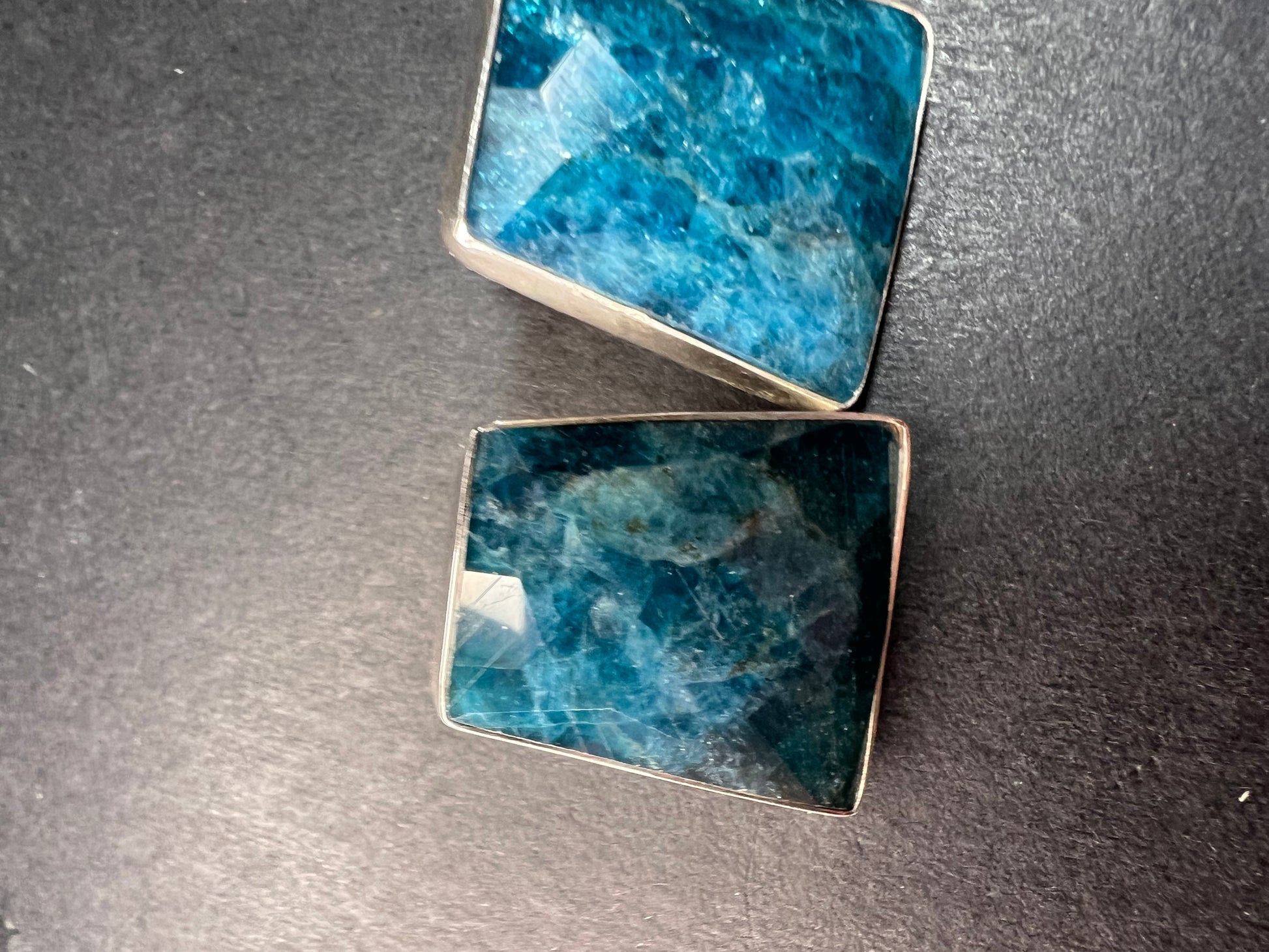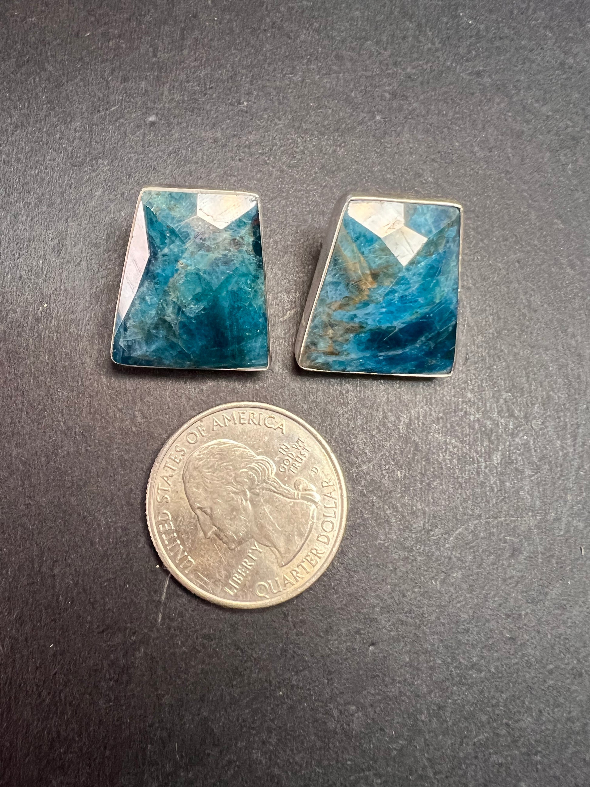 Genuine blue apatite geometric faceted stones set in authentic 925 sterling silver by Jay King. Not signed. Purity stamps on posts and pushbacks. Total weight is 14.43 grams. Measurements are about 21.6x19.6mm.