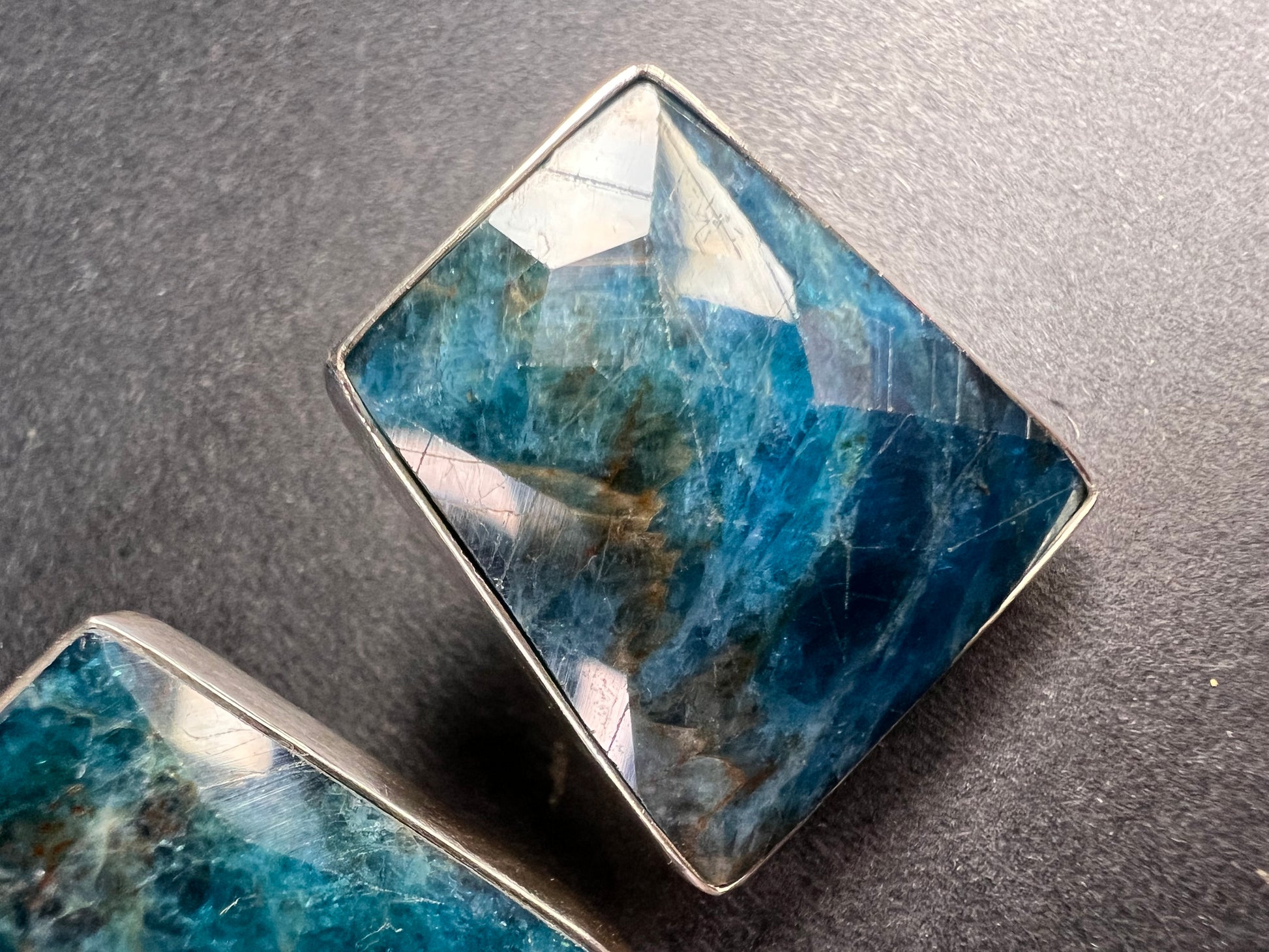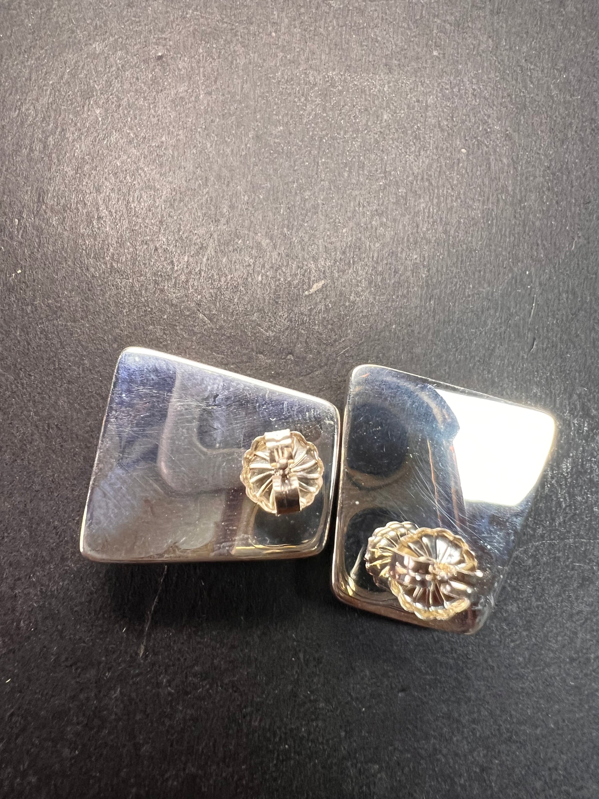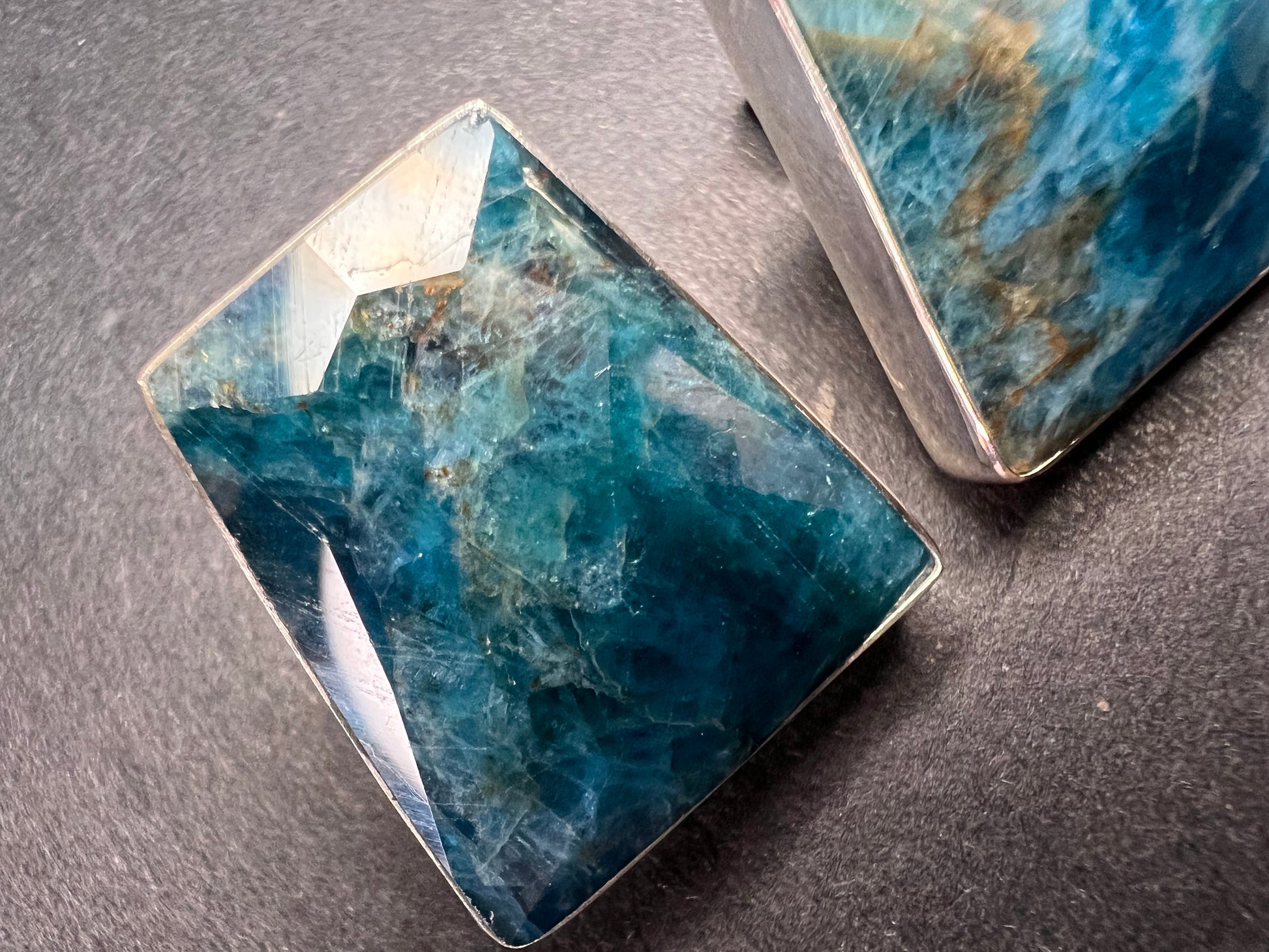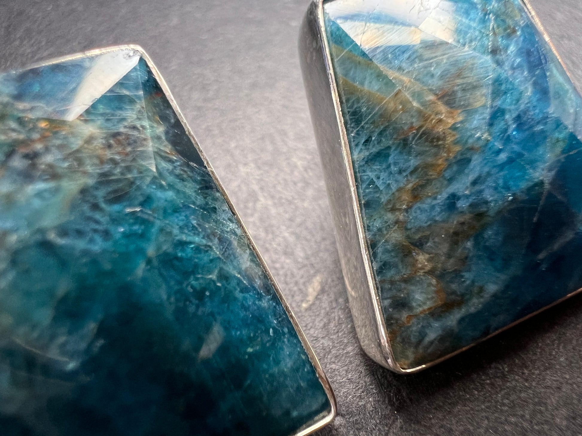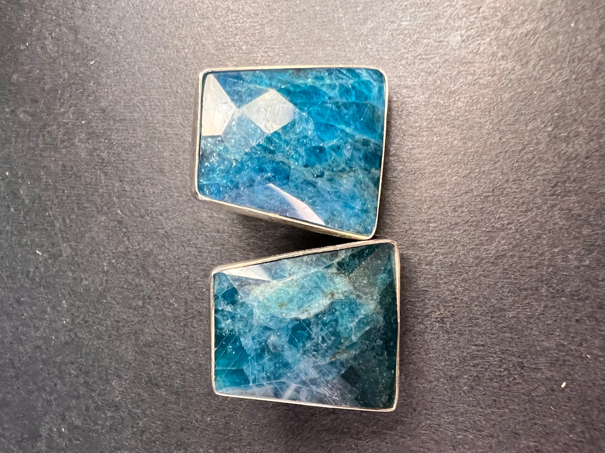 Genuine blue apatite geometric faceted stones set in authentic 925 sterling silver by Jay King. Not signed. Purity stamps on posts and pushbacks. Total weight is 14.43 grams. Measurements are about 21.6x19.6mm.