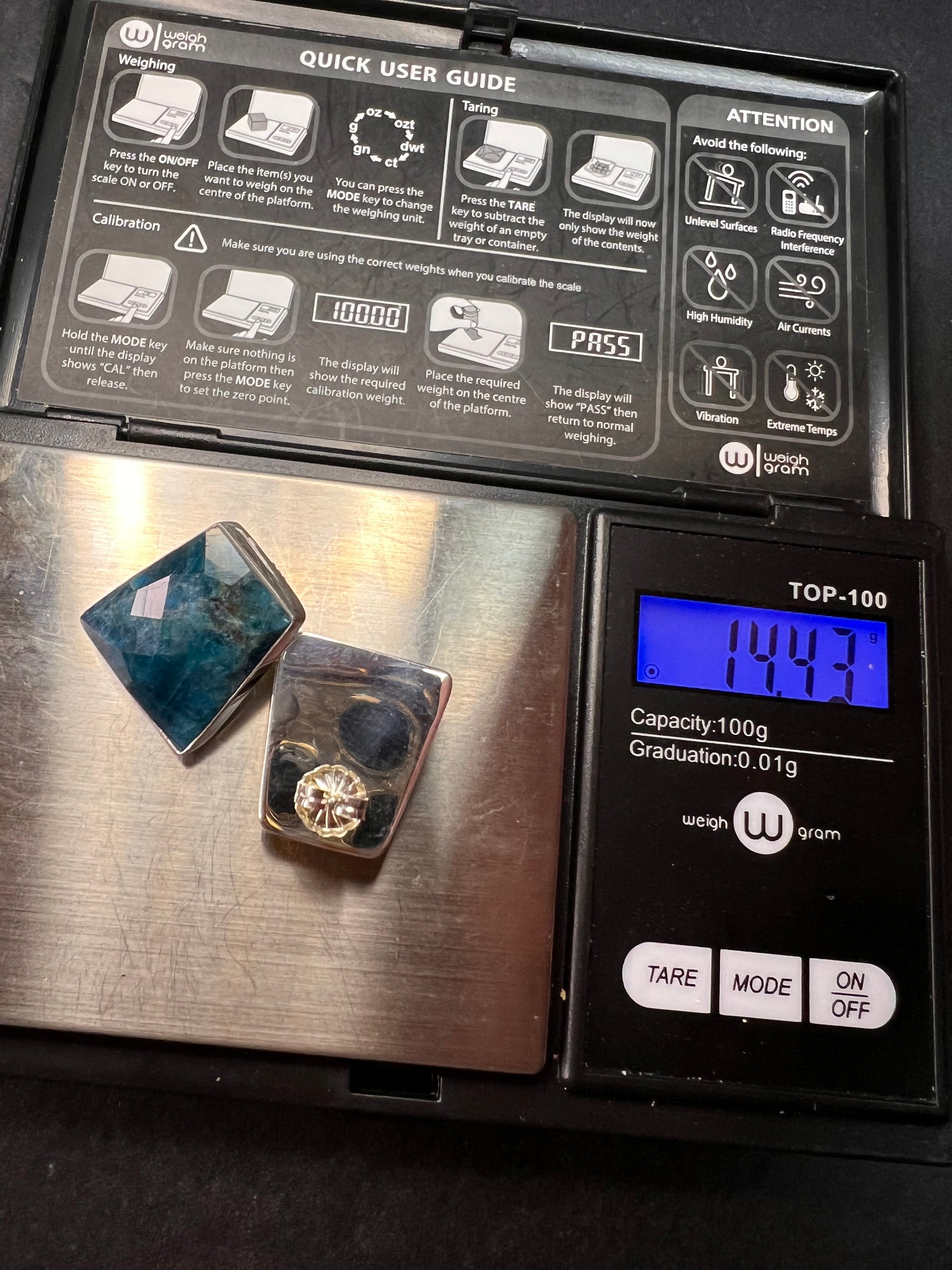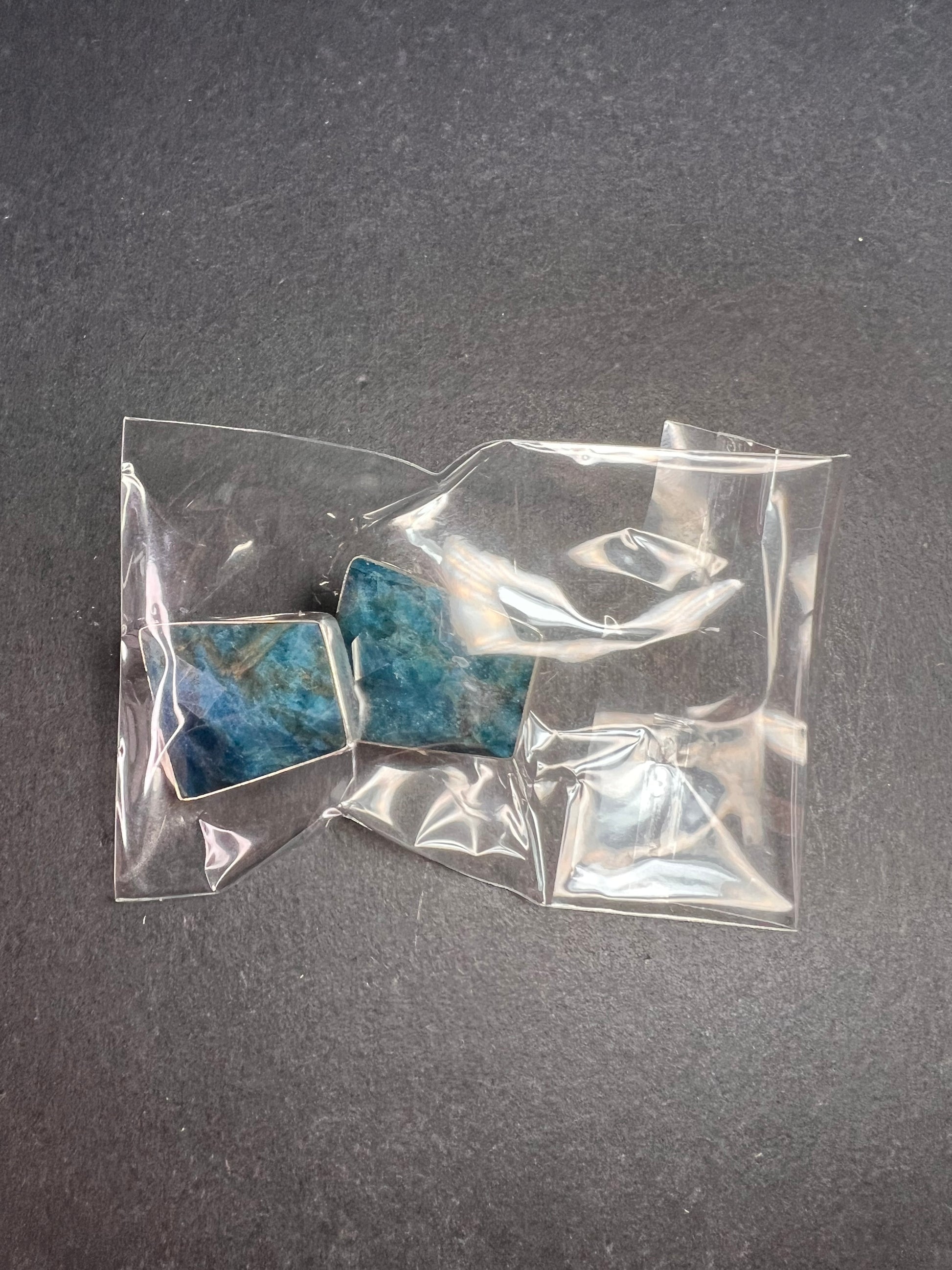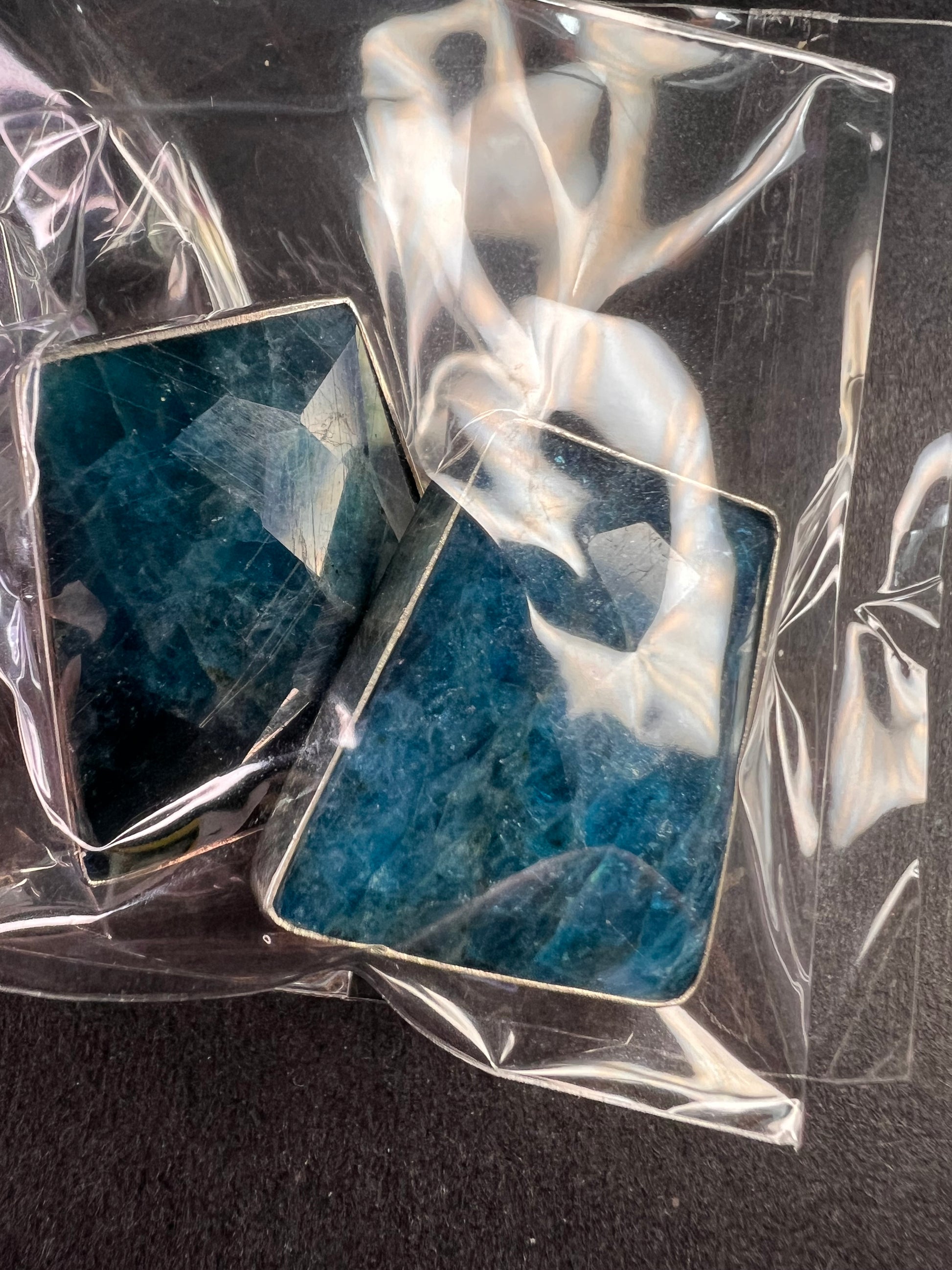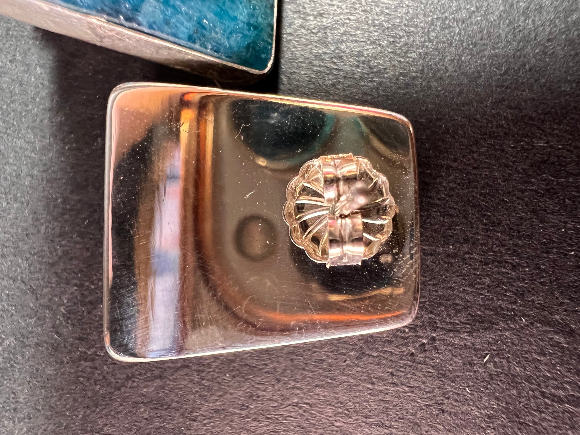 Genuine blue apatite geometric faceted stones set in authentic 925 sterling silver by Jay King. Not signed. Purity stamps on posts and pushbacks. Total weight is 14.43 grams. Measurements are about 21.6x19.6mm.
