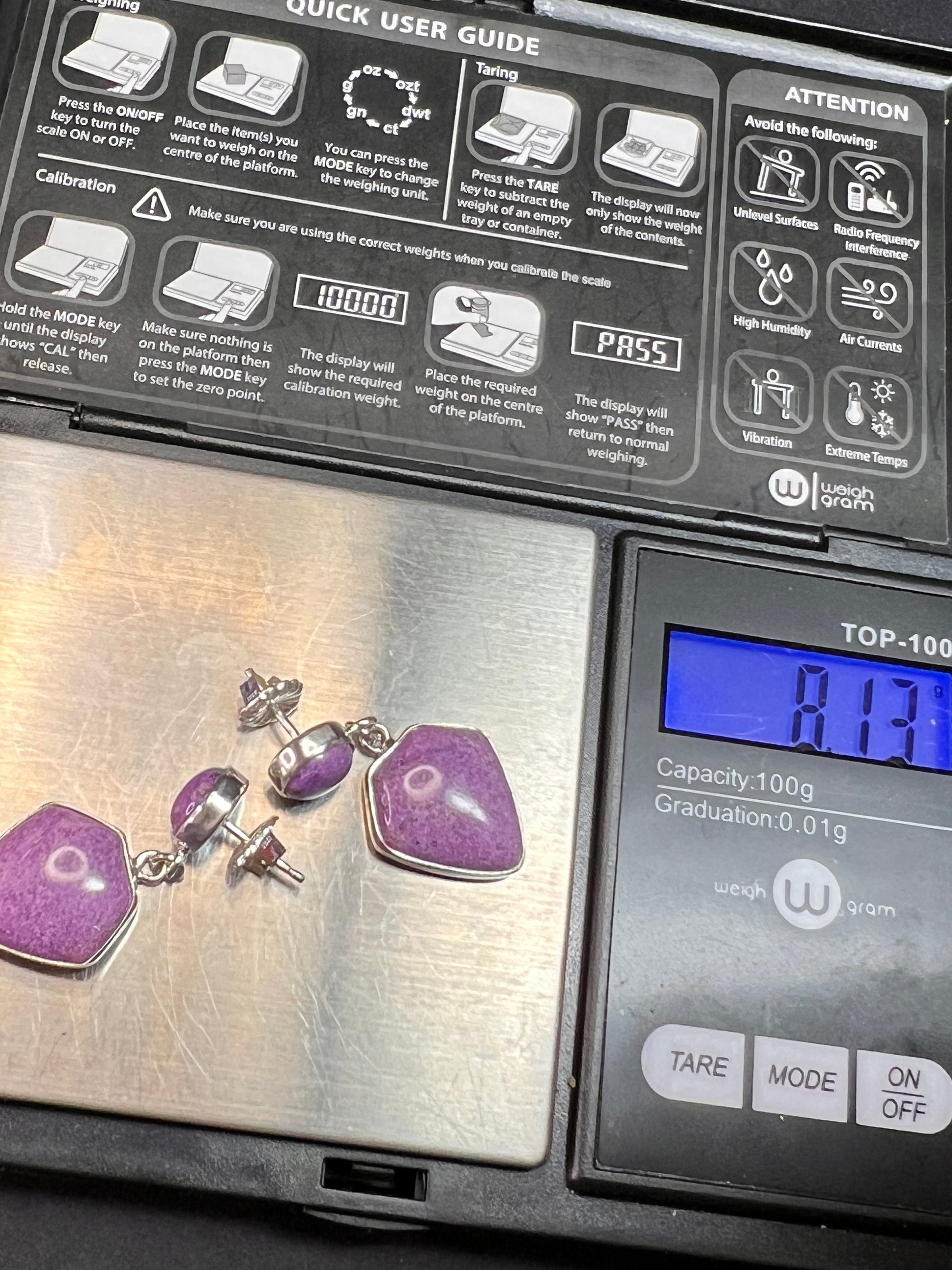 Jay King designer Stichtite stone set in authentic 925 sterling silver. Total weight is 8.13 grams. Measures about 30.9 mm in length (1.21 inches), and about .60 inches at widest point. (15.4mm). Purity stamps on posts and pushbacks but no found hallmark or signature.