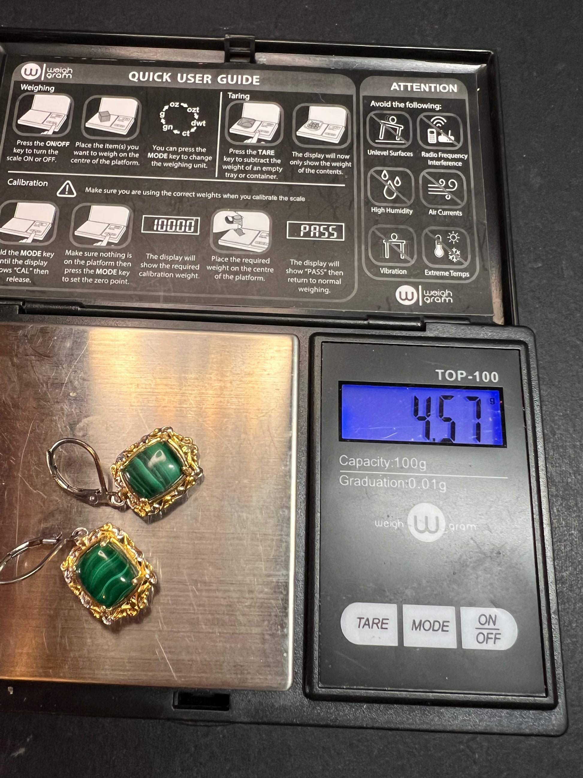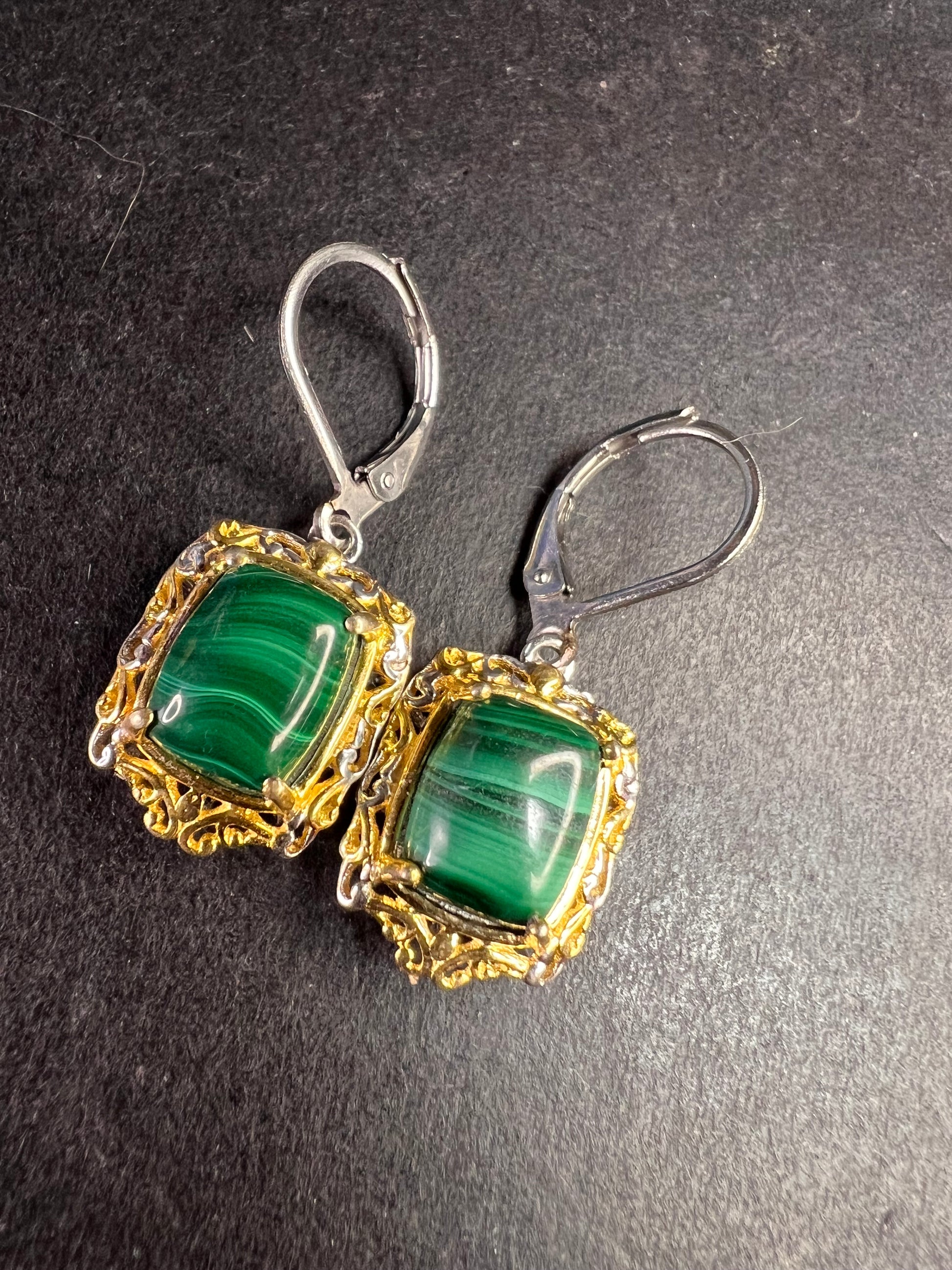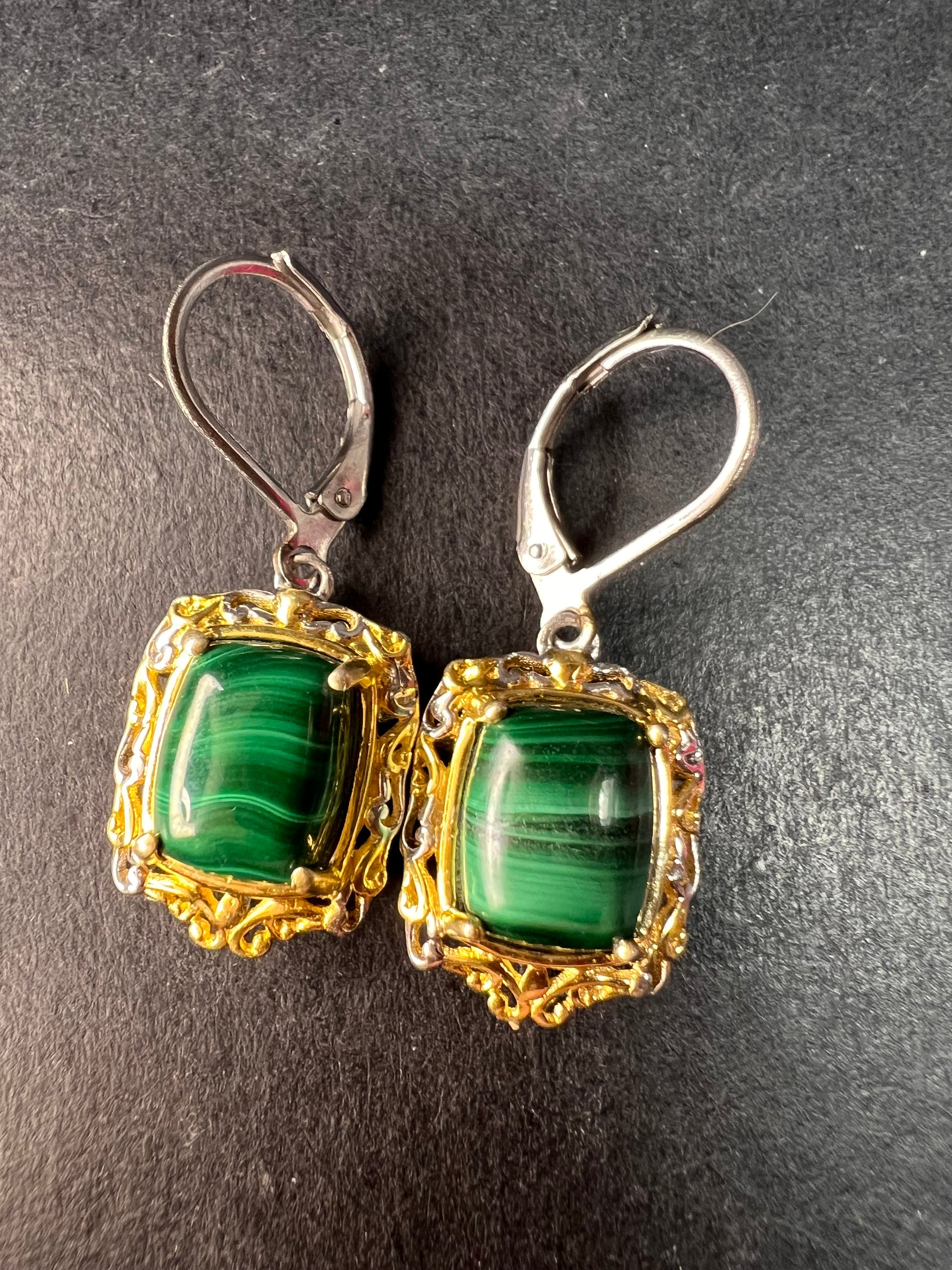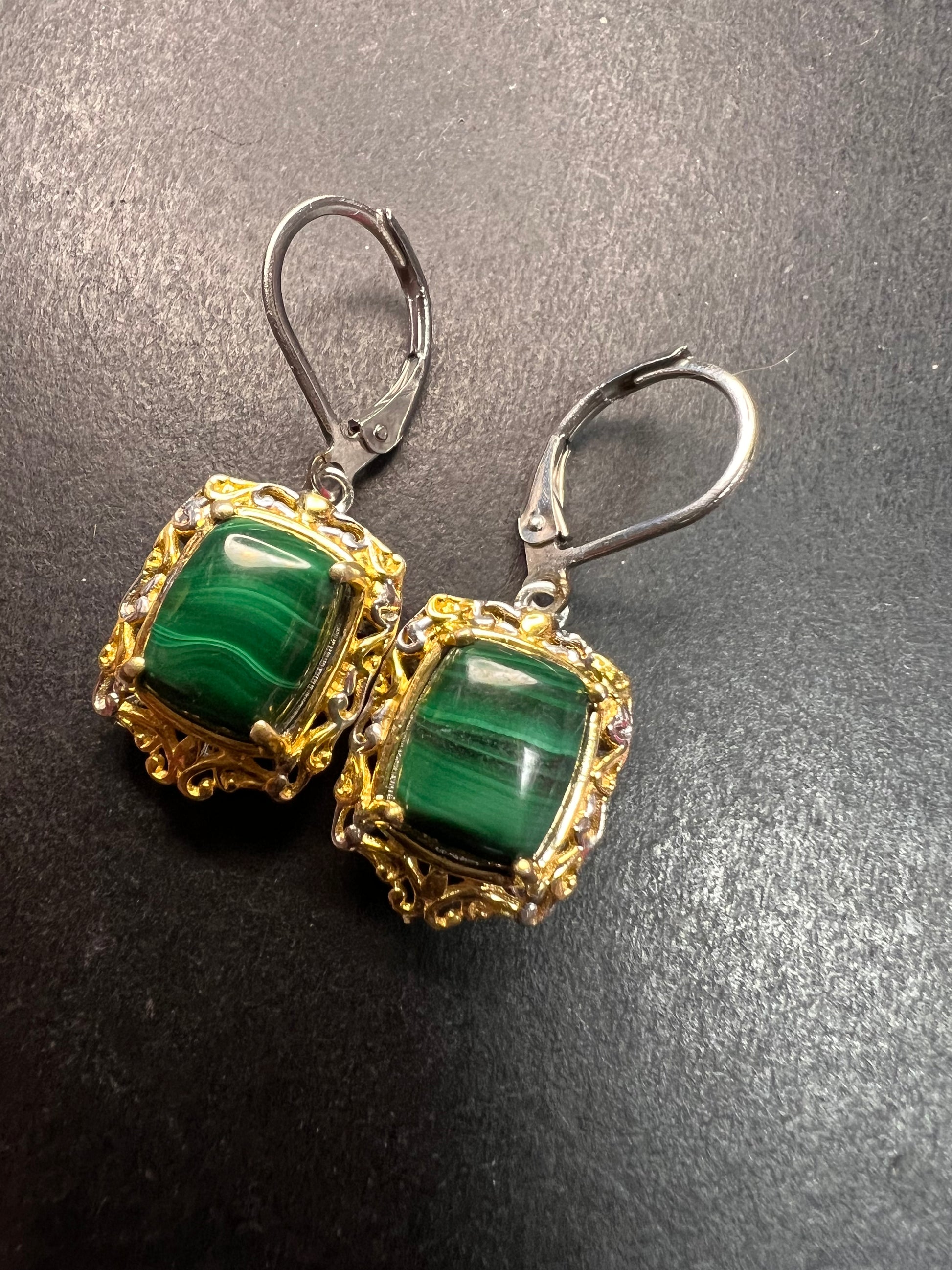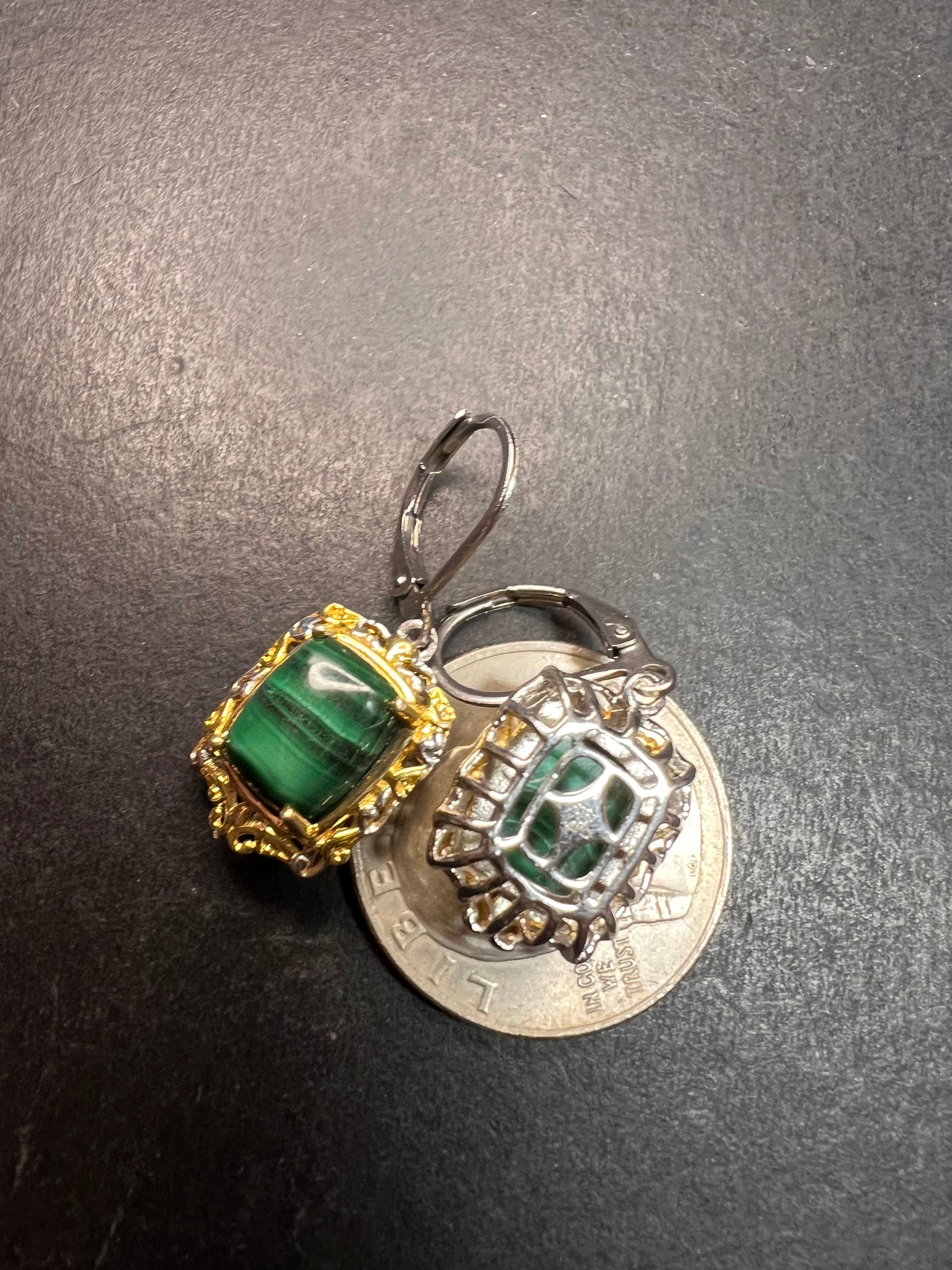 New without original tags or packaging. These beautiful Karis earrings feature polished rectangular malachite cabochons with rich natural banding in deep green tones. Each stone is set in an ornate two-tone frame combining platinum plating with 18K yellow gold accents in an intricate scrollwork design that matches the coordinating Karis ring. Leverback closures provide secure, comfortable wear. Made in India and weighing 4.57 grams for the pair. A striking, elegant set that adds a bold pop of color to any look.
