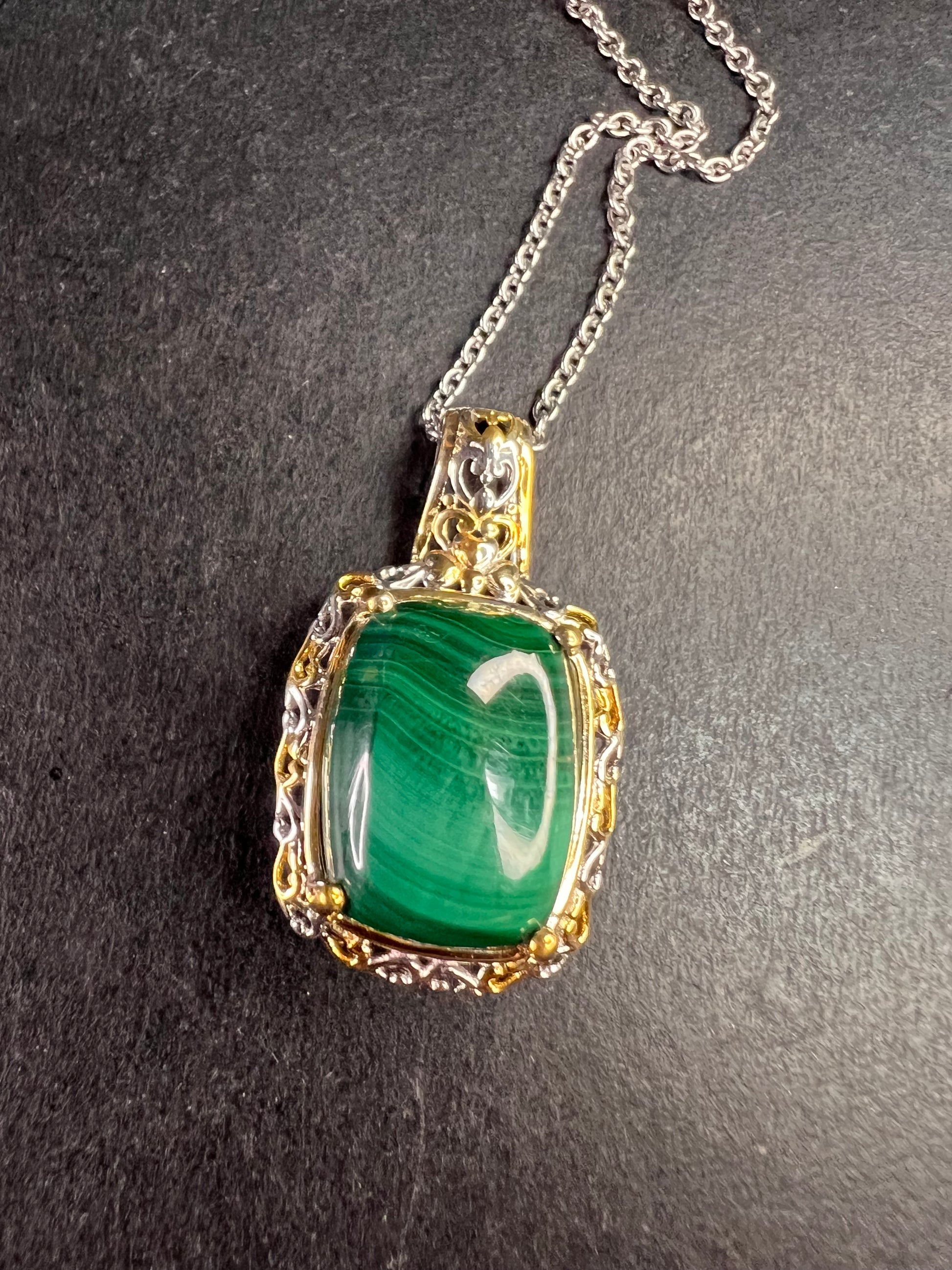 New in its original unmarked bag. This stunning Karis pendant necklace showcases a polished rectangular malachite cabochon with beautiful natural banding in vivid green tones. The pendant features an ornate platinum-plated and 18K yellow gold-accented frame with intricate scrollwork that matches the coordinating Karis earrings and ring. The pendant is paired with a durable 20-inch stainless steel chain with a secure lobster clasp. Made in India and weighing 6.00 grams total. A bold, eye-catching statement piece that completes the set effortlessly.