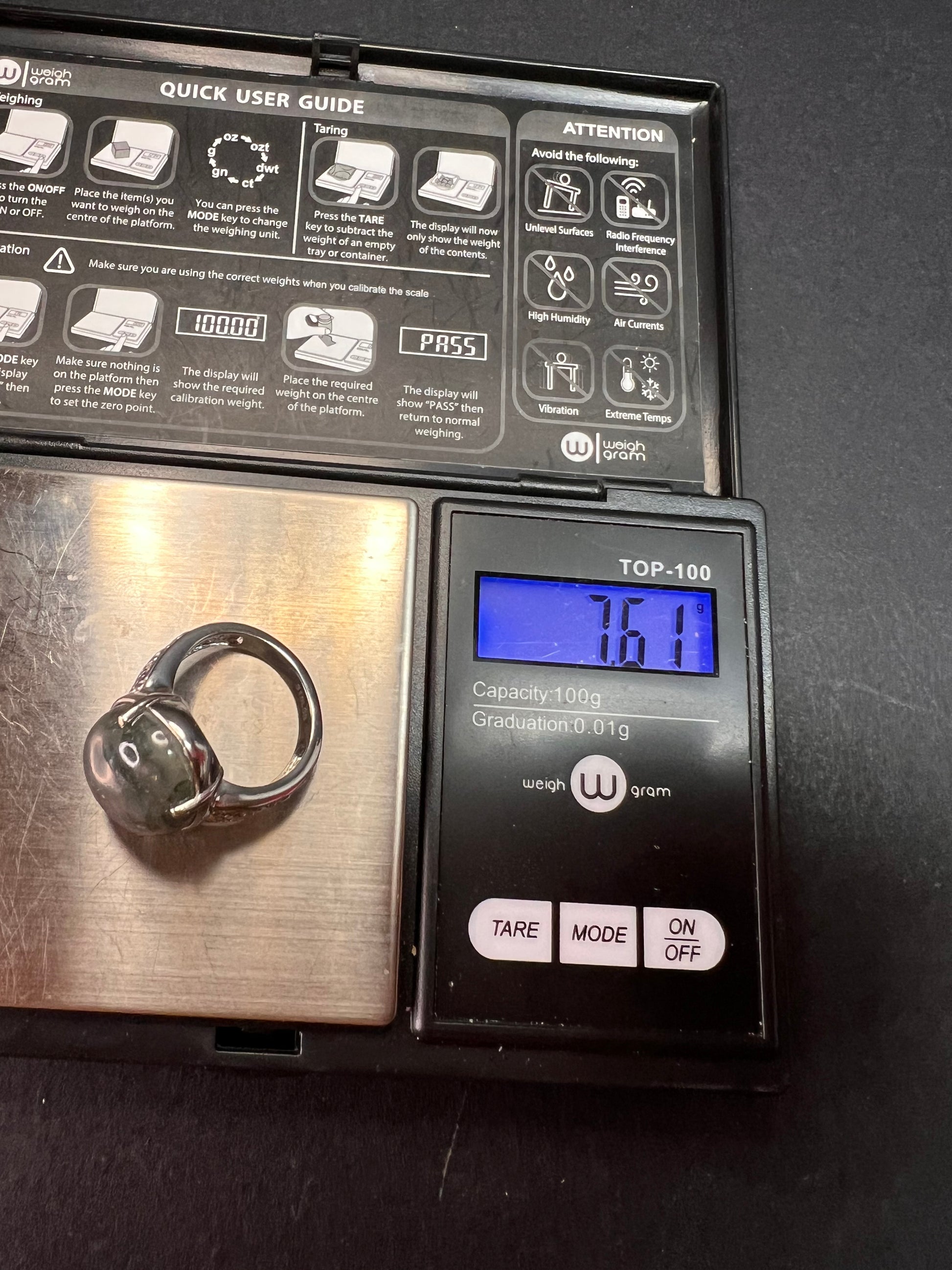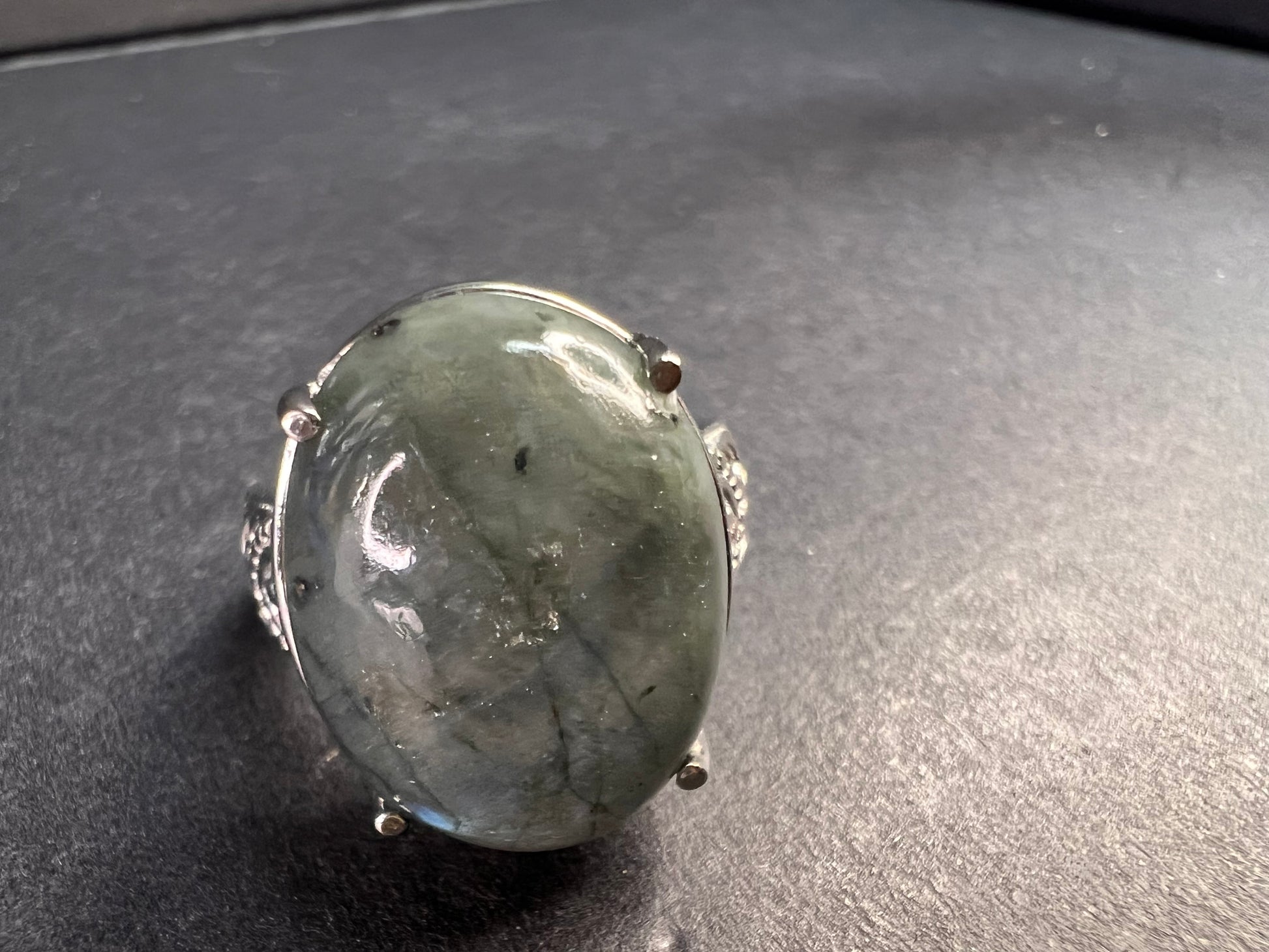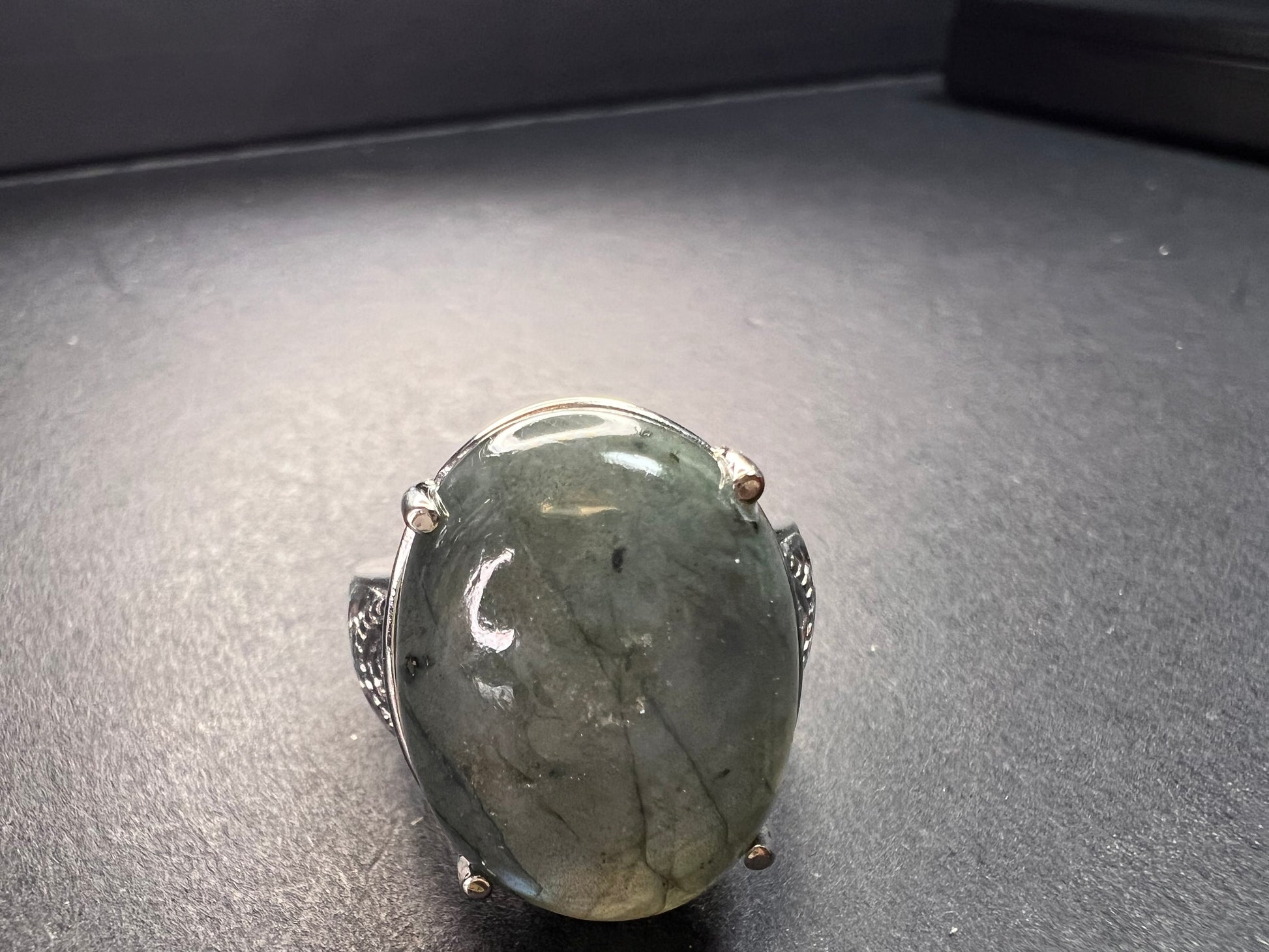Genuine labradorite from Madagascar. Prong set in stainless steel. Size 7. 18.10 ctw. Total weight is 7.61 grams. 316 LSS. Made in India.