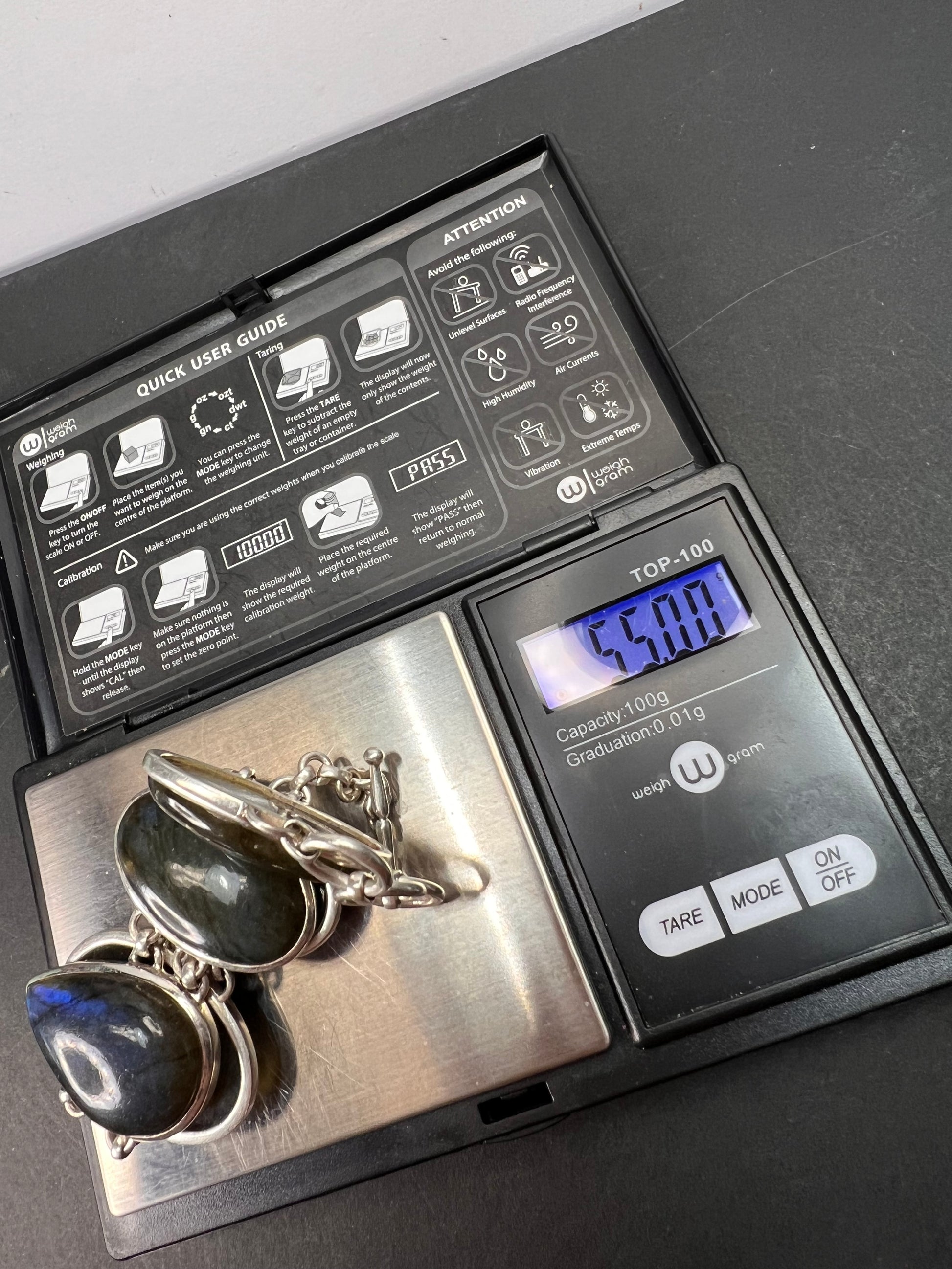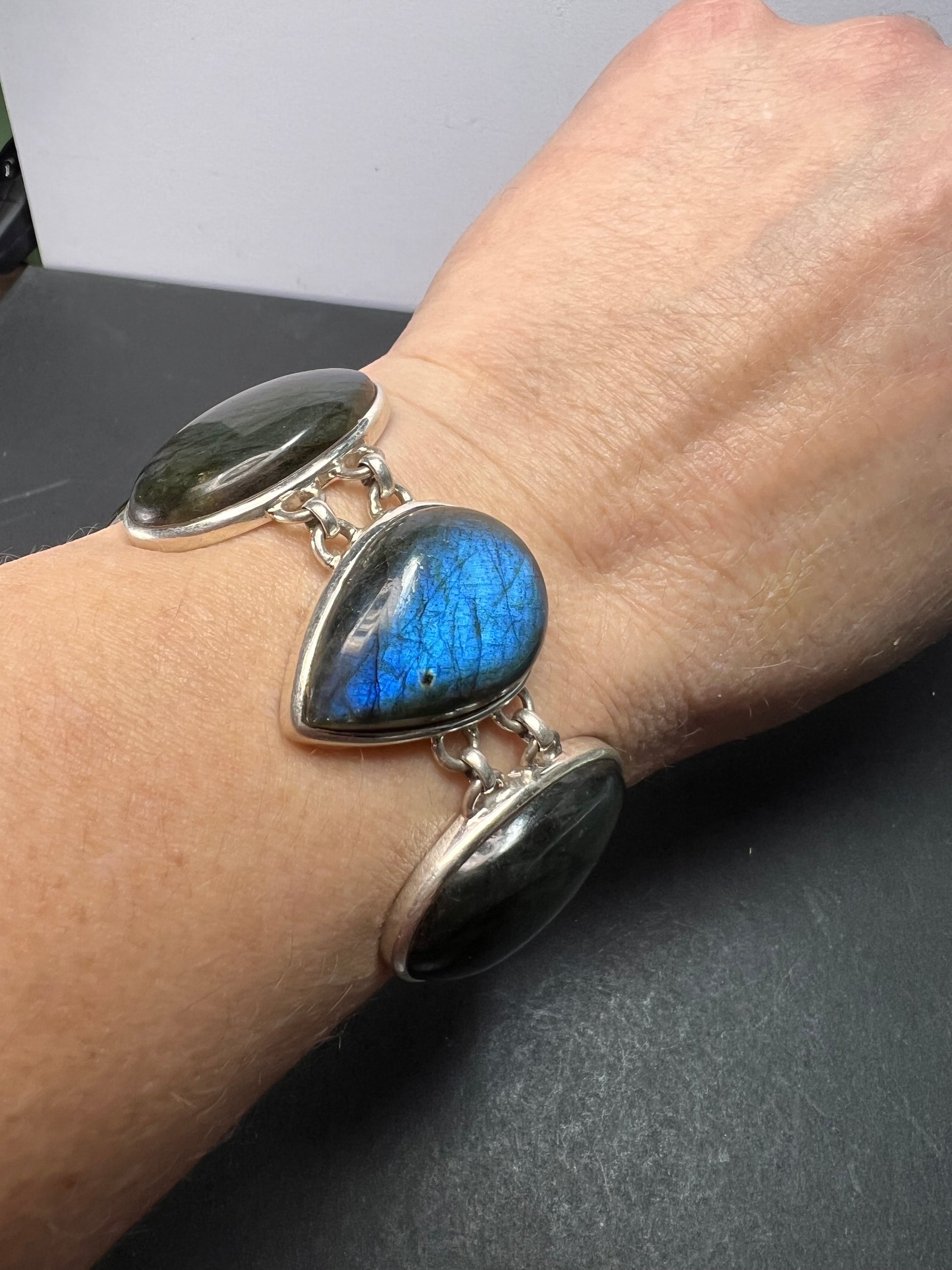 Genuine flashy labradorite freeform cabochons bezel set in authentic 925 sterling silver. Bracelet measures about 7.75 inches at end link and about 6.5 inches at first link. Total weight is 55.00 grams. No purity stamp found but verified 925 sterling silver with acid testing.
