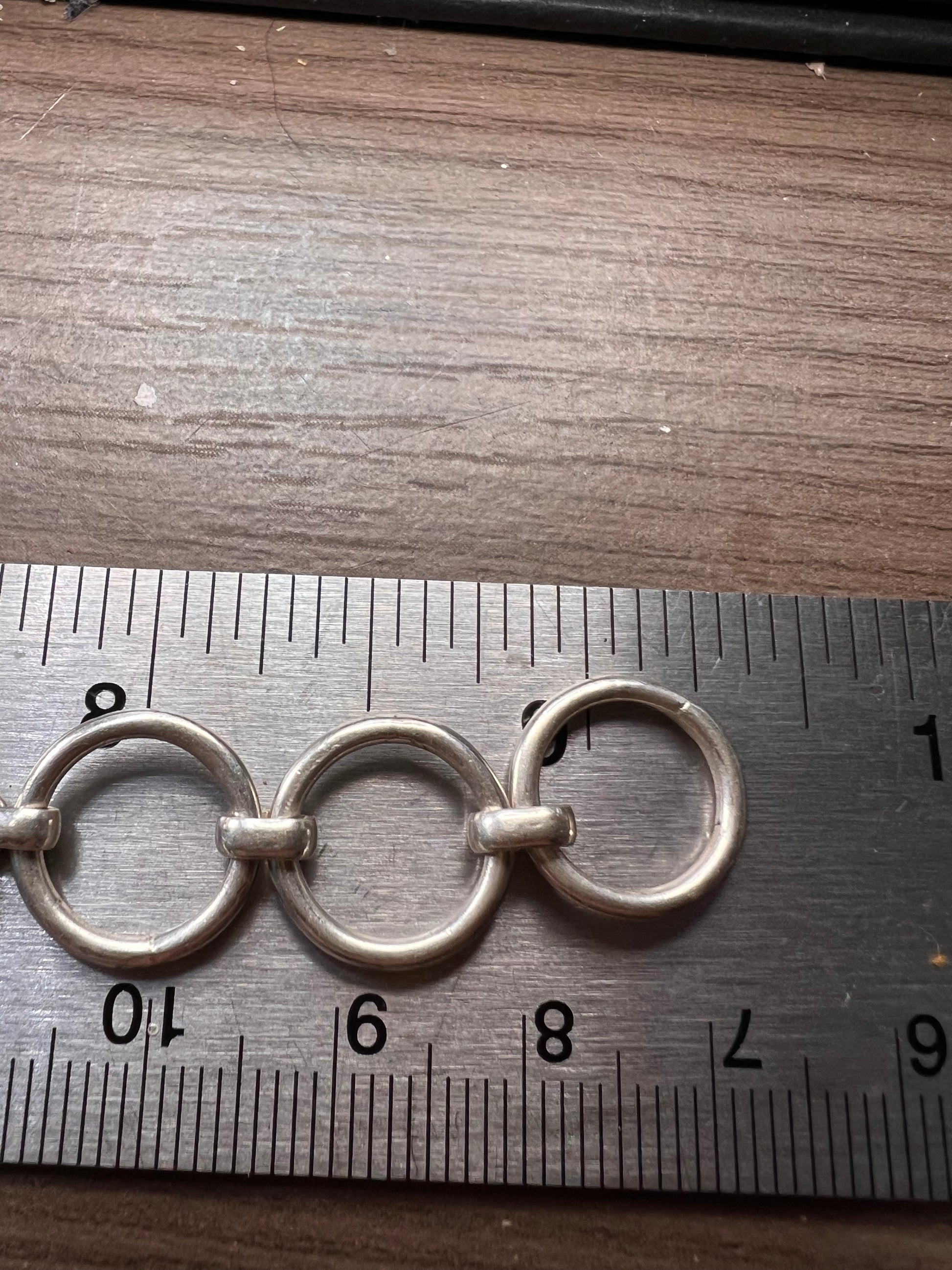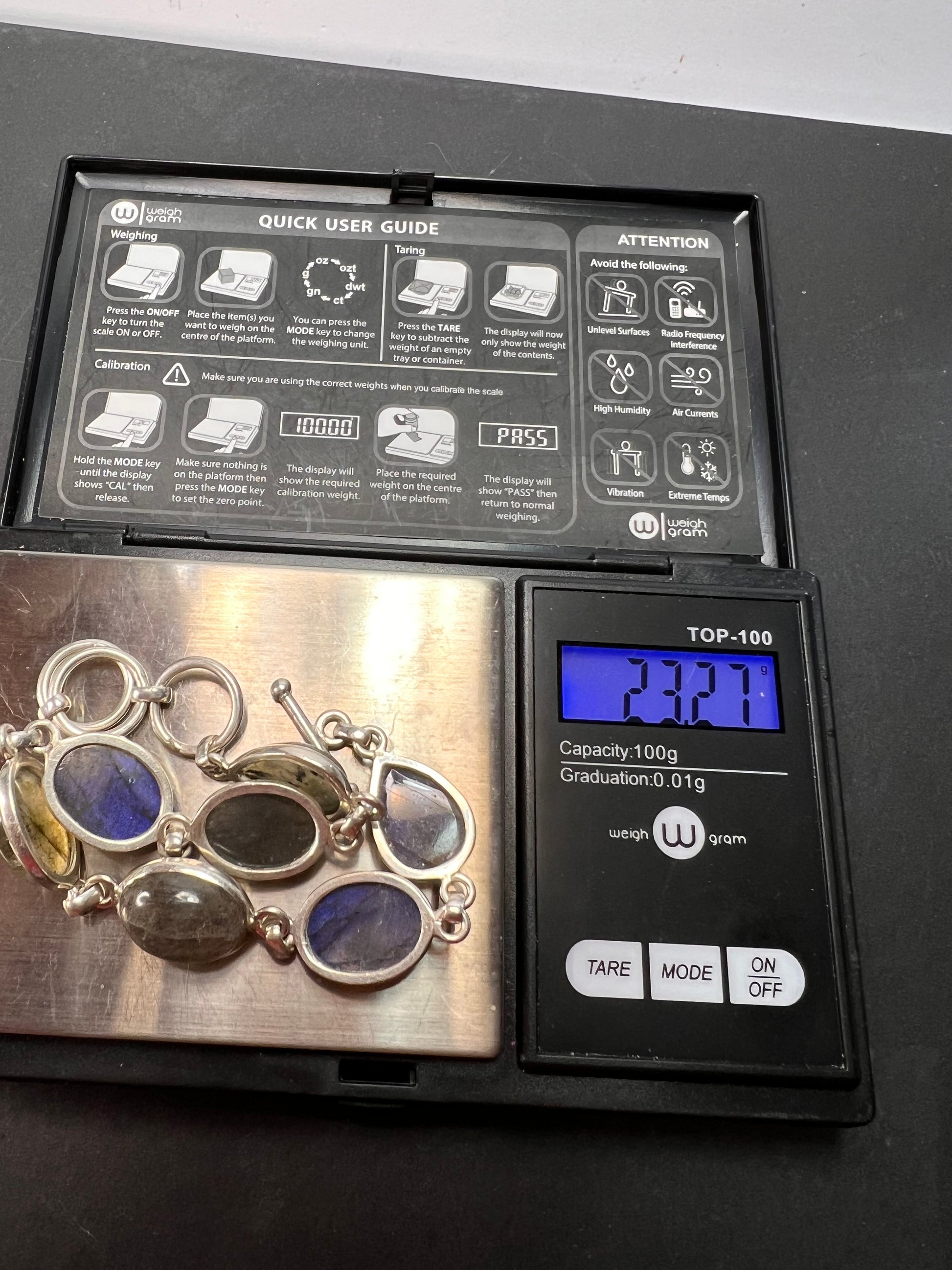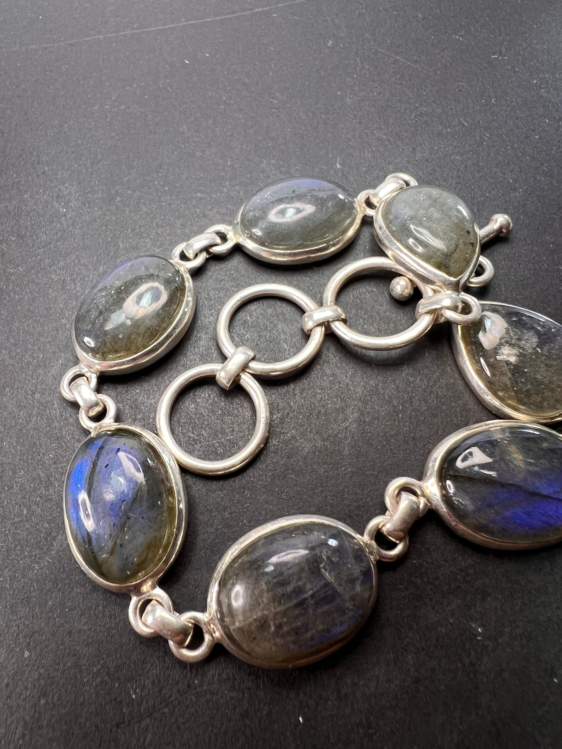 Genuine flashy labradorite cabochon stones set in authentic 925 sterling silver. Measures about 9.25 inches in length at its longest point. No 925 stamp found but acid tested for purity. Total weight is 23.27 grams.