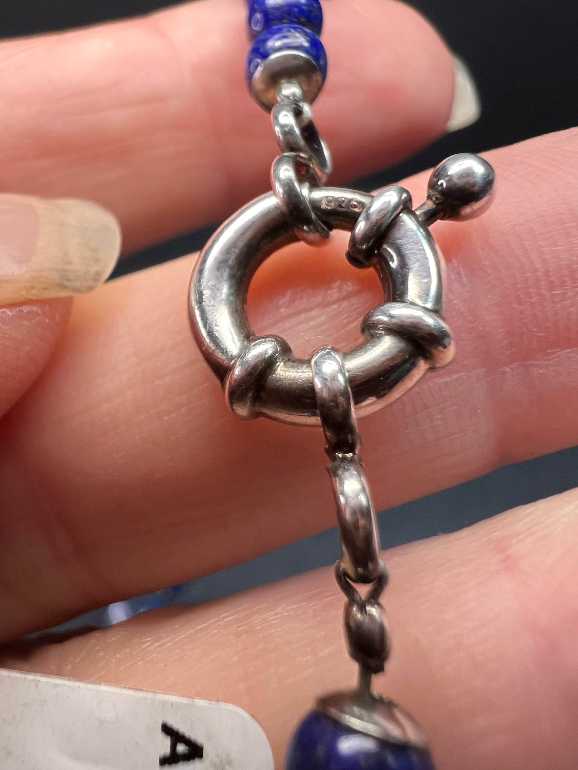 Genuine lapis lazuli stone beads strung on jewelers wire with 925 sterling silver spacer beads with a 925 sterling silver jumbo spring ring clasp. Measures 18 inches in length. AlumaUSA (for Nordstrom). Made in China.