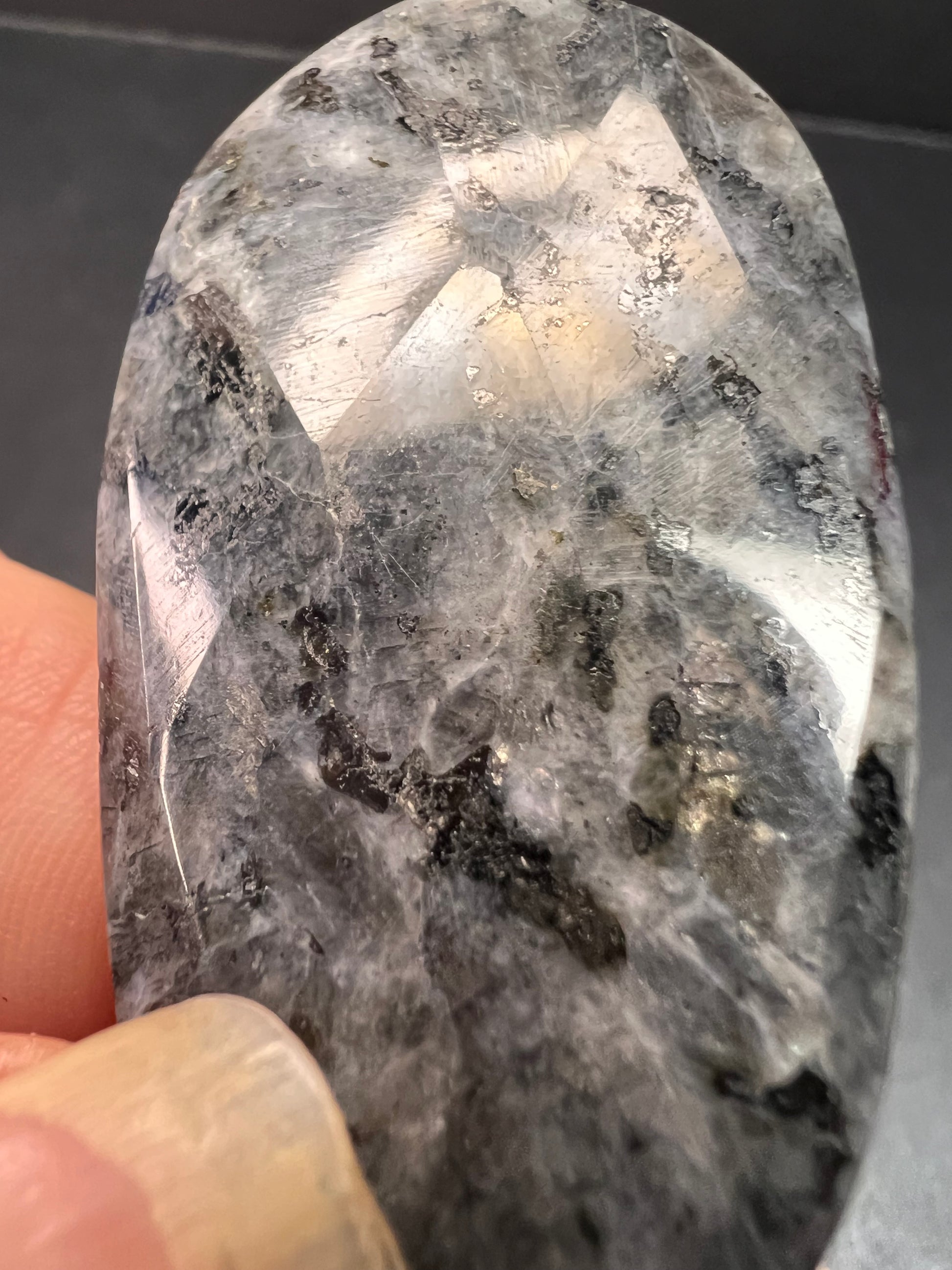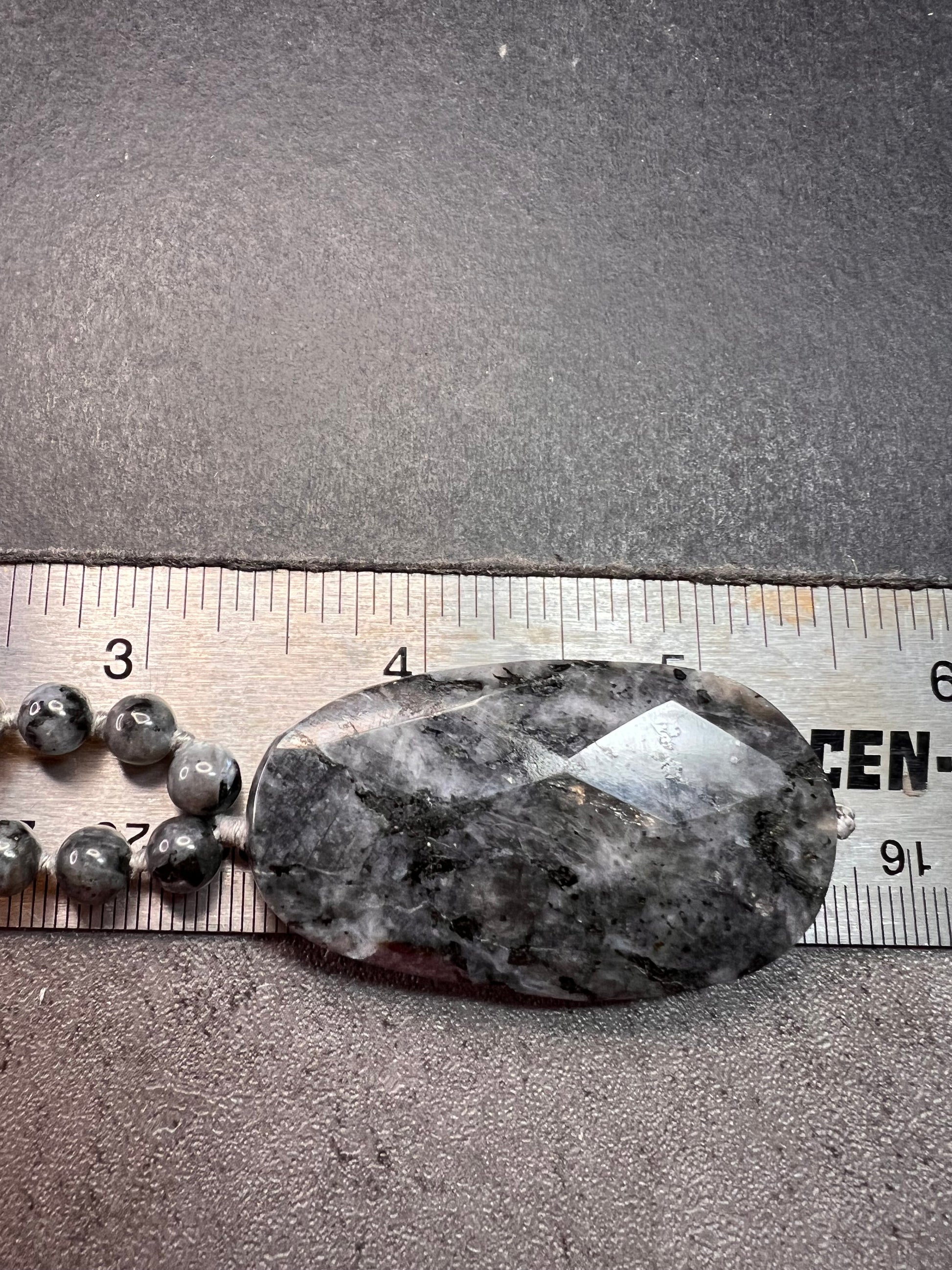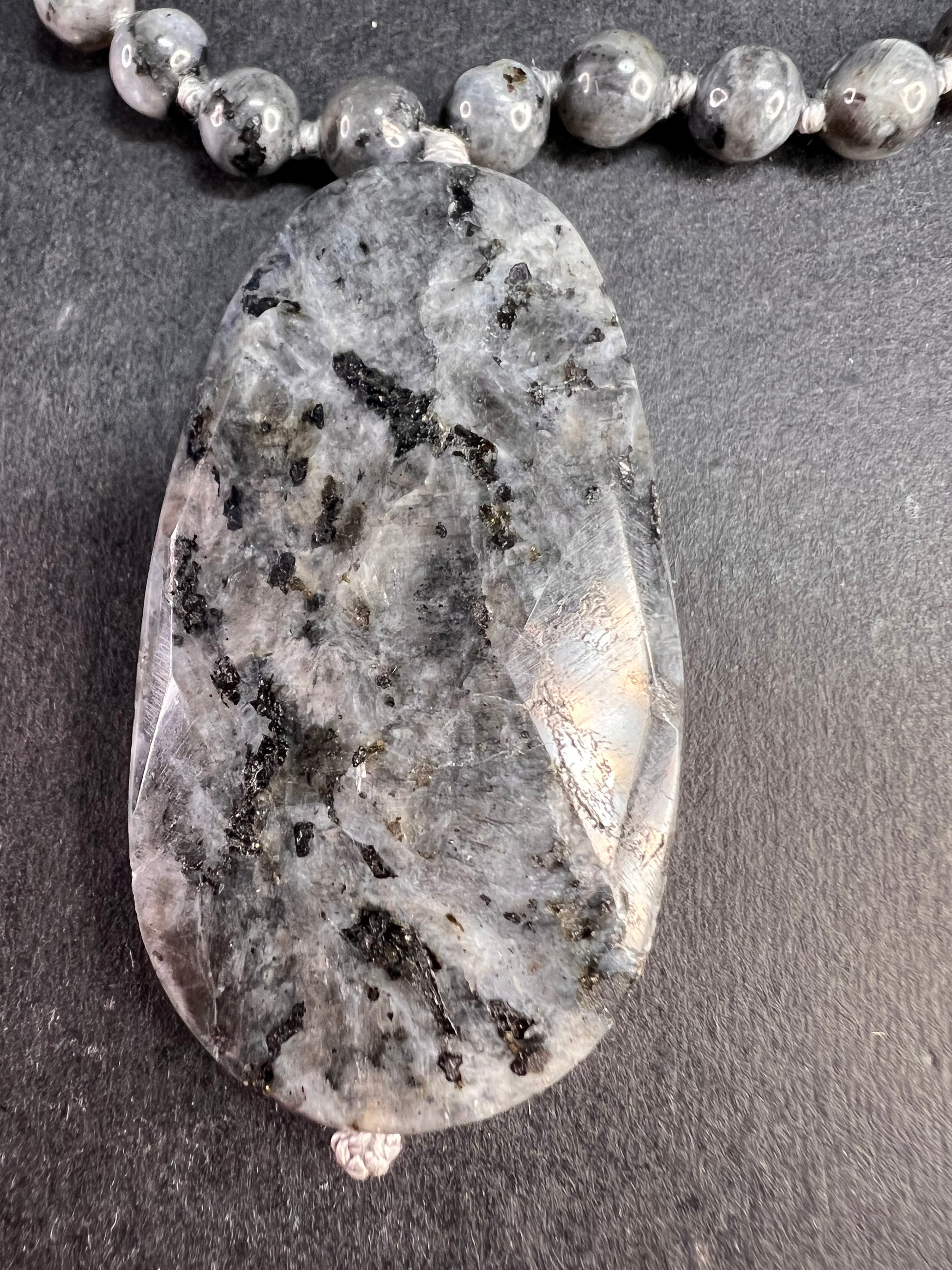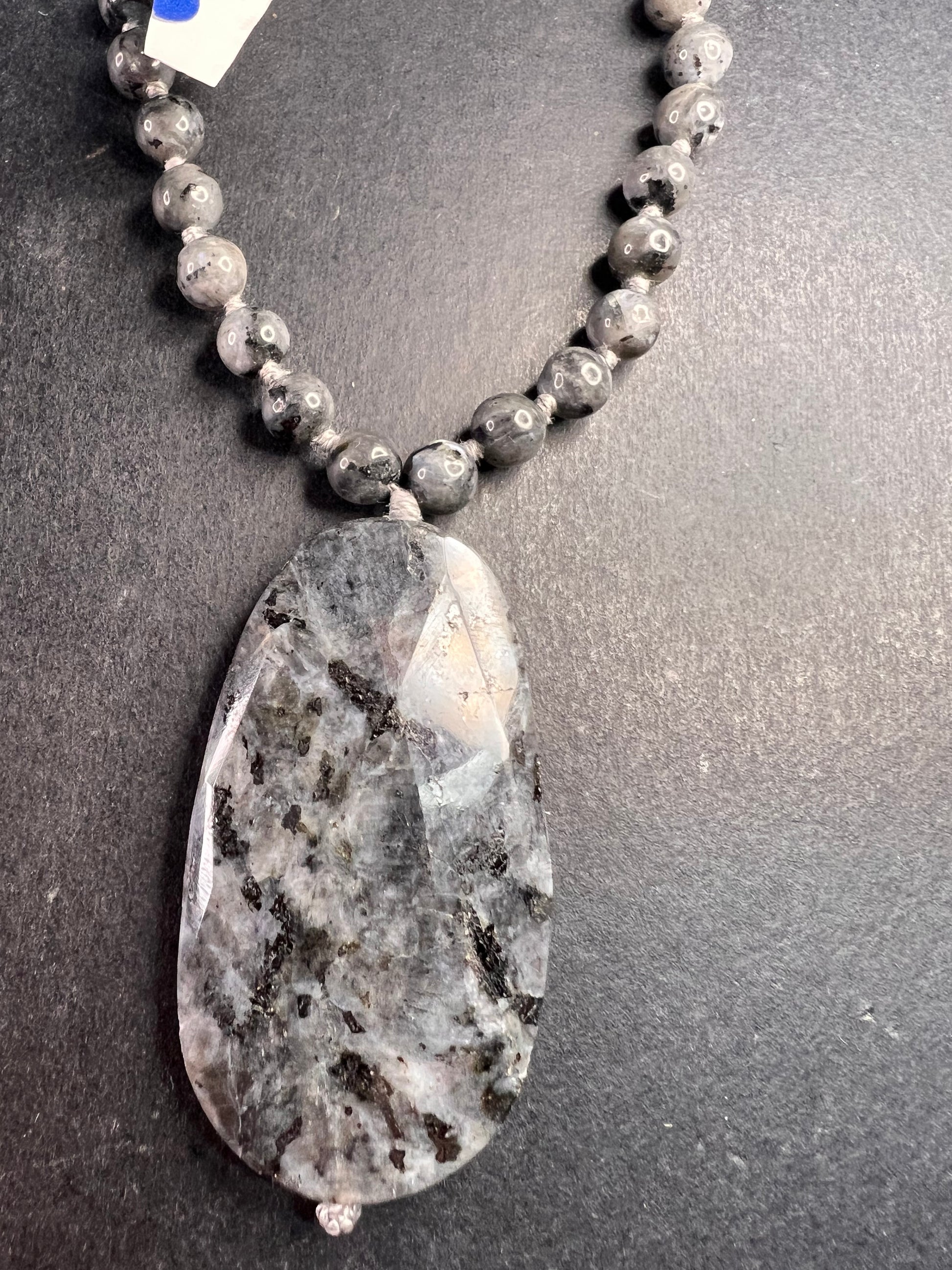Genuine larvakite stone beads measuring about 6mm in diameter,hand knotted in between each one on grey cord. Measures about 30 inches in length with a large oval larvakite pendant hanging from the middle. AlumaUSA