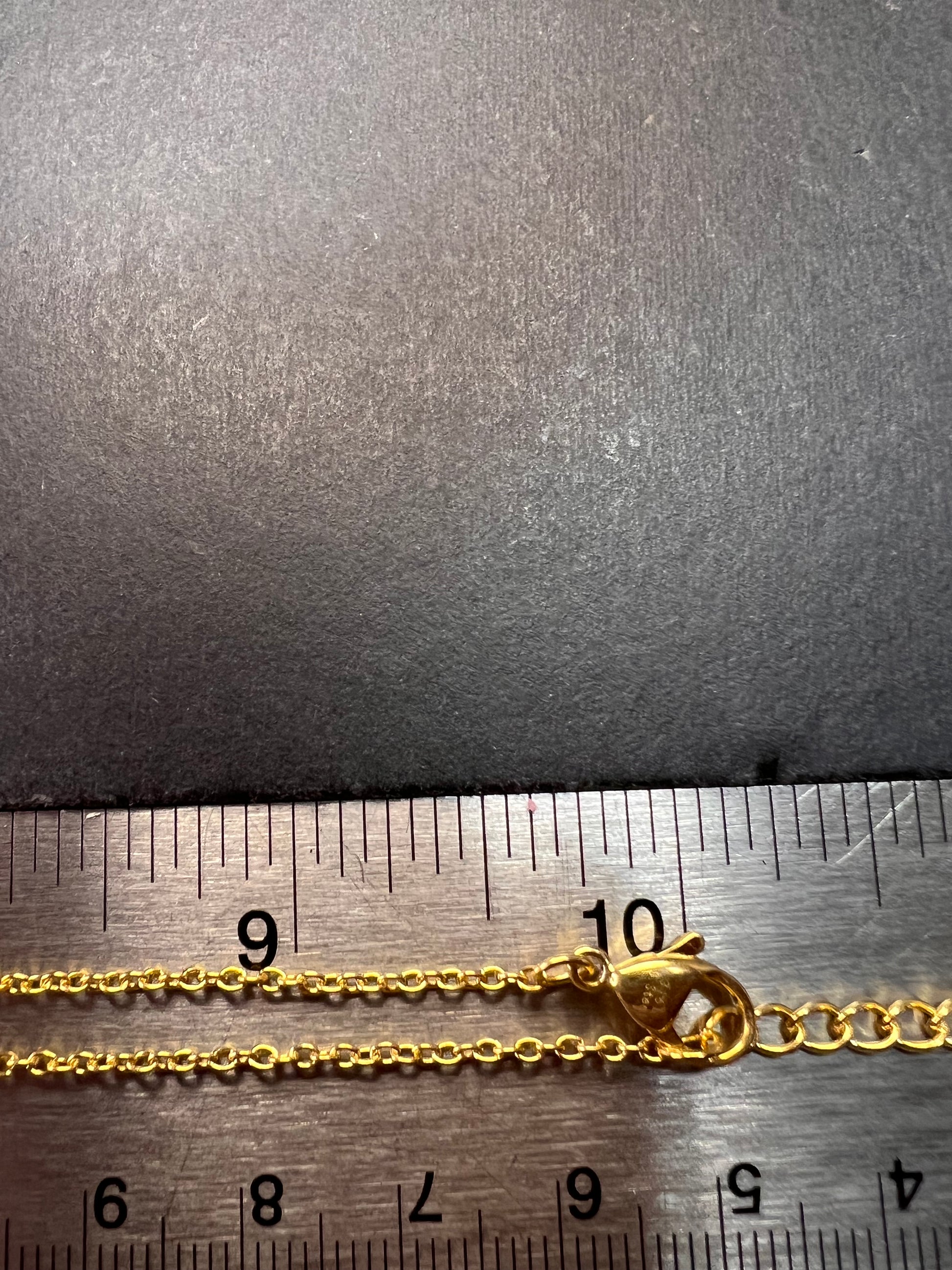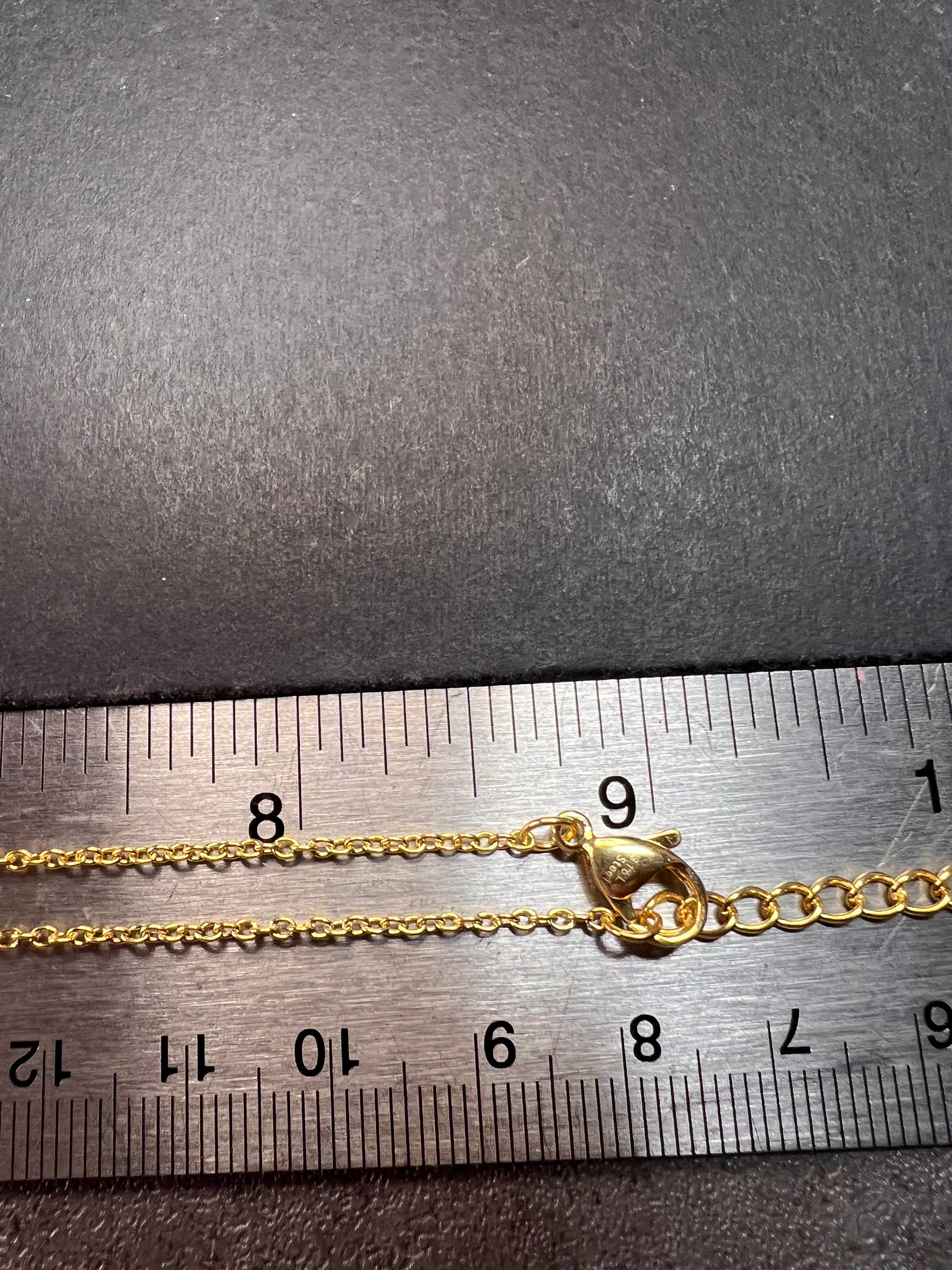 Genuine malachite stone set in a brass setting that’s ion plated with a 18k yellow gold finish. Chain is 18k yellow gold ion plated over stainless steel. Necklace measures about 18 inches at its shortest length before the teardrop pendant in the center, and 20 inches with the teardrop. Extension chain adds another 2 inches if desired for 20-22 inches total. Total weight is 12.42 grams. Karis. Made in India. 14.35 ctw.