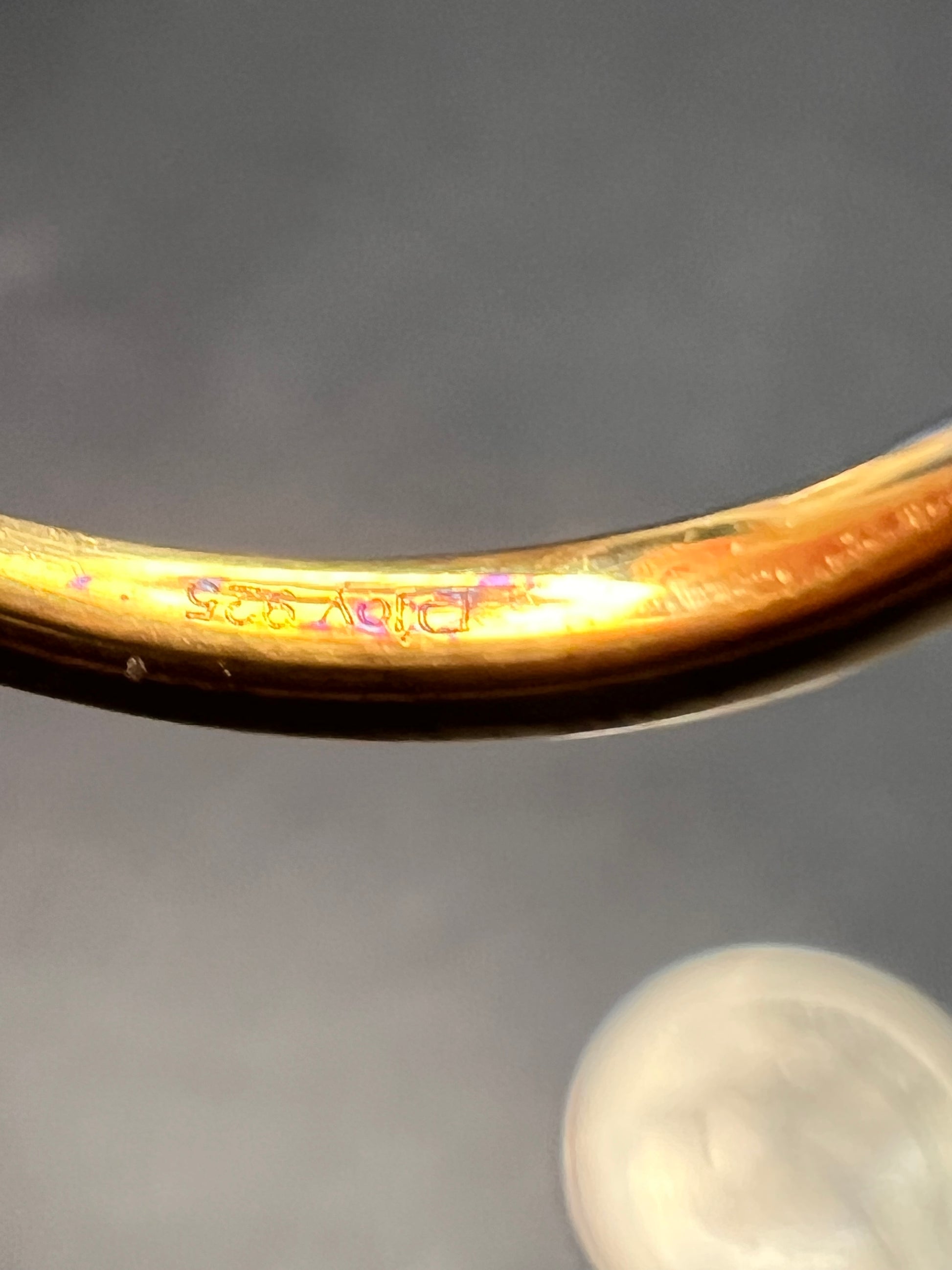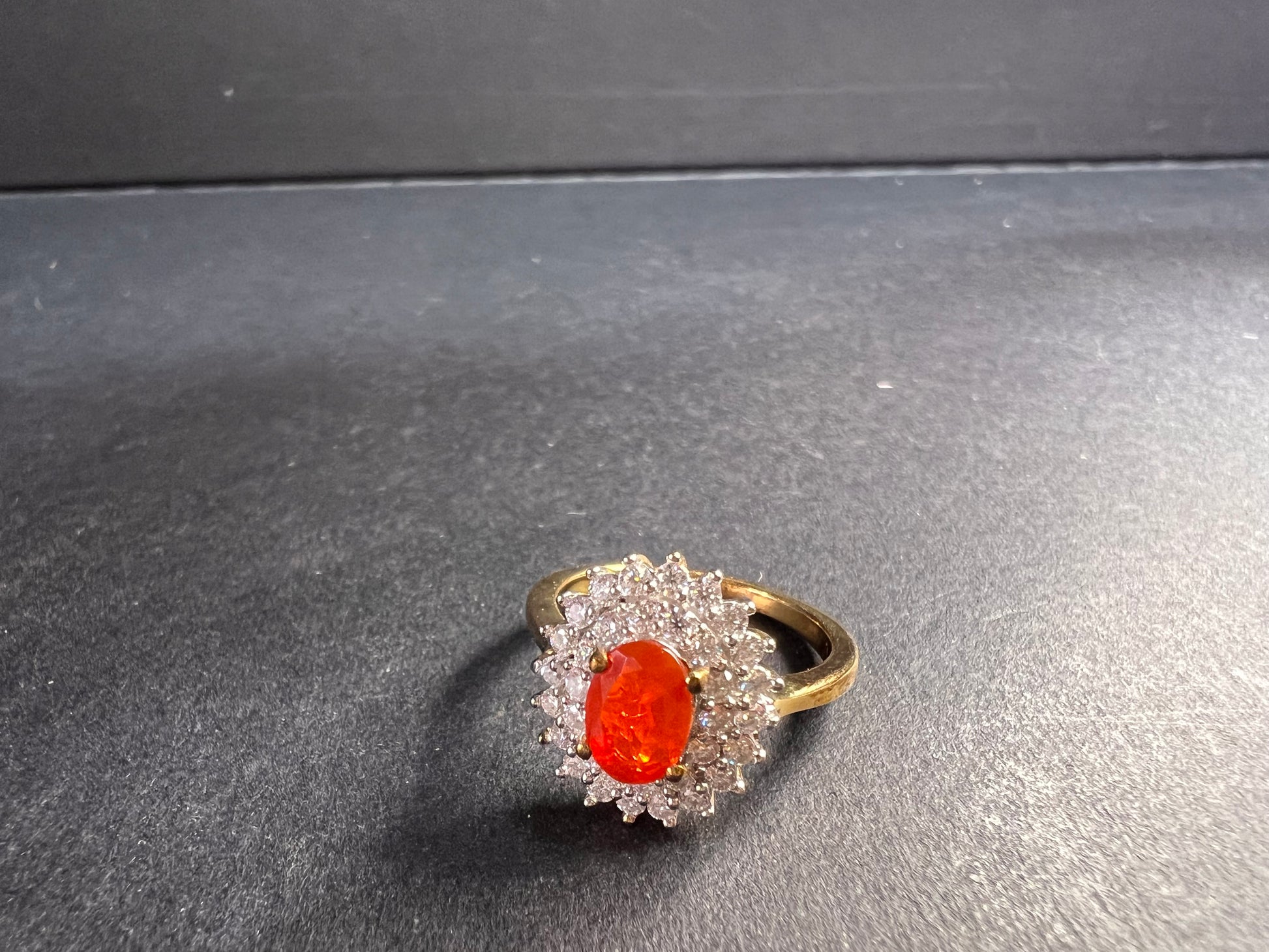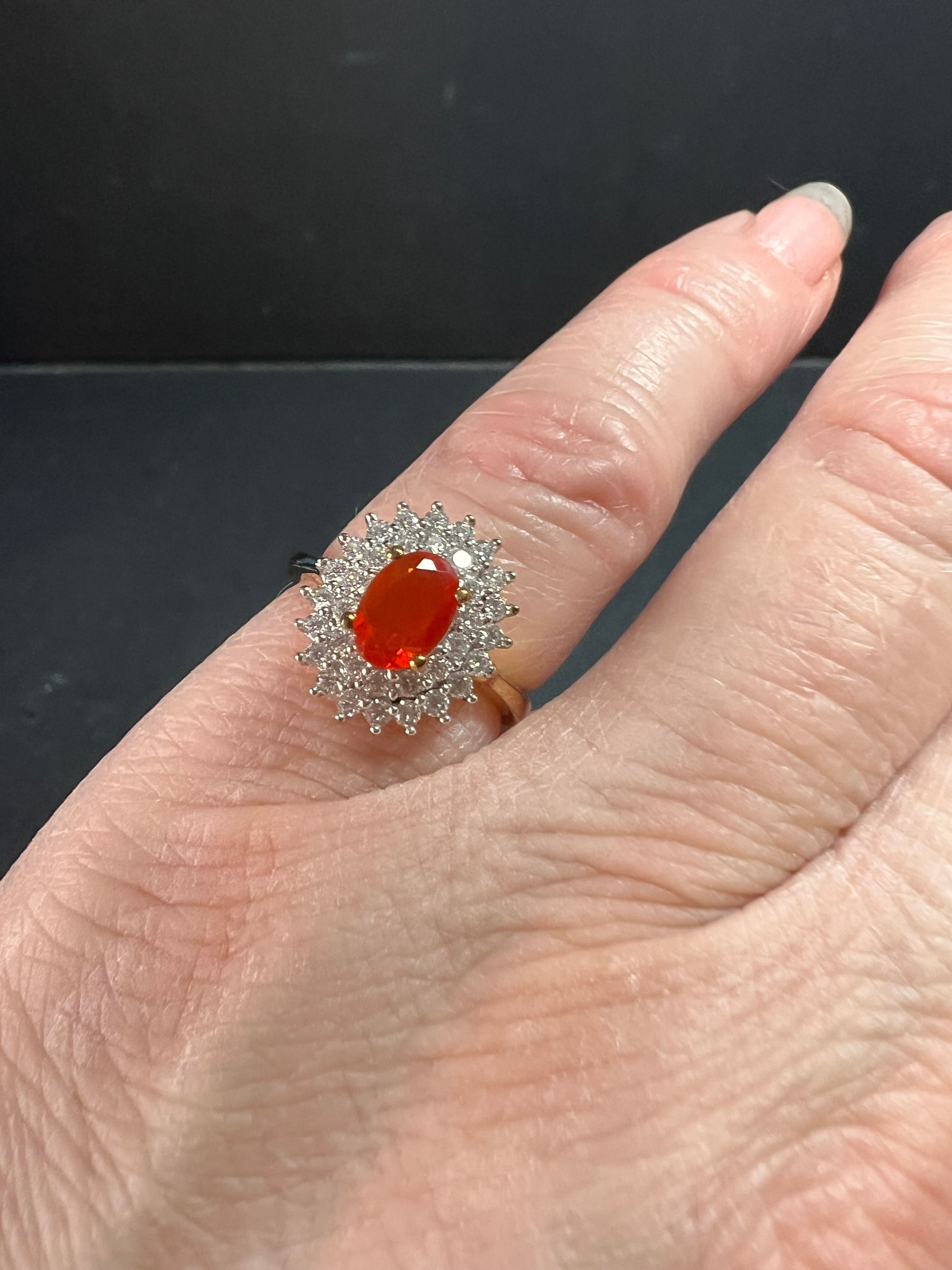 Genuine bright red orange Mexican cherry fire opal oval cut gemstone prong set in authentic 925 sterling silver with a vermeil yellow gold thick plating. White accent stones in both halos around the opal are Moissanite. Ring measures a size 5. Total weight is 2.98 grams. 1.20 ctw. 925 Djoy. Made in India. Estimated retail value is $699