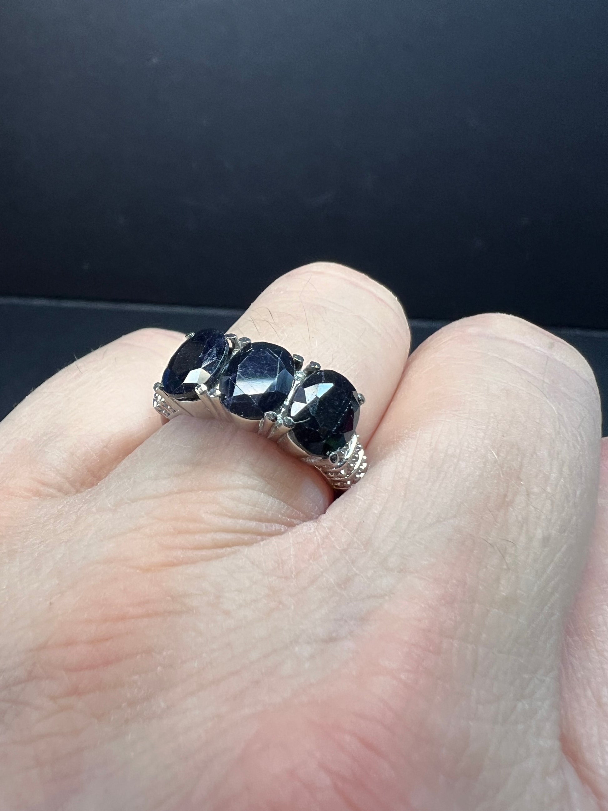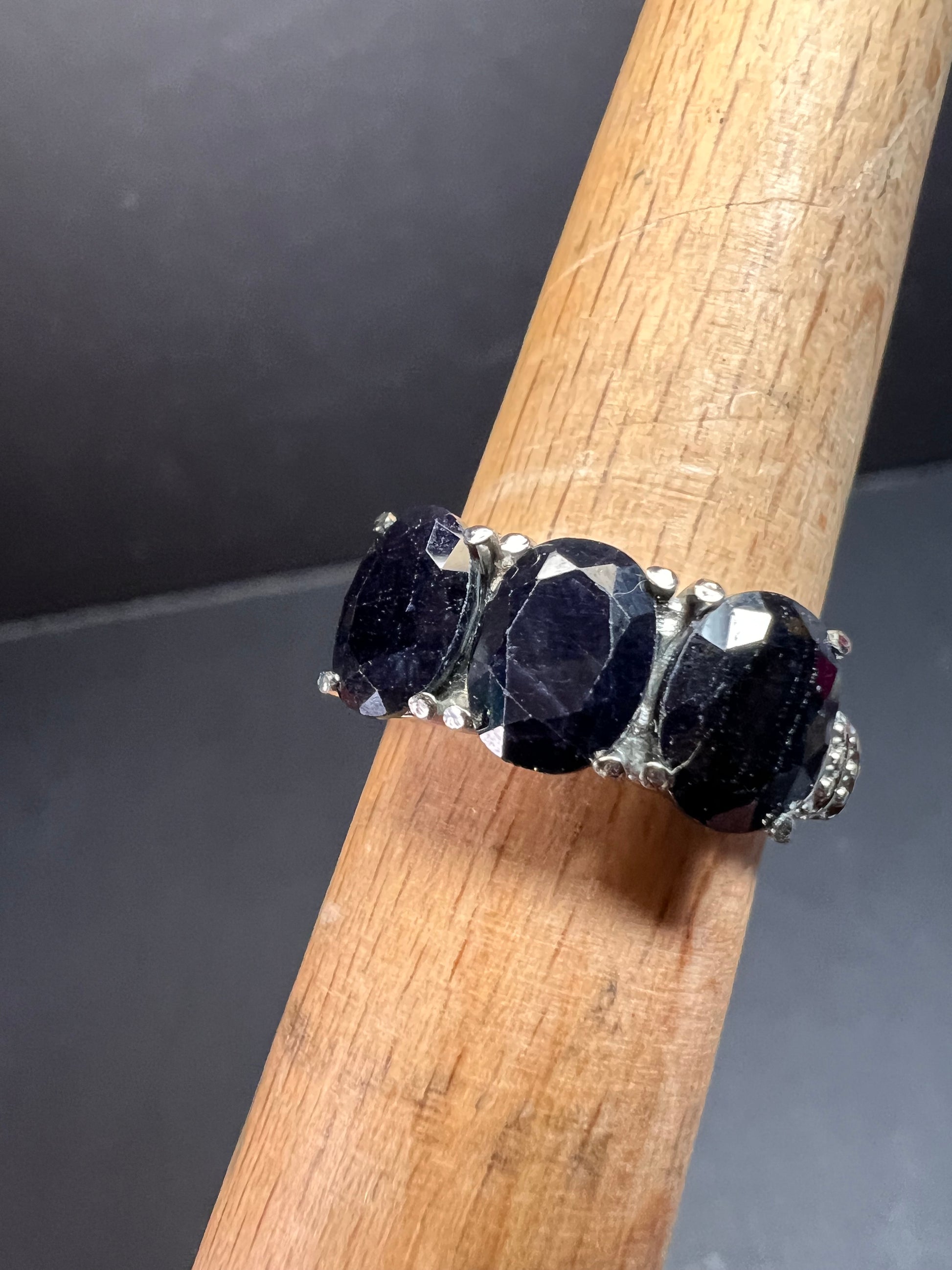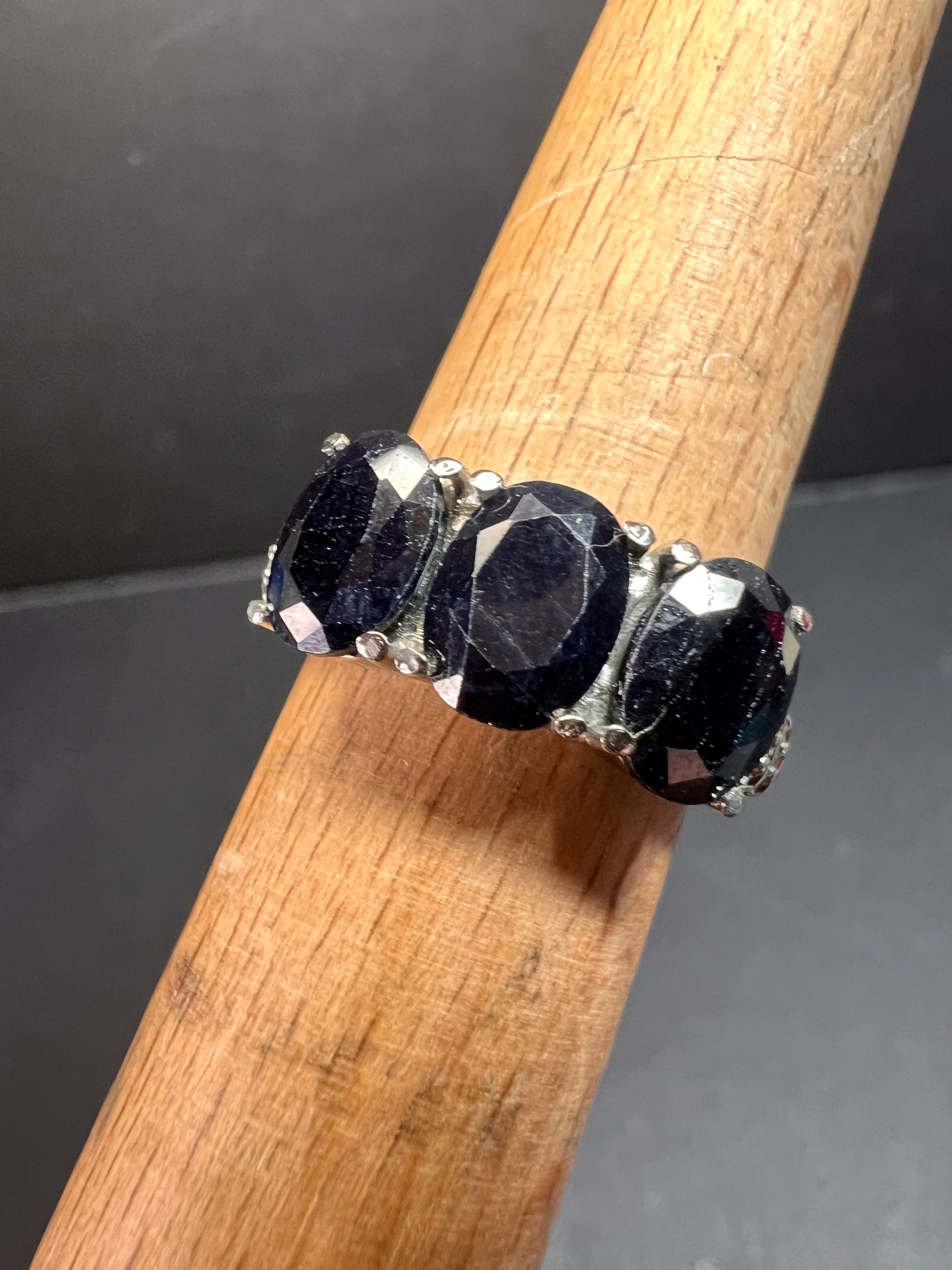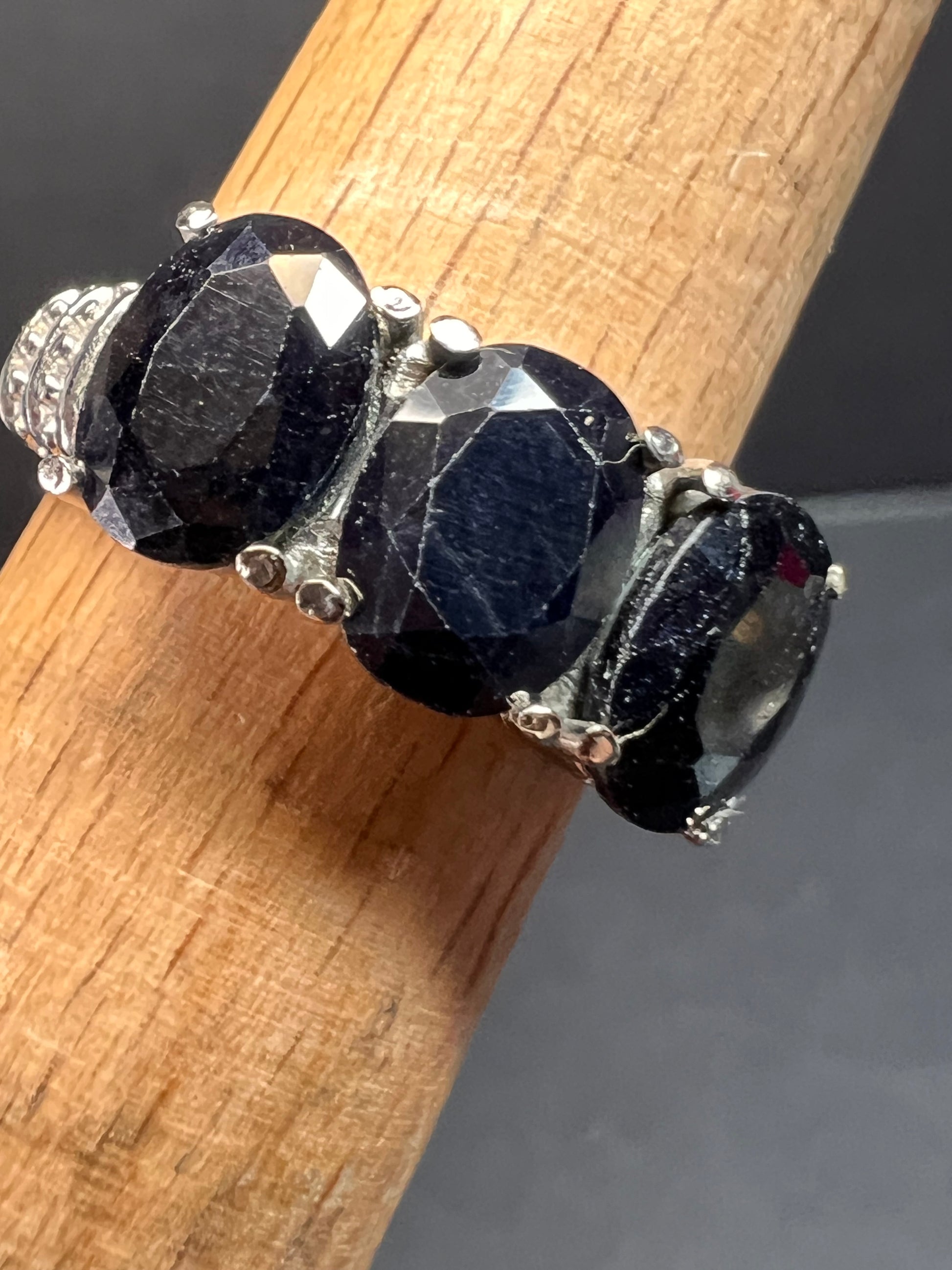 Genuine midnight dark blue sapphires prong set in a stainless steel setting. Measures a size 8.