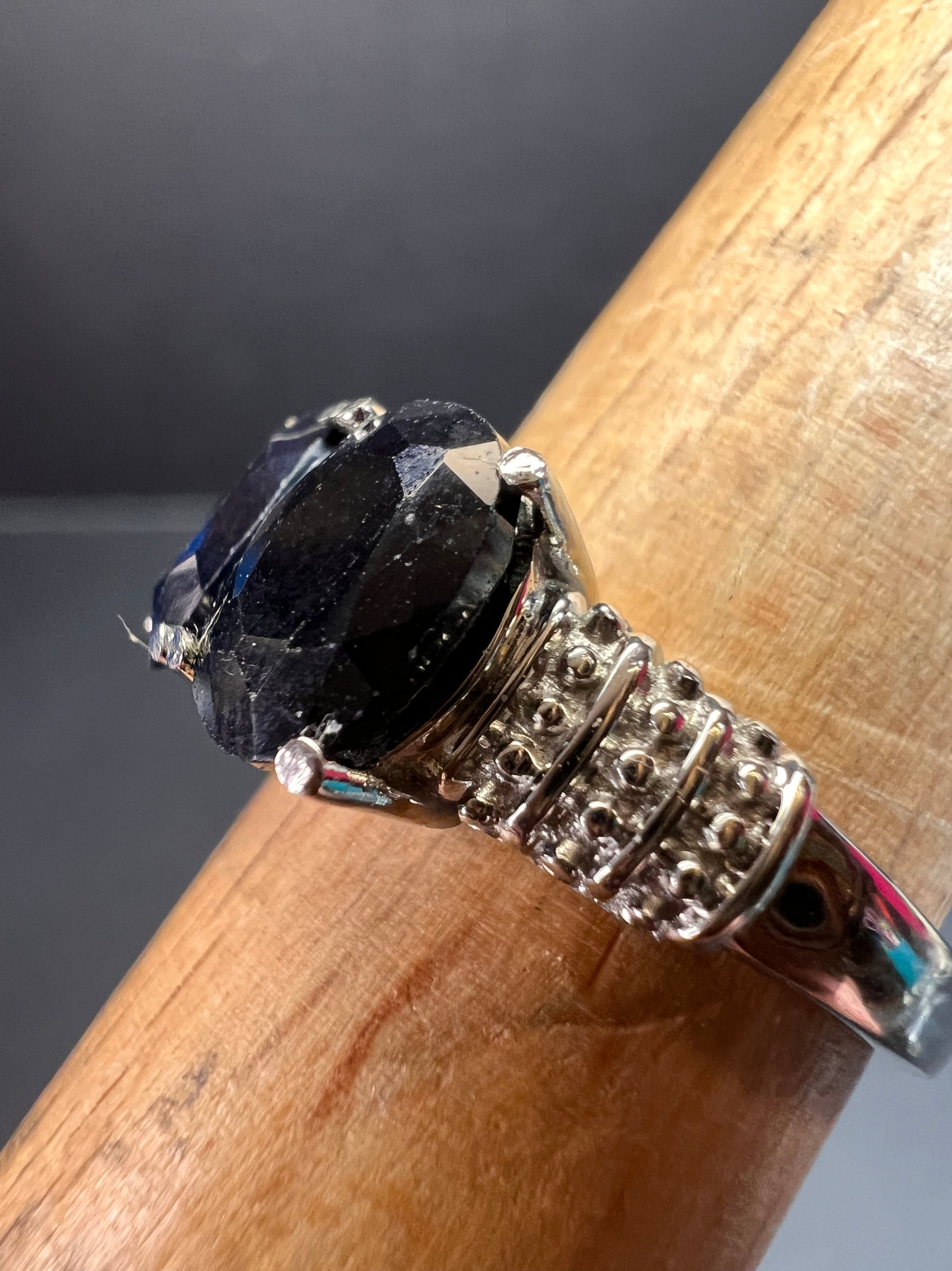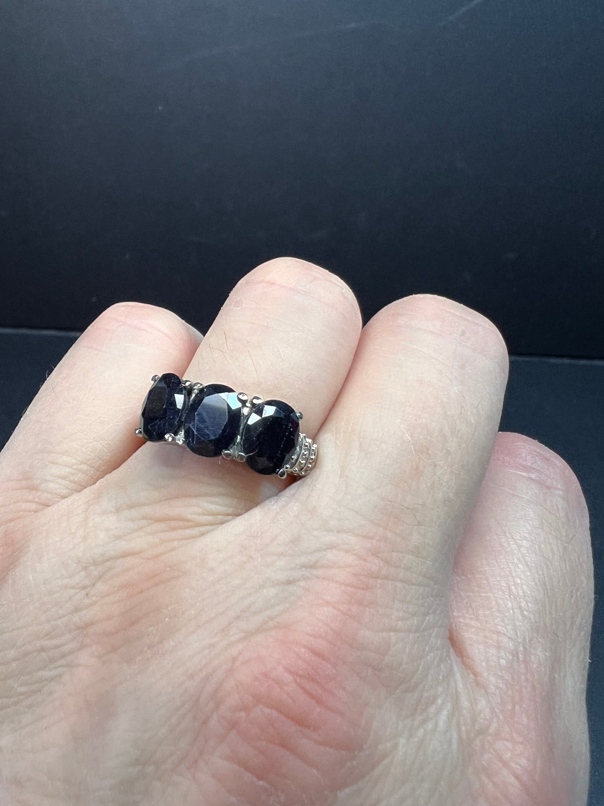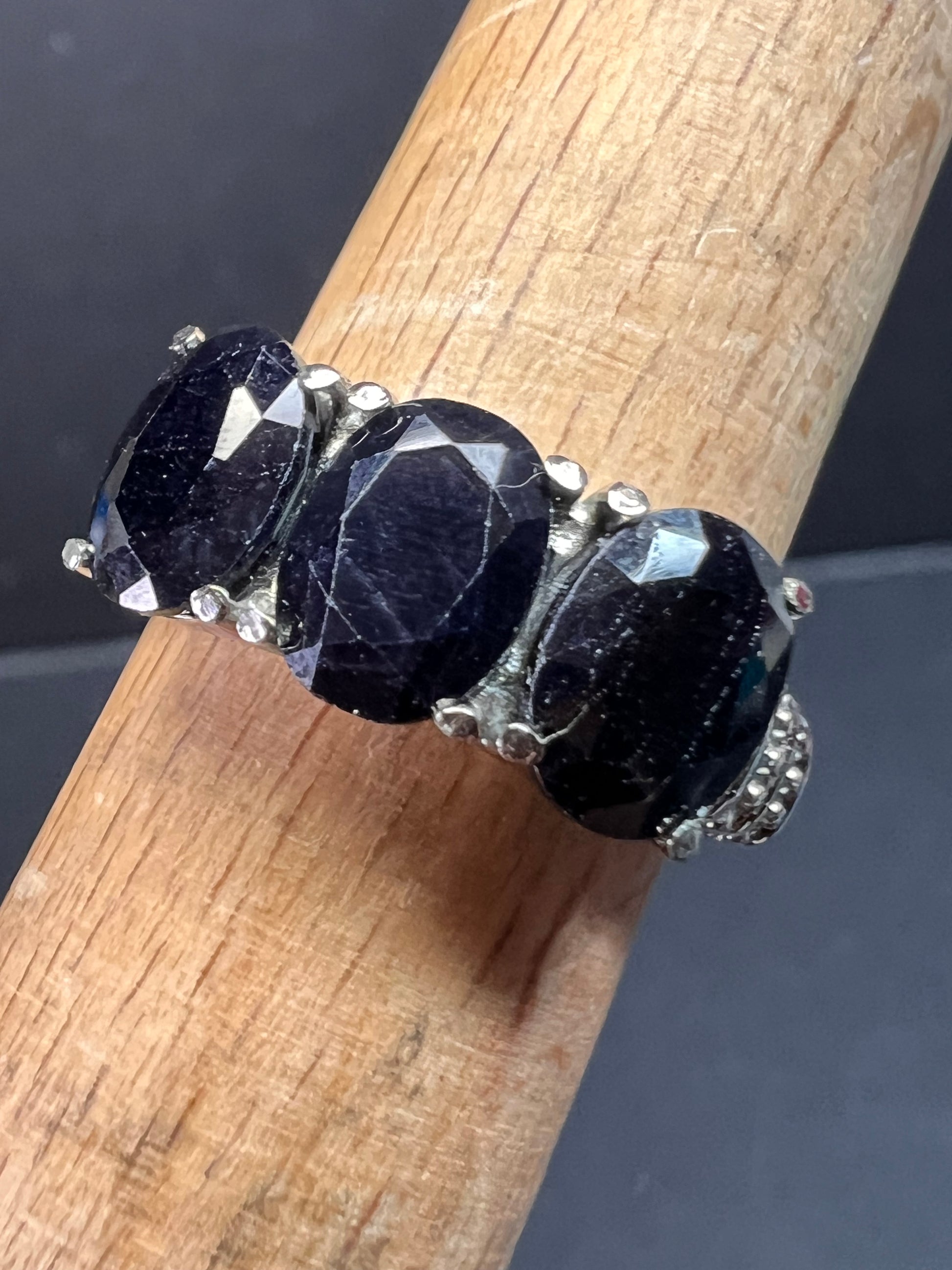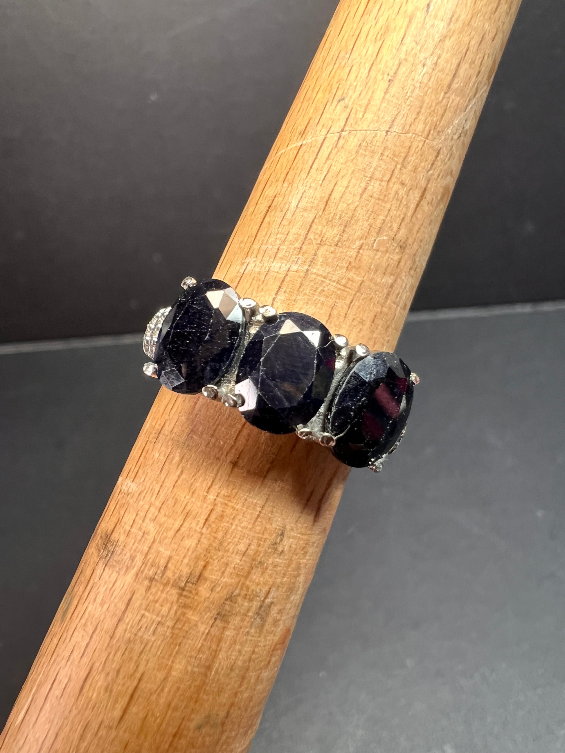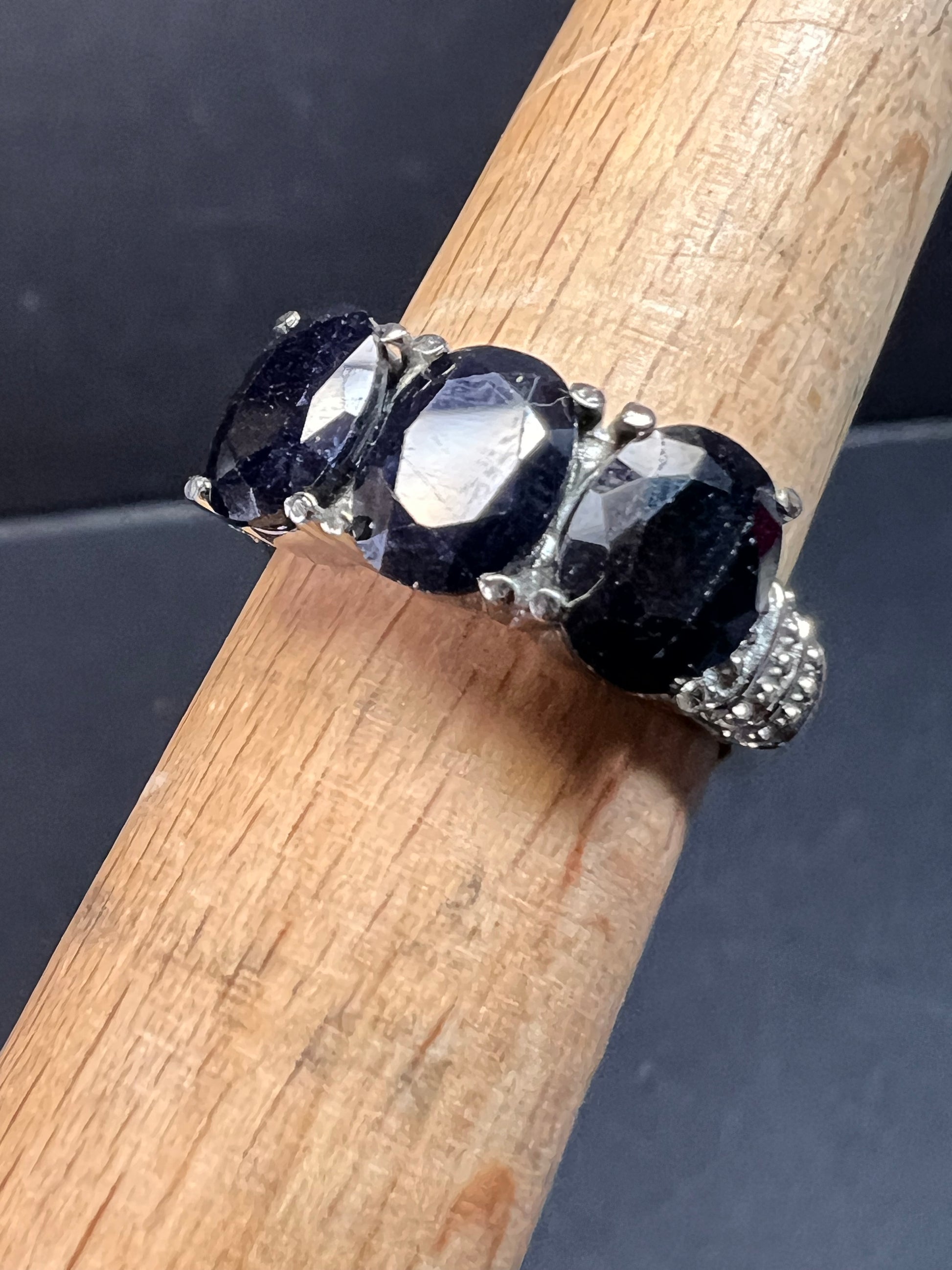 Genuine midnight dark blue sapphires prong set in a stainless steel setting. Measures a size 8.