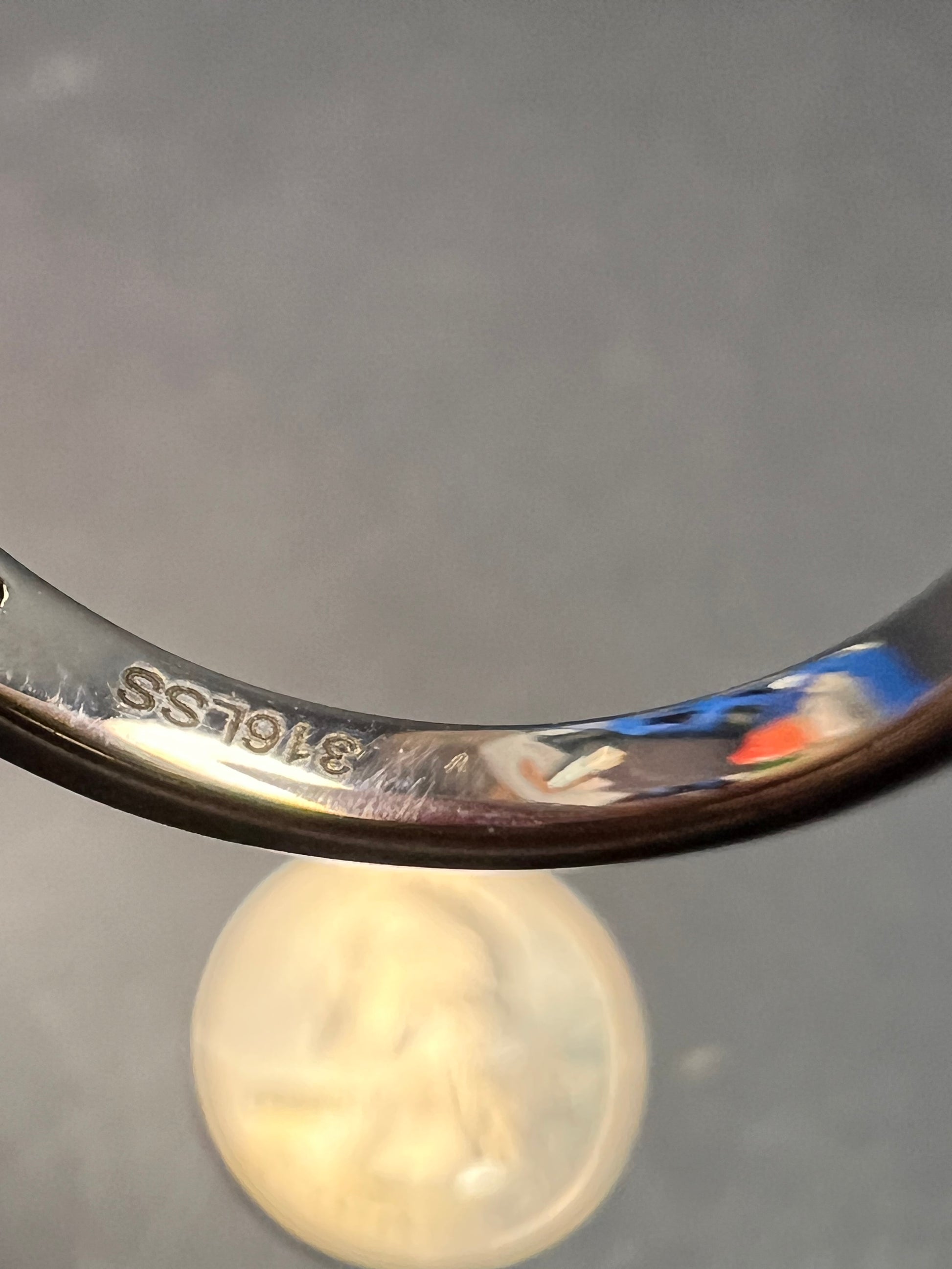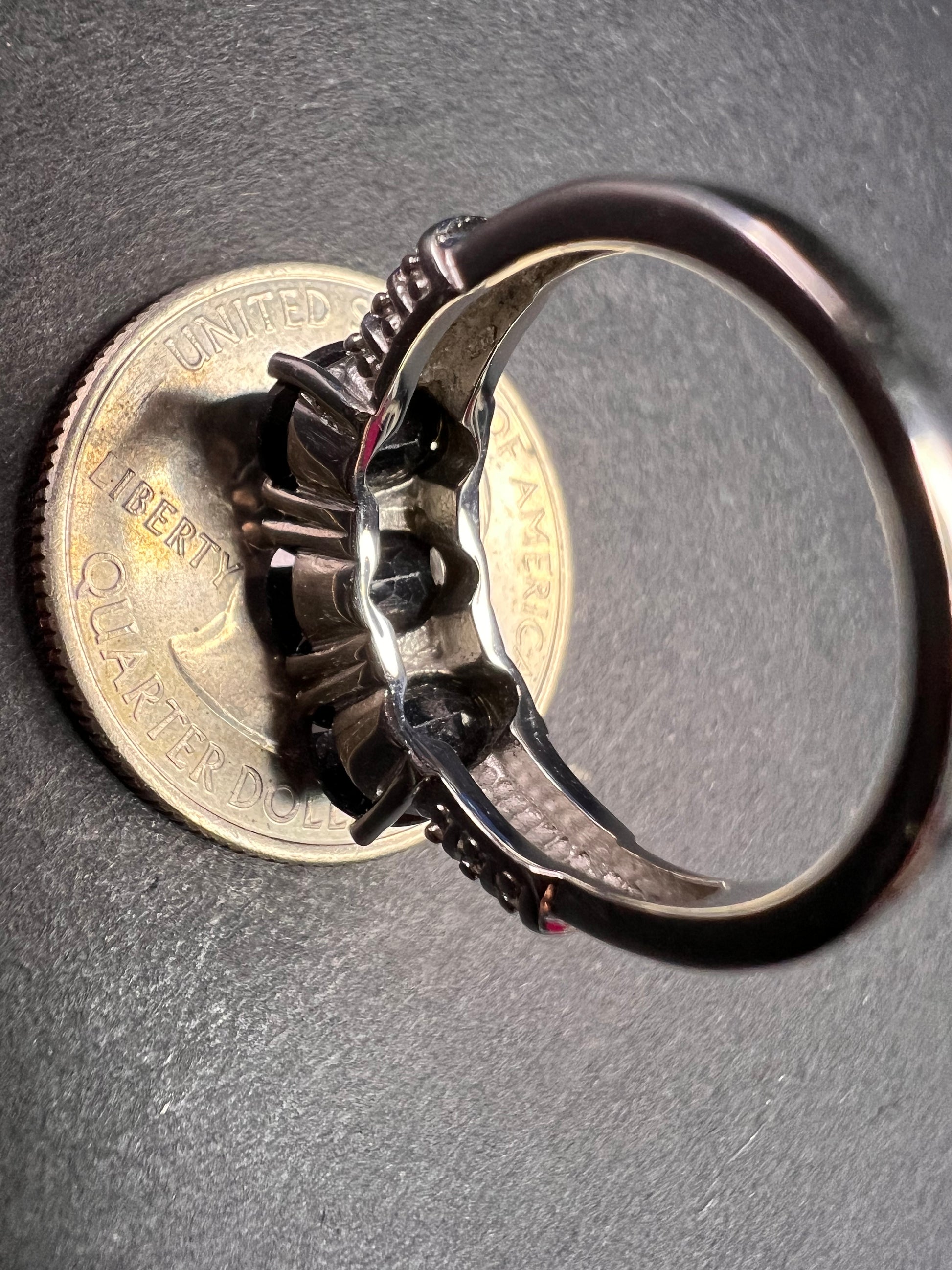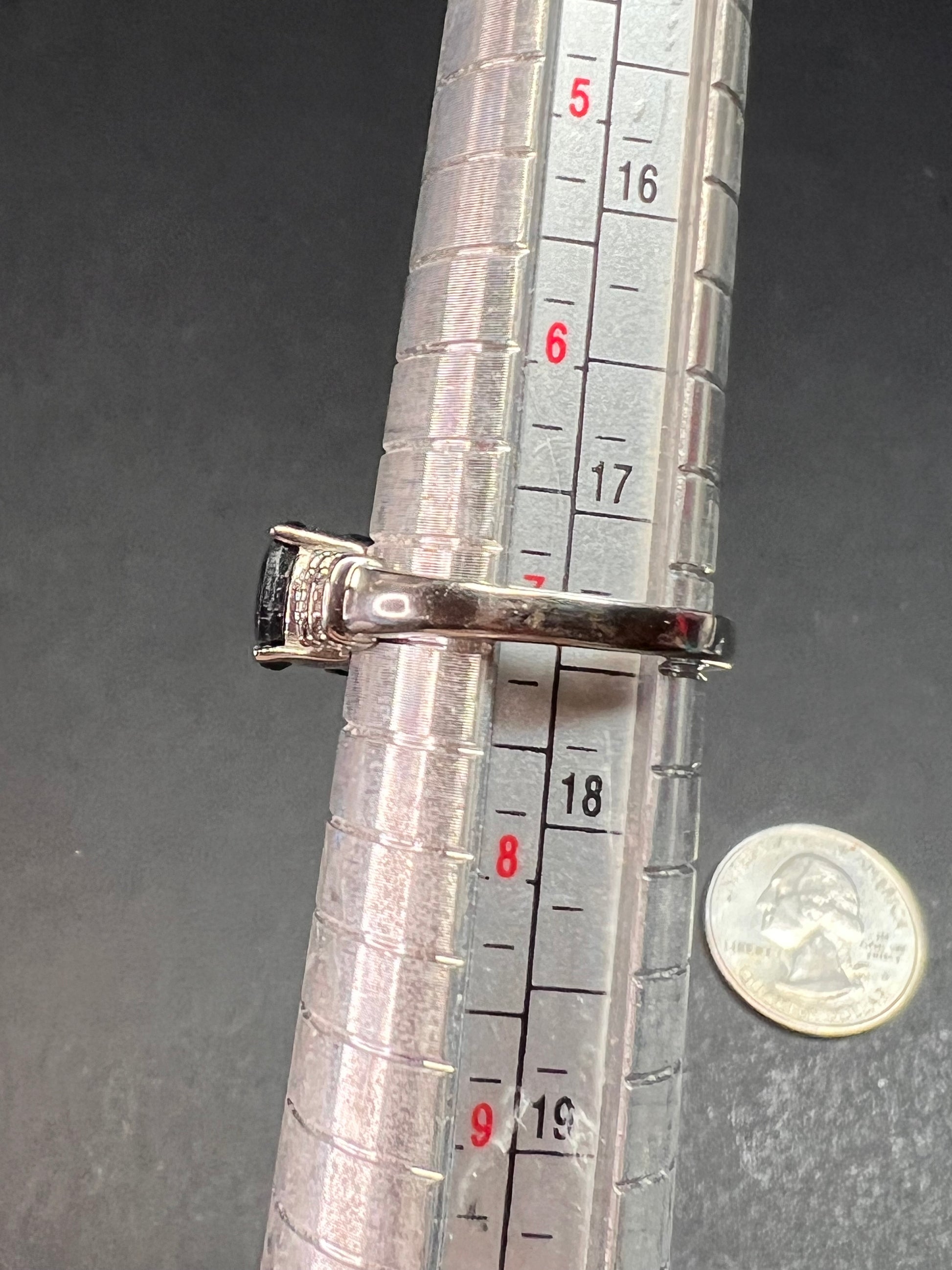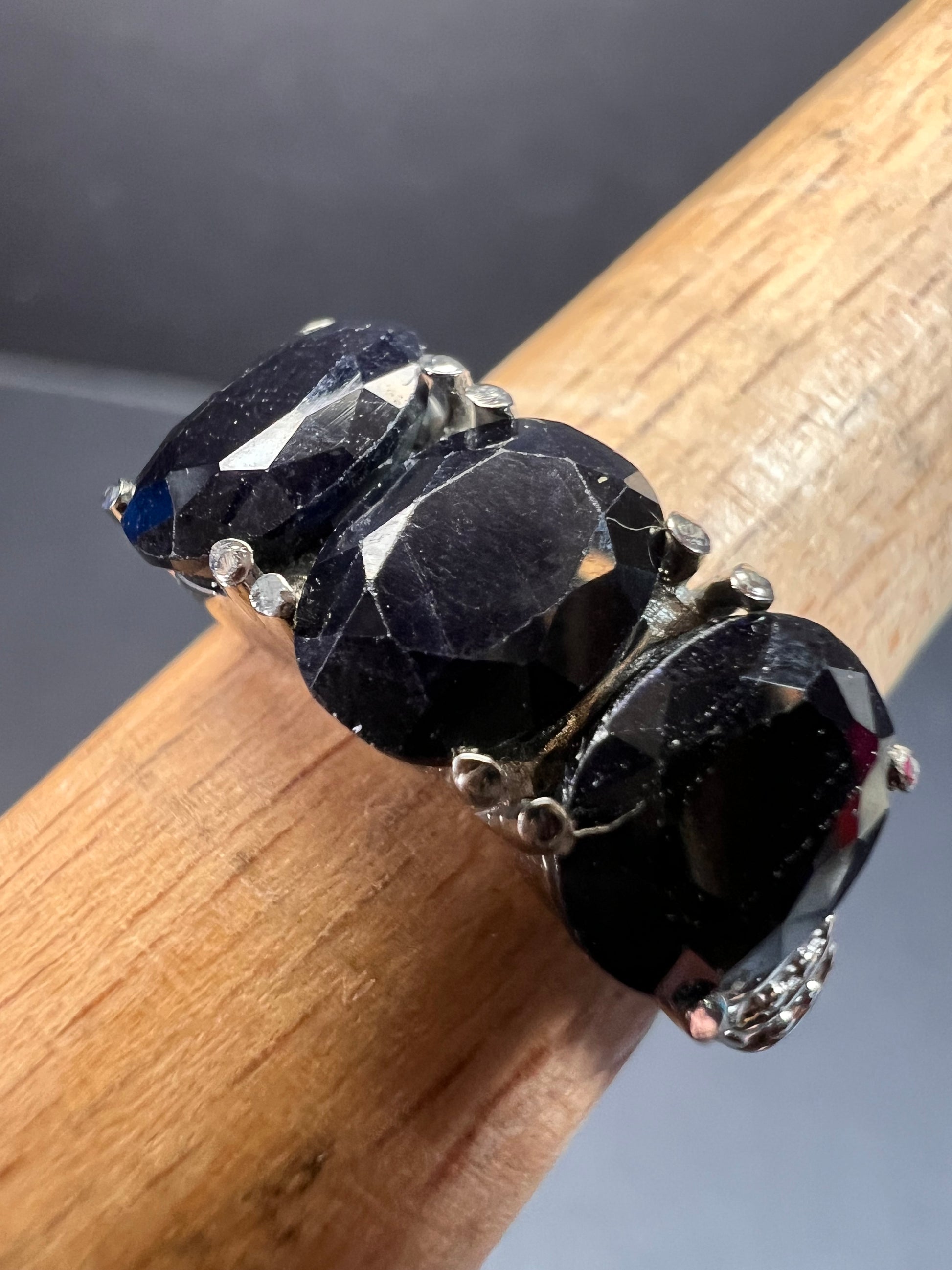 Genuine midnight dark blue sapphires prong set in a stainless steel setting. Measures a size 8.