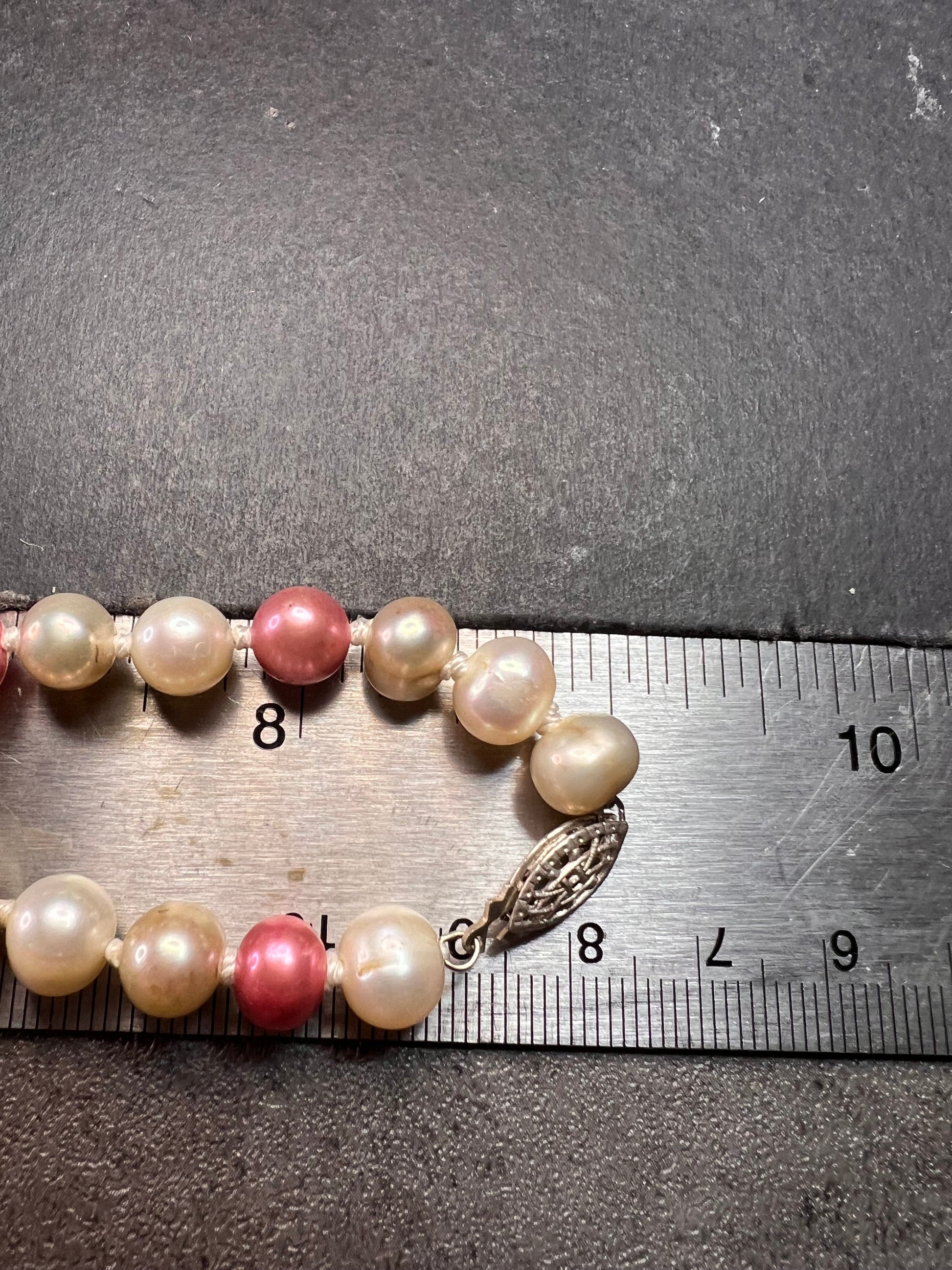 Genuine multi colored 8-9mm freshwater pearls knotted on a 18 inch strand with a 925 sterling silver fishhook clasp. Tag shows manufactured by Aluma USA.