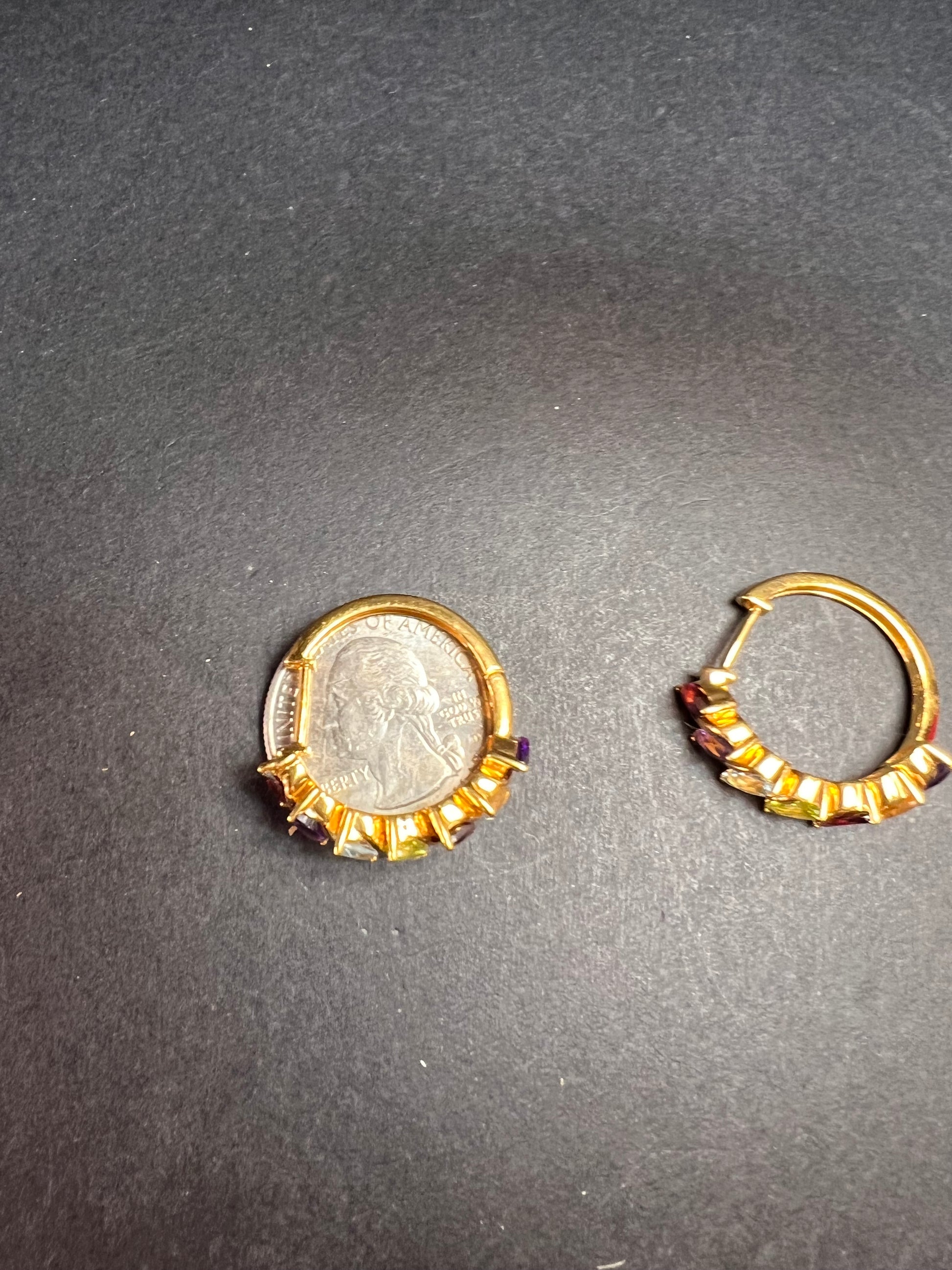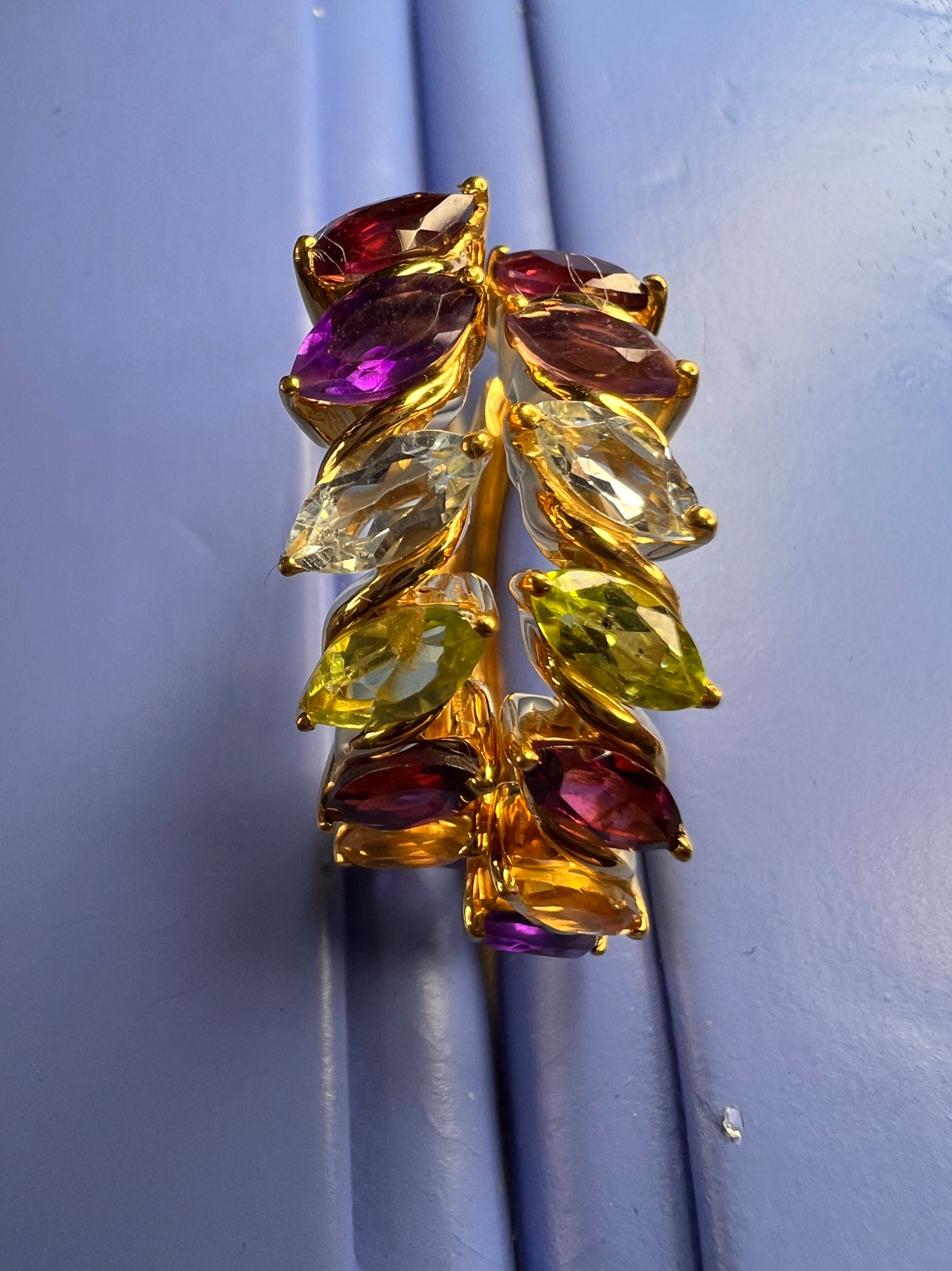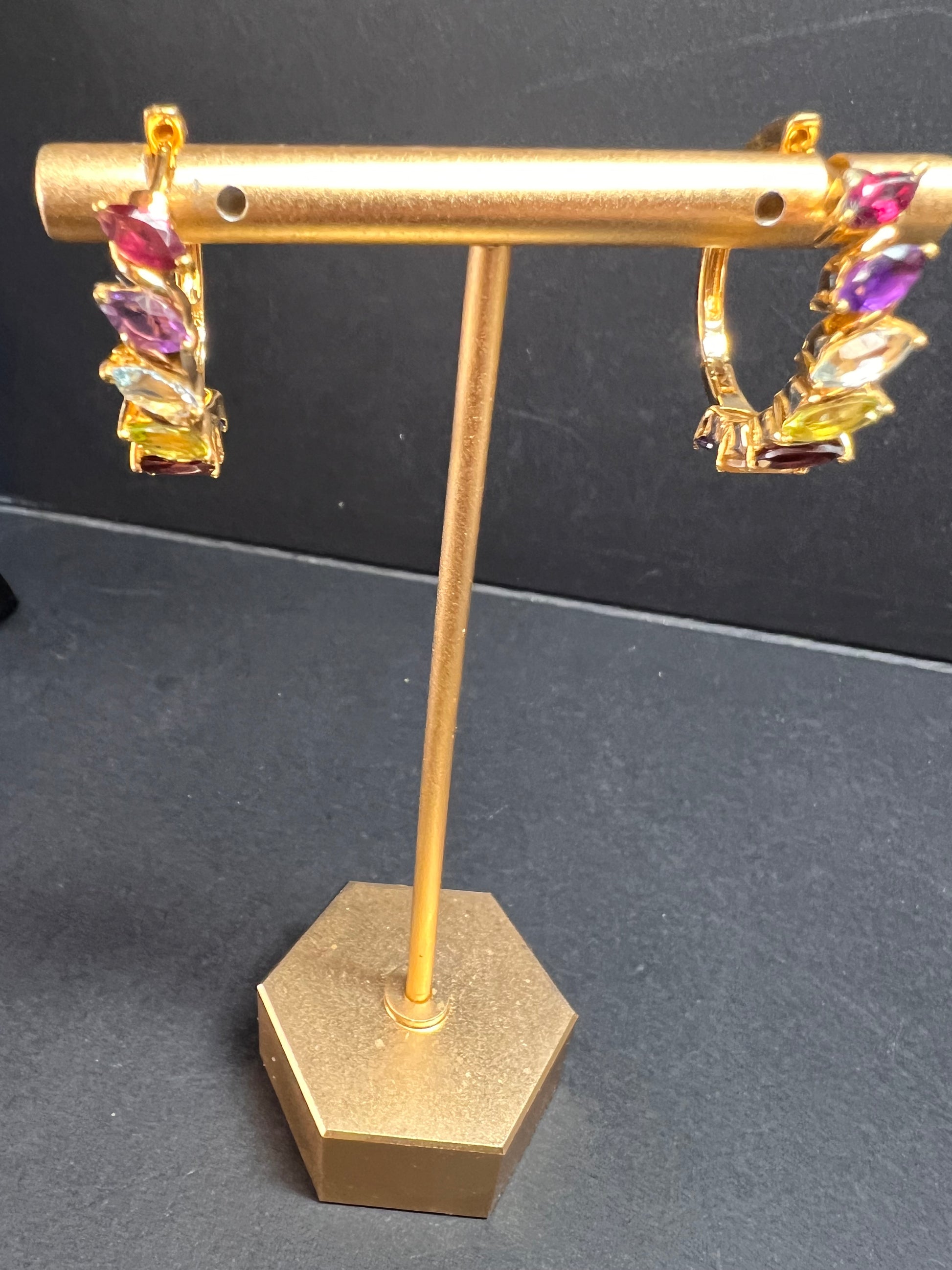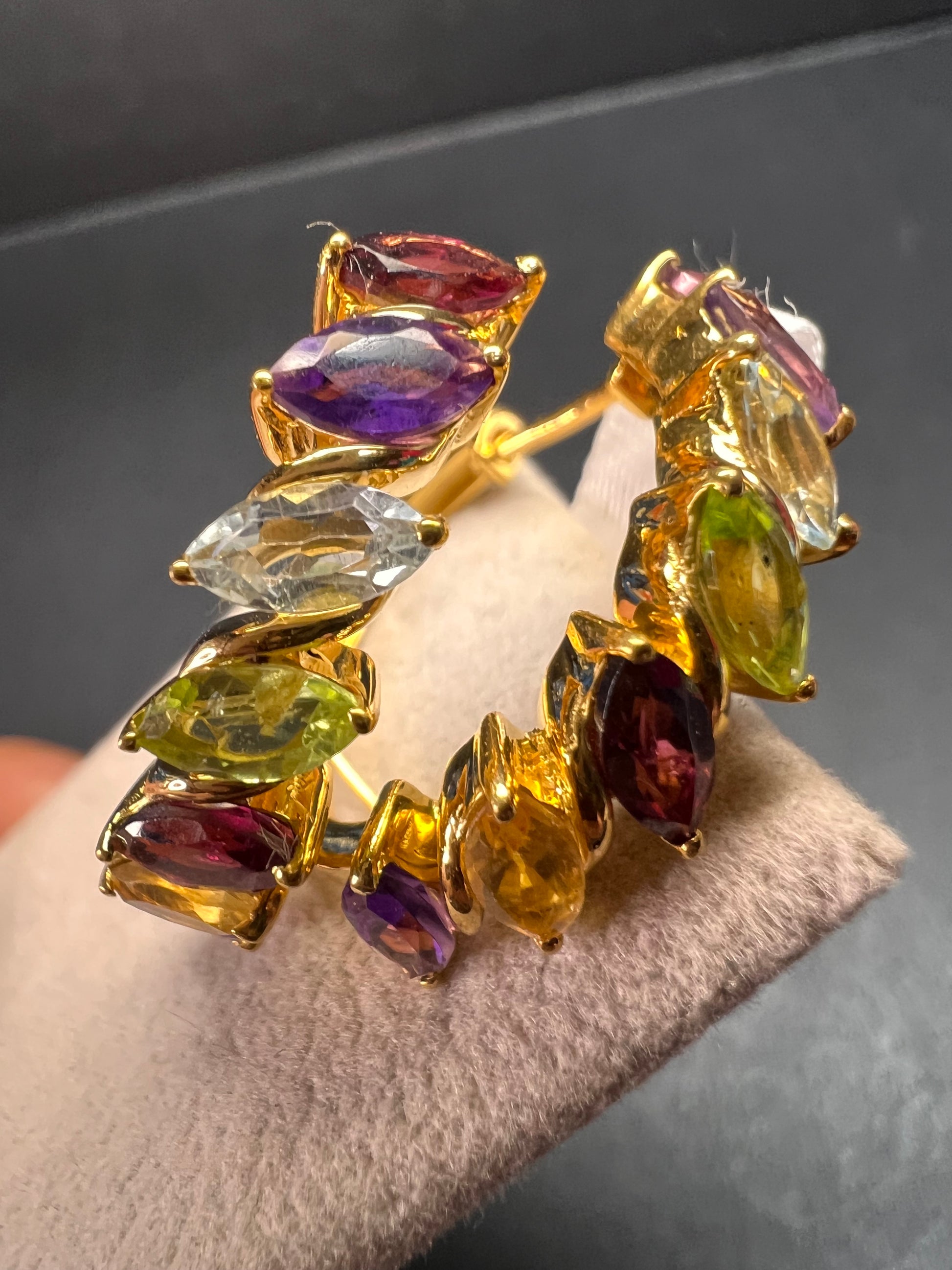Genuine margue cut gemstones that include garnet, blue topaz, peridot, citrine, and amethyst. Prong set in an authentic 925 sterling silver setting that’s plated with vermeil 14-18k yellow gold. Hinged in the middle for opening and closing with locking mechanism. Earrings measure about the size of a quarter and stamped Djoy 925. India. 4.20 total ctw