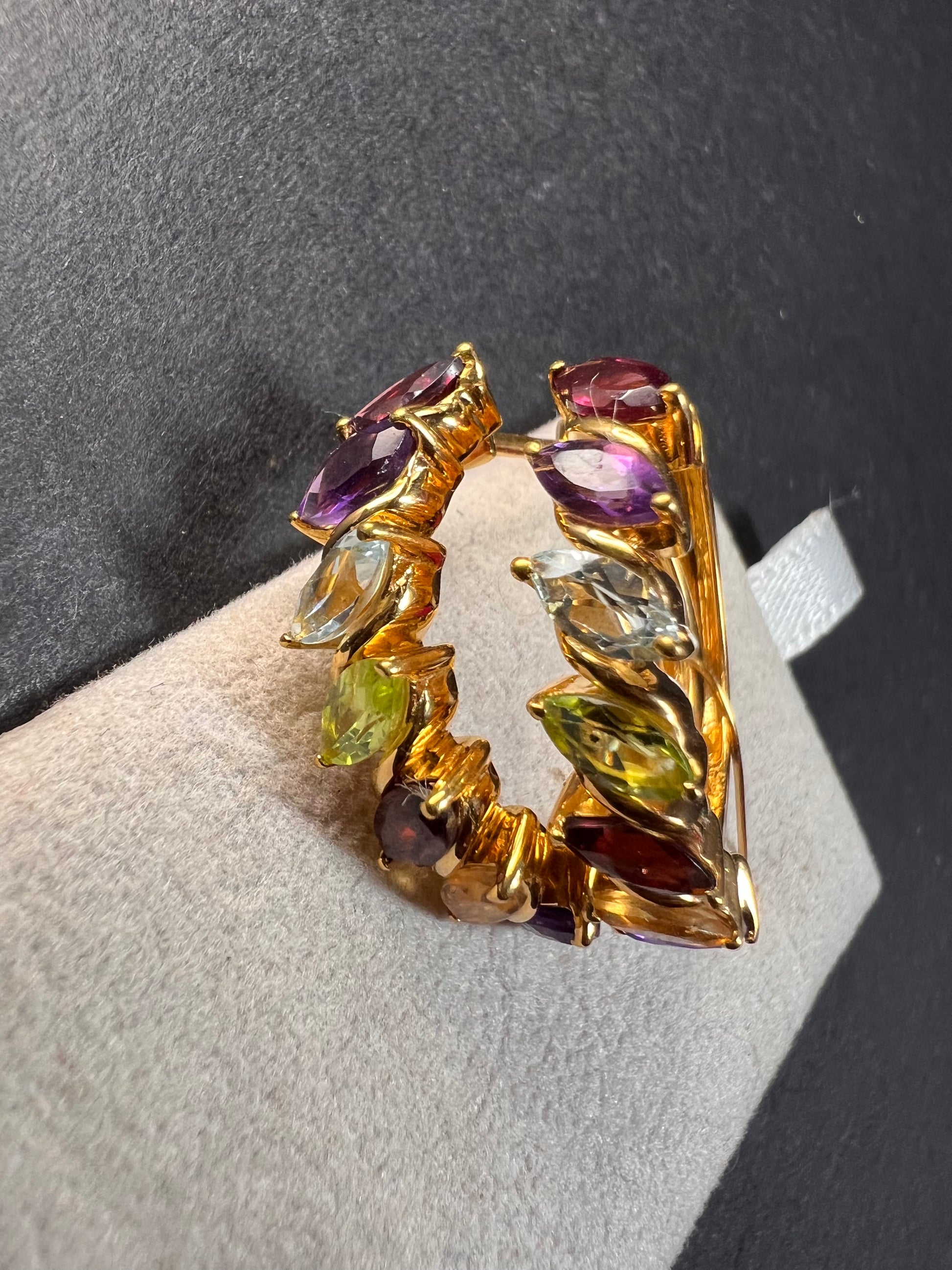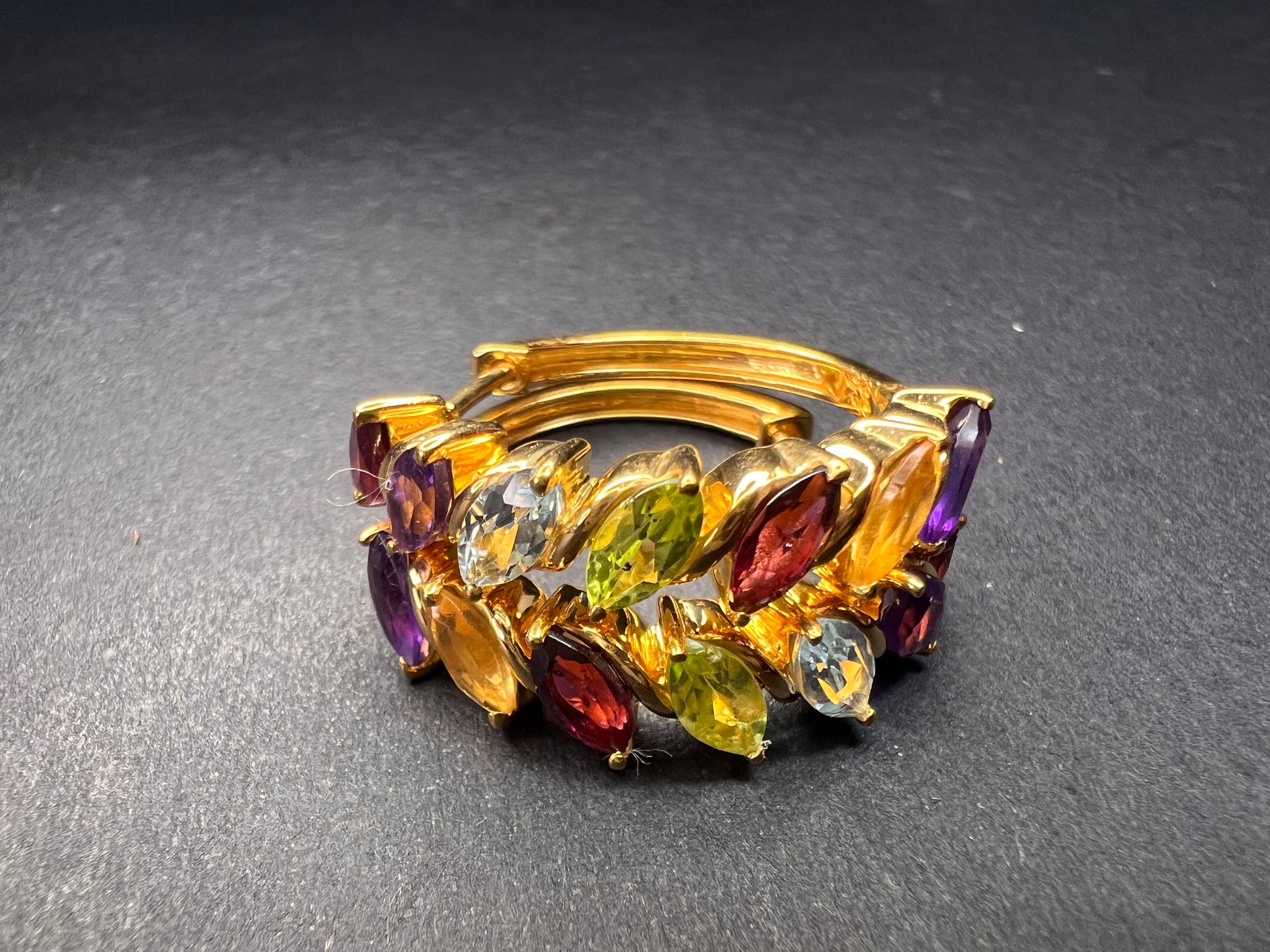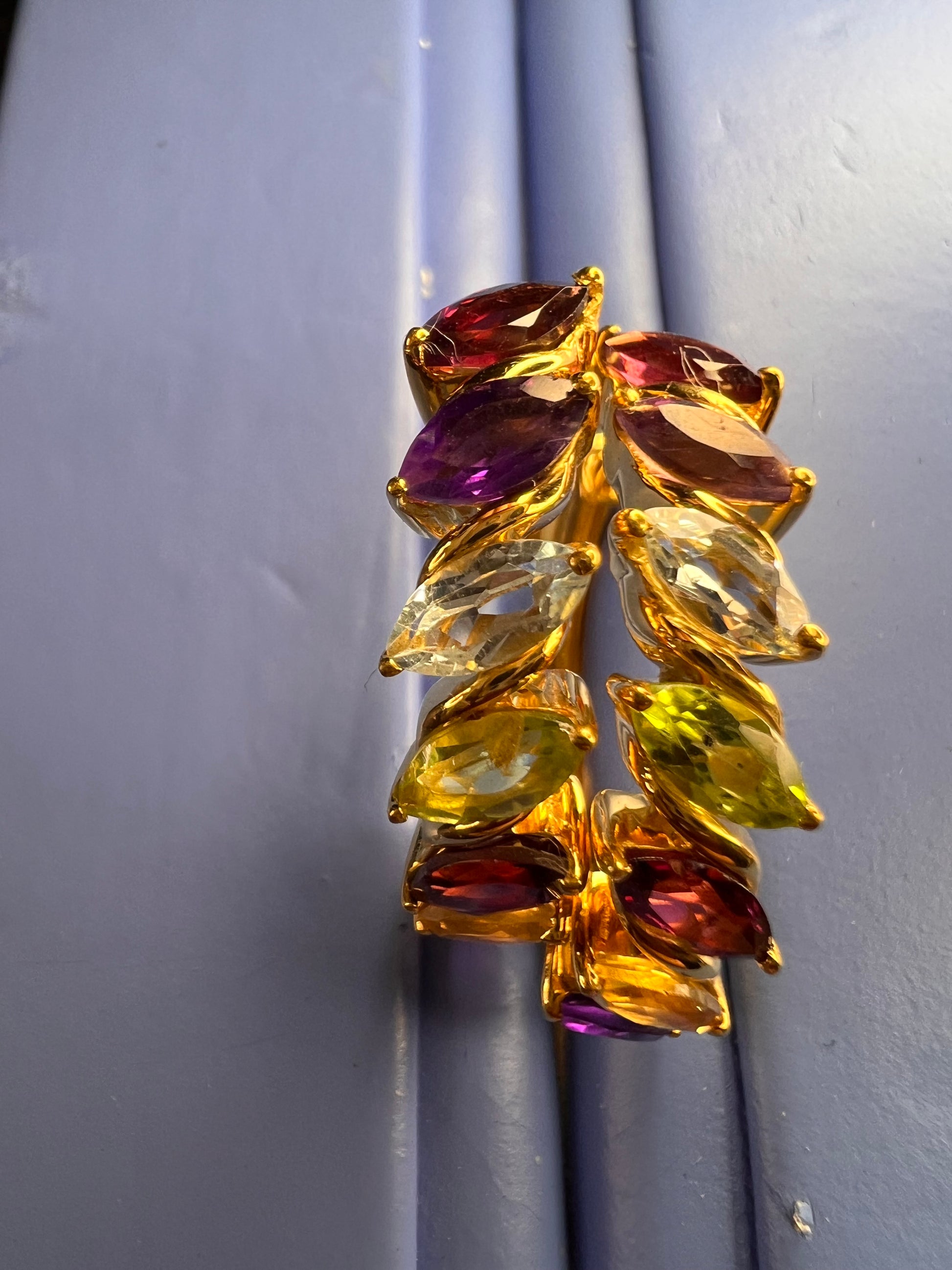 Genuine margue cut gemstones that include garnet, blue topaz, peridot, citrine, and amethyst. Prong set in an authentic 925 sterling silver setting that’s plated with vermeil 14-18k yellow gold. Hinged in the middle for opening and closing with locking mechanism. Earrings measure about the size of a quarter and stamped Djoy 925. India. 4.20 total ctw