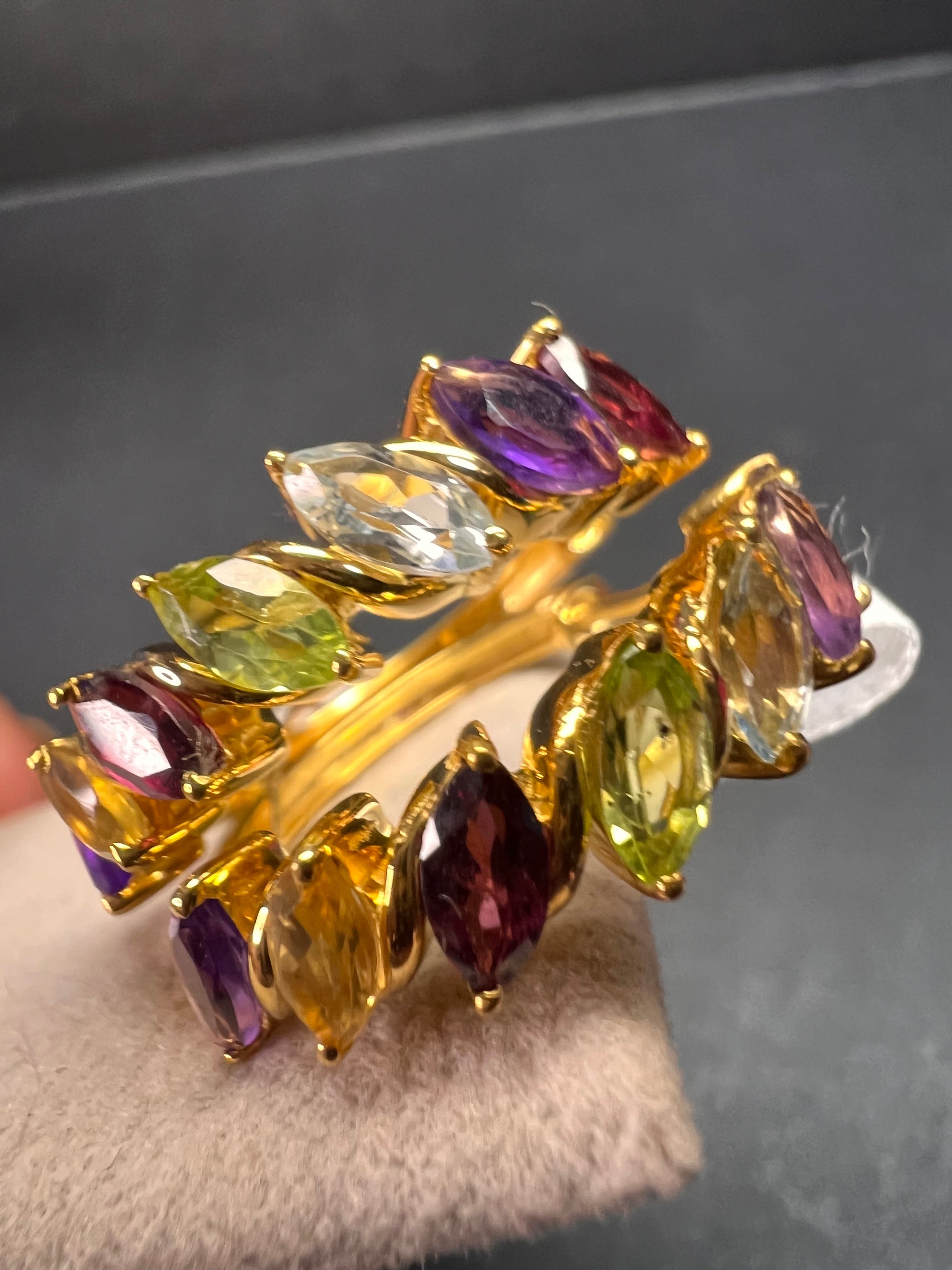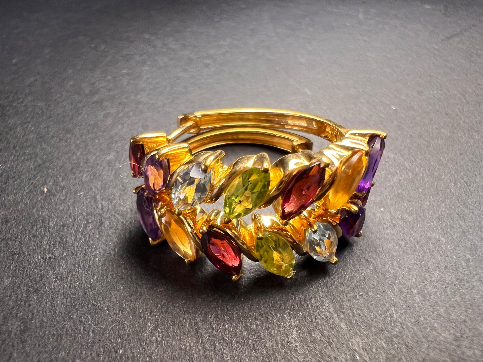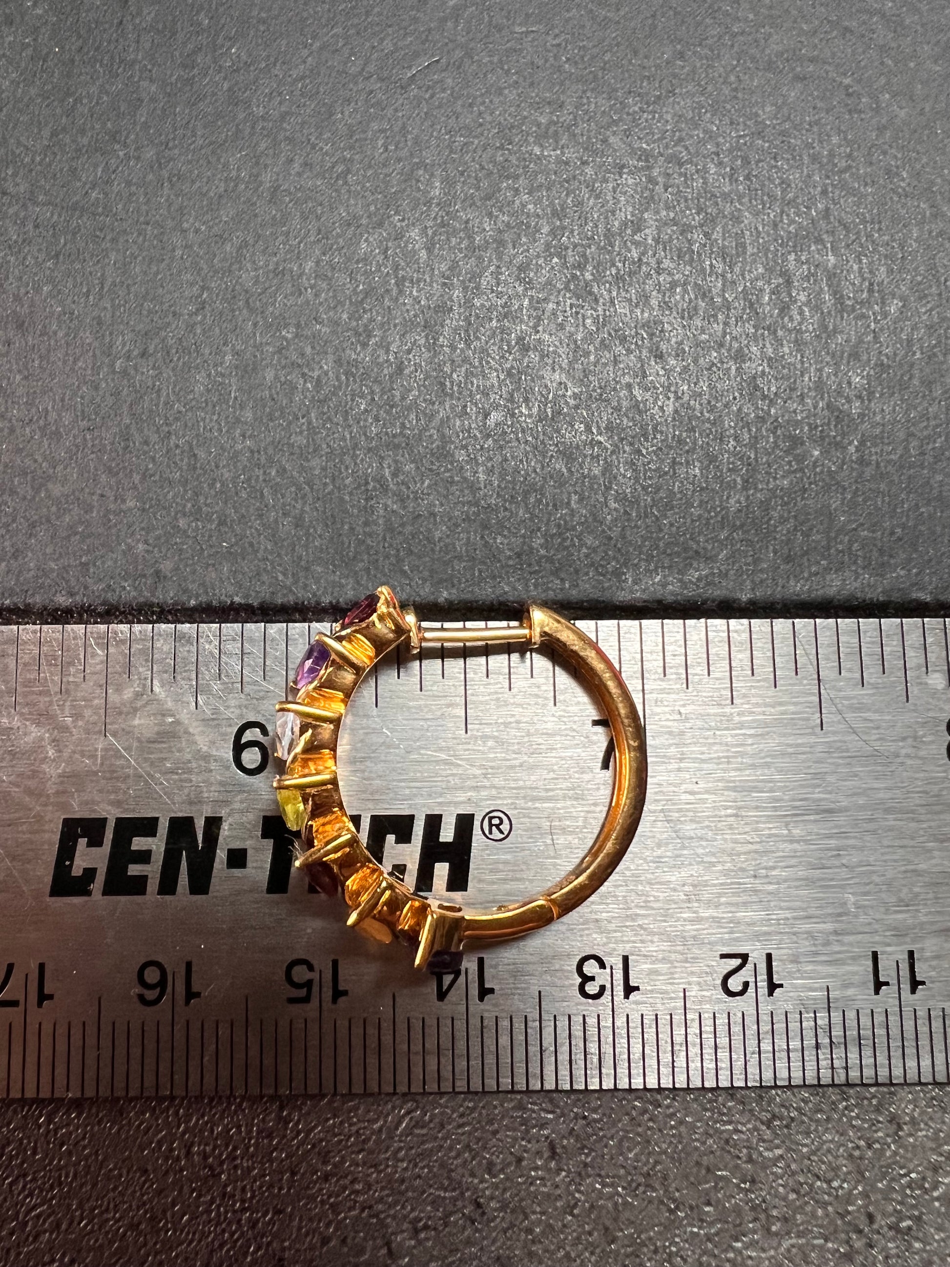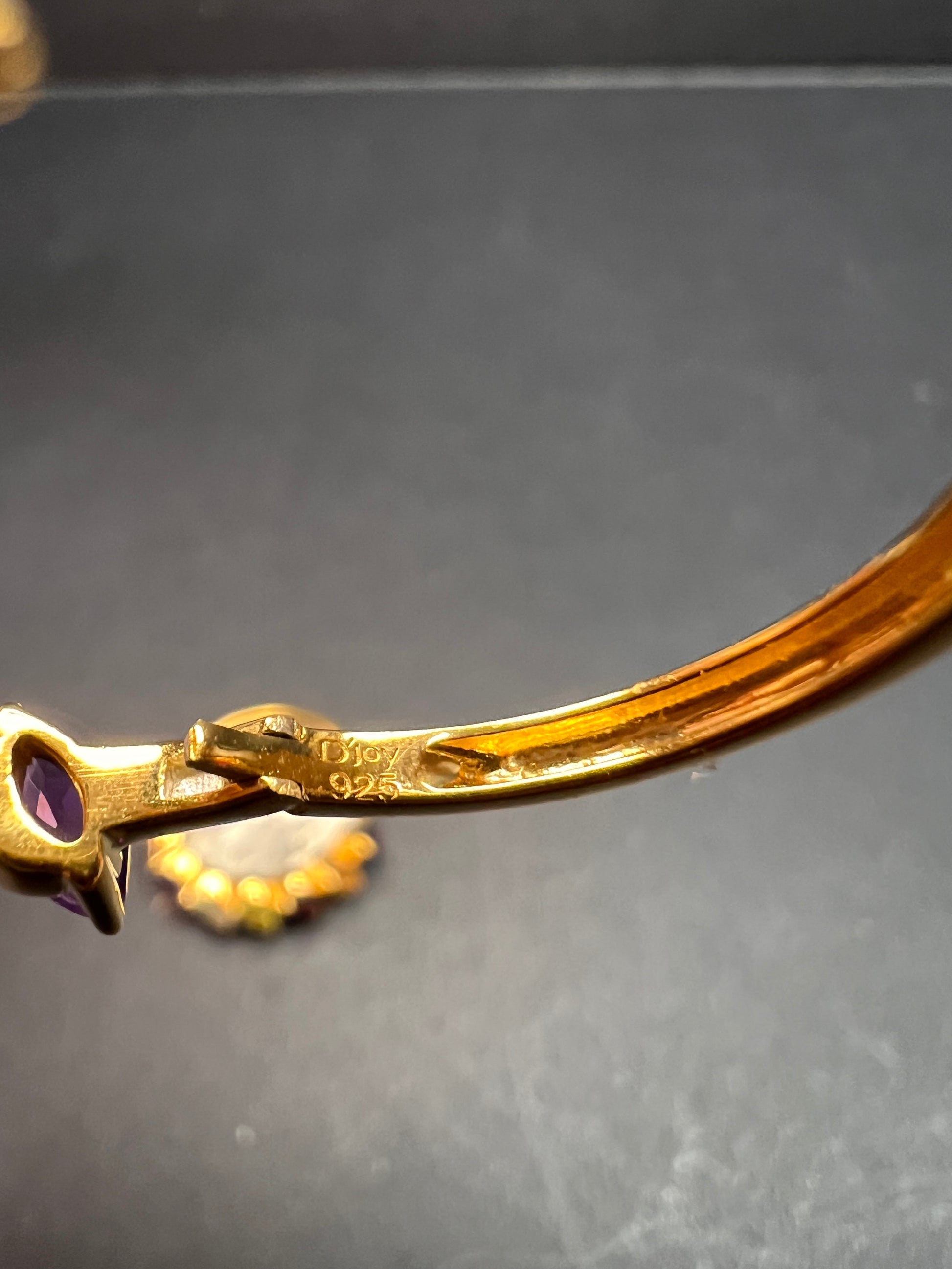 Genuine margue cut gemstones that include garnet, blue topaz, peridot, citrine, and amethyst. Prong set in an authentic 925 sterling silver setting that’s plated with vermeil 14-18k yellow gold. Hinged in the middle for opening and closing with locking mechanism. Earrings measure about the size of a quarter and stamped Djoy 925. India. 4.20 total ctw