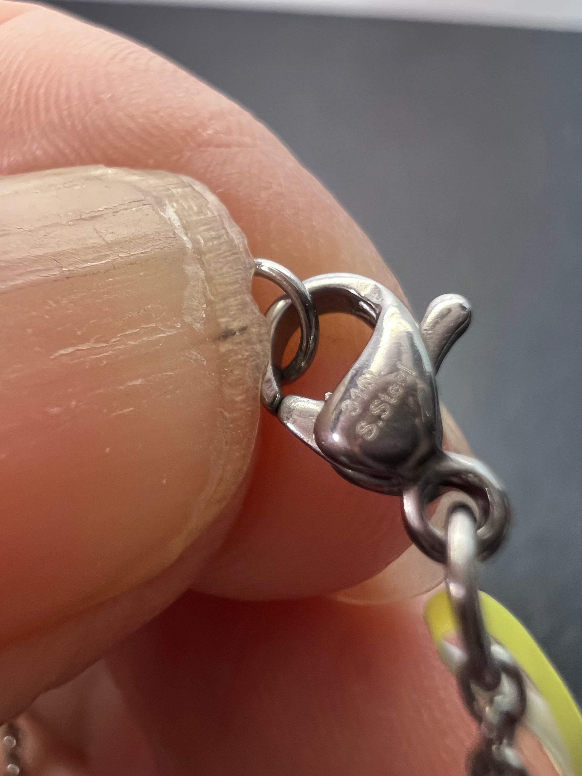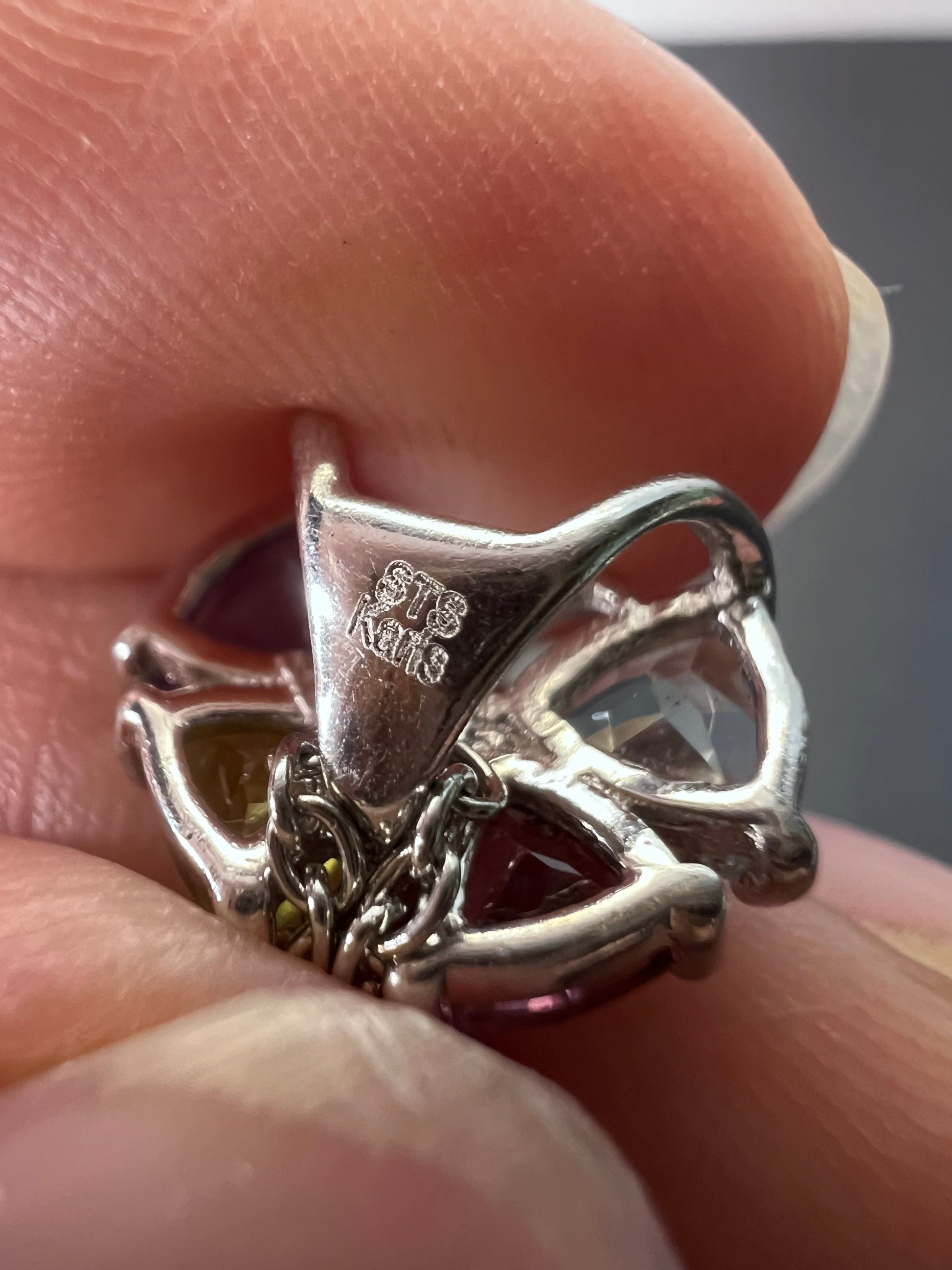 Dainty little butterfly with stones that test as lab aquamarine, rhodolite grape garnet , amethyst, and peridot. Set in stainless steel . Chain is also stainless and measures 18 inches in length. The design of this is not most ideal as you can see in the photos the butterfly hangs face down. Hoping someone might be able to take this and find a different way to hang it or use it for a brooch or something. Priced accordingly.