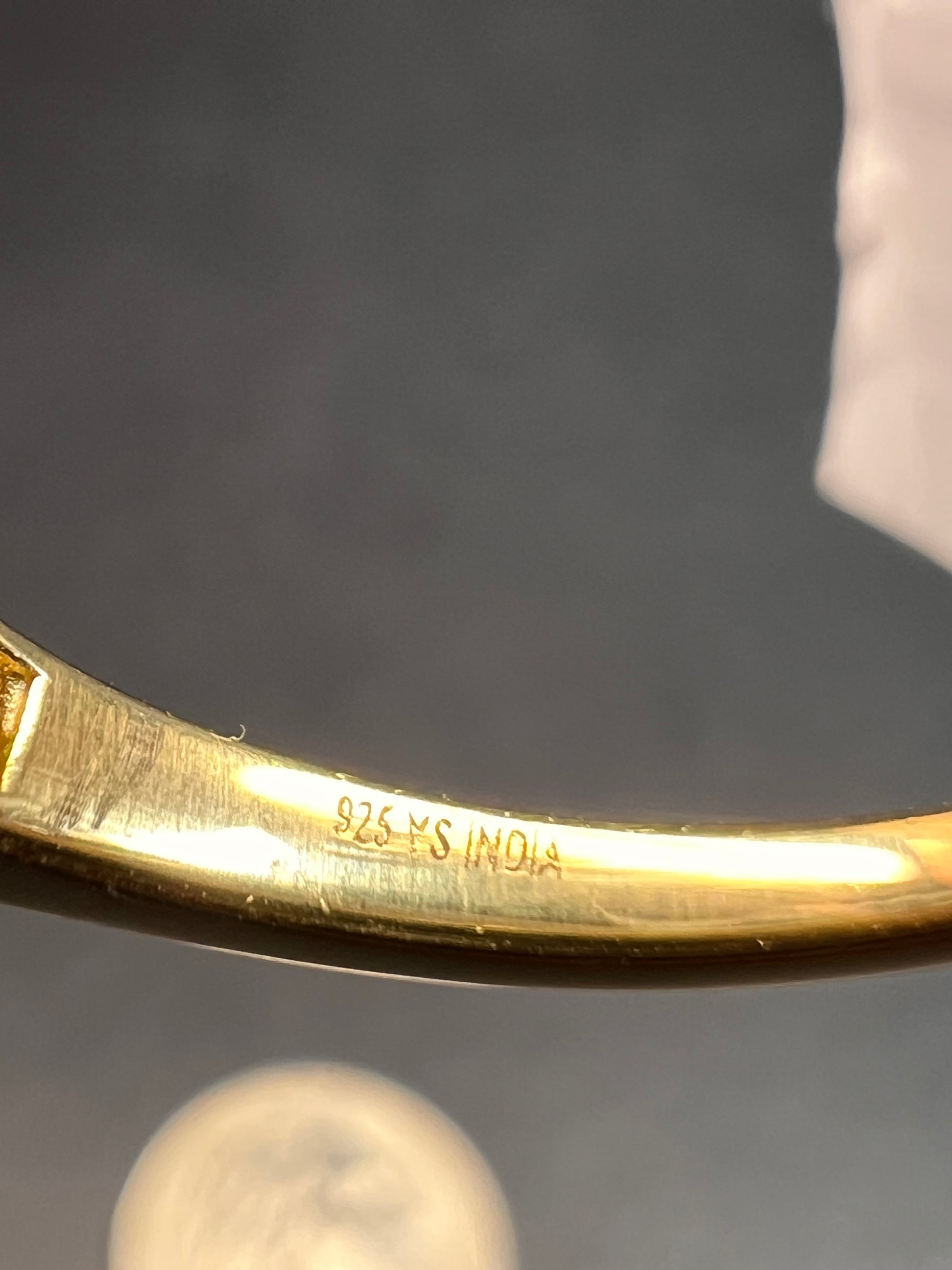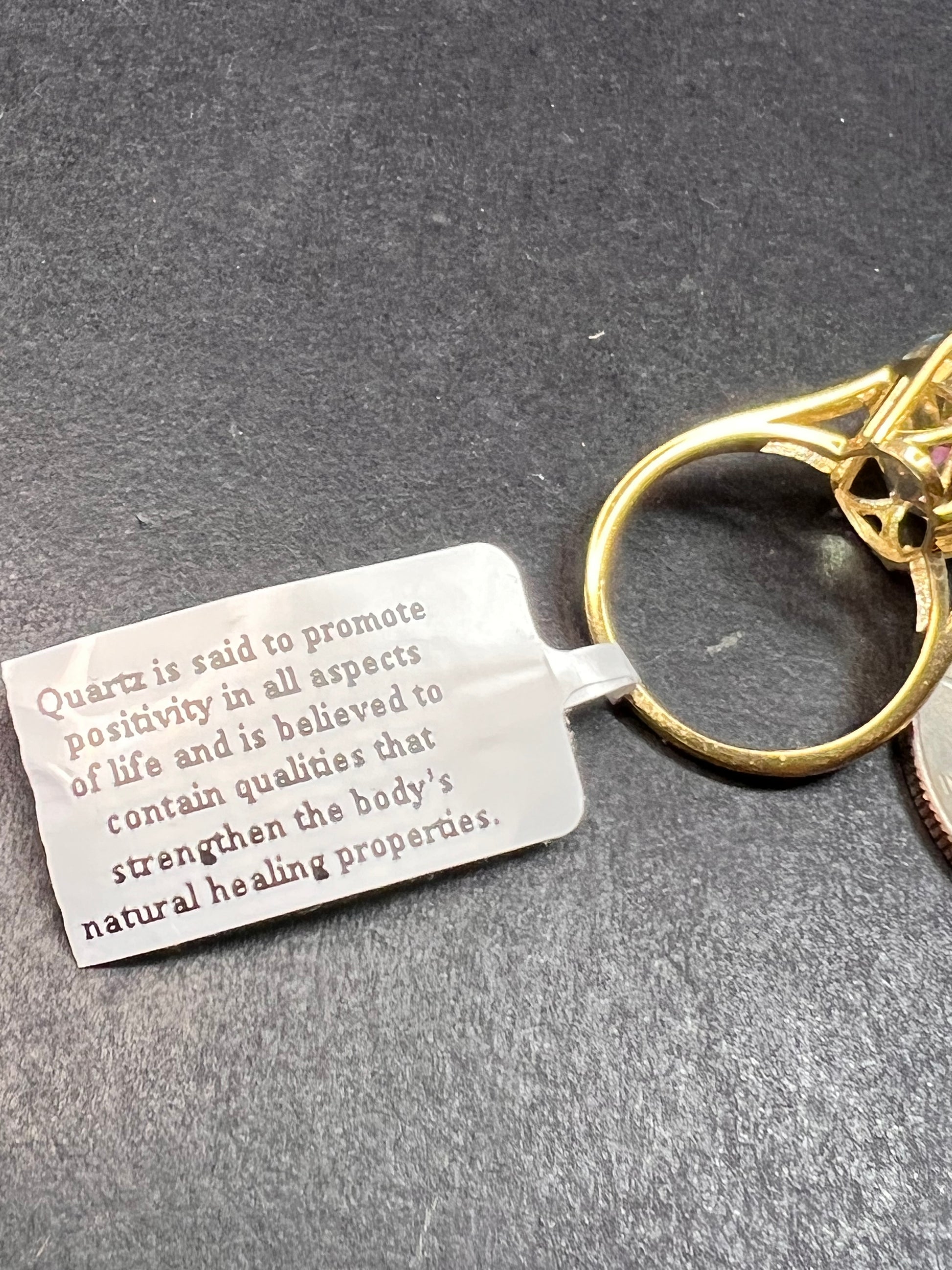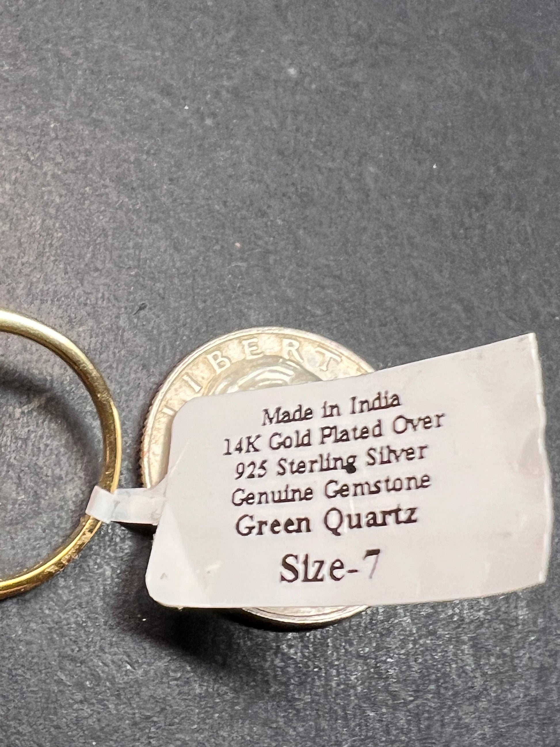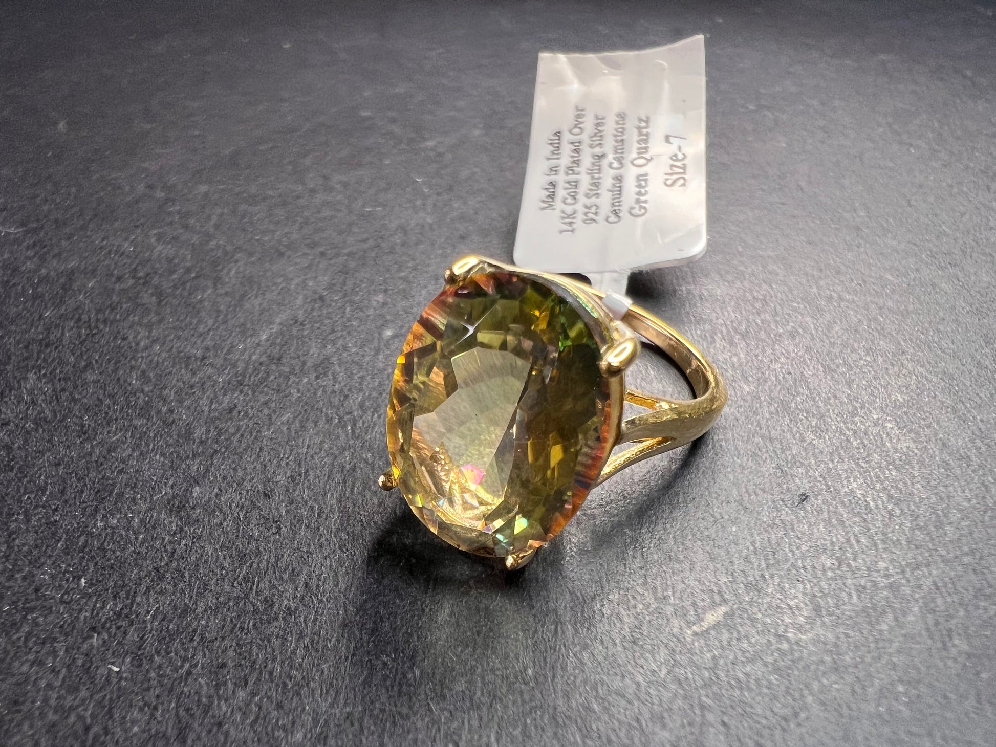 Genuine mystic treated quartz oval cut gemstone prong set in authentic 925 sterling silver plated with yellow gold. YS. India. Size 7. Mystic Quartz is a lab treatment applied to clear quartz.